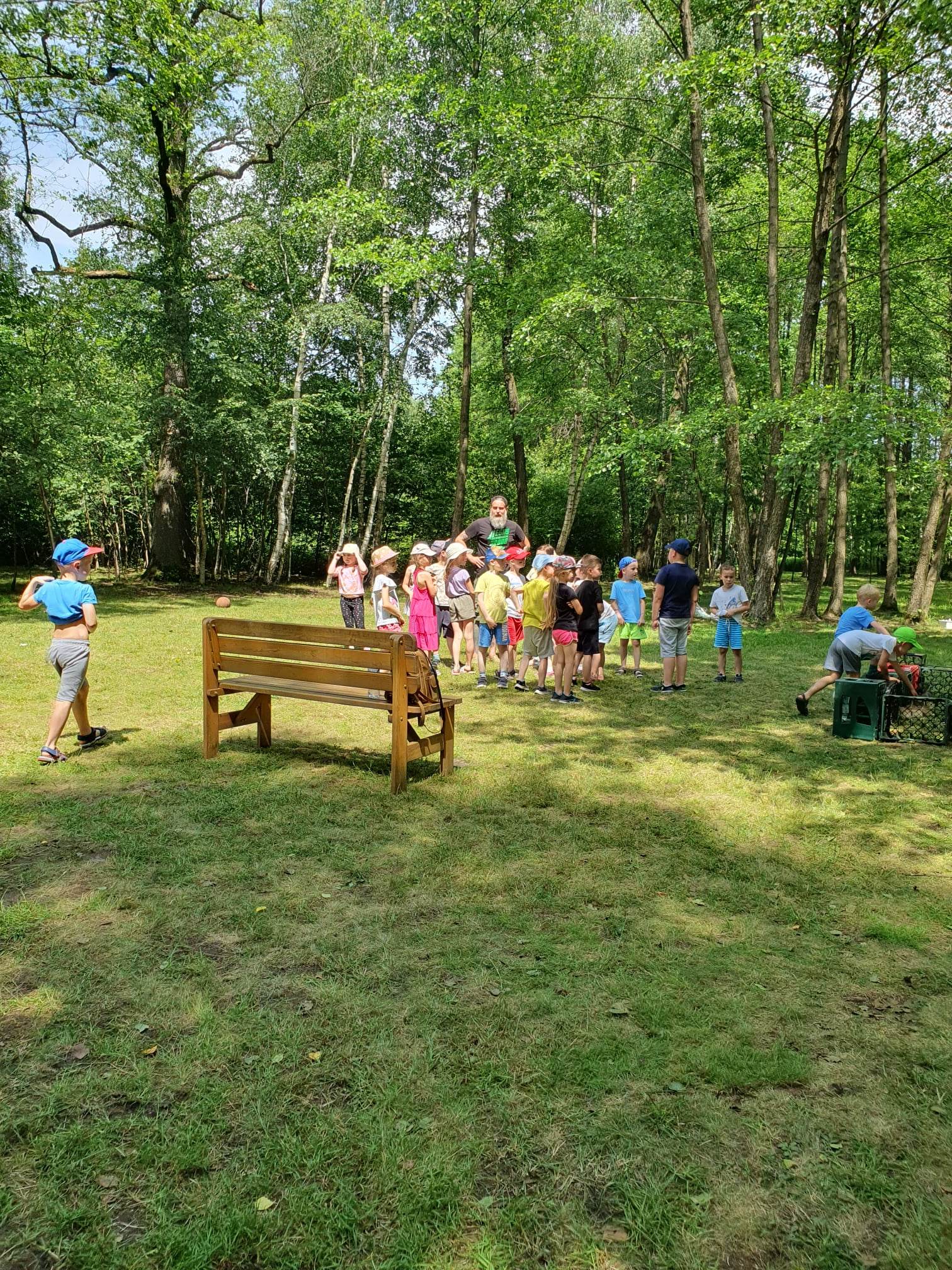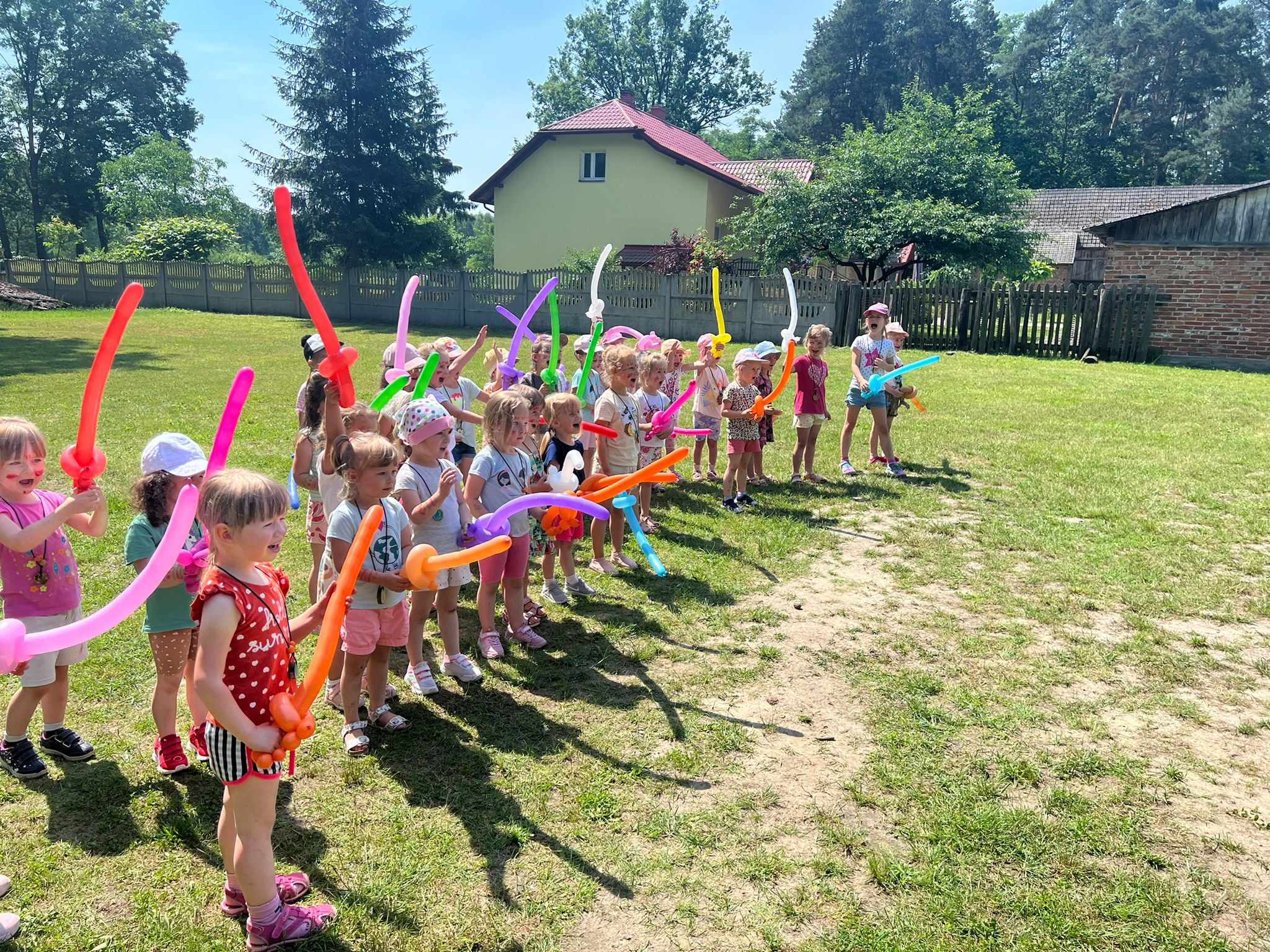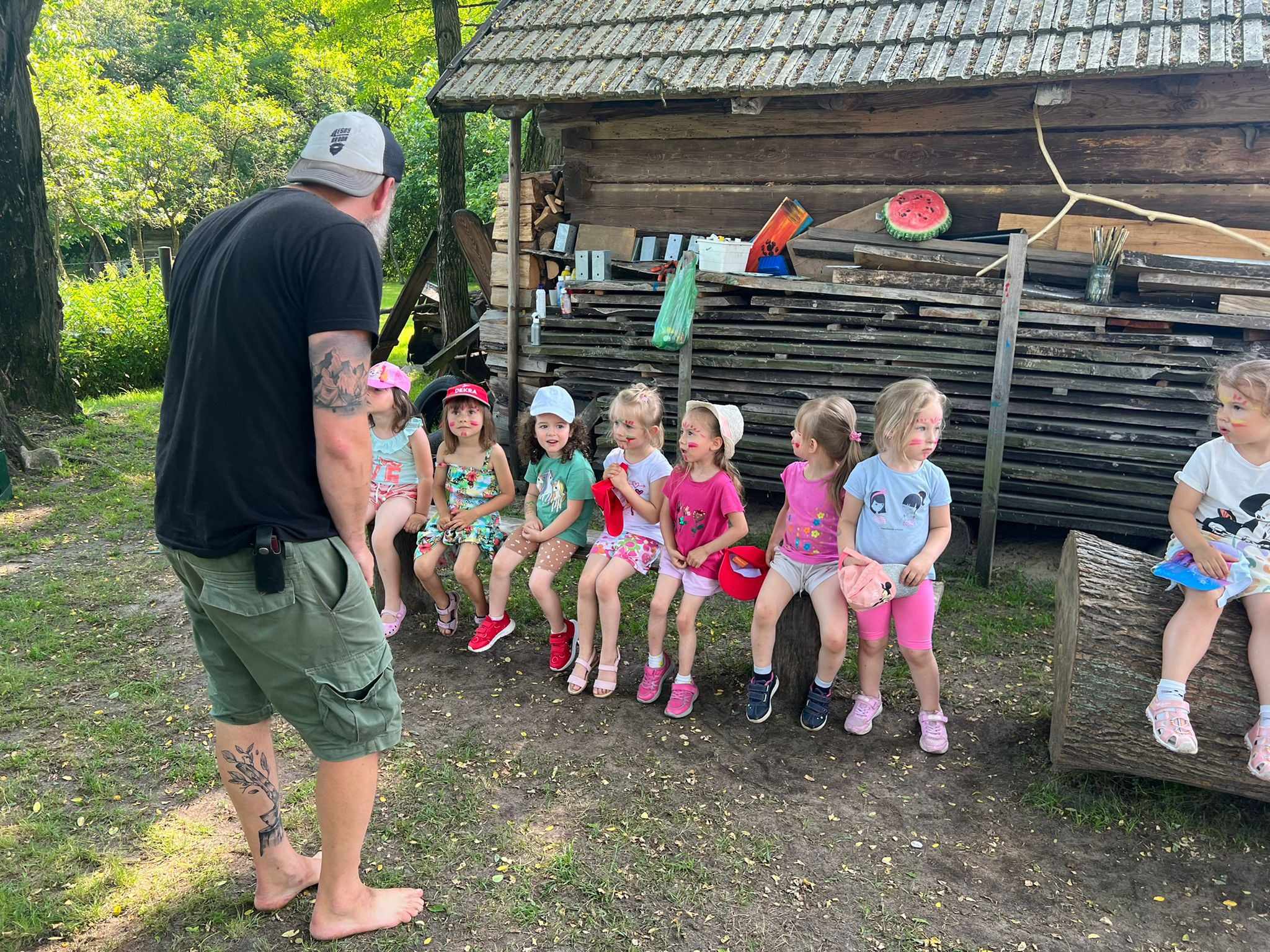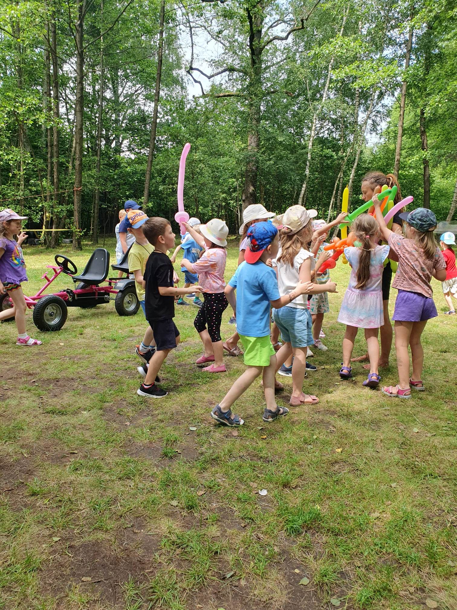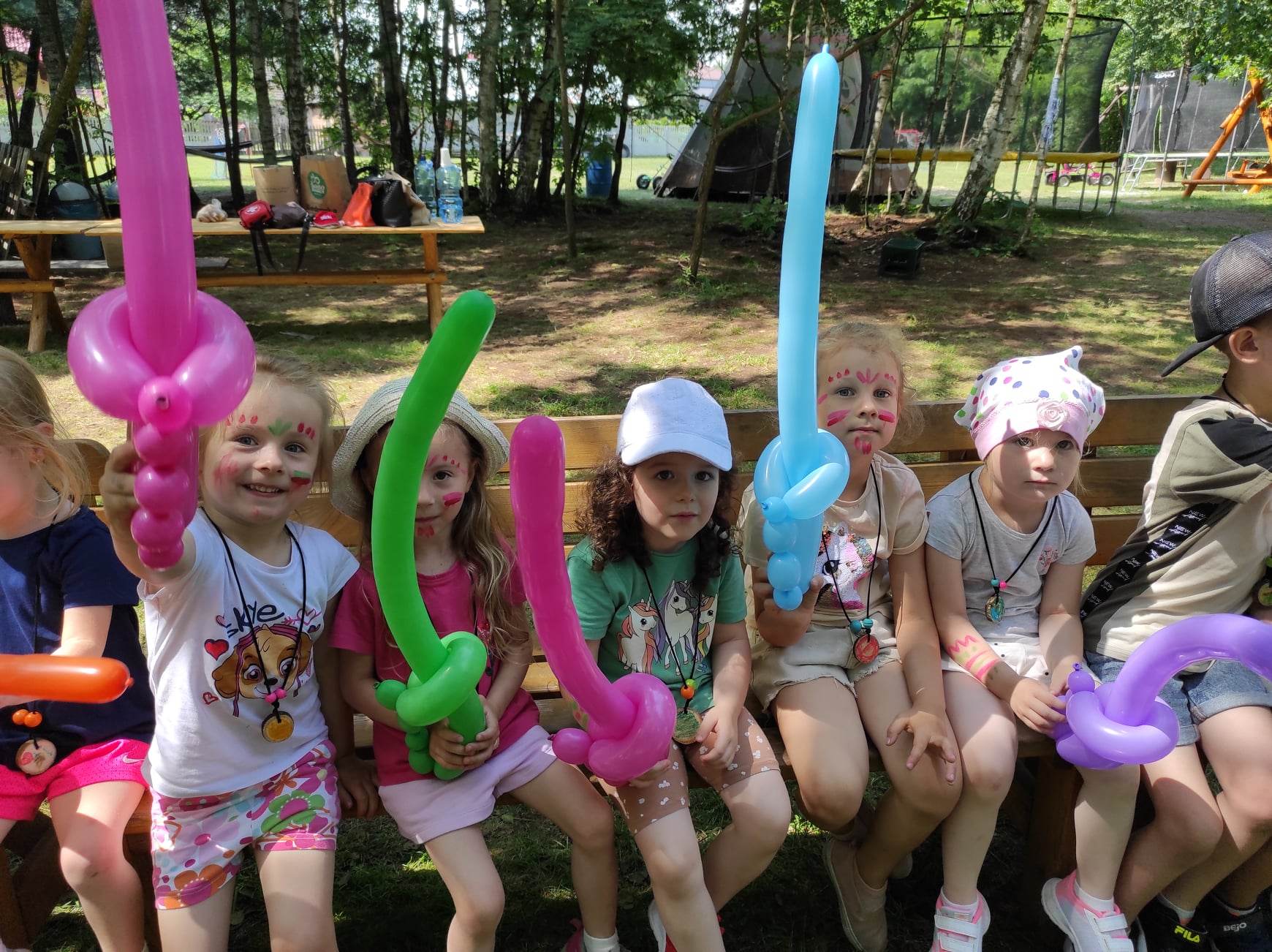 21.06.2023 r. przedszkolaki z Przedszkola nr 15 w Stalowej Woli, w ramach kontynuacji obchodów Dnia Dziecka, pojechały na wycieczkę autokarową do Osady Marianów w Zarzeczu koło Niska. Jako pierwsze, po śniadaniu, pojechały dzieci z grup młodszych; 3-latki grupa „Krasnale”, 4- latki grupa „Misie” oraz dzieci z grupy mieszanej wiekowo 3,4,5-latki,tj. grupa „Biedronki”. Drugą turą, po obiedzie, pojechały dzieci z grup starszych; 5-latki grupa „ Motylki” oraz 6-latki grupa „Zajączki”. Celem wyjazdu było przybliżenie dzieciom zdrowego stylu życia, a także rozbudzanie zainteresowania przyrodą i jej darami. Nauka sposobów spędzania wolnego czasu w poszanowaniu środowiska oraz umiejętne korzystanie z jego elementów z taktem, szacunkiem oraz z kulturą. W sposób praktyczny poznały znaczenie słowa „ekologia” ze wszystkimi jej elementami. Organizowane zabawy, zajęcia oraz sam pobyt na świeżym powietrzu z dala od miasta w otoczeniu przyrody, będącej naturalnym źródłem bodźców z bardzo małą ingerencją człowieka, miało pozytywny wpływ na zdrowie psychiczne i fizyczne dzieci, a także przyczyniło się do kształtowania u dzieci postawy zainteresowania, dbałości o przyrodę w jej niezmienionej formie już od najmłodszych lat. Rozbudziła się świadomość przestrzegania zasad ochrony przyrody w codziennym życiu. Na miejscu zostaliśmy przywitani przez gospodarza Osady Marianów. Zwiedzanie rozpoczęliśmy od wyjaśnienia pojęcia ekologia, a przedszkolaki miały możliwość obserwacji przyrody z naturalną jej ekspozycją, minimalistyczną ingerencją w jej urok ze strony człowieka. Otoczenie bezpośrednio wtapiało się w las ze starodrzewiem. Pierwszym elementem pobytu było przejście przez zawieszoną na wysokości kładkę i zjazd na rolce . Dzieci bez oporów skorzystały z atrakcji, radość nie miała granic. Kolejnym elementem wycieczki była wizyta u królików. Wypuszczone z „Domku dla królikow” w prowizorycznej zagródce skubały świeżą trawę. Dzieci miały możliwość wielozmysłowego poznania zwierząt. Przedszkolaki mogły pogłaskać królika, umiejętnie wziąć na ręce, aby ich nie podrapały i przytulić. W dalszej części wycieczki dzieci wzięły udział w warsztatach malowania na folii rozwieszonej pomiędzy drzewami. Po zakończonych warsztatach dzieci zostały przygotowane do dalszej zabawy, tym razem w Indian, gospodyni wykonała na ich twarzach malunki w barwach wojennych i zaprosiła do Tipi, gdzie wspólnie z gospodarzem uczyły się różnych zawołań plemiennych. Kolejnym etapem była chwila odpoczynku. Dzieci z apetytem zjadły bułeczki, napiły się wody z limonką i miętą z ogrodu gospodarzy. Przedszkolaki miały możliwość poznania roślinności otaczającej place zabaw oraz nauczyły się jak nazywają się piętra lasu. Byli chętni do odpoczynku w hamaku. Po chwili odpoczynku, rozmów z kolegami lub wsłuchiwaniu się w ciszę lasu, śpiew ptaków ,gotowe były do dalszych zabaw na łonie natury, to był czas wolny. Możliwości zabaw nie było końca. Atrakcją był konik na biegunach, jazda na rowerze, szaleństwa na trampolinach, jazda na gokartach, zabawy w domku na drzewie, zjeżdżalnie, huśtawki. Chłopcy, już tradycyjnie, grali w piłkę nożną. W trakcie zabaw gospodyni Osady zaprosiła dzieci do wykonania pamiątkowych zawieszek z kawałków drewnianych gałązek ozdabianych flamastrami i koralikami. Własnoręcznie wykonane zawieszki dekorowały szyję każdego uczestnika. Kolejnym etapem zabaw w Osadzie Marianów była zabawa z balonami. Dzieci otrzymały balonowe miecze i razem z gospodarzem Osady złożyły przysięgę przygotowującą do walki. Grupa podzielona została na zespoły, dziewczynki i chłopcy. Każda z drużyn wydała okrzyk zapraszający i dzieci przystąpiły do zabawy, każdy musiał dotknąć balonowym mieczem największą liczbę dzieci. Potem zachęcone przez gospodarza zaatakowały wychowawczynie. Grupa podzielona została na zespoły, dziewczynki i chłopcy. Każda z drużyn wydała okrzyk zapraszający i dzieci przystąpiły do zabawy, każdy musiał dotknąć balonowym mieczem największą liczbę dzieci. Potem zachęcone przez gospodarza zaatakowały wychowawczynie. Zamierzone cele wycieczki zostały zrealizowane. Przedszkolaki chętnie i z dużym zaangażowaniem uczestniczyły we wszystkich zorganizowanych zajęciach. Umorusane i uśmiechnięte buzie dzieci świadczyły o tym, że Dzień Dziecka w Osadzie Marianów przyniósł im dużo radości i będzie długo przez nie wspominany. Był to wspaniały prezent. Zdobyły wiedzę z zakresu ekologii i poznały sposoby spędzania wolnego czasu na łonie natury.