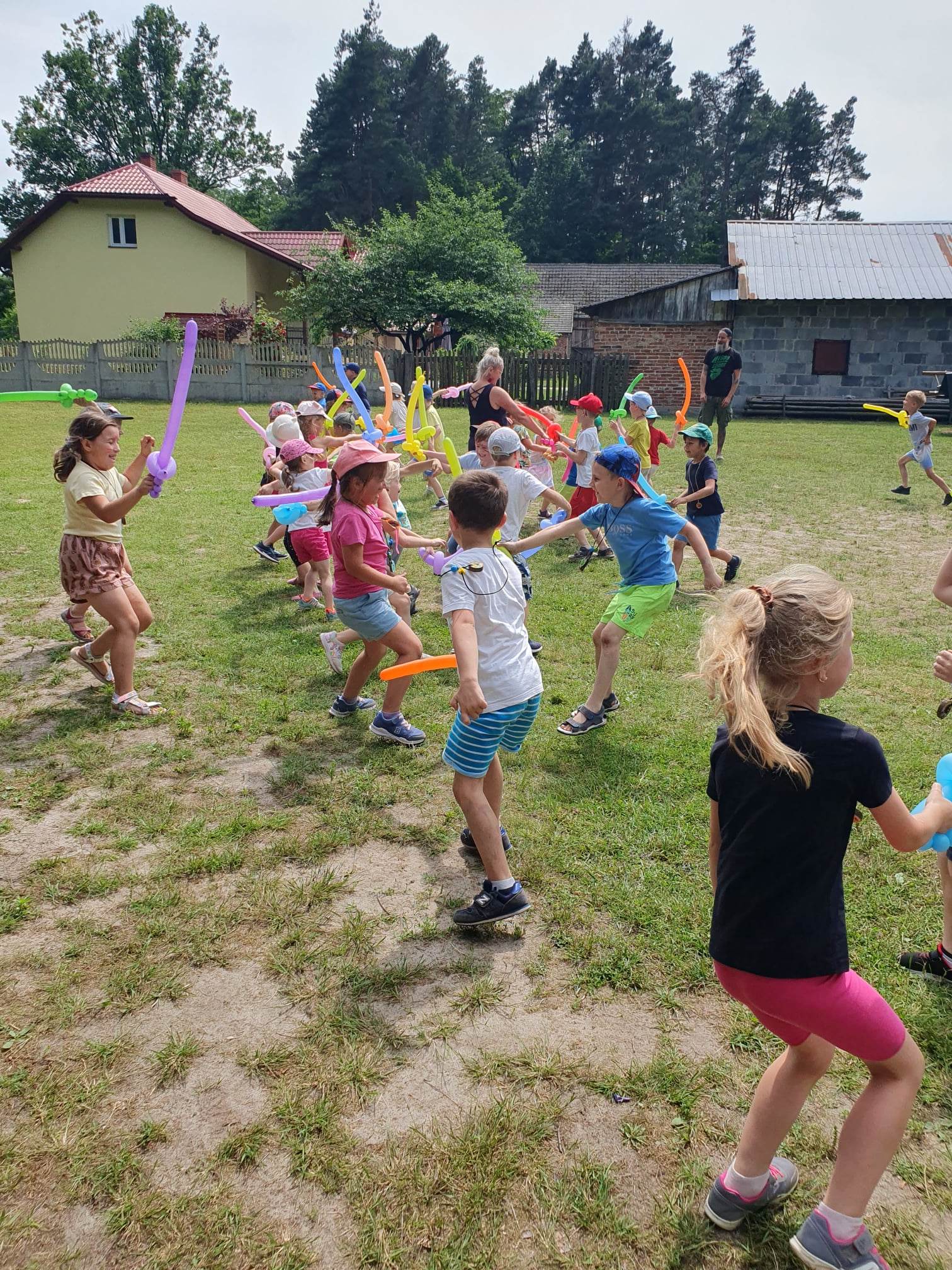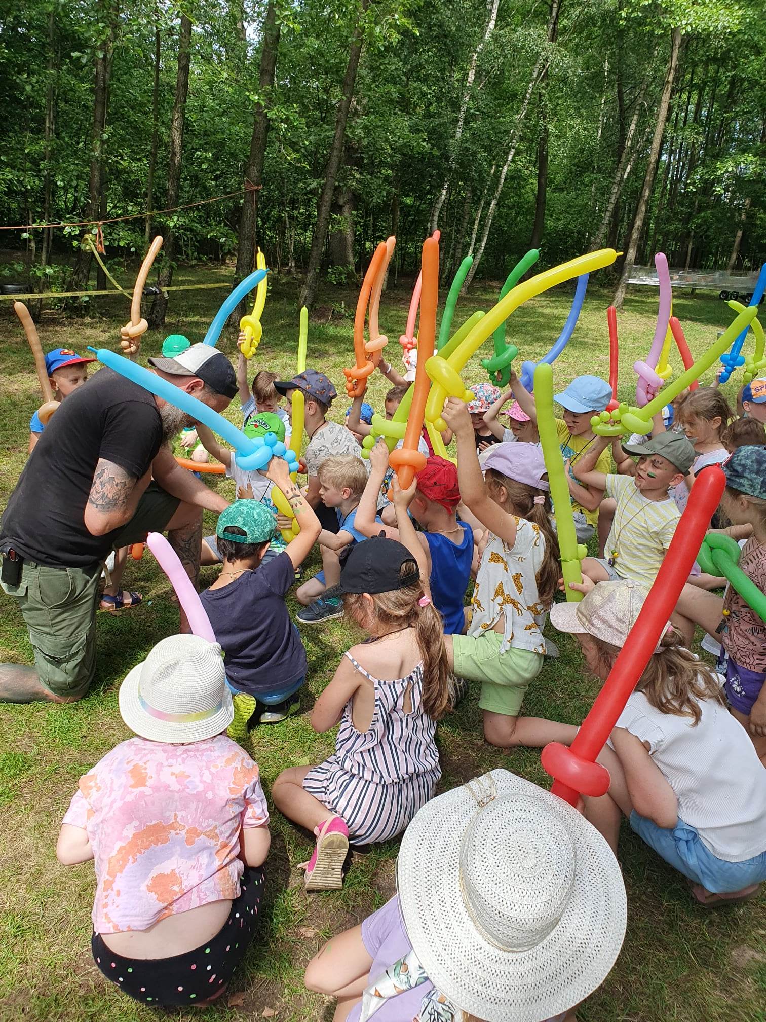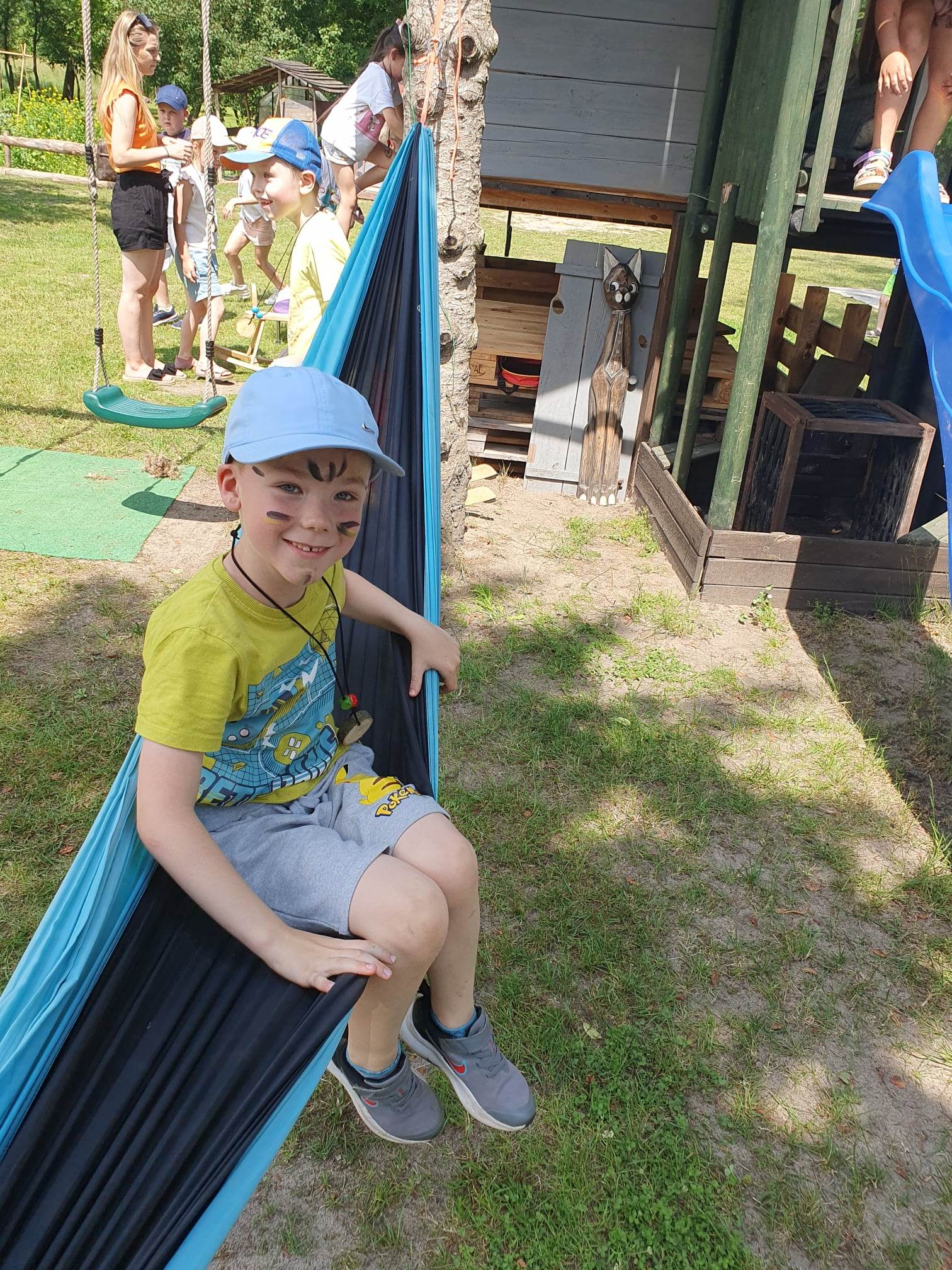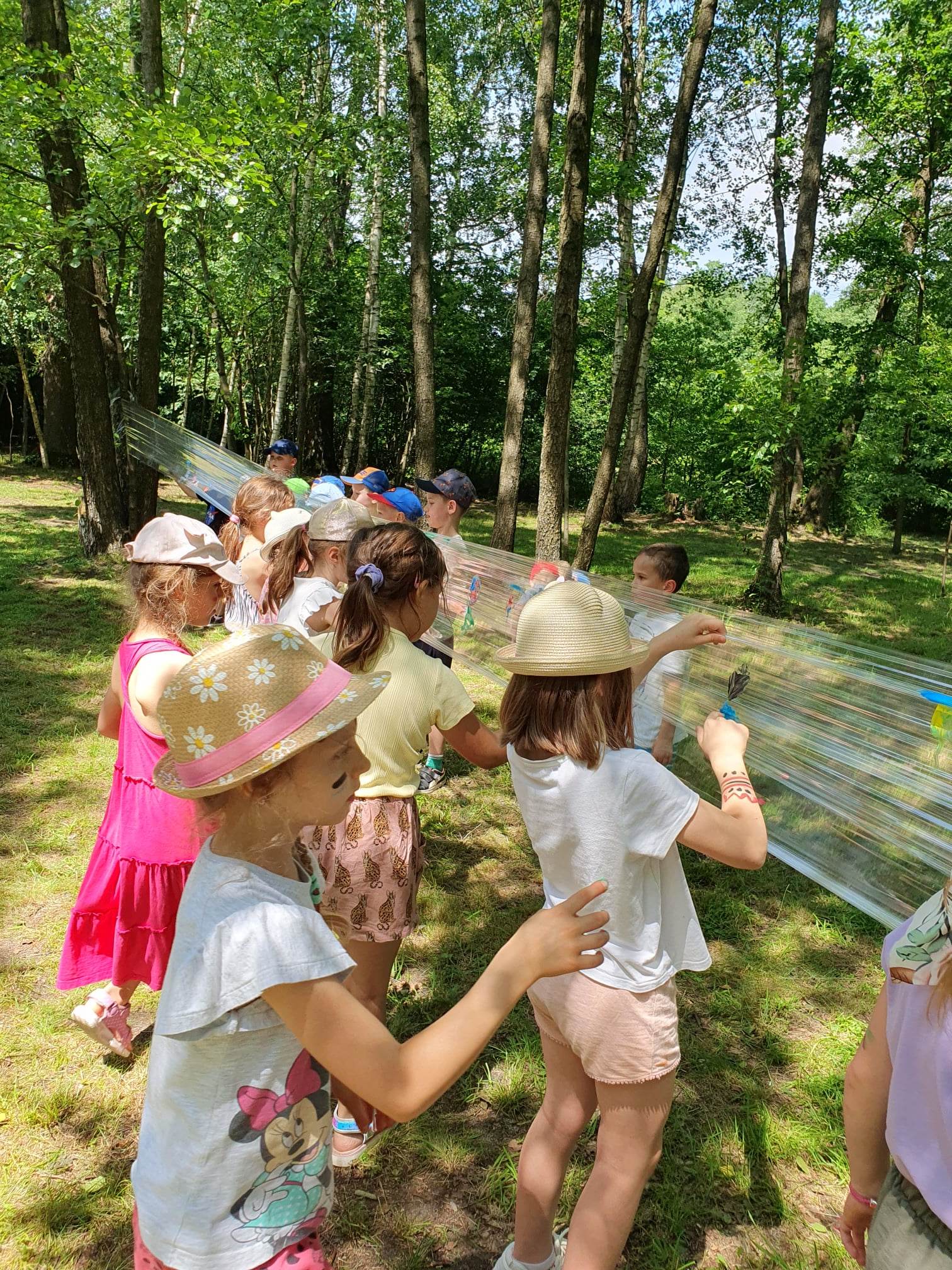 21.06.2023 r. przedszkolaki z Przedszkola nr 15 w Stalowej Woli, w ramach kontynuacji obchodów Dnia Dziecka, pojechały na wycieczkę autokarową do Osady Marianów w Zarzeczu koło Niska. Jako pierwsze, po śniadaniu, pojechały dzieci z grup młodszych; 3-latki grupa „Krasnale”, 4- latki grupa „Misie” oraz dzieci z grupy mieszanej wiekowo 3,4,5-latki,tj. grupa „Biedronki”. Drugą turą, po obiedzie, pojechały dzieci z grup starszych; 5-latki grupa „ Motylki” oraz 6-latki grupa „Zajączki”. Celem wyjazdu było przybliżenie dzieciom zdrowego stylu życia, a także rozbudzanie zainteresowania przyrodą i jej darami. Nauka sposobów spędzania wolnego czasu w poszanowaniu środowiska oraz umiejętne korzystanie z jego elementów z taktem, szacunkiem oraz z kulturą. W sposób praktyczny poznały znaczenie słowa „ekologia” ze wszystkimi jej elementami. Organizowane zabawy, zajęcia oraz sam pobyt na świeżym powietrzu z dala od miasta w otoczeniu przyrody, będącej naturalnym źródłem bodźców z bardzo małą ingerencją człowieka, miało pozytywny wpływ na zdrowie psychiczne i fizyczne dzieci, a także przyczyniło się do kształtowania u dzieci postawy zainteresowania, dbałości o przyrodę w jej niezmienionej formie już od najmłodszych lat. Rozbudziła się świadomość przestrzegania zasad ochrony przyrody w codziennym życiu. Na miejscu zostaliśmy przywitani przez gospodarza Osady Marianów. Zwiedzanie rozpoczęliśmy od wyjaśnienia pojęcia ekologia, a przedszkolaki miały możliwość obserwacji przyrody z naturalną jej ekspozycją, minimalistyczną ingerencją w jej urok ze strony człowieka. Otoczenie bezpośrednio wtapiało się w las ze starodrzewiem. Pierwszym elementem pobytu było przejście przez zawieszoną na wysokości kładkę i zjazd na rolce . Dzieci bez oporów skorzystały z atrakcji, radość nie miała granic. Kolejnym elementem wycieczki była wizyta u królików. Wypuszczone z „Domku dla królikow” w prowizorycznej zagródce skubały świeżą trawę. Dzieci miały możliwość wielozmysłowego poznania zwierząt. Przedszkolaki mogły pogłaskać królika, umiejętnie wziąć na ręce, aby ich nie podrapały i przytulić. W dalszej części wycieczki dzieci wzięły udział w warsztatach malowania na folii rozwieszonej pomiędzy drzewami. Po zakończonych warsztatach dzieci zostały przygotowane do dalszej zabawy, tym razem w Indian, gospodyni wykonała na ich twarzach malunki w barwach wojennych i zaprosiła do Tipi, gdzie wspólnie z gospodarzem uczyły się różnych zawołań plemiennych. Kolejnym etapem była chwila odpoczynku. Dzieci z apetytem zjadły bułeczki, napiły się wody z limonką i miętą z ogrodu gospodarzy. Przedszkolaki miały możliwość poznania roślinności otaczającej place zabaw oraz nauczyły się jak nazywają się piętra lasu. Byli chętni do odpoczynku w hamaku. Po chwili odpoczynku, rozmów z kolegami lub wsłuchiwaniu się w ciszę lasu, śpiew ptaków ,gotowe były do dalszych zabaw na łonie natury, to był czas wolny. Możliwości zabaw nie było końca. Atrakcją był konik na biegunach, jazda na rowerze, szaleństwa na trampolinach, jazda na gokartach, zabawy w domku na drzewie, zjeżdżalnie, huśtawki. Chłopcy, już tradycyjnie, grali w piłkę nożną. W trakcie zabaw gospodyni Osady zaprosiła dzieci do wykonania pamiątkowych zawieszek z kawałków drewnianych gałązek ozdabianych flamastrami i koralikami. Własnoręcznie wykonane zawieszki dekorowały szyję każdego uczestnika. Kolejnym etapem zabaw w Osadzie Marianów była zabawa z balonami. Dzieci otrzymały balonowe miecze i razem z gospodarzem Osady złożyły przysięgę przygotowującą do walki. Grupa podzielona została na zespoły, dziewczynki i chłopcy. Każda z drużyn wydała okrzyk zapraszający i dzieci przystąpiły do zabawy, każdy musiał dotknąć balonowym mieczem największą liczbę dzieci. Potem zachęcone przez gospodarza zaatakowały wychowawczynie. Grupa podzielona została na zespoły, dziewczynki i chłopcy. Każda z drużyn wydała okrzyk zapraszający i dzieci przystąpiły do zabawy, każdy musiał dotknąć balonowym mieczem największą liczbę dzieci. Potem zachęcone przez gospodarza zaatakowały wychowawczynie. Zamierzone cele wycieczki zostały zrealizowane. Przedszkolaki chętnie i z dużym zaangażowaniem uczestniczyły we wszystkich zorganizowanych zajęciach. Umorusane i uśmiechnięte buzie dzieci świadczyły o tym, że Dzień Dziecka w Osadzie Marianów przyniósł im dużo radości i będzie długo przez nie wspominany. Był to wspaniały prezent. Zdobyły wiedzę z zakresu ekologii i poznały sposoby spędzania wolnego czasu na łonie natury.