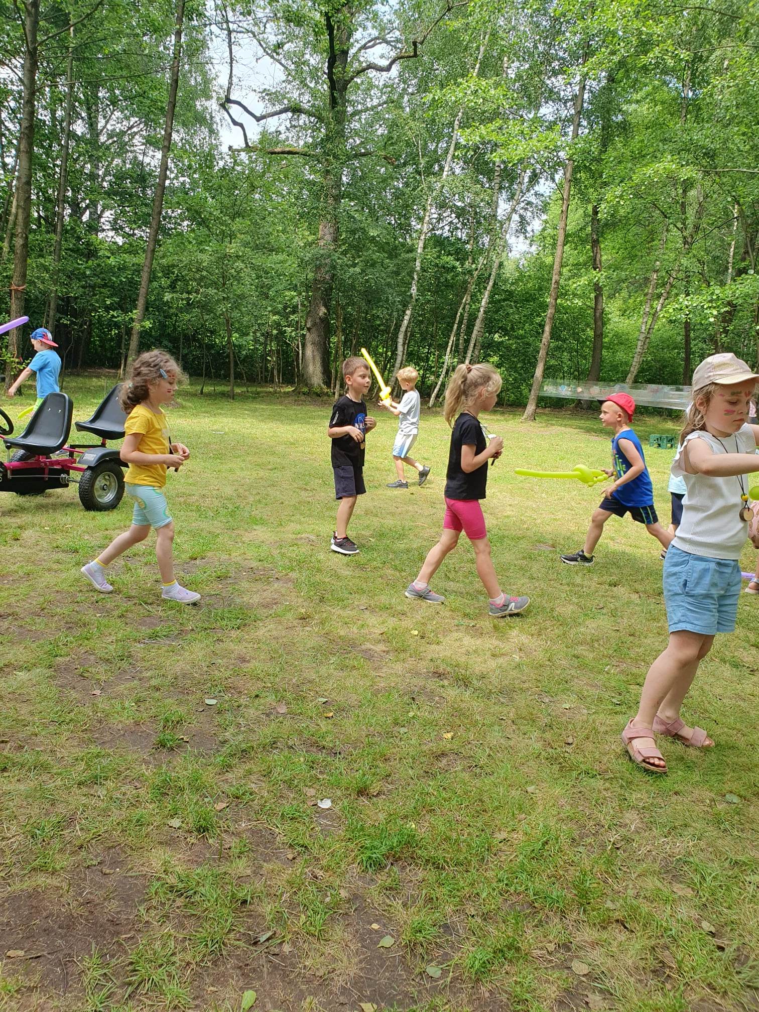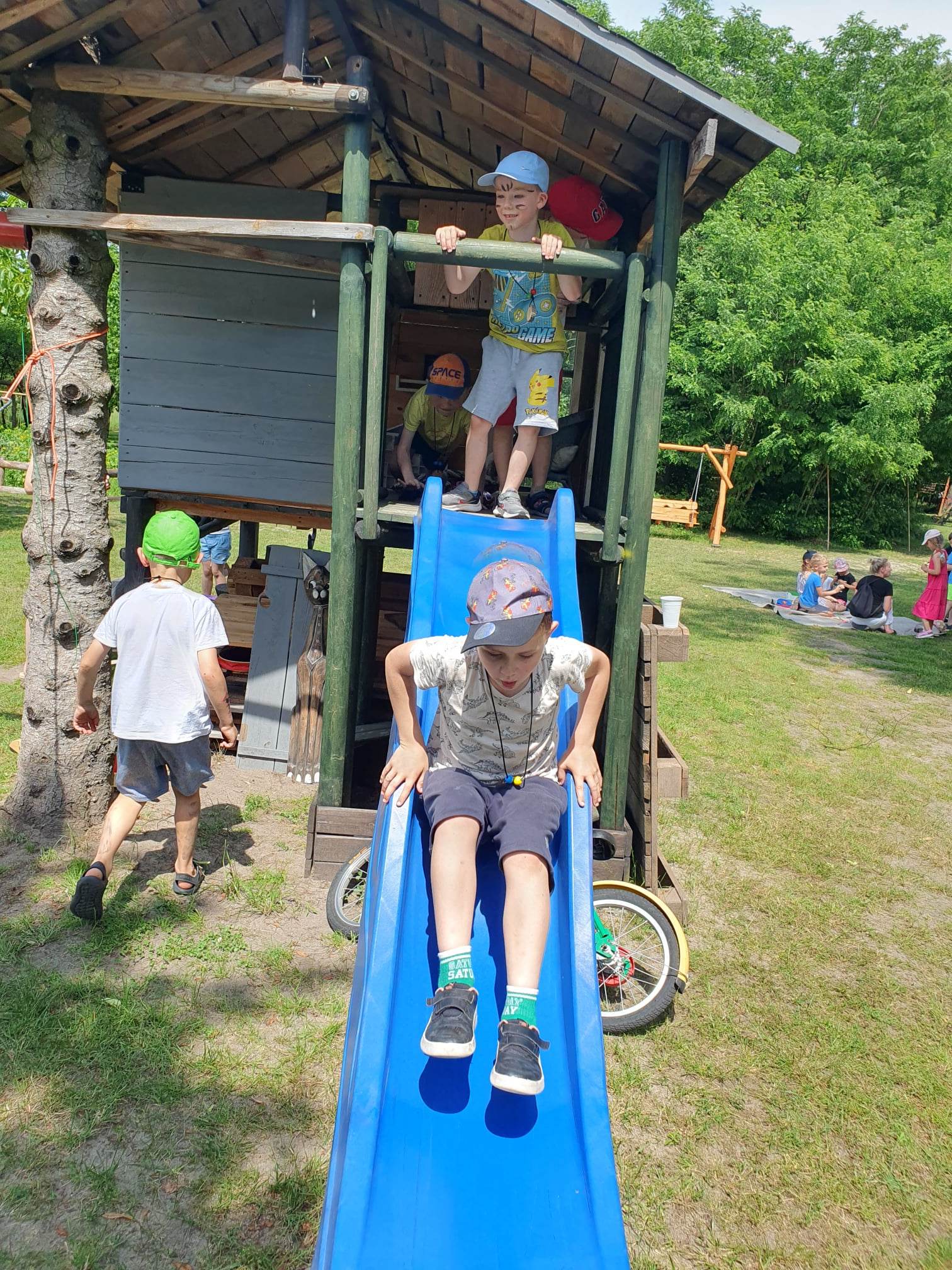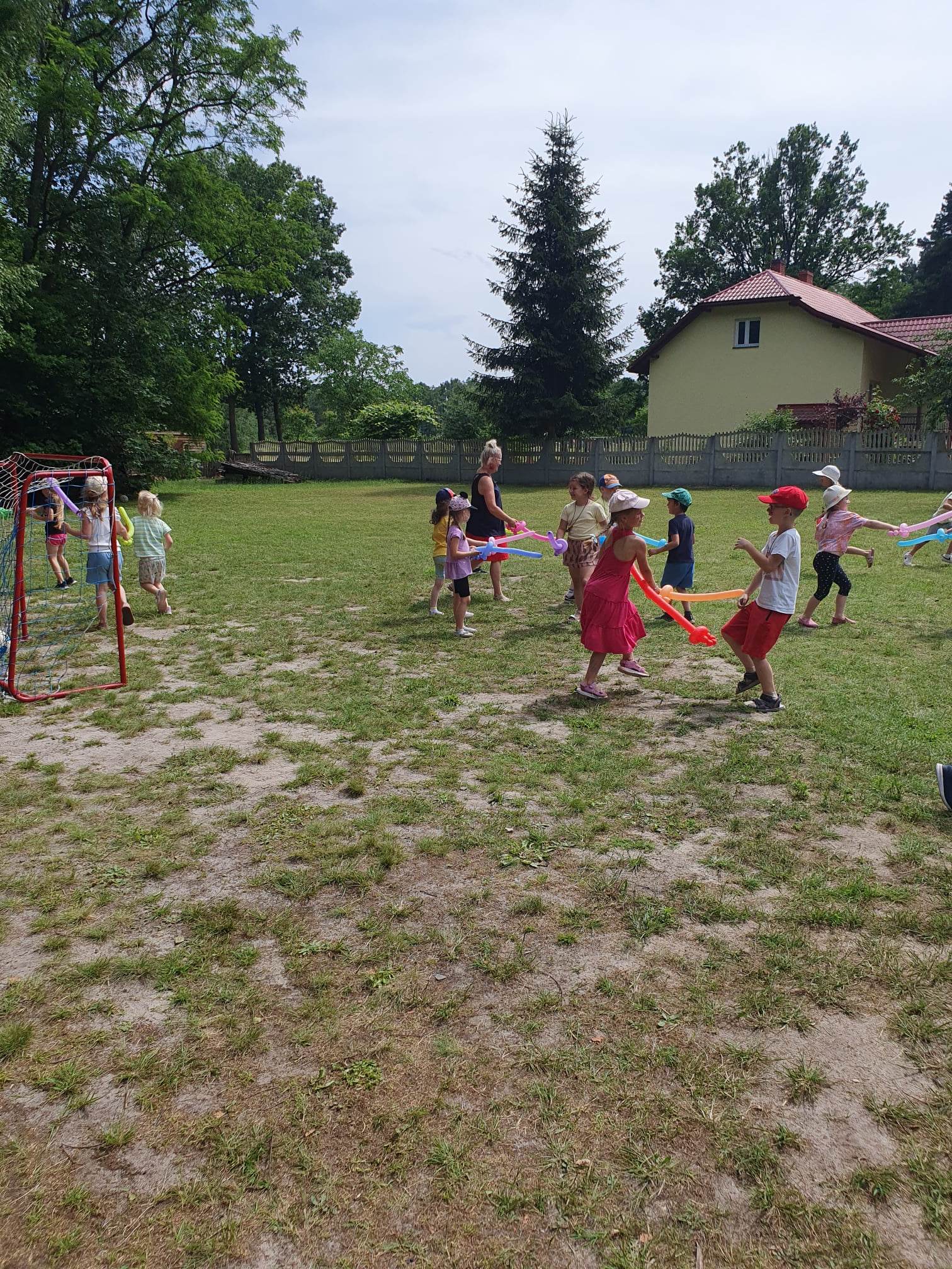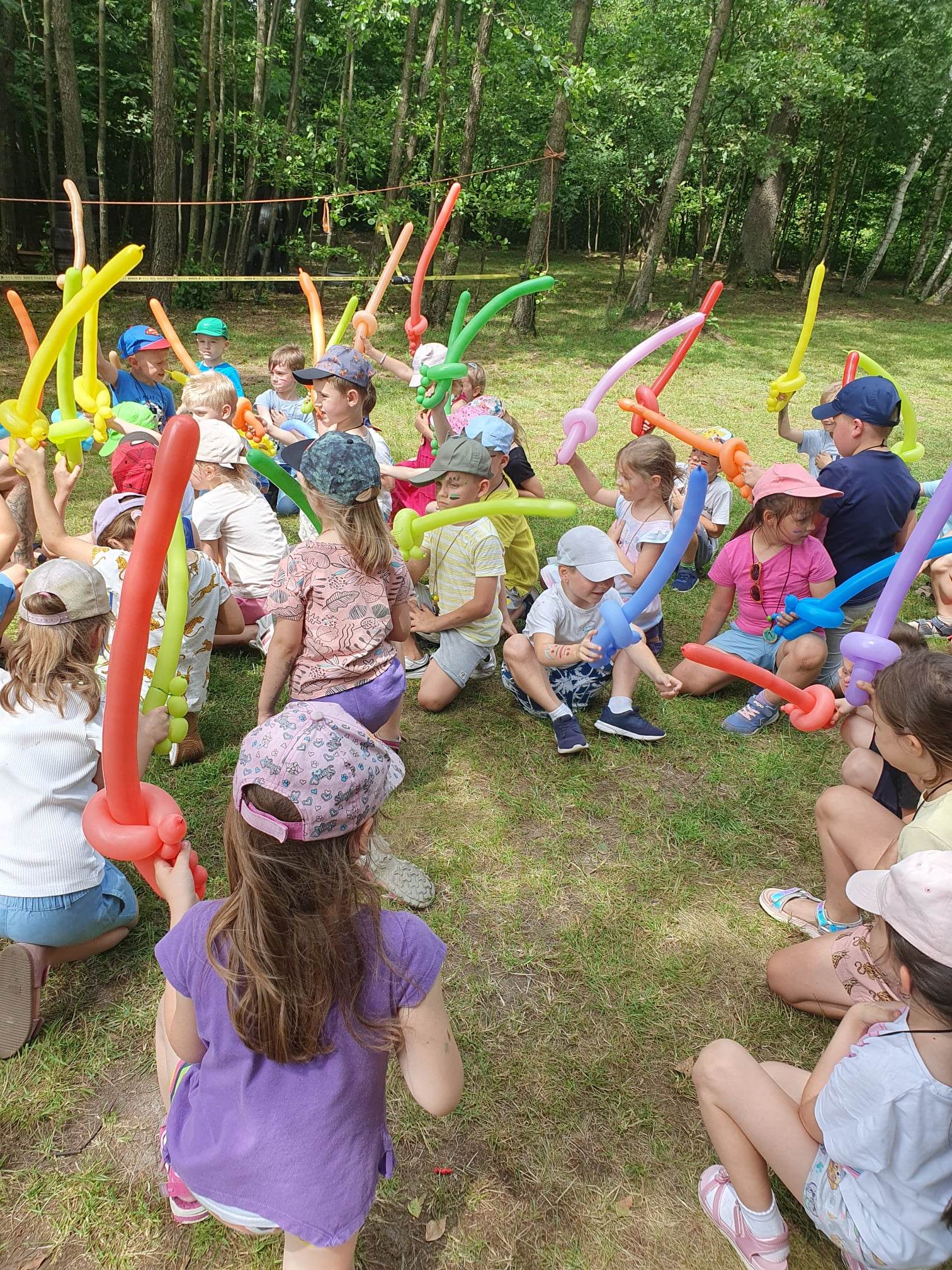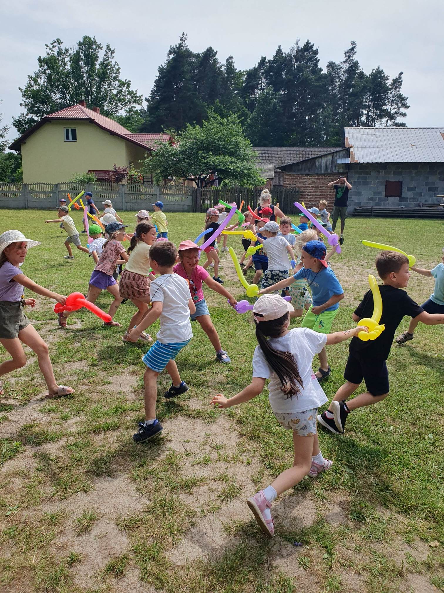 21.06.2023 r. przedszkolaki z Przedszkola nr 15 w Stalowej Woli, w ramach kontynuacji obchodów Dnia Dziecka, pojechały na wycieczkę autokarową do Osady Marianów w Zarzeczu koło Niska. Jako pierwsze, po śniadaniu, pojechały dzieci z grup młodszych; 3-latki grupa „Krasnale”, 4- latki grupa „Misie” oraz dzieci z grupy mieszanej wiekowo 3,4,5-latki,tj. grupa „Biedronki”. Drugą turą, po obiedzie, pojechały dzieci z grup starszych; 5-latki grupa „ Motylki” oraz 6-latki grupa „Zajączki”. Celem wyjazdu było przybliżenie dzieciom zdrowego stylu życia, a także rozbudzanie zainteresowania przyrodą i jej darami. Nauka sposobów spędzania wolnego czasu w poszanowaniu środowiska oraz umiejętne korzystanie z jego elementów z taktem, szacunkiem oraz z kulturą. W sposób praktyczny poznały znaczenie słowa „ekologia” ze wszystkimi jej elementami. Organizowane zabawy, zajęcia oraz sam pobyt na świeżym powietrzu z dala od miasta w otoczeniu przyrody, będącej naturalnym źródłem bodźców z bardzo małą ingerencją człowieka, miało pozytywny wpływ na zdrowie psychiczne i fizyczne dzieci, a także przyczyniło się do kształtowania u dzieci postawy zainteresowania, dbałości o przyrodę w jej niezmienionej formie już od najmłodszych lat. Rozbudziła się świadomość przestrzegania zasad ochrony przyrody w codziennym życiu. Na miejscu zostaliśmy przywitani przez gospodarza Osady Marianów. Zwiedzanie rozpoczęliśmy od wyjaśnienia pojęcia ekologia, a przedszkolaki miały możliwość obserwacji przyrody z naturalną jej ekspozycją, minimalistyczną ingerencją w jej urok ze strony człowieka. Otoczenie bezpośrednio wtapiało się w las ze starodrzewiem. Pierwszym elementem pobytu było przejście przez zawieszoną na wysokości kładkę i zjazd na rolce . Dzieci bez oporów skorzystały z atrakcji, radość nie miała granic. Kolejnym elementem wycieczki była wizyta u królików. Wypuszczone z „Domku dla królikow” w prowizorycznej zagródce skubały świeżą trawę. Dzieci miały możliwość wielozmysłowego poznania zwierząt. Przedszkolaki mogły pogłaskać królika, umiejętnie wziąć na ręce, aby ich nie podrapały i przytulić. W dalszej części wycieczki dzieci wzięły udział w warsztatach malowania na folii rozwieszonej pomiędzy drzewami. Po zakończonych warsztatach dzieci zostały przygotowane do dalszej zabawy, tym razem w Indian, gospodyni wykonała na ich twarzach malunki w barwach wojennych i zaprosiła do Tipi, gdzie wspólnie z gospodarzem uczyły się różnych zawołań plemiennych. Kolejnym etapem była chwila odpoczynku. Dzieci z apetytem zjadły bułeczki, napiły się wody z limonką i miętą z ogrodu gospodarzy. Przedszkolaki miały możliwość poznania roślinności otaczającej place zabaw oraz nauczyły się jak nazywają się piętra lasu. Byli chętni do odpoczynku w hamaku. Po chwili odpoczynku, rozmów z kolegami lub wsłuchiwaniu się w ciszę lasu, śpiew ptaków ,gotowe były do dalszych zabaw na łonie natury, to był czas wolny. Możliwości zabaw nie było końca. Atrakcją był konik na biegunach, jazda na rowerze, szaleństwa na trampolinach, jazda na gokartach, zabawy w domku na drzewie, zjeżdżalnie, huśtawki. Chłopcy, już tradycyjnie, grali w piłkę nożną. W trakcie zabaw gospodyni Osady zaprosiła dzieci do wykonania pamiątkowych zawieszek z kawałków drewnianych gałązek ozdabianych flamastrami i koralikami. Własnoręcznie wykonane zawieszki dekorowały szyję każdego uczestnika. Kolejnym etapem zabaw w Osadzie Marianów była zabawa z balonami. Dzieci otrzymały balonowe miecze i razem z gospodarzem Osady złożyły przysięgę przygotowującą do walki. Grupa podzielona została na zespoły, dziewczynki i chłopcy. Każda z drużyn wydała okrzyk zapraszający i dzieci przystąpiły do zabawy, każdy musiał dotknąć balonowym mieczem największą liczbę dzieci. Potem zachęcone przez gospodarza zaatakowały wychowawczynie. Grupa podzielona została na zespoły, dziewczynki i chłopcy. Każda z drużyn wydała okrzyk zapraszający i dzieci przystąpiły do zabawy, każdy musiał dotknąć balonowym mieczem największą liczbę dzieci. Potem zachęcone przez gospodarza zaatakowały wychowawczynie. Zamierzone cele wycieczki zostały zrealizowane. Przedszkolaki chętnie i z dużym zaangażowaniem uczestniczyły we wszystkich zorganizowanych zajęciach. Umorusane i uśmiechnięte buzie dzieci świadczyły o tym, że Dzień Dziecka w Osadzie Marianów przyniósł im dużo radości i będzie długo przez nie wspominany. Był to wspaniały prezent. Zdobyły wiedzę z zakresu ekologii i poznały sposoby spędzania wolnego czasu na łonie natury.