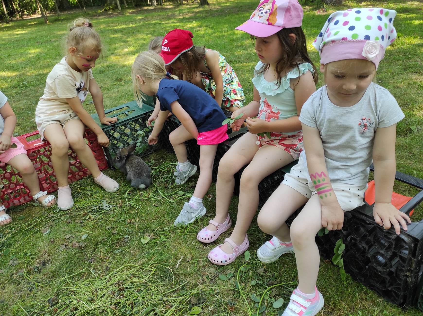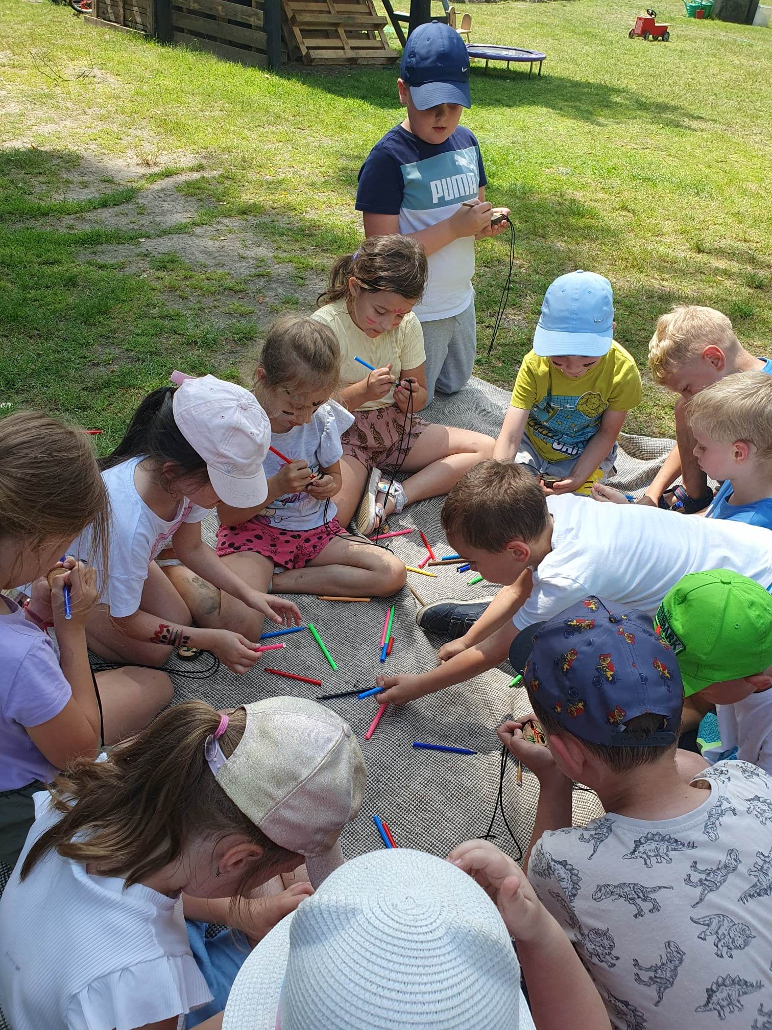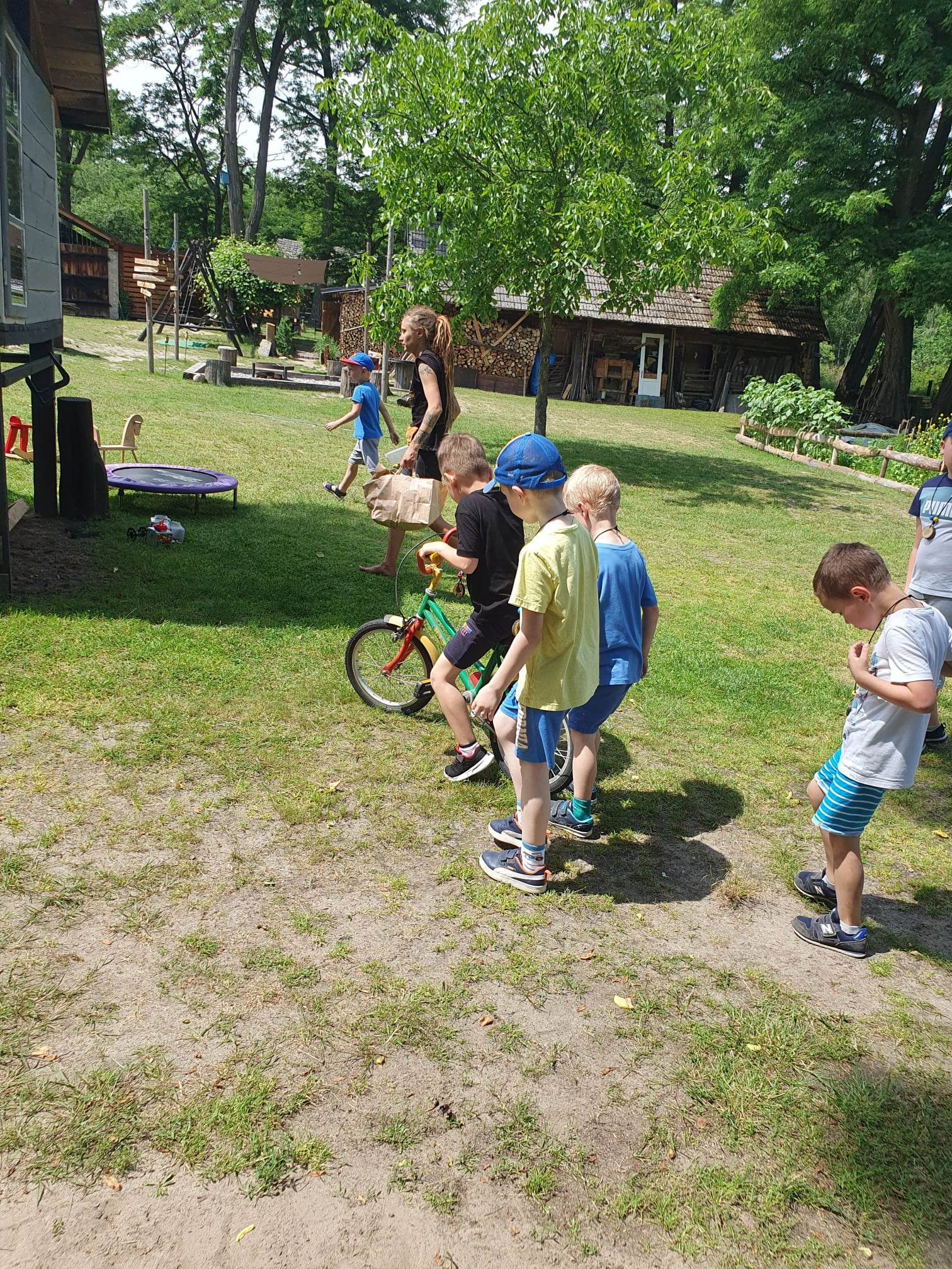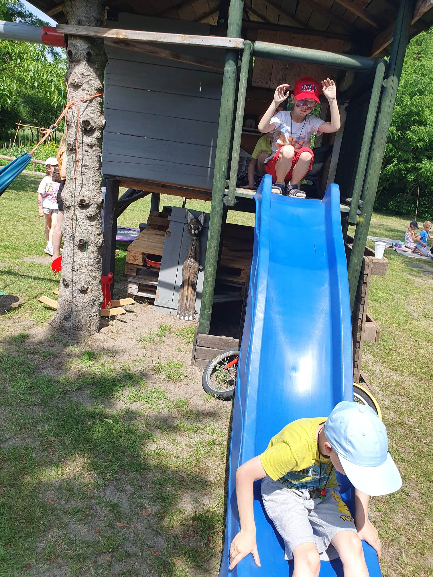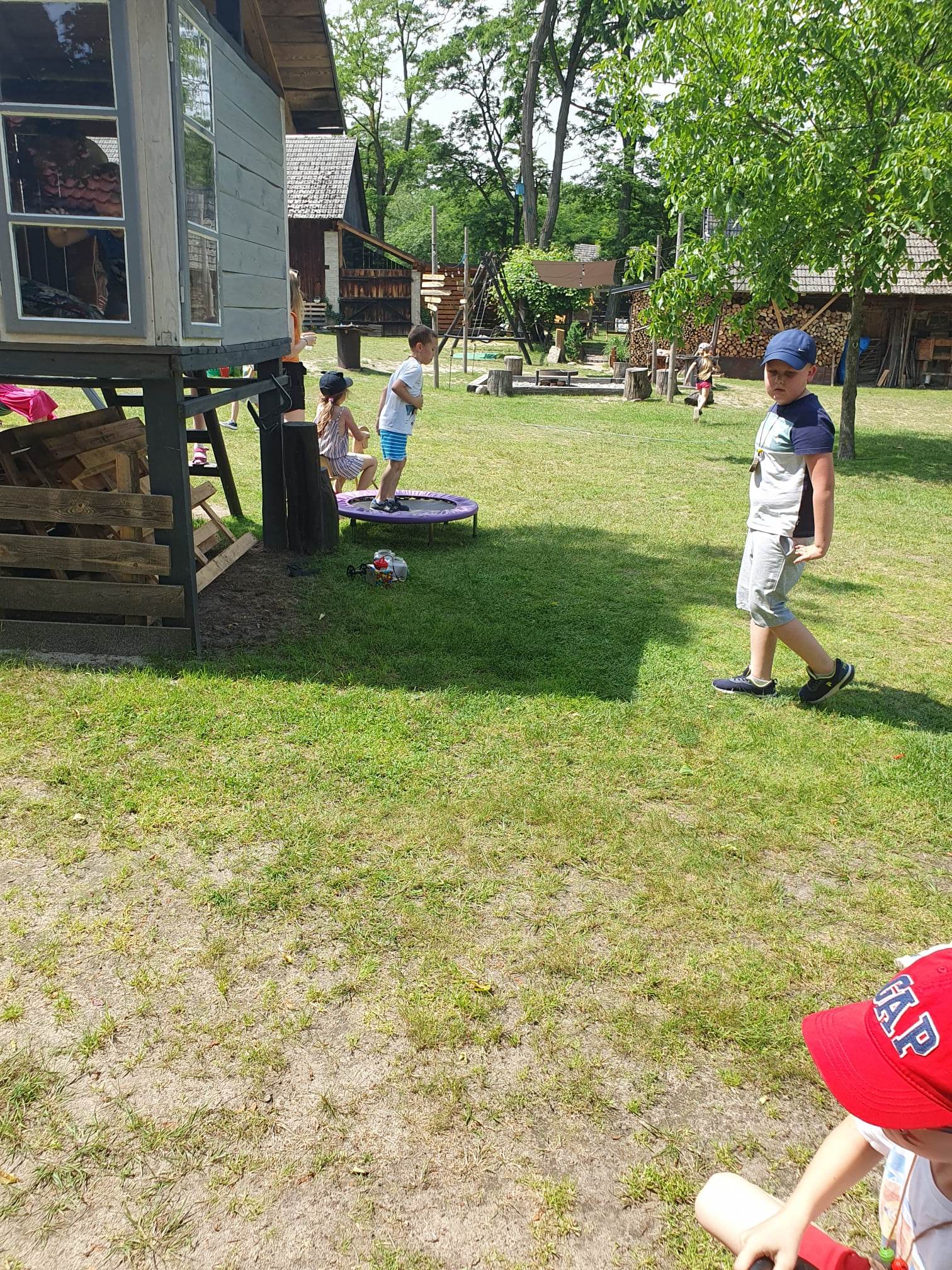 21.06.2023 r. przedszkolaki z Przedszkola nr 15 w Stalowej Woli, w ramach kontynuacji obchodów Dnia Dziecka, pojechały na wycieczkę autokarową do Osady Marianów w Zarzeczu koło Niska. Jako pierwsze, po śniadaniu, pojechały dzieci z grup młodszych; 3-latki grupa „Krasnale”, 4- latki grupa „Misie” oraz dzieci z grupy mieszanej wiekowo 3,4,5-latki,tj. grupa „Biedronki”. Drugą turą, po obiedzie, pojechały dzieci z grup starszych; 5-latki grupa „ Motylki” oraz 6-latki grupa „Zajączki”. Celem wyjazdu było przybliżenie dzieciom zdrowego stylu życia, a także rozbudzanie zainteresowania przyrodą i jej darami. Nauka sposobów spędzania wolnego czasu w poszanowaniu środowiska oraz umiejętne korzystanie z jego elementów z taktem, szacunkiem oraz z kulturą. W sposób praktyczny poznały znaczenie słowa „ekologia” ze wszystkimi jej elementami. Organizowane zabawy, zajęcia oraz sam pobyt na świeżym powietrzu z dala od miasta w otoczeniu przyrody, będącej naturalnym źródłem bodźców z bardzo małą ingerencją człowieka, miało pozytywny wpływ na zdrowie psychiczne i fizyczne dzieci, a także przyczyniło się do kształtowania u dzieci postawy zainteresowania, dbałości o przyrodę w jej niezmienionej formie już od najmłodszych lat. Rozbudziła się świadomość przestrzegania zasad ochrony przyrody w codziennym życiu. Na miejscu zostaliśmy przywitani przez gospodarza Osady Marianów. Zwiedzanie rozpoczęliśmy od wyjaśnienia pojęcia ekologia, a przedszkolaki miały możliwość obserwacji przyrody z naturalną jej ekspozycją, minimalistyczną ingerencją w jej urok ze strony człowieka. Otoczenie bezpośrednio wtapiało się w las ze starodrzewiem. Pierwszym elementem pobytu było przejście przez zawieszoną na wysokości kładkę i zjazd na rolce . Dzieci bez oporów skorzystały z atrakcji, radość nie miała granic. Kolejnym elementem wycieczki była wizyta u królików. Wypuszczone z „Domku dla królikow” w prowizorycznej zagródce skubały świeżą trawę. Dzieci miały możliwość wielozmysłowego poznania zwierząt. Przedszkolaki mogły pogłaskać królika, umiejętnie wziąć na ręce, aby ich nie podrapały i przytulić. W dalszej części wycieczki dzieci wzięły udział w warsztatach malowania na folii rozwieszonej pomiędzy drzewami. Po zakończonych warsztatach dzieci zostały przygotowane do dalszej zabawy, tym razem w Indian, gospodyni wykonała na ich twarzach malunki w barwach wojennych i zaprosiła do Tipi, gdzie wspólnie z gospodarzem uczyły się różnych zawołań plemiennych. Kolejnym etapem była chwila odpoczynku. Dzieci z apetytem zjadły bułeczki, napiły się wody z limonką i miętą z ogrodu gospodarzy. Przedszkolaki miały możliwość poznania roślinności otaczającej place zabaw oraz nauczyły się jak nazywają się piętra lasu. Byli chętni do odpoczynku w hamaku. Po chwili odpoczynku, rozmów z kolegami lub wsłuchiwaniu się w ciszę lasu, śpiew ptaków ,gotowe były do dalszych zabaw na łonie natury, to był czas wolny. Możliwości zabaw nie było końca. Atrakcją był konik na biegunach, jazda na rowerze, szaleństwa na trampolinach, jazda na gokartach, zabawy w domku na drzewie, zjeżdżalnie, huśtawki. Chłopcy, już tradycyjnie, grali w piłkę nożną. W trakcie zabaw gospodyni Osady zaprosiła dzieci do wykonania pamiątkowych zawieszek z kawałków drewnianych gałązek ozdabianych flamastrami i koralikami. Własnoręcznie wykonane zawieszki dekorowały szyję każdego uczestnika. Kolejnym etapem zabaw w Osadzie Marianów była zabawa z balonami. Dzieci otrzymały balonowe miecze i razem z gospodarzem Osady złożyły przysięgę przygotowującą do walki. Grupa podzielona została na zespoły, dziewczynki i chłopcy. Każda z drużyn wydała okrzyk zapraszający i dzieci przystąpiły do zabawy, każdy musiał dotknąć balonowym mieczem największą liczbę dzieci. Potem zachęcone przez gospodarza zaatakowały wychowawczynie. Grupa podzielona została na zespoły, dziewczynki i chłopcy. Każda z drużyn wydała okrzyk zapraszający i dzieci przystąpiły do zabawy, każdy musiał dotknąć balonowym mieczem największą liczbę dzieci. Potem zachęcone przez gospodarza zaatakowały wychowawczynie. Zamierzone cele wycieczki zostały zrealizowane. Przedszkolaki chętnie i z dużym zaangażowaniem uczestniczyły we wszystkich zorganizowanych zajęciach. Umorusane i uśmiechnięte buzie dzieci świadczyły o tym, że Dzień Dziecka w Osadzie Marianów przyniósł im dużo radości i będzie długo przez nie wspominany. Był to wspaniały prezent. Zdobyły wiedzę z zakresu ekologii i poznały sposoby spędzania wolnego czasu na łonie natury.