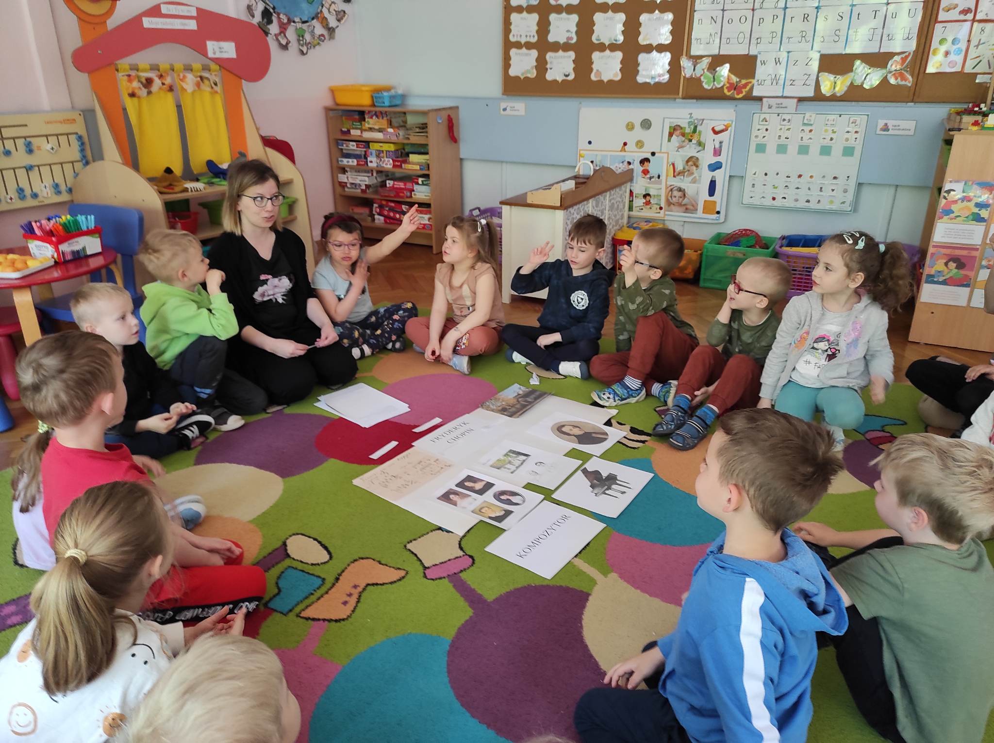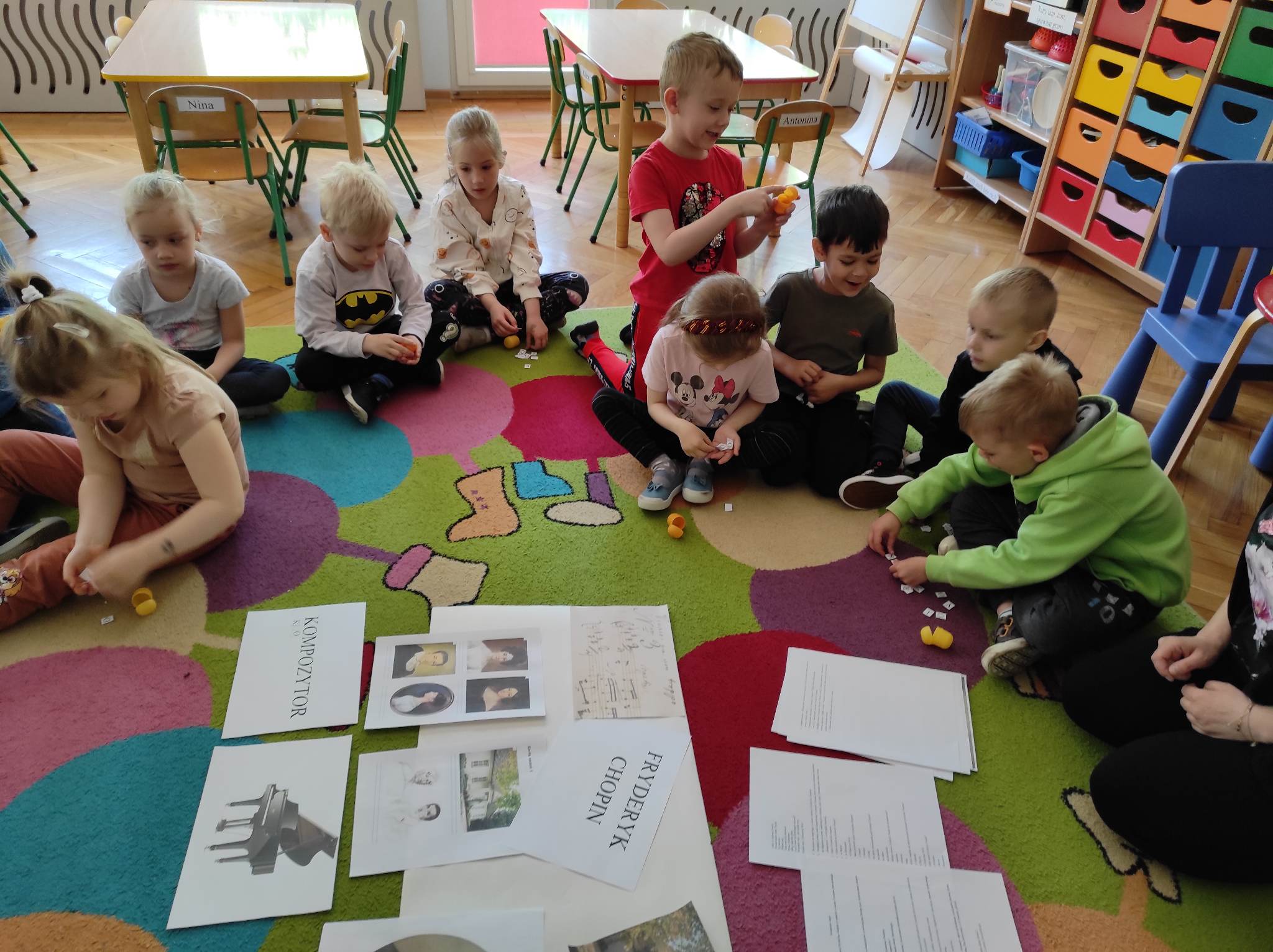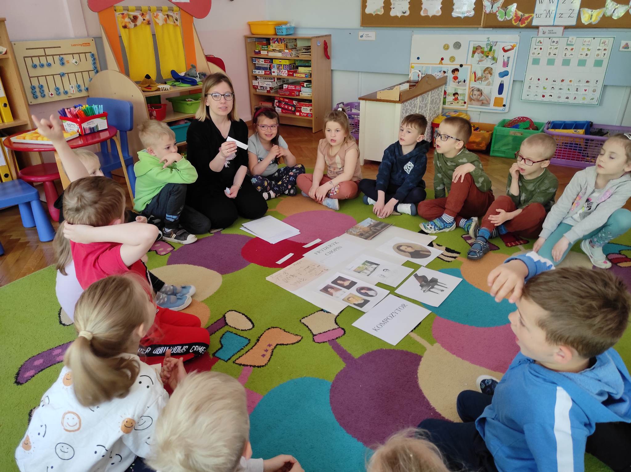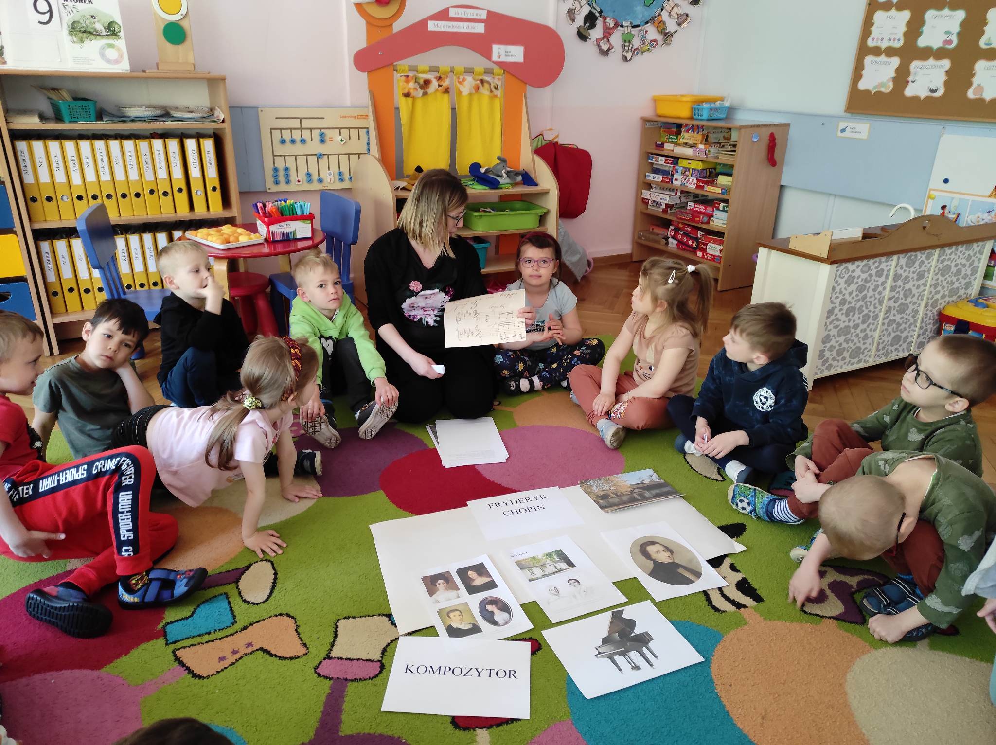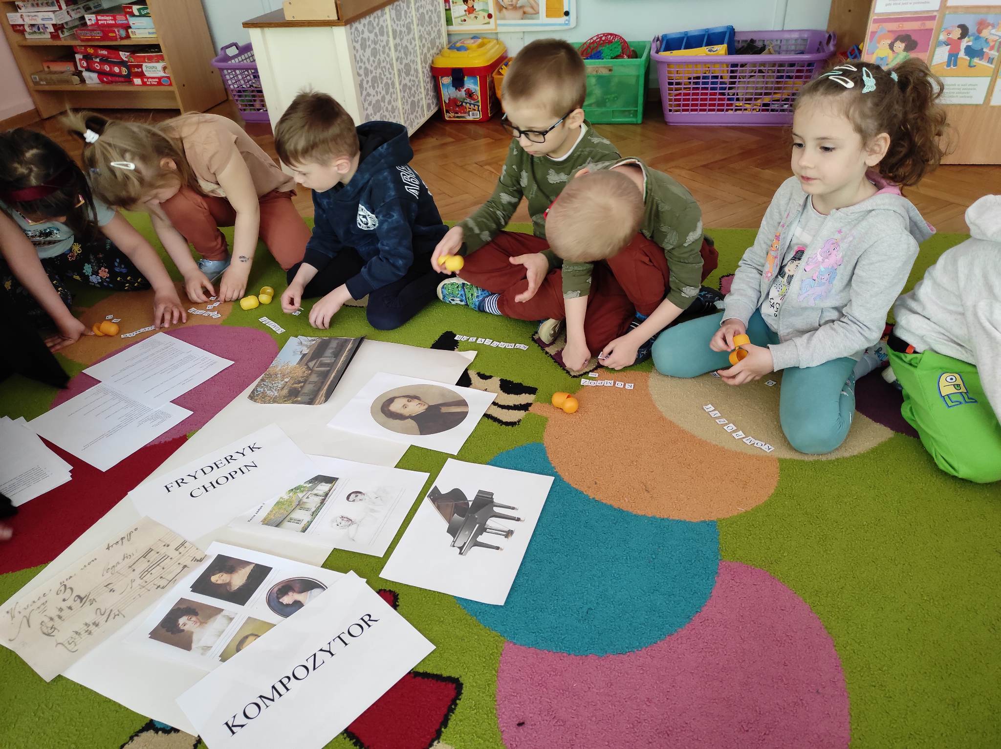 Przedszkolaki z grupy „Motylki“ wzięły w maju udział w zajęciach, podczas których poznały bliżej postać Fryderyka Chopina. Przedszkolaki rozpoczęły zajęcia od wysłuchania wiersza Czesława Janczarskiego „Żelazowa Wola“, w oparciu o ten wiersz i informacje przekazane przez nauczyciela poznały życie najsłynniejszego polskiego kompozytora. Każde z nich samodzielnie lub z niewielką pomocą ułożyło z rozsypanki literowej słowo „kompozytor“. Ponadto „Motylki“ improwizowały z wykorzystaniem wstążek do utworu „Minute Waltz. Jako podsumowanie biografii Chopina obejrzały animowany teatr cieni. Na koniec malowały do utworu „Polonez B-Dur“ wykorzystując do tego kawałki włóczki moczone w farbie. Celem zajęć było przede wszystkim: wprowadzenie dzieci w dziedzictwo cywilizacyjne Europy przy wykorzystaniu tekstów literackich; zapoznanie z historią życia Fryderyka Chopina; poznanie znaczenia słowa „kompozytor”; doskonalenie sprawności manualnej i poszerzanie doświadczeń plastycznych oraz rozwijanie kreatywności.