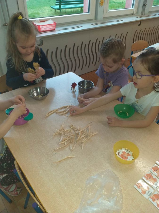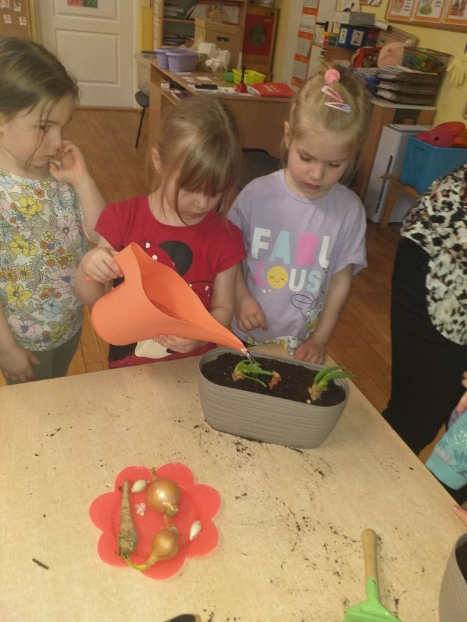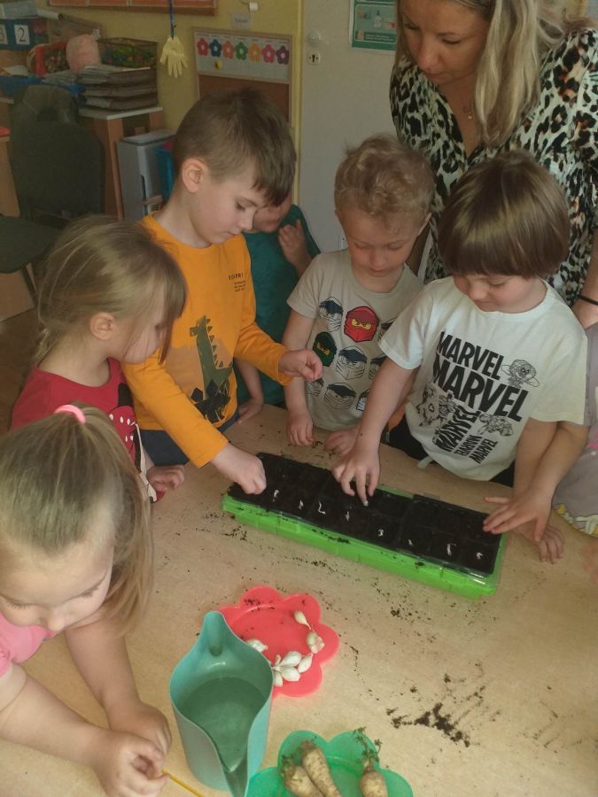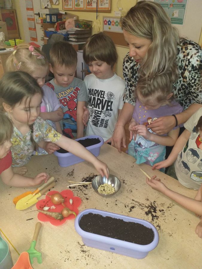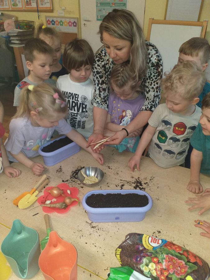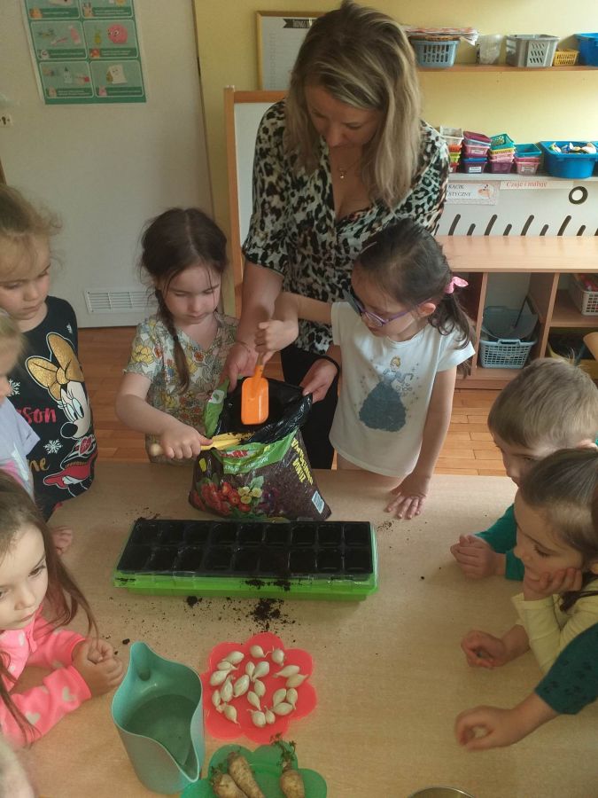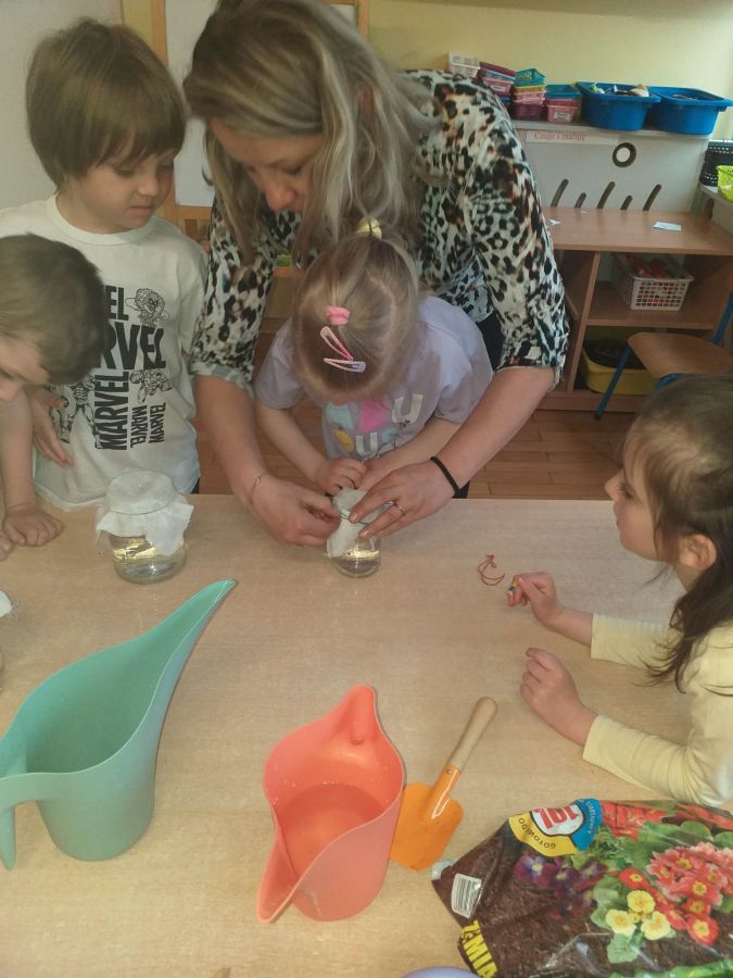 We wtorek 25.04.2023 r. dzieci z grupy ,,Misie” założyły zielony ogródek w sali, którego celem było wzbogacenie wiedzy dotyczącej hodowania wybranych roślin, wyrabianie nawyków zdrowego odżywiania oraz praca zespołowa. Rankiem dzieci wyjmowały ze strączków małe ziarenka fasolki, przeliczały je rozwijając umiejętności manualne, motorykę małą. ,,Misie” zgromadziły potrzebne przybory, narzędzia, ziemię, cebulki i nasionka. Przed przystąpieniem do pracy poznały warunki, jakie potrzebują rośliny do wzrostu. Po dokładnym omówieniu i pokazie poszczególnych czynności dzieci samodzielnie posadziły w doniczkach z ziemią cebulę na szczypiorek, pietruszkę na natkę i fasolę, posiały także nasturcję. Założyły również hodowlę wodną fasoli i cebuli kładąc je na gazie w słoiku z wodą. W ten sposób czterolatki mają okazję obserwować różnicę w kiełkowaniu i wzroście swoich roślinek. Dzieci mają możliwość codziennego kontaktu i obserwacji założonej hodowli, uczą się także odpowiedzialności w dbaniu o rośliny.