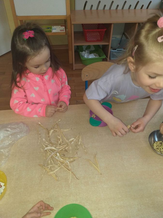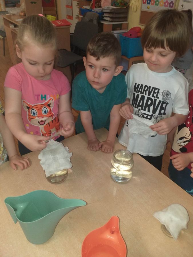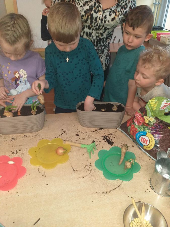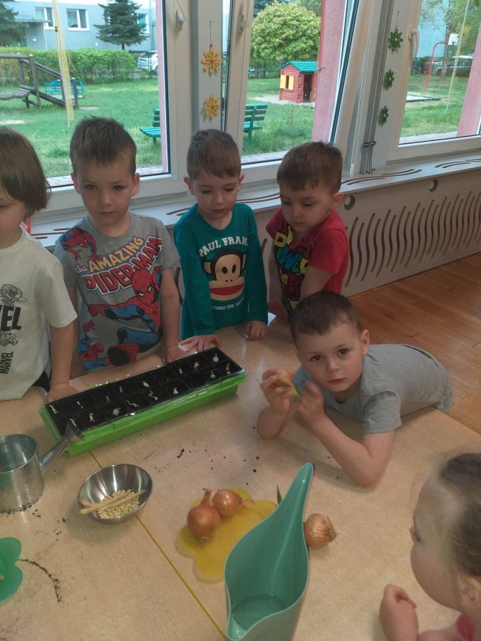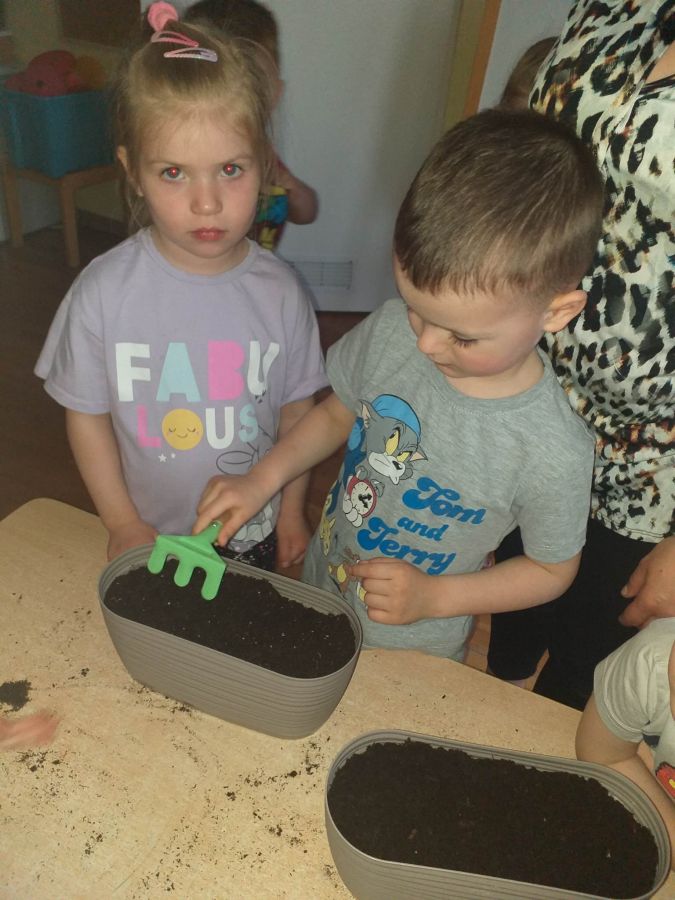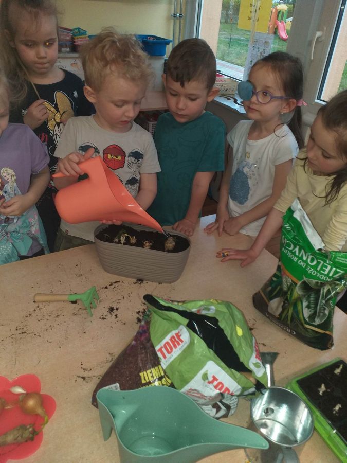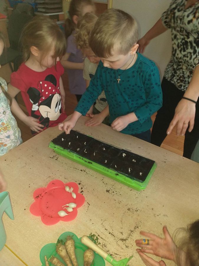 We wtorek 25.04.2023 r. dzieci z grupy ,,Misie” założyły zielony ogródek w sali, którego celem było wzbogacenie wiedzy dotyczącej hodowania wybranych roślin, wyrabianie nawyków zdrowego odżywiania oraz praca zespołowa. Rankiem dzieci wyjmowały ze strączków małe ziarenka fasolki, przeliczały je rozwijając umiejętności manualne, motorykę małą. ,,Misie” zgromadziły potrzebne przybory, narzędzia, ziemię, cebulki i nasionka. Przed przystąpieniem do pracy poznały warunki, jakie potrzebują rośliny do wzrostu. Po dokładnym omówieniu i pokazie poszczególnych czynności dzieci samodzielnie posadziły w doniczkach z ziemią cebulę na szczypiorek, pietruszkę na natkę i fasolę, posiały także nasturcję. Założyły również hodowlę wodną fasoli i cebuli kładąc je na gazie w słoiku z wodą. W ten sposób czterolatki mają okazję obserwować różnicę w kiełkowaniu i wzroście swoich roślinek. Dzieci mają możliwość codziennego kontaktu i obserwacji założonej hodowli, uczą się także odpowiedzialności w dbaniu o rośliny.