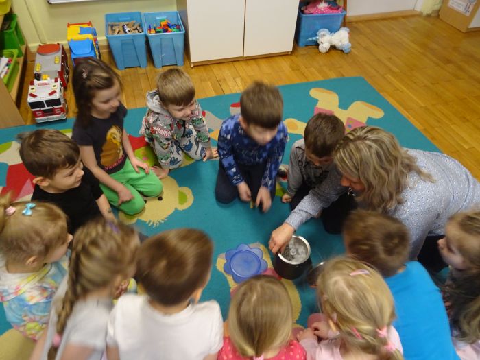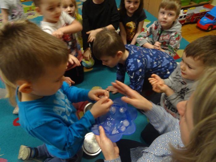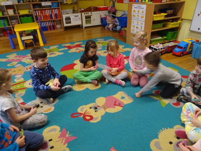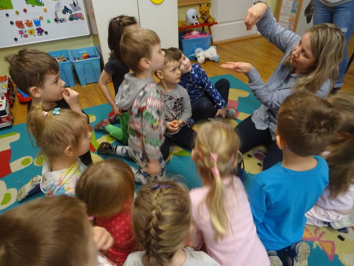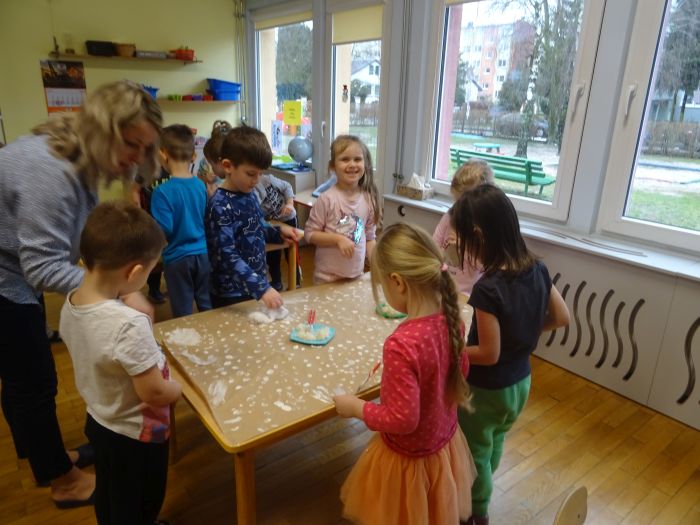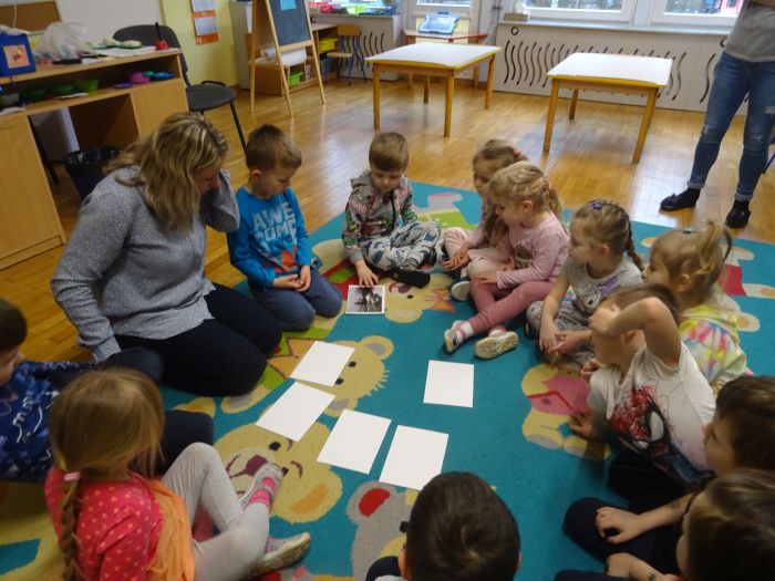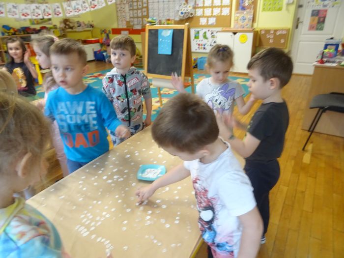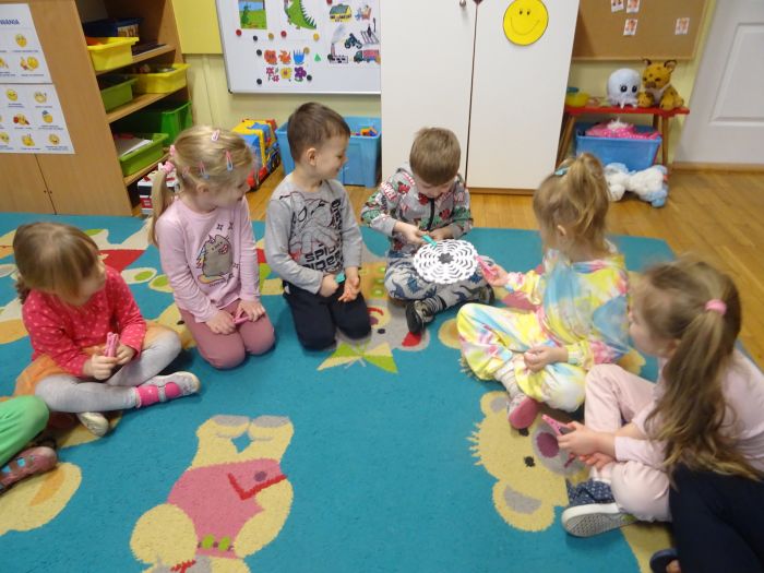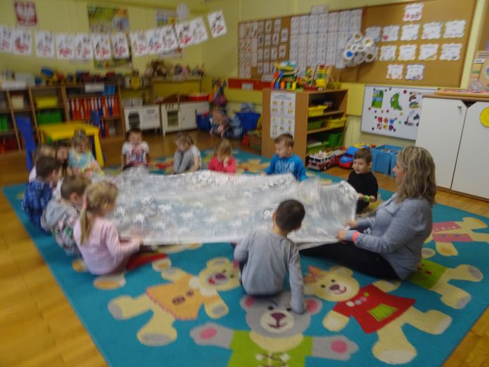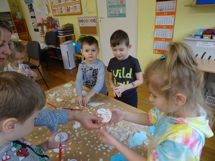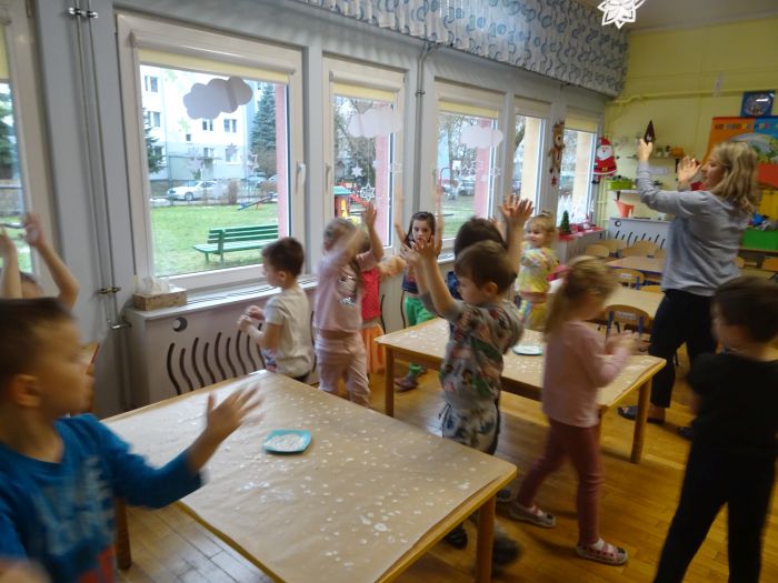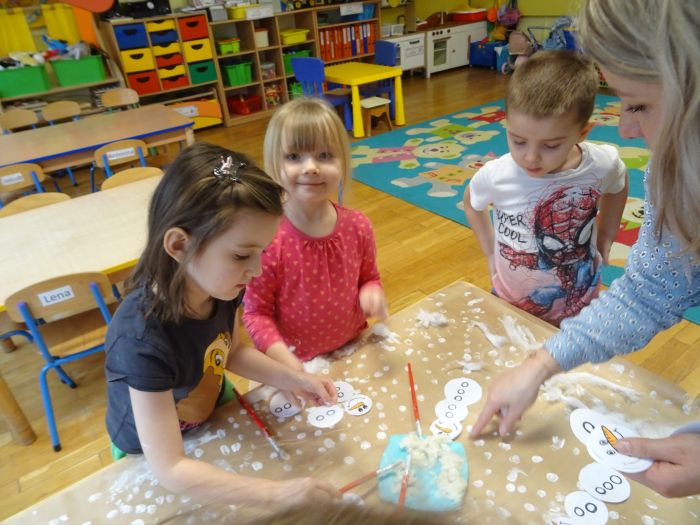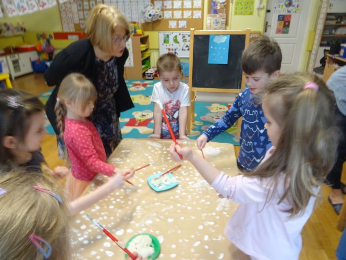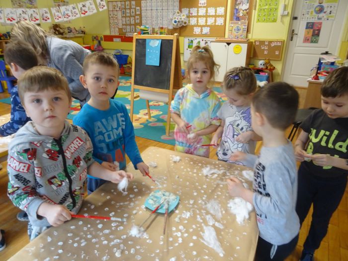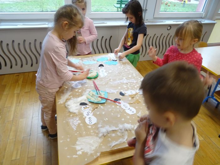 We wtorek 24. 01.2023 r. dzieci z grupy ,,Misie” wykonały pracę plastyczną inspirowaną metodą ,,Edukacji przez ruch’’ D. Dziamskiej - ,,Zimowy krajobraz”. Czterolatki kreśliły rytmicznie kropki tworząc tło do swojej pracy. Następnie każdy uczestnik zajęć tworzył i przyklejał własnego bałwana, śnieżynki i kawałki starej firanki imitujące choinki, oczywiście wszystkie etapy pracy odbywały się przy muzyce, której towarzyszył naturalny i spontaniczny ruch organizmu. Dzieci aktywnie uczestniczyły w zabawach ruchowych reagując na sygnał umowny, wykonały taniec śnieżynek z firanką kształtując orientację przestrzenną, kształtowały umiejętność rozpoznawania i nazywania zjawisk przyrodniczych towarzyszących zimowej porze roku z pomocą obrazków, rozwiązywały zagadki słuchowe, dzieliły wyrazy na sylaby określając liczbę sylab w wyrazie.