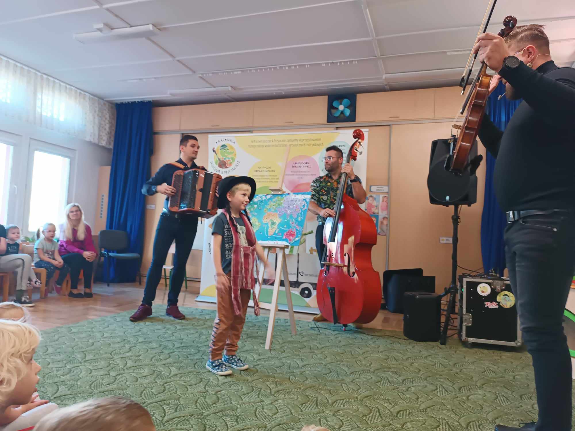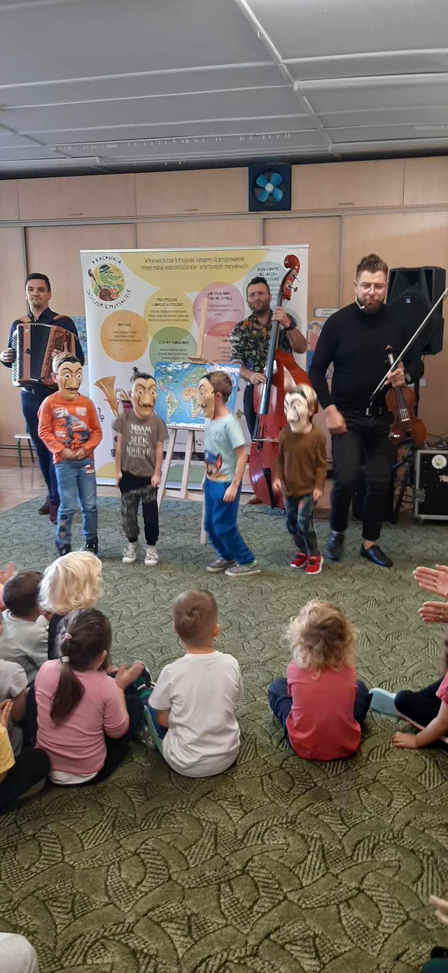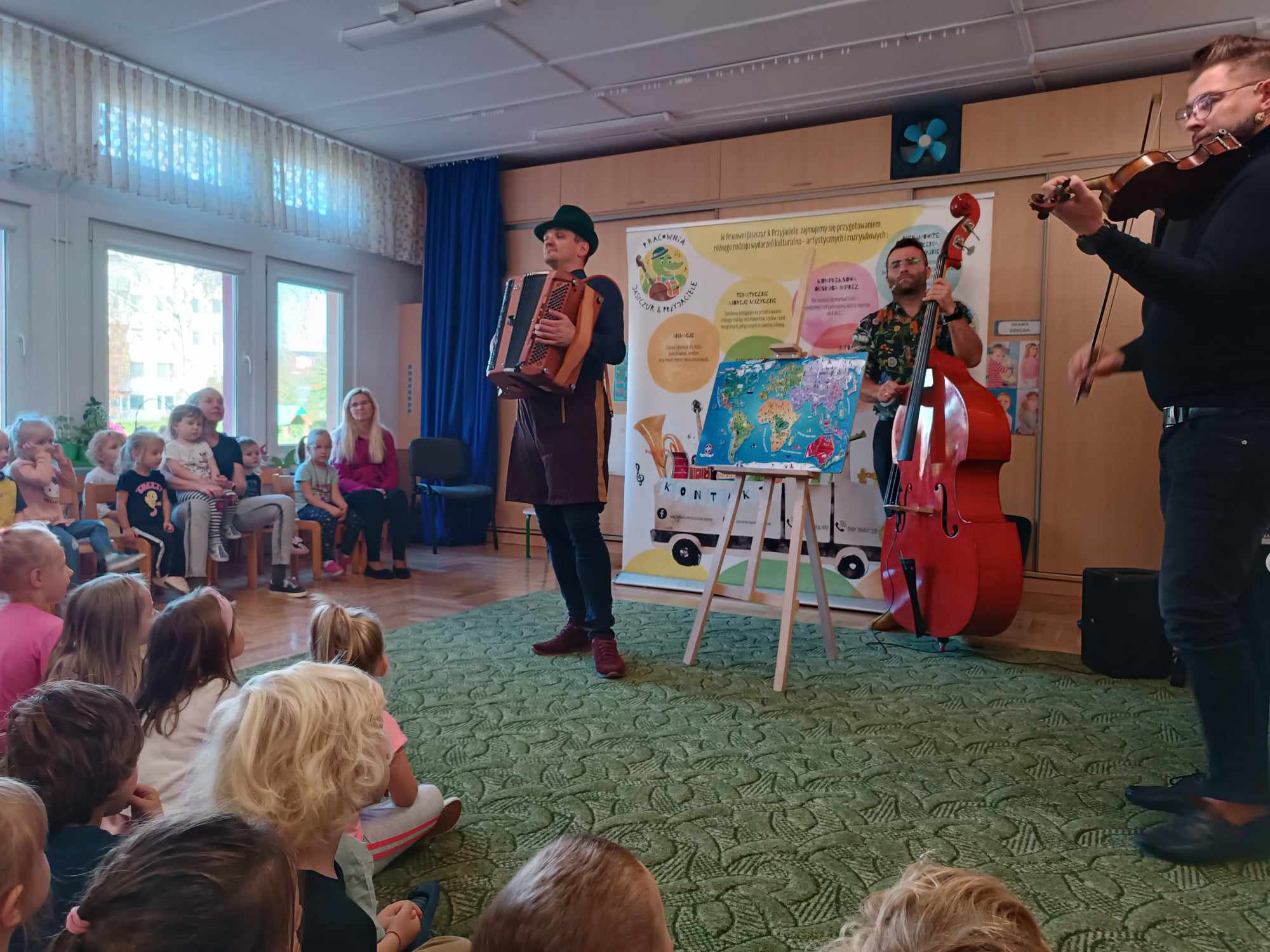 17.10.2023 r. nasze przedszkole odwiedzili muzycy z grupy „Jaszczur i Przyjaciele“, by zabrać przedszkolaki w muzyczną podróż dookoła świata. Poprzez udział w audycji „Podróż dookoła świata muzycznym samolotem” mogliśmy „odwiedzić“ Węgry, Niemcy, Włochy, Francję, Izrael, czy Chiny. Podczas muzycznego spotkania dzieci nie tylko słuchały muzyki, ale także angażowały się w wykonywanie różnych zadań. W tym dniu dzieci doświadczyły nowych, ciekawych wrażeń muzycznych. Wszystkim dzieciom audycja się bardzo podobała i gromkimi brawami dziękowali za spotkanie.