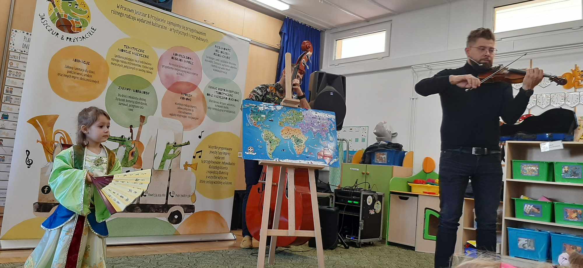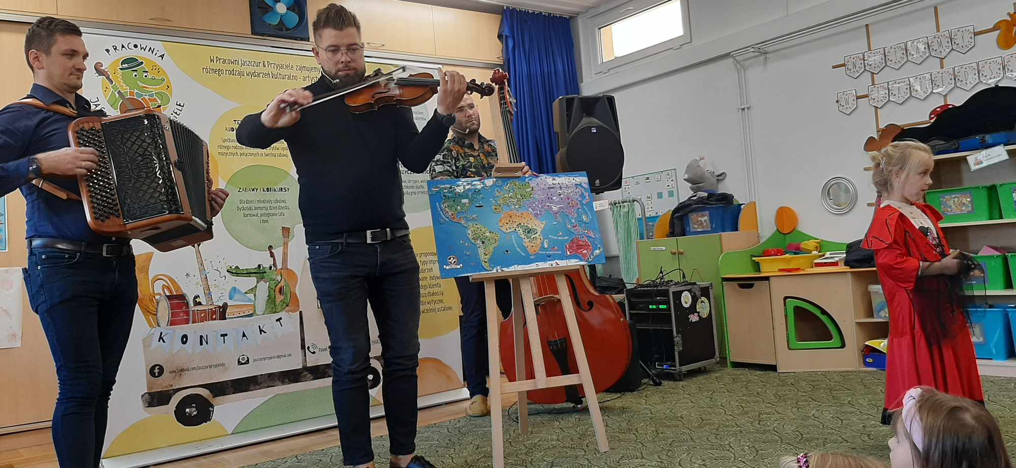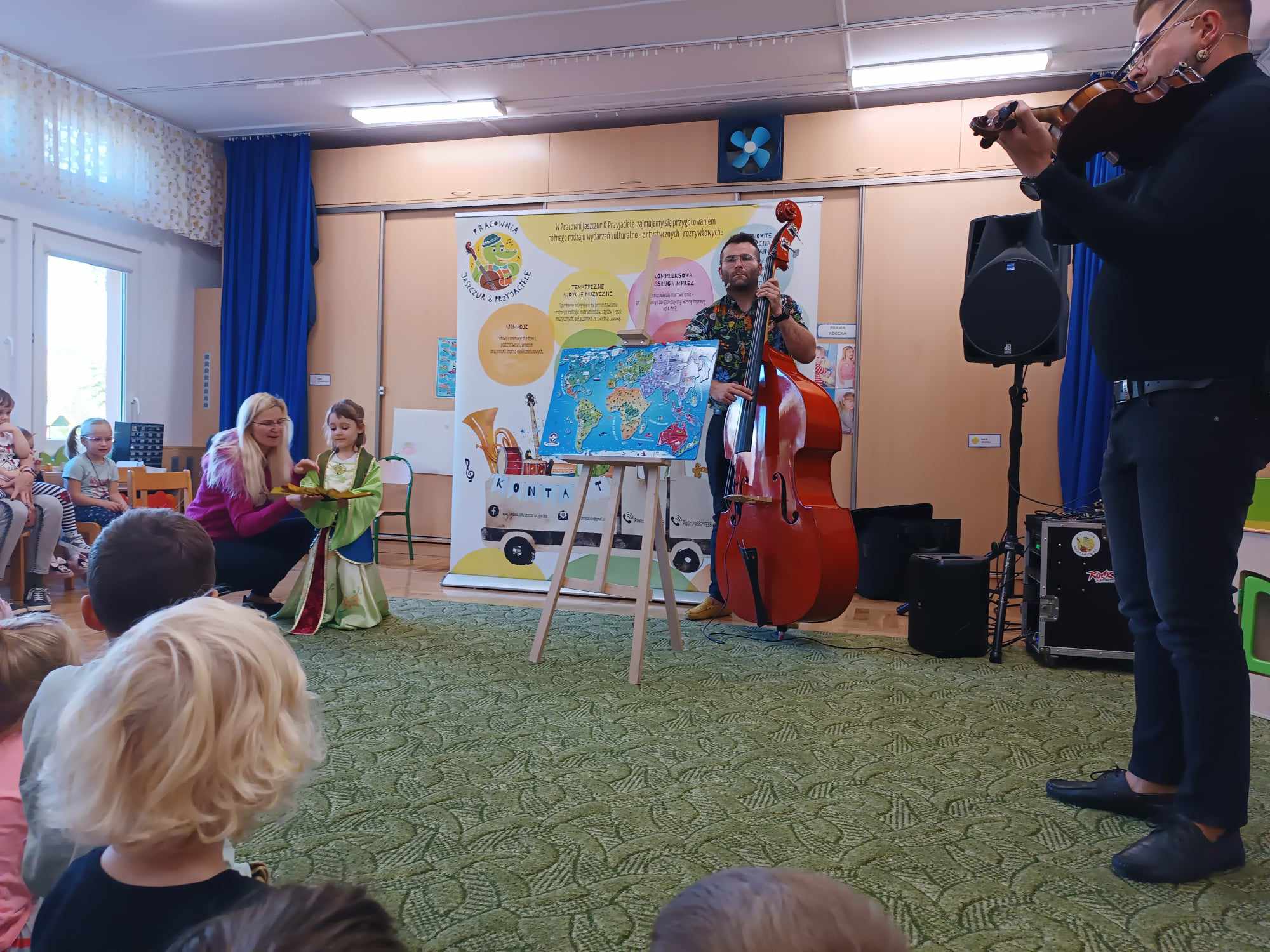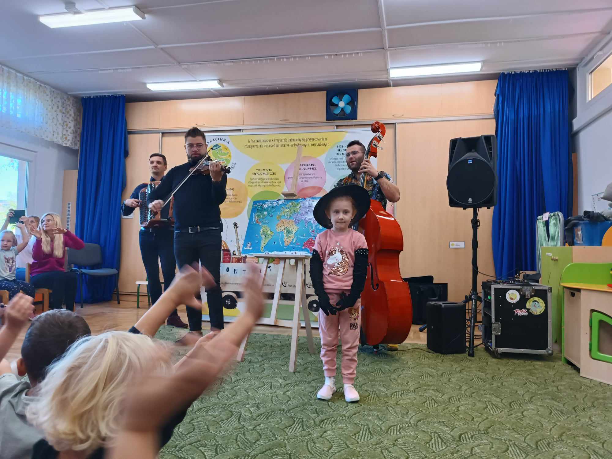 17.10.2023 r. nasze przedszkole odwiedzili muzycy z grupy „Jaszczur i Przyjaciele“, by zabrać przedszkolaki w muzyczną podróż dookoła świata. Poprzez udział w audycji „Podróż dookoła świata muzycznym samolotem” mogliśmy „odwiedzić“ Węgry, Niemcy, Włochy, Francję, Izrael, czy Chiny. Podczas muzycznego spotkania dzieci nie tylko słuchały muzyki, ale także angażowały się w wykonywanie różnych zadań. W tym dniu dzieci doświadczyły nowych, ciekawych wrażeń muzycznych. Wszystkim dzieciom audycja się bardzo podobała i gromkimi brawami dziękowali za spotkanie.