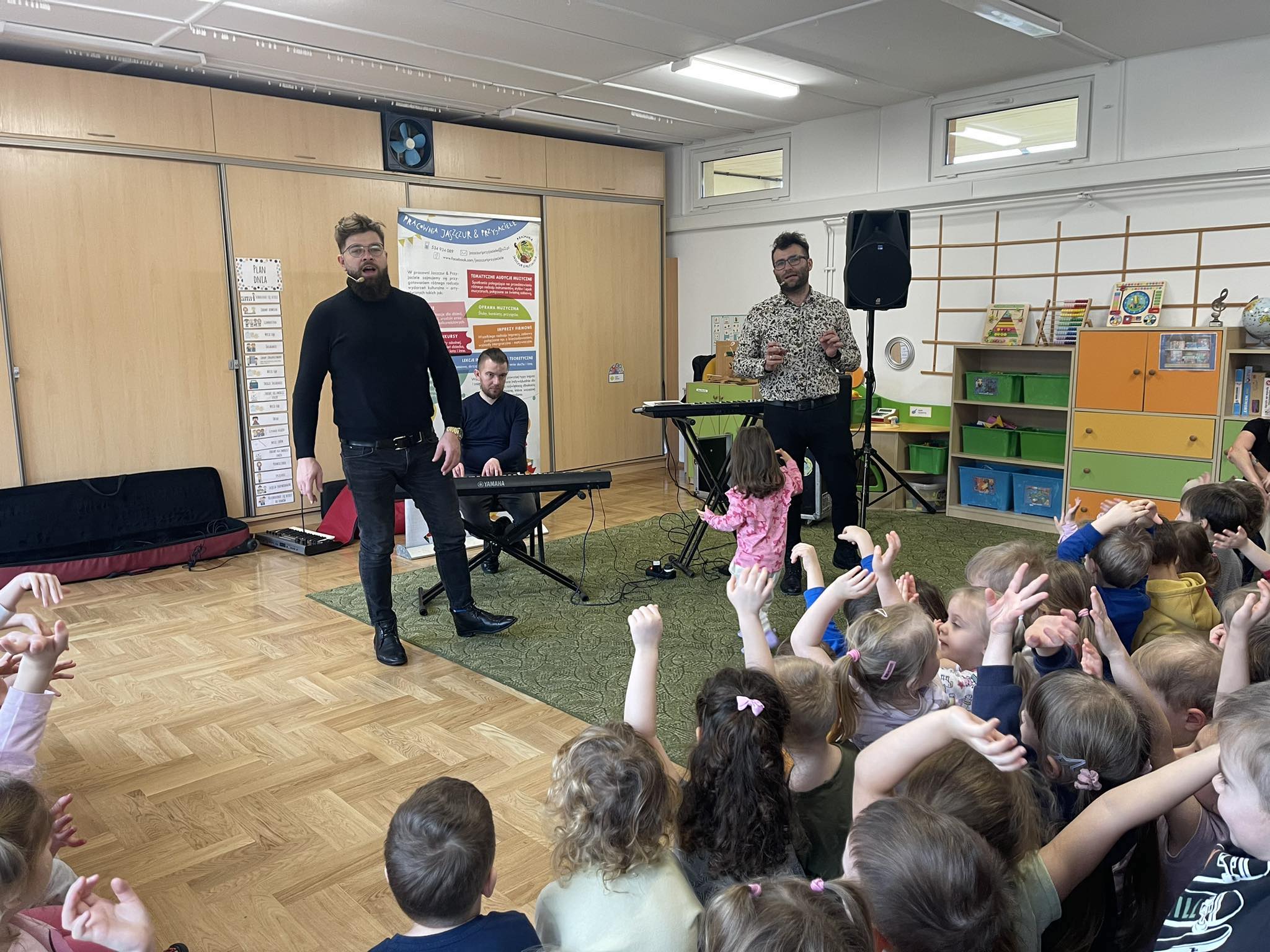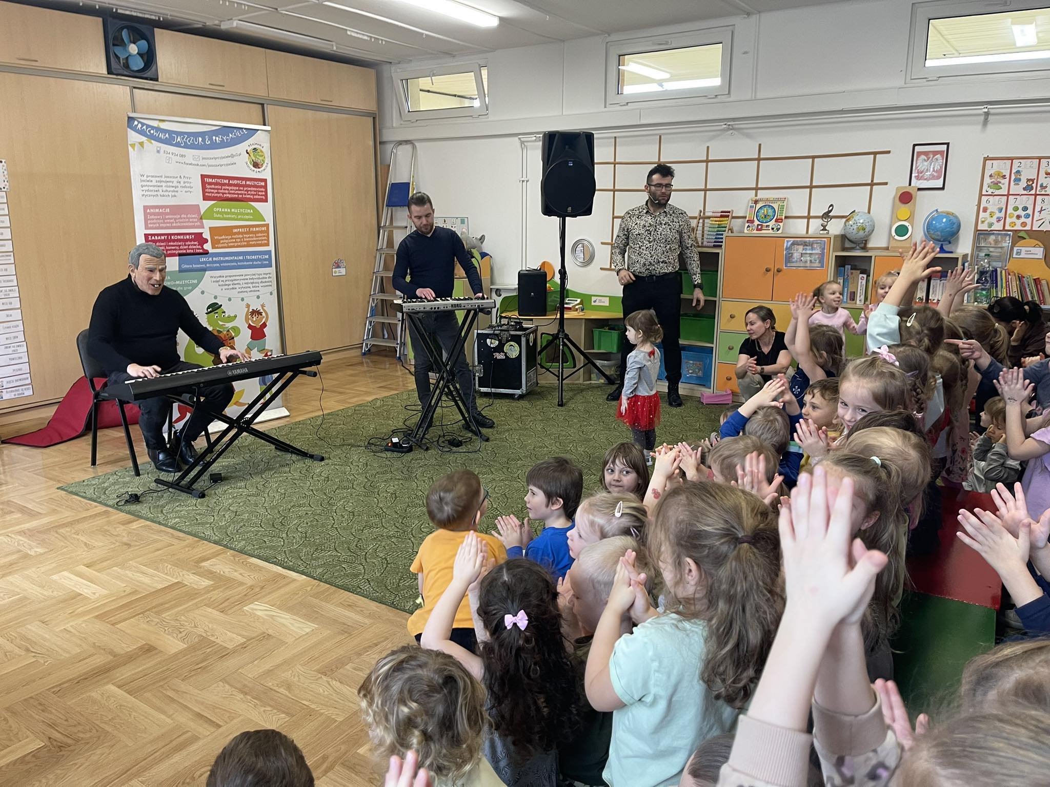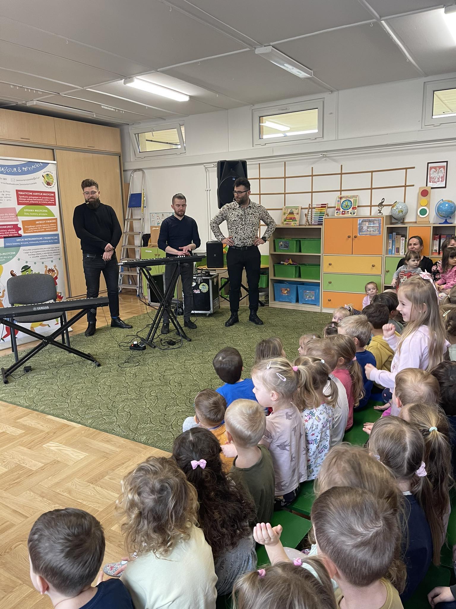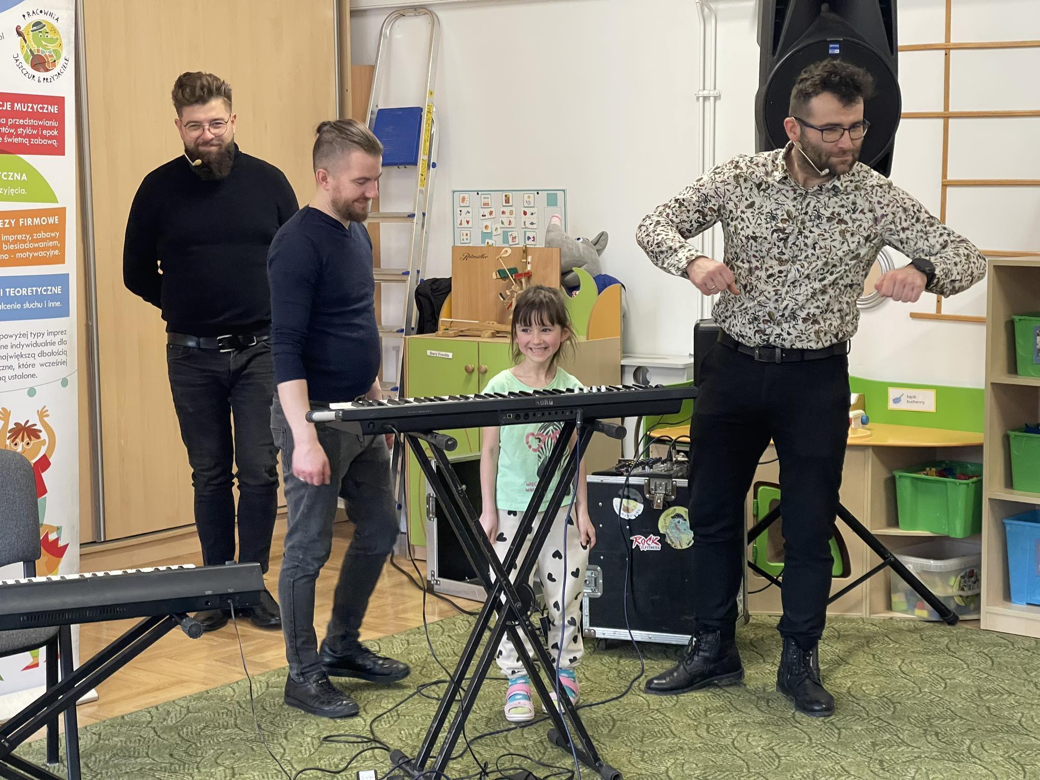 W naszym przedszkolu po raz kolejny gościliśmy muzyków z audycji muzycznej „Jaszczur i Przyjaciele“. Podczas występu dzieci zapoznały się z instrumentami takimi jak syntezator, melodyka, fortepian i pianino. Muzycy podczas występu opowiadali również ciekawostki i zagadki muzyczne, które dzieciom bardzo się podobały.