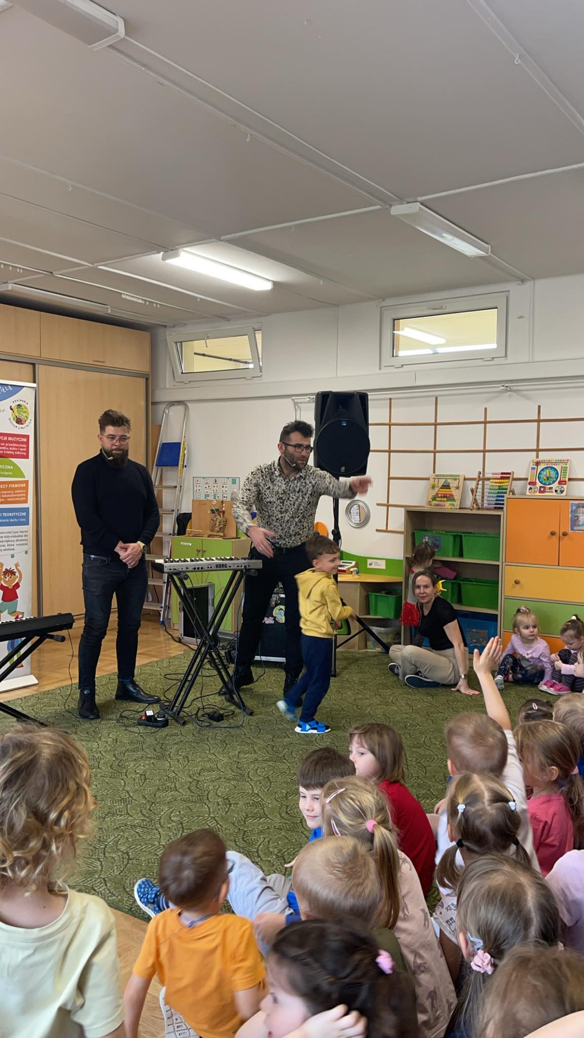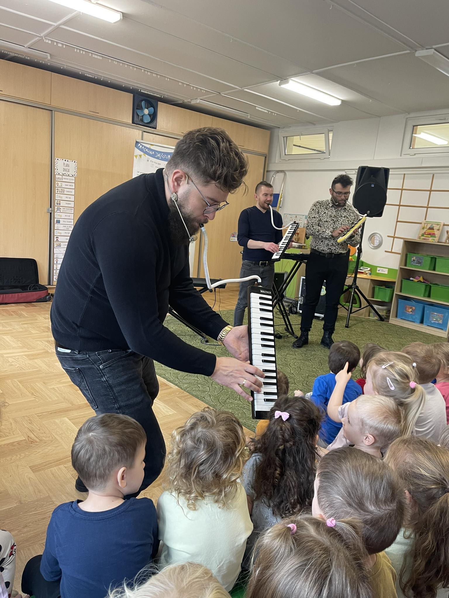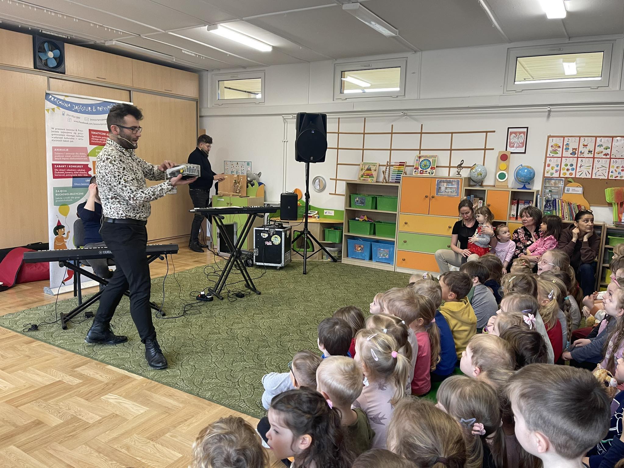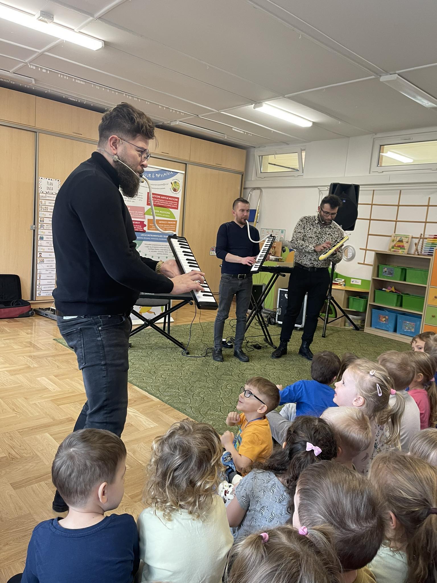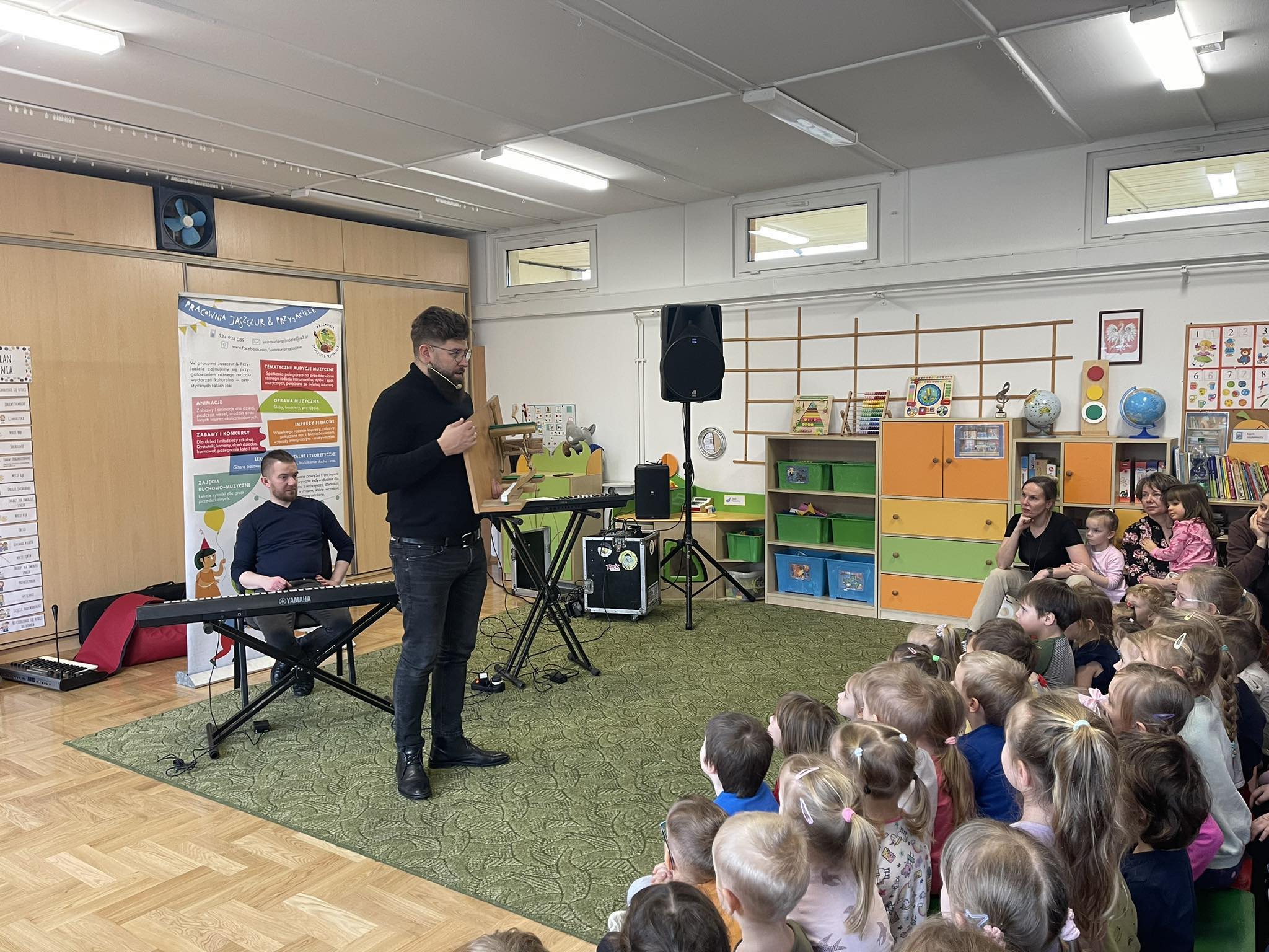 W naszym przedszkolu po raz kolejny gościliśmy muzyków z audycji muzycznej „Jaszczur i Przyjaciele“. Podczas występu dzieci zapoznały się z instrumentami takimi jak syntezator, melodyka, fortepian i pianino. Muzycy podczas występu opowiadali również ciekawostki i zagadki muzyczne, które dzieciom bardzo się podobały.