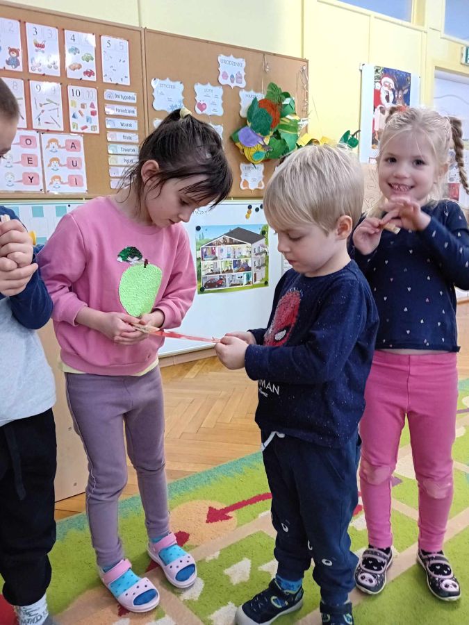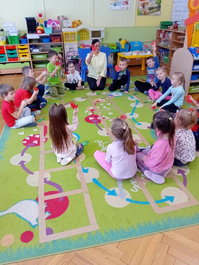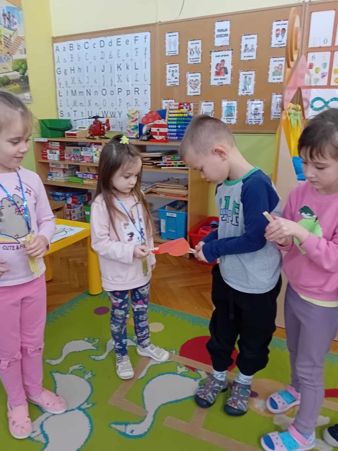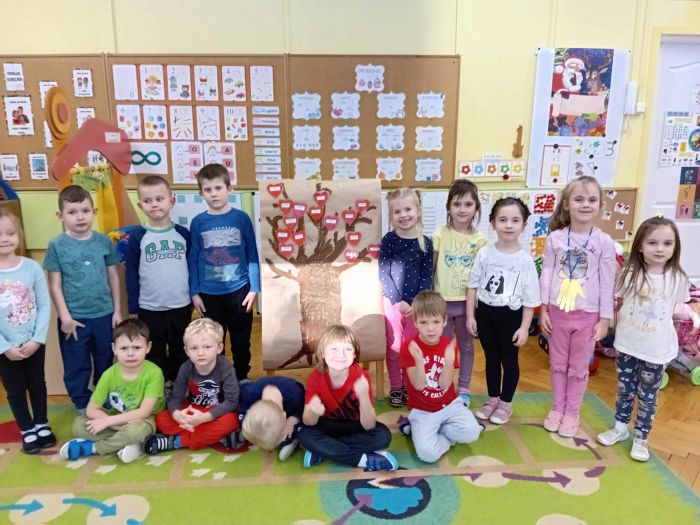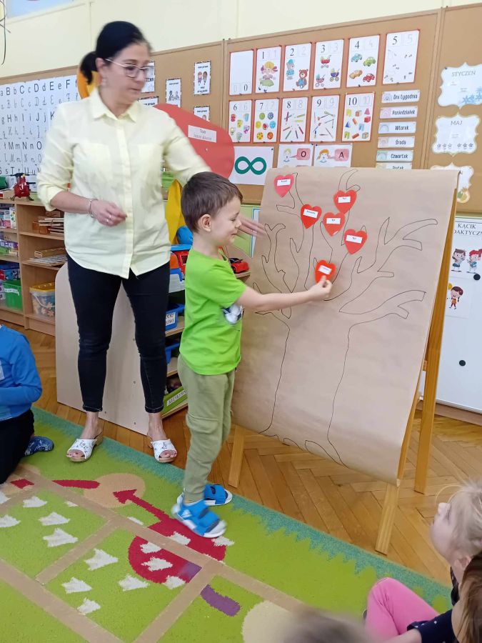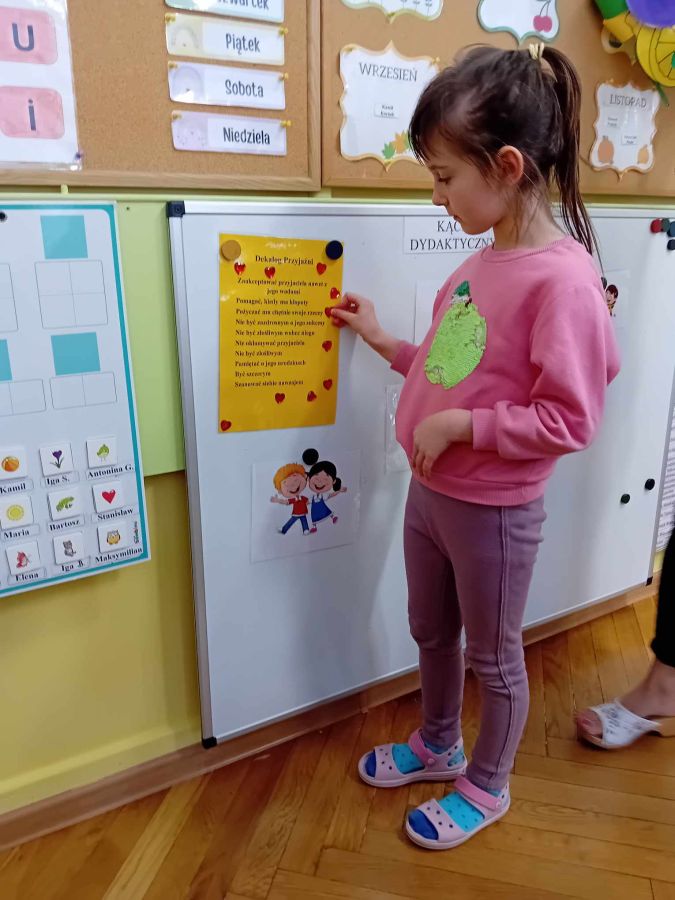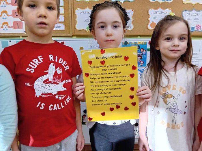 ,,Jak być prawdziwym przyjacielem” na podstawie opowiadania Danuty Wawiłow ,,Chcę mieć przyjaciela”. Dzieci z grupy ,,Biedronki” poznały znaczenia słowa prawdziwy przyjaciel. Dowiedziały się jakie cechy powinien posiadać przyjaciel, jak dbać o przyjaciela i o przyjaźń. Wspólnie stworzyły Dekalog Przyjaźni. Wykonały medal dla przyjaciela oraz Drzewko Przyjaźni ozdobione serduszkami z imionami dzieci. Wzięły udział w zabawie Prawda czy Fałsz wykorzystując zieloną lub czerwoną łapkę. Dzieci rozróżniały zachowania pozytywne i negatywne.