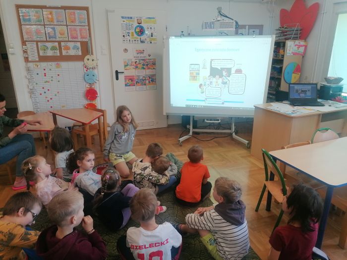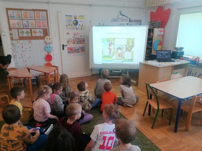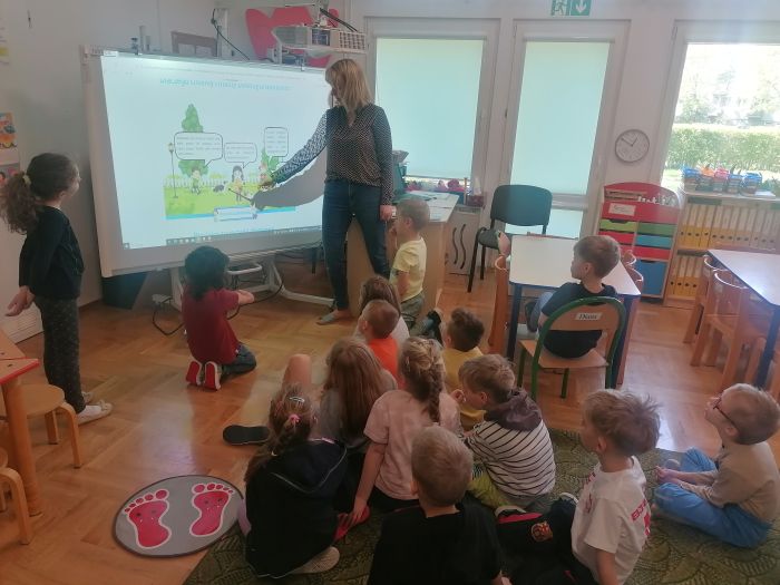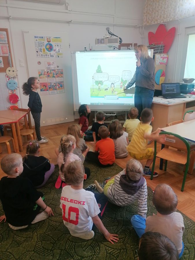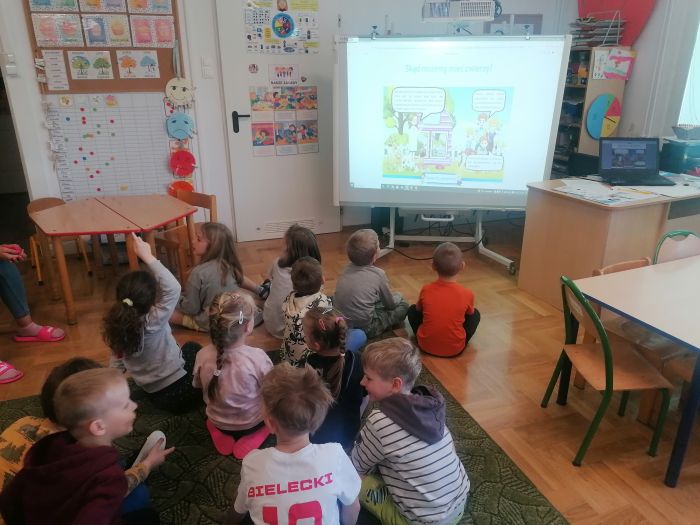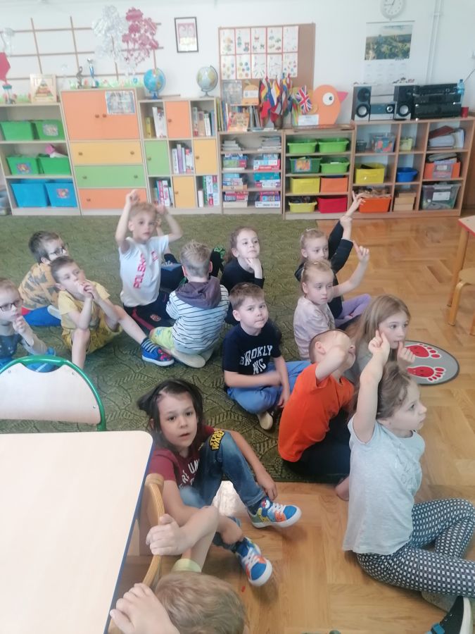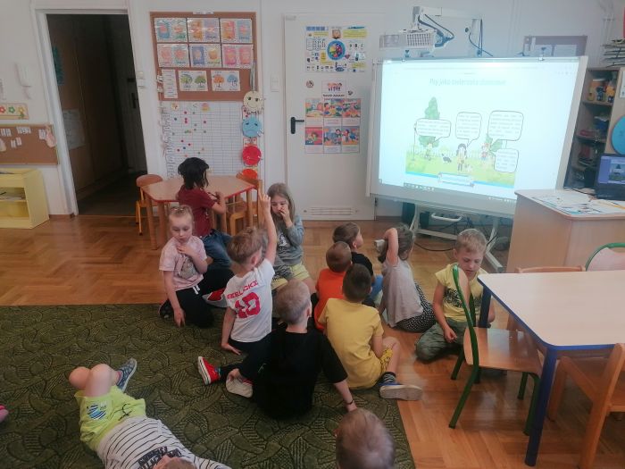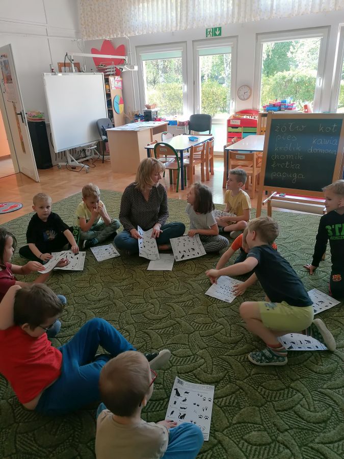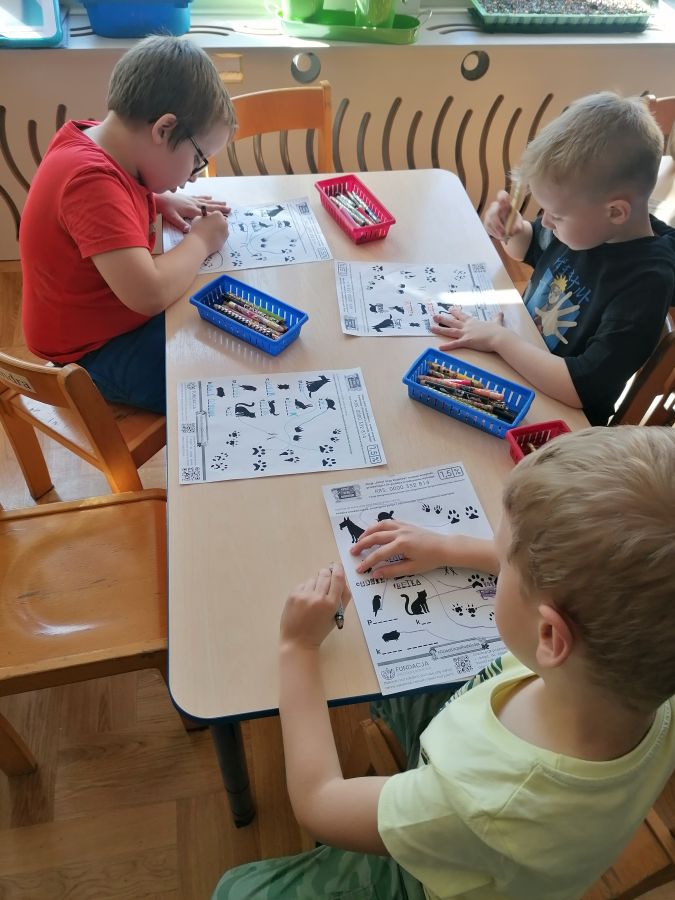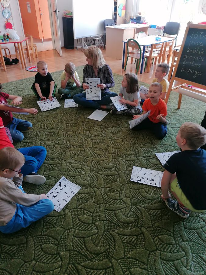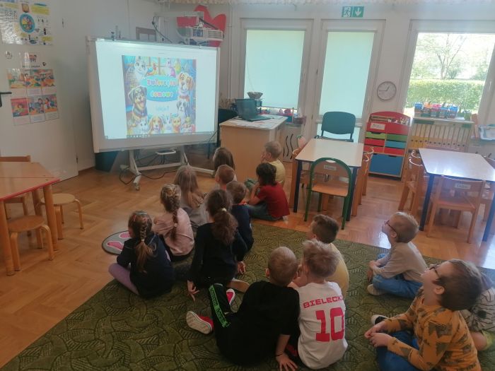Przedszkolaki z grupy „Zające” uczestniczyły w kolejnych zajęciach w ramach akcji „Dzieci uczą rodziców’, których tematem były „Zwierzęta domowe”. Dzieci obejrzały prezentację multimedialną z której dowiedziały się więcej o tych cudownych towarzyszach, ich potrzebach i tym, jak sprawić by były szczęśliwe i zdrowe. Liczyły łapy w ramach zadania matematycznego, łączyły tropy z odpowiednim zwierzęciem.