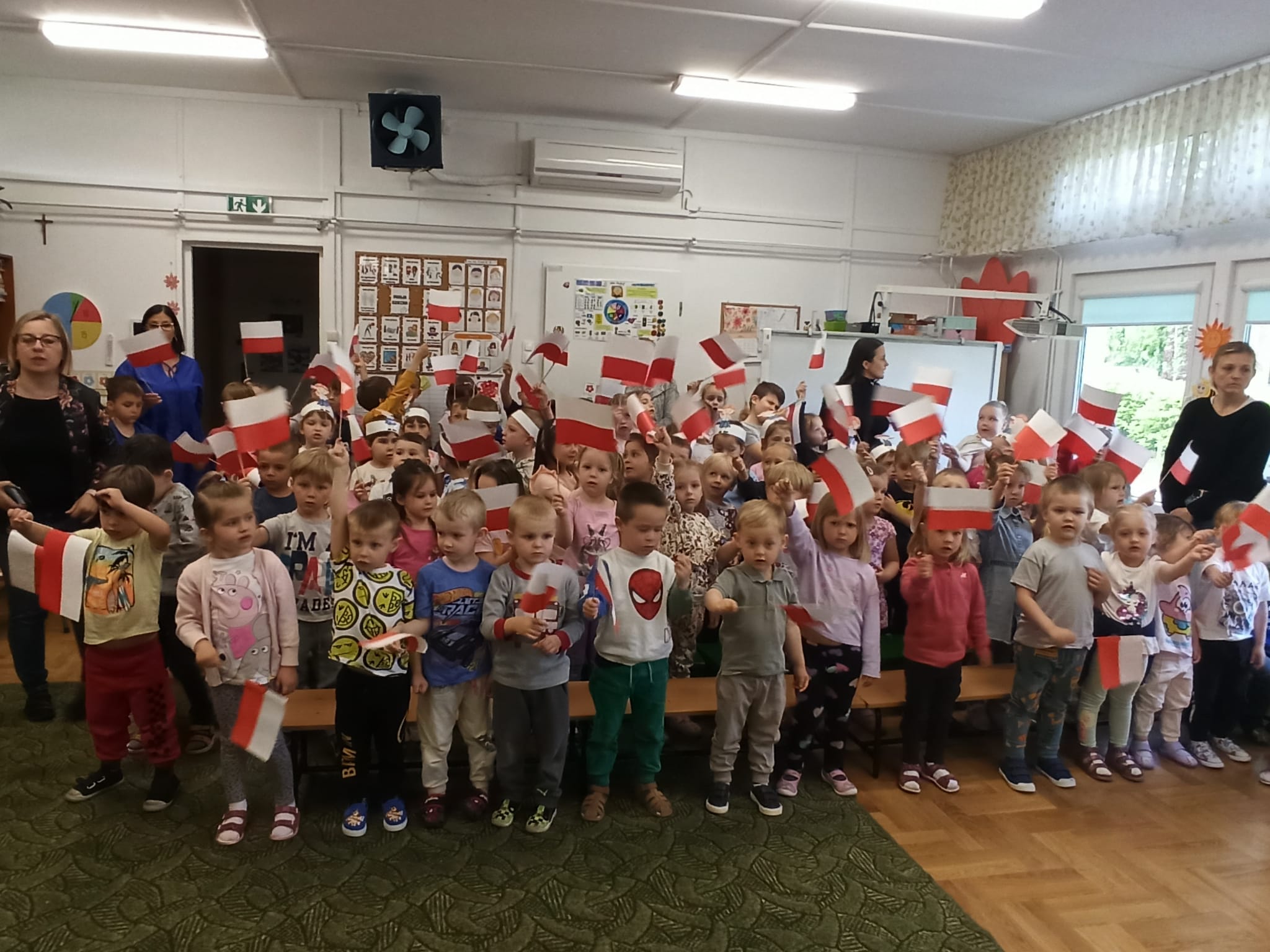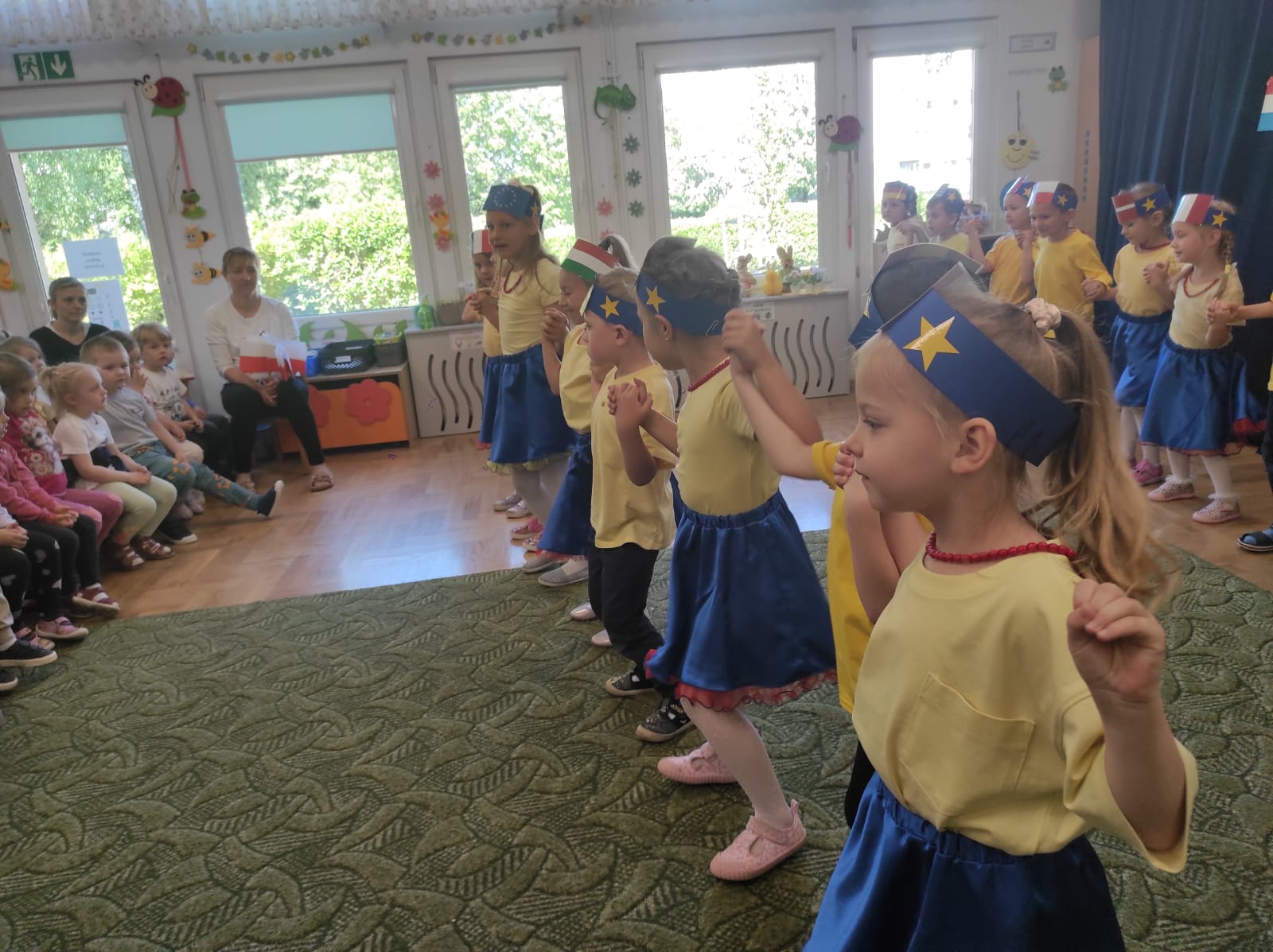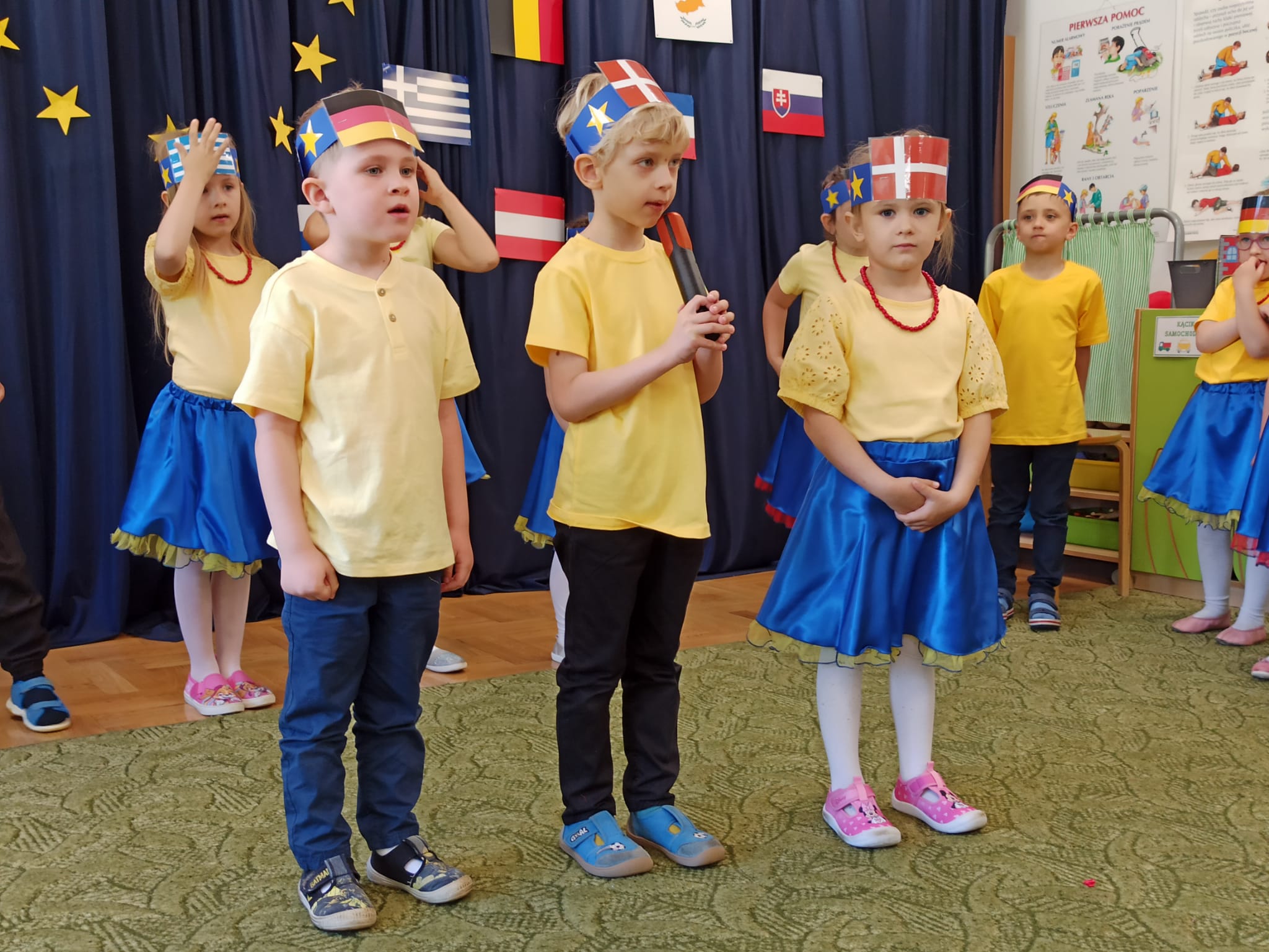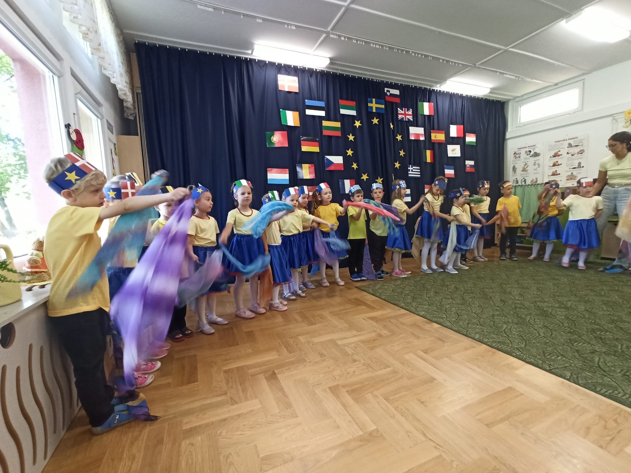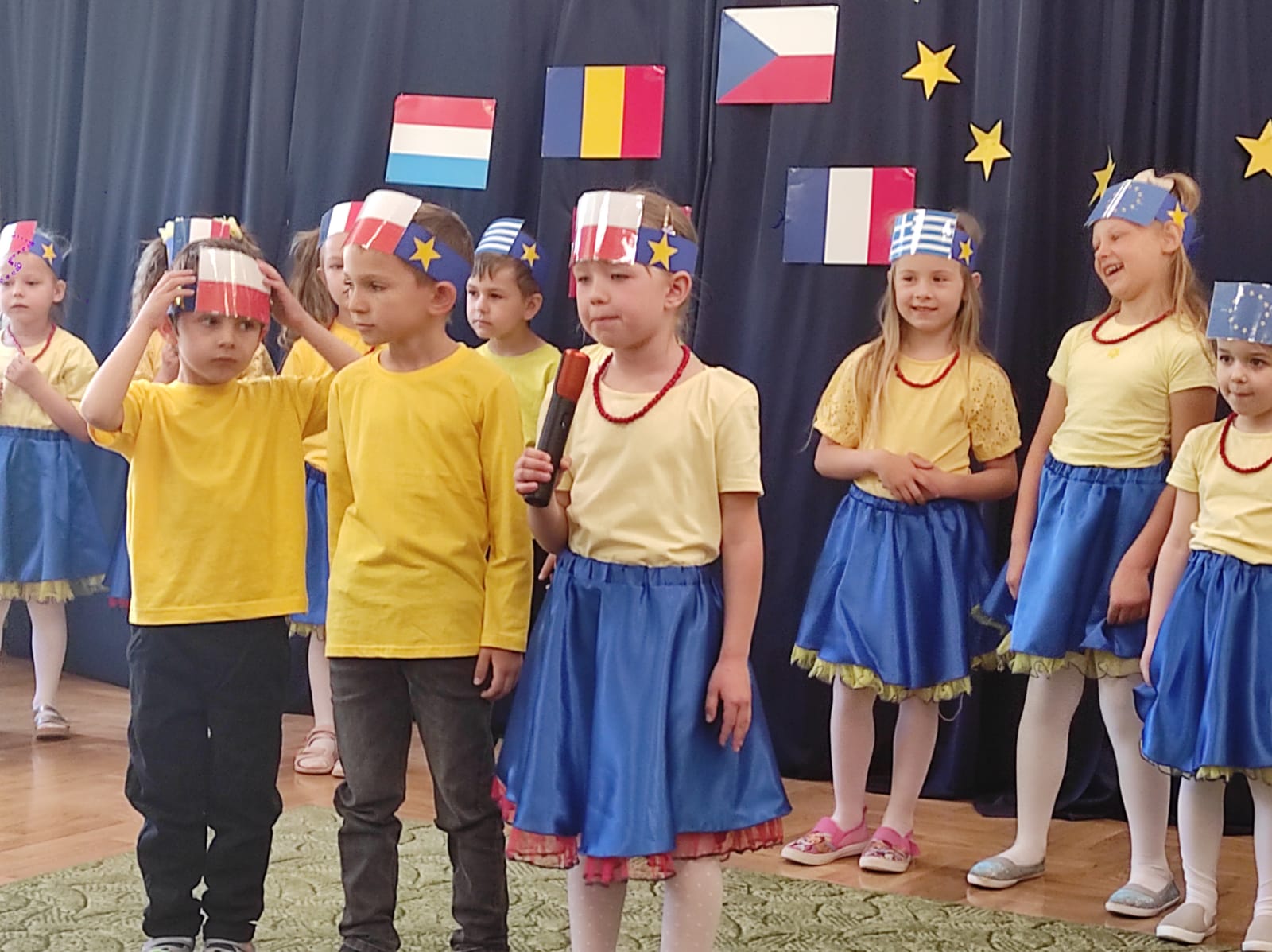 W dniu 09.05.2025r., przedszkolaki z grupy „Biedronki” przedstawiły całej społeczności przedszkolnej inscenizację pt. „Jestem Polakiem, ale i Europejczykiem”, jako zwieńczenie trwającego w naszym przedszkolu „Tygodnia Europejskiego”.