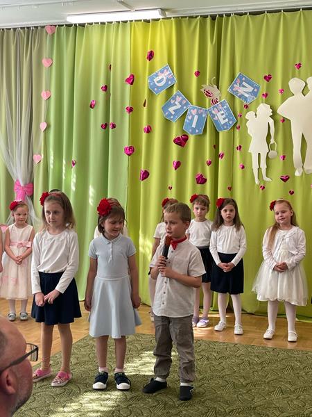 Uroczystość w tym dniu była także okazją do pożegnania naszych kochanych starszaków, którzy po wakacjach rozpoczną nowy etap edukacyjnej przygody w szkole. Pani Dyrektor wraz z Nauczycielami podziękowała dzieciom i Rodzicom za wspólnie spędzony czas, życząc wszystkim wielu sukcesów, radości, odwagi w odkrywaniu szkolnego świata.