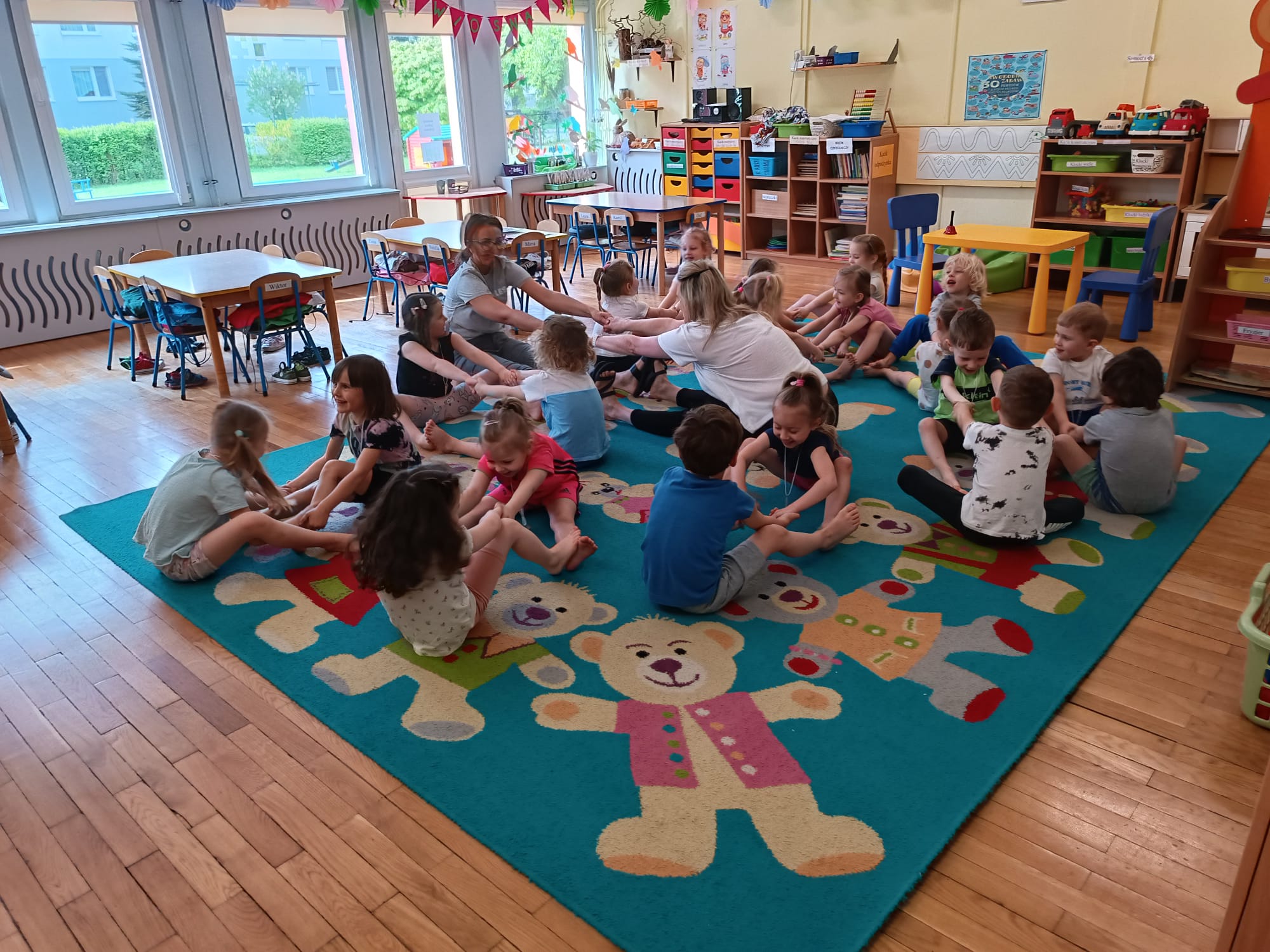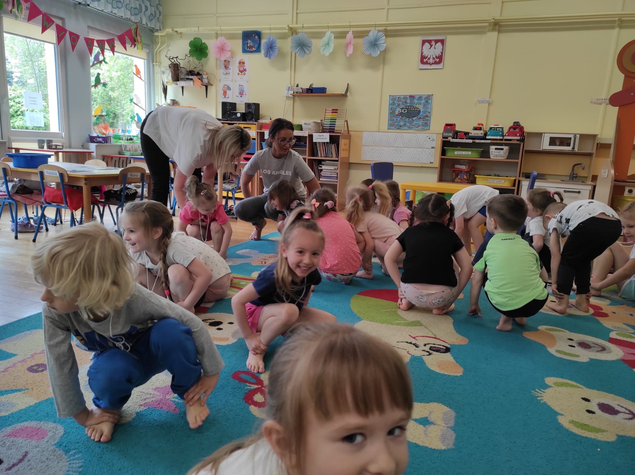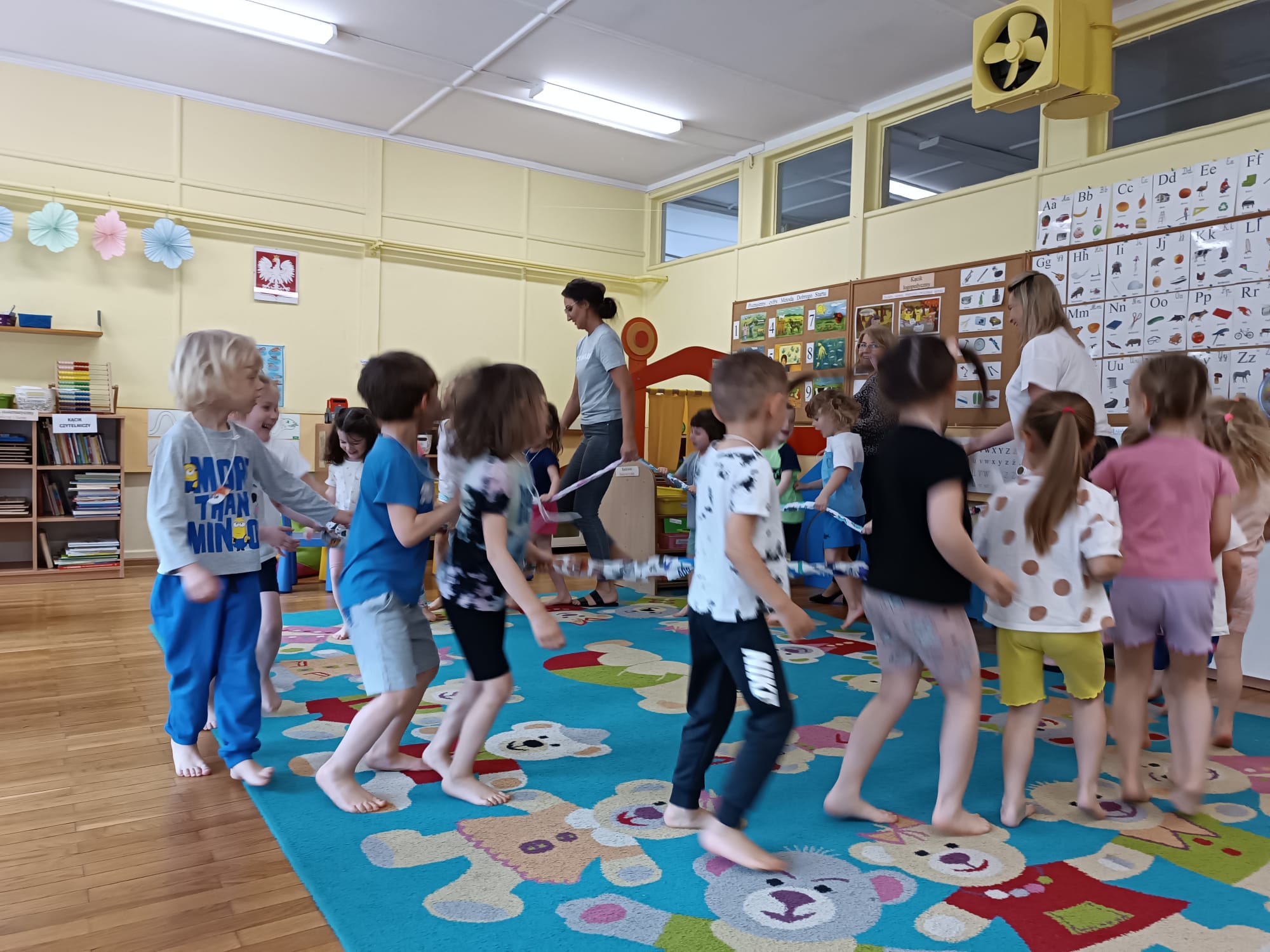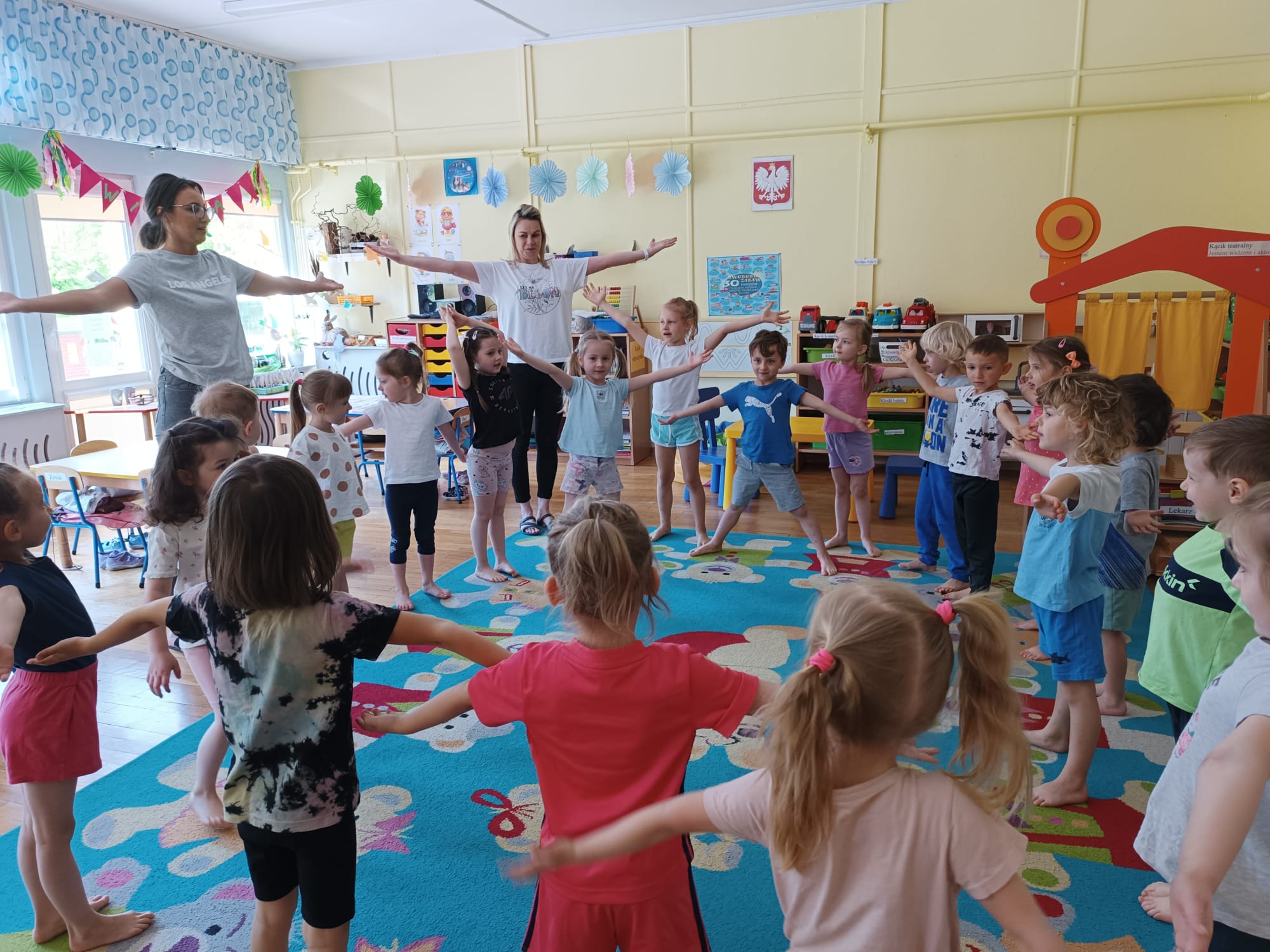 W dniu 19.04.2024r. grupa „Misie” uczestniczyła w zajęciach gimnastycznych prowadzonych metodą twórczą Rudolfa Labana. Założeniem gimnastyki twórczej (ekspresyjnej) Rudolfa Labana jest wiązanie ruchu ze słowem, rytmem i muzyką.