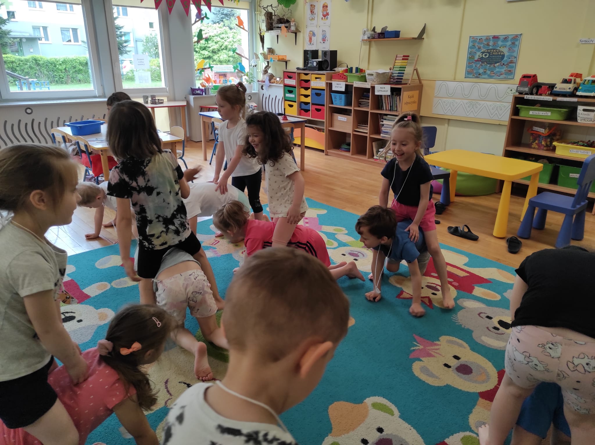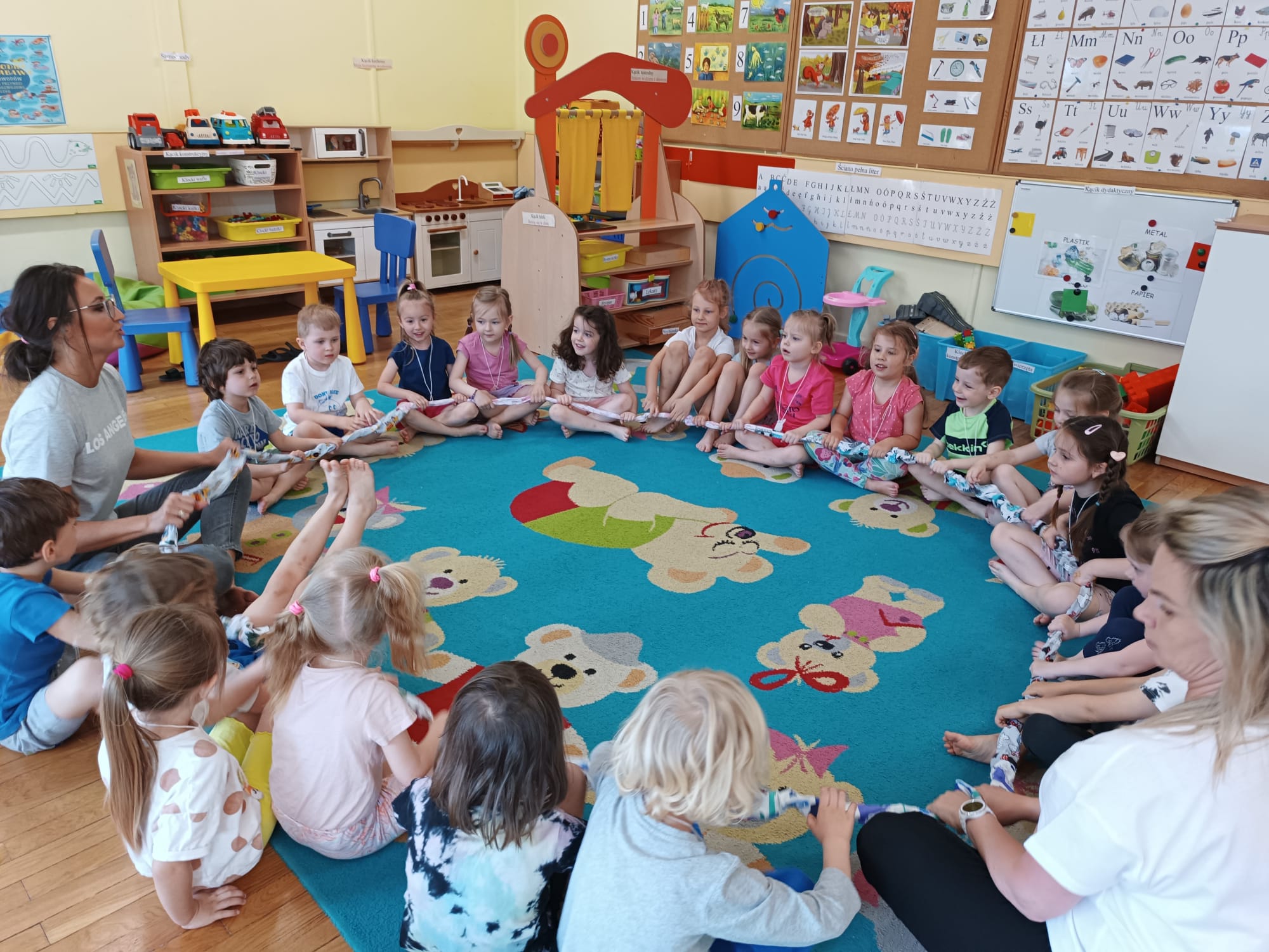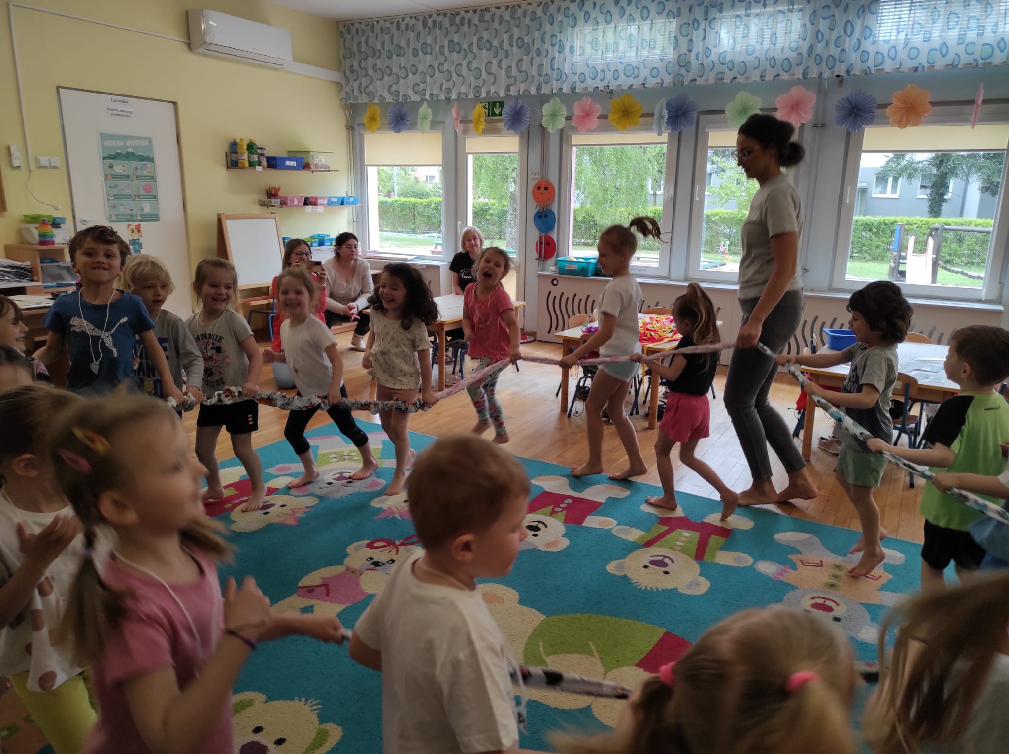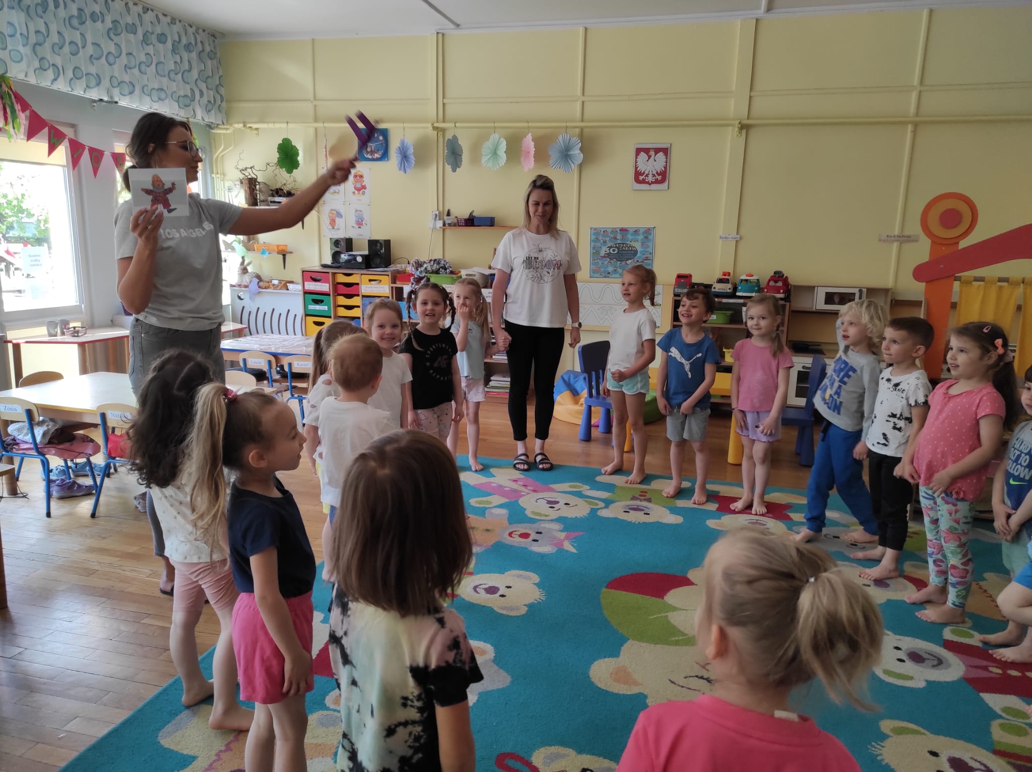 W dniu 19.04.2024r. grupa „Misie” uczestniczyła w zajęciach gimnastycznych prowadzonych metodą twórczą Rudolfa Labana. Założeniem gimnastyki twórczej (ekspresyjnej) Rudolfa Labana jest wiązanie ruchu ze słowem, rytmem i muzyką.