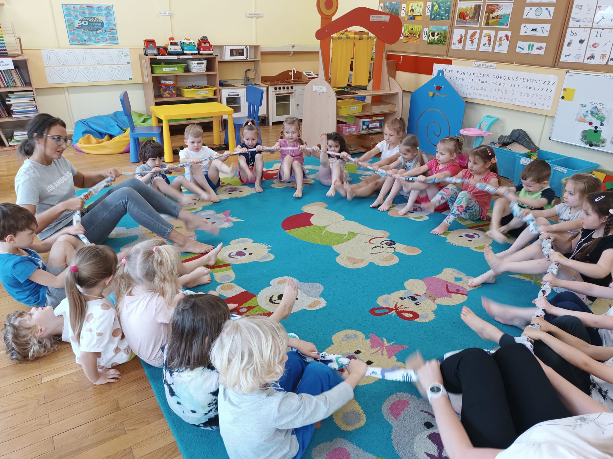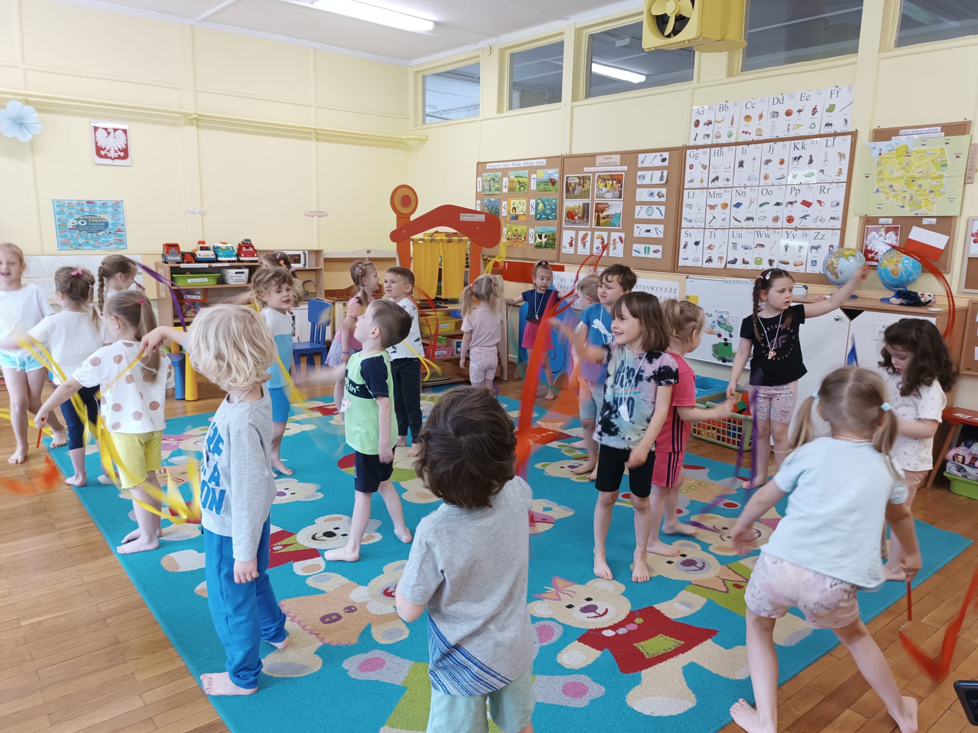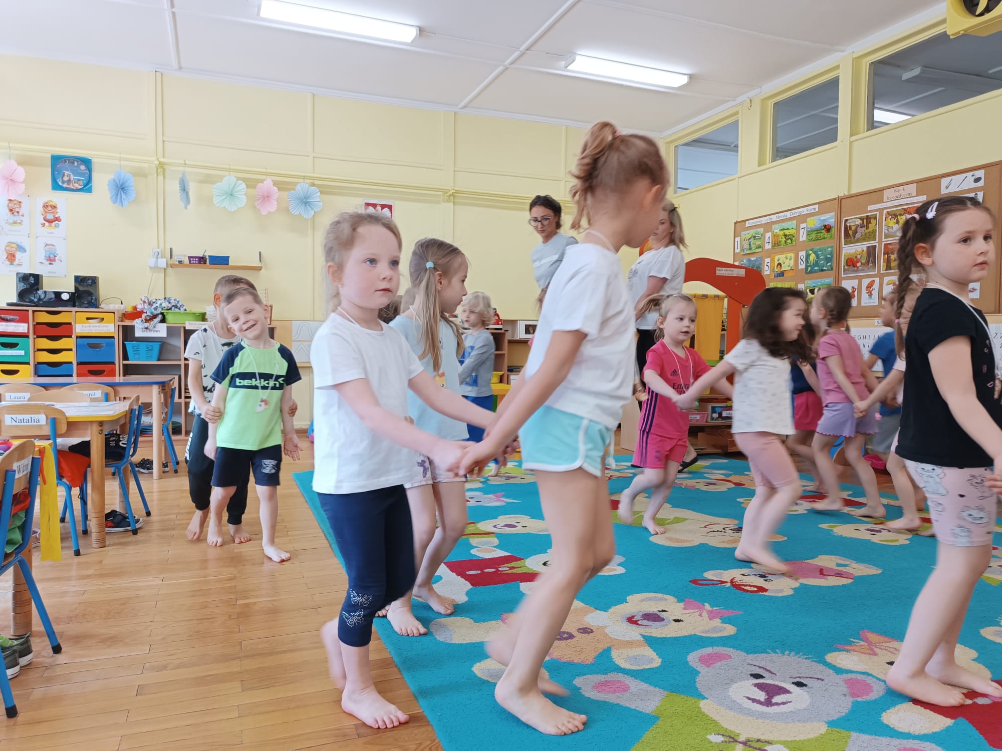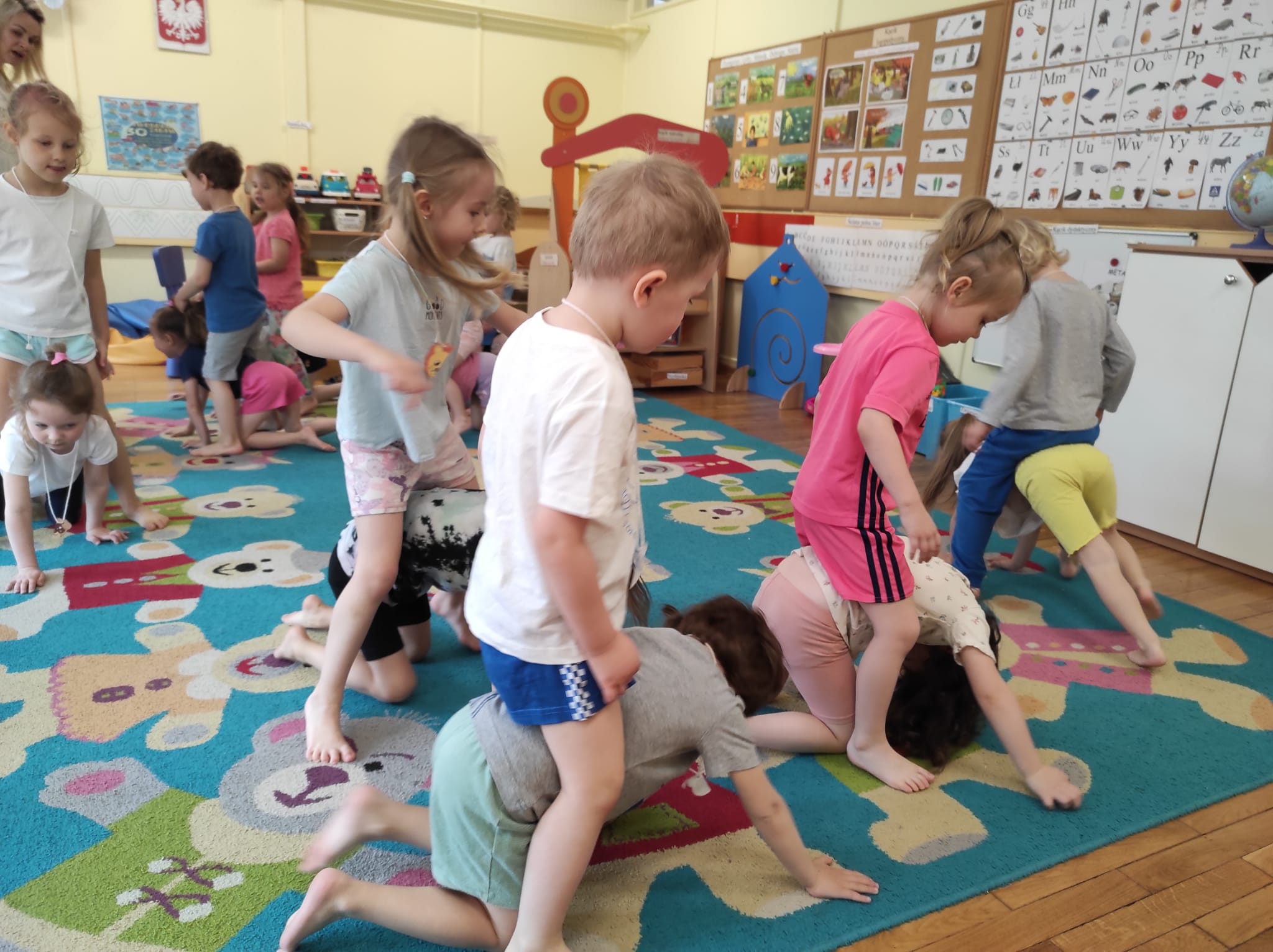 W dniu 19.04.2024r. grupa „Misie” uczestniczyła w zajęciach gimnastycznych prowadzonych metodą twórczą Rudolfa Labana. Założeniem gimnastyki twórczej (ekspresyjnej) Rudolfa Labana jest wiązanie ruchu ze słowem, rytmem i muzyką.