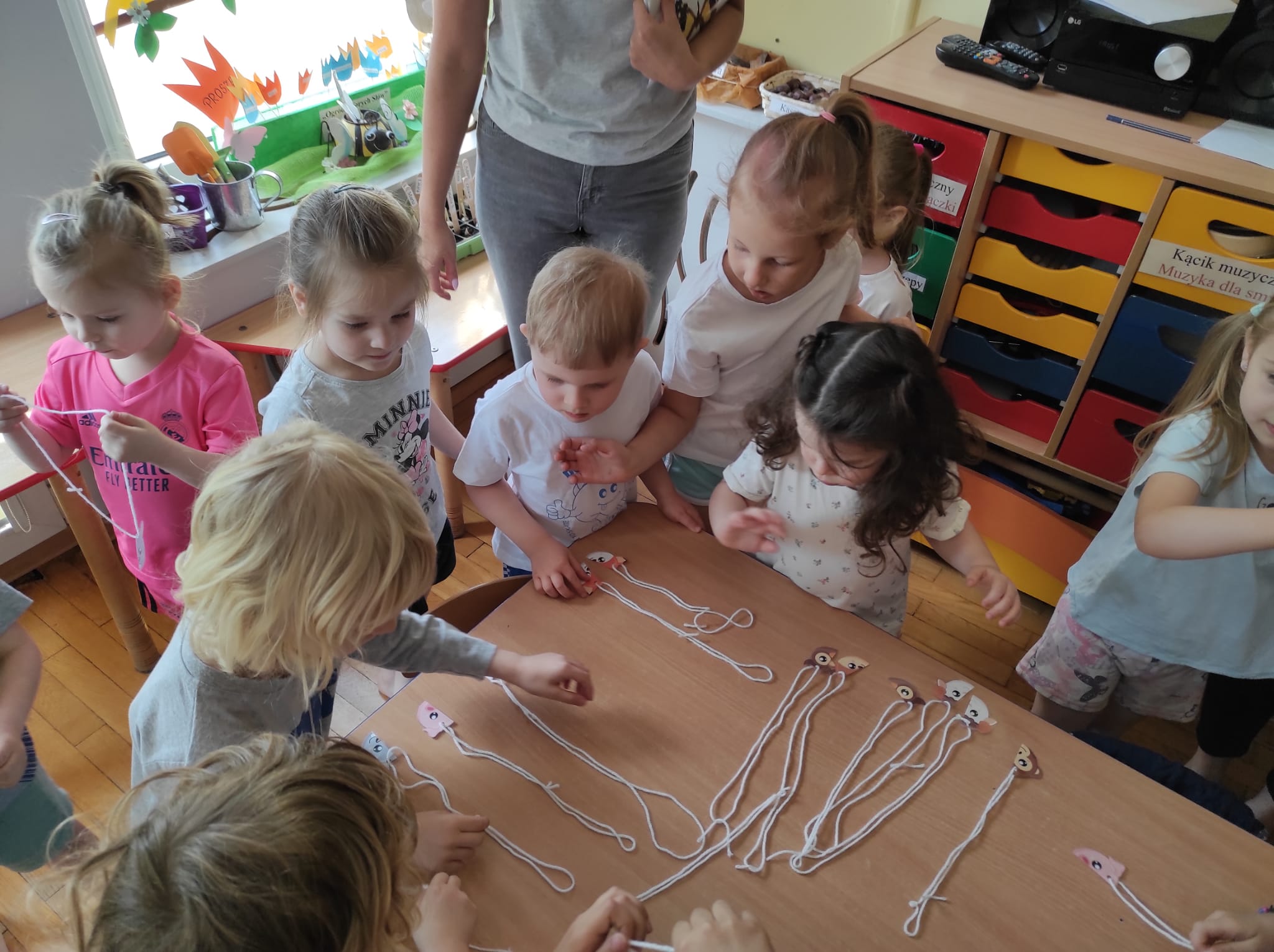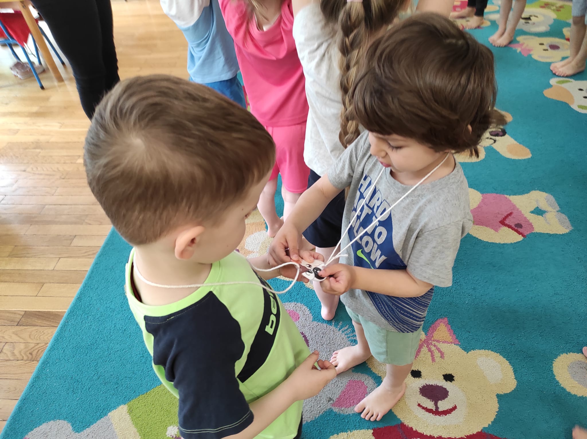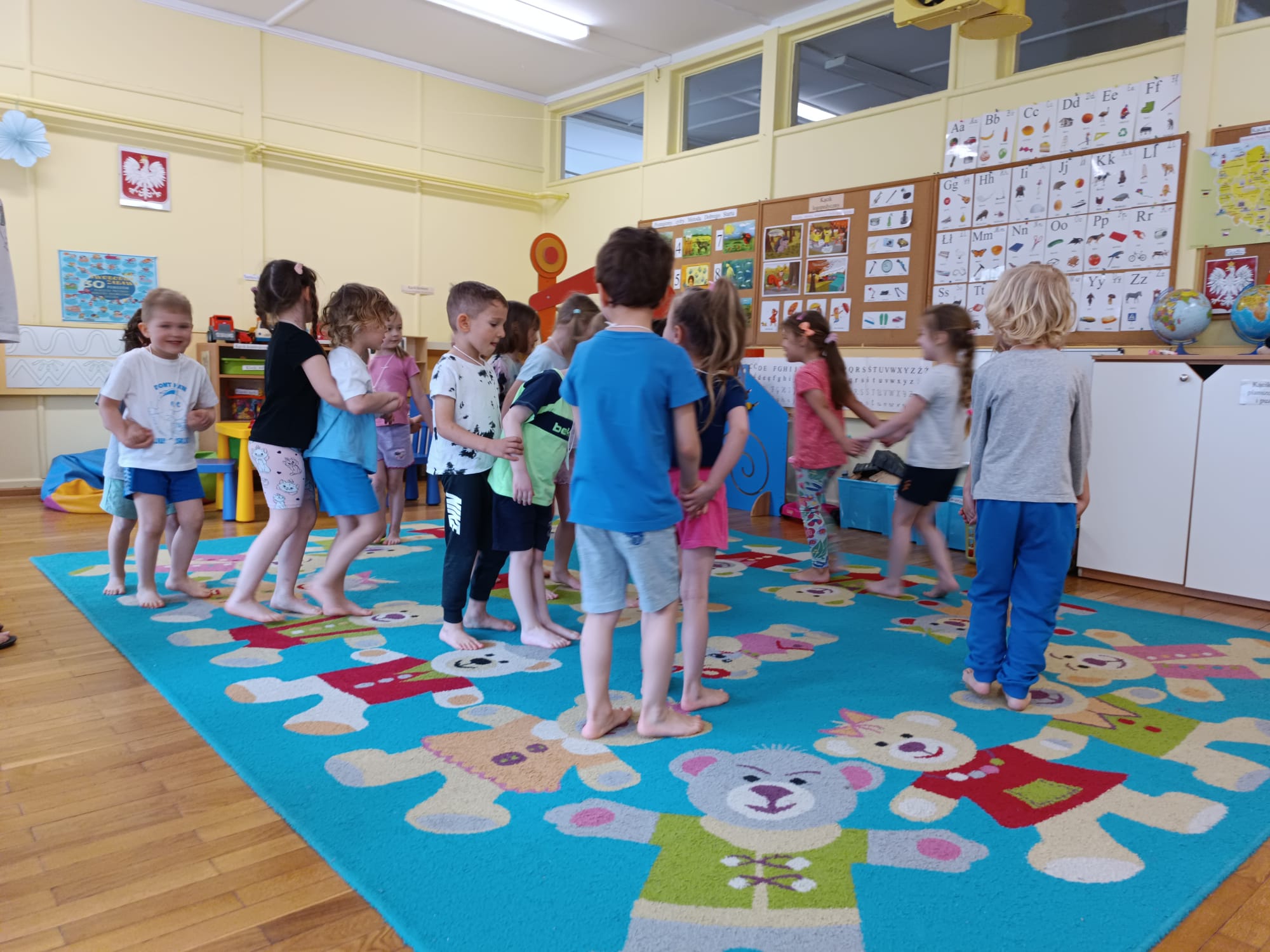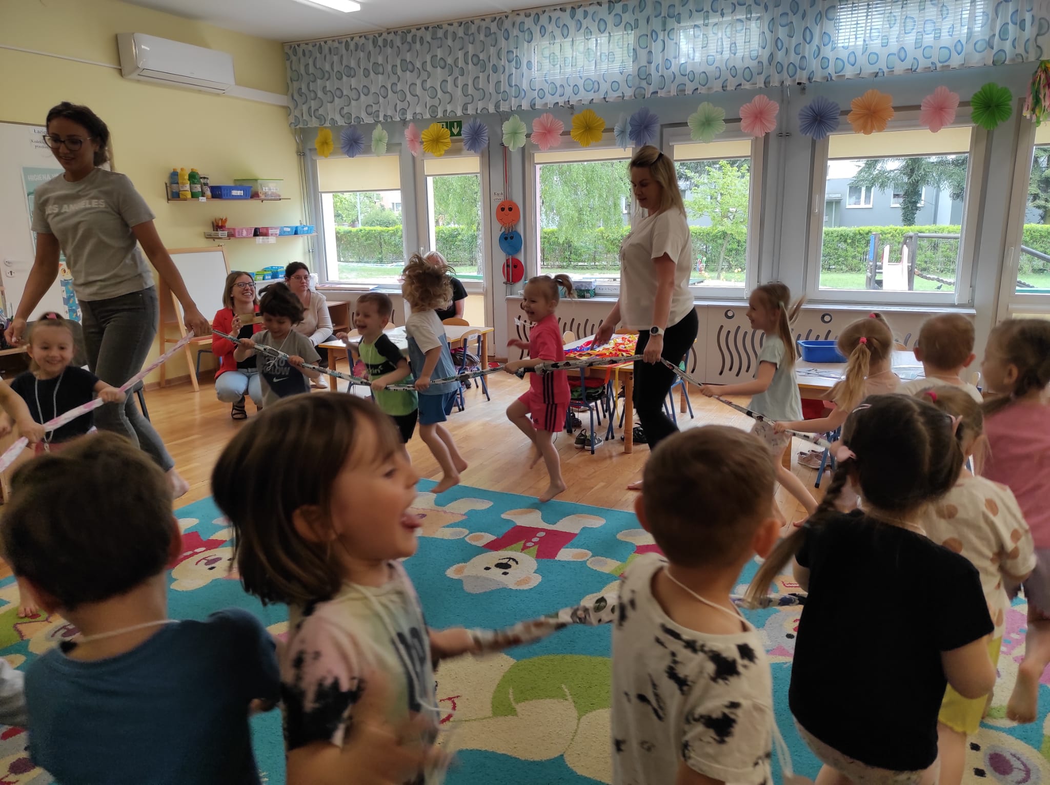 W dniu 19.04.2024r. grupa „Misie” uczestniczyła w zajęciach gimnastycznych prowadzonych metodą twórczą Rudolfa Labana. Założeniem gimnastyki twórczej (ekspresyjnej) Rudolfa Labana jest wiązanie ruchu ze słowem, rytmem i muzyką.
