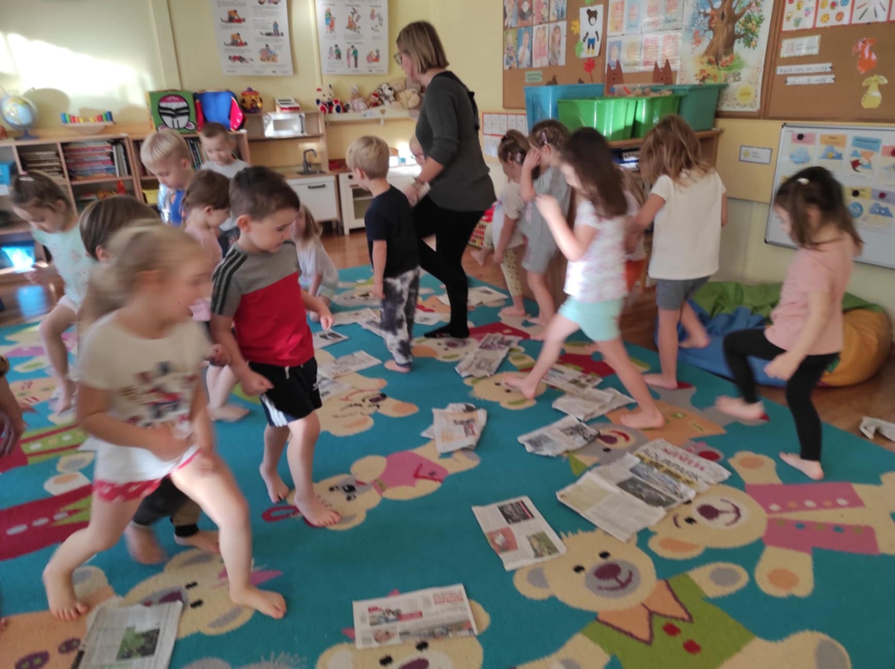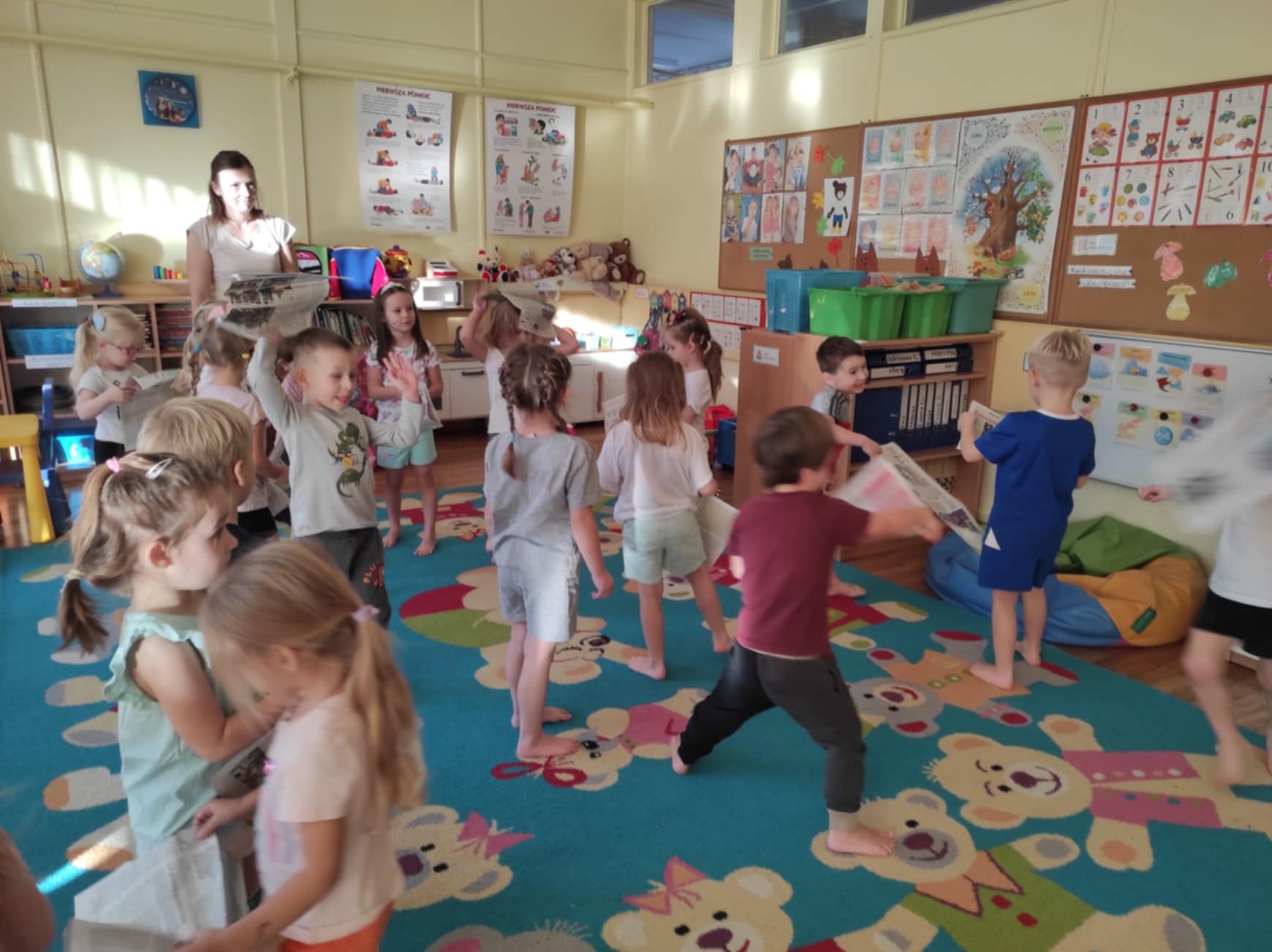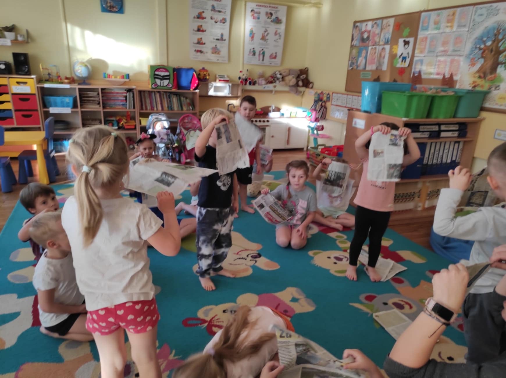 Podczas zajęć dzieci przeniosły się do „Deszczowej krainy“, którą mogły oczyma wyobraźni obejrzeć razem z jej królem. Ćwiczenia odbywały się przy akompaniamencie muzyki i z wykorzystaniem nietypowej pomocy, gazety. Różnorodność form ruchowych oraz sposób prowadzenia takich zajęć daje dzieciom możliwość twórczego działania, poznania własnego ciała, rozwija poczucie rytmu, doskonali koordynację ruchową, kształtuje orientację przestrzenną oraz wyobraźnię ruchową i własną inwencję w tym zakresie. Ponadto daje możliwość improwizowania i realizowania naturalnej potrzeby ruchu.