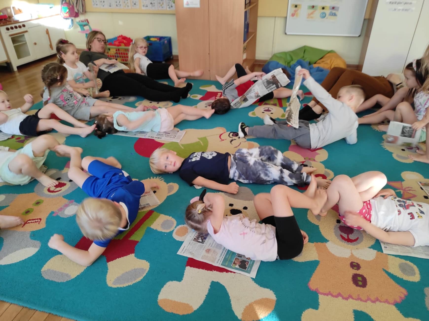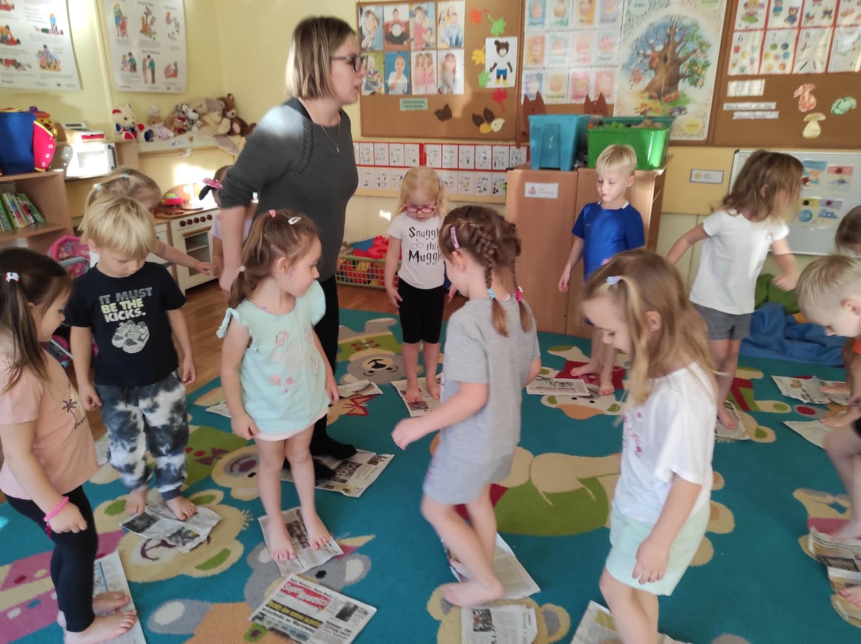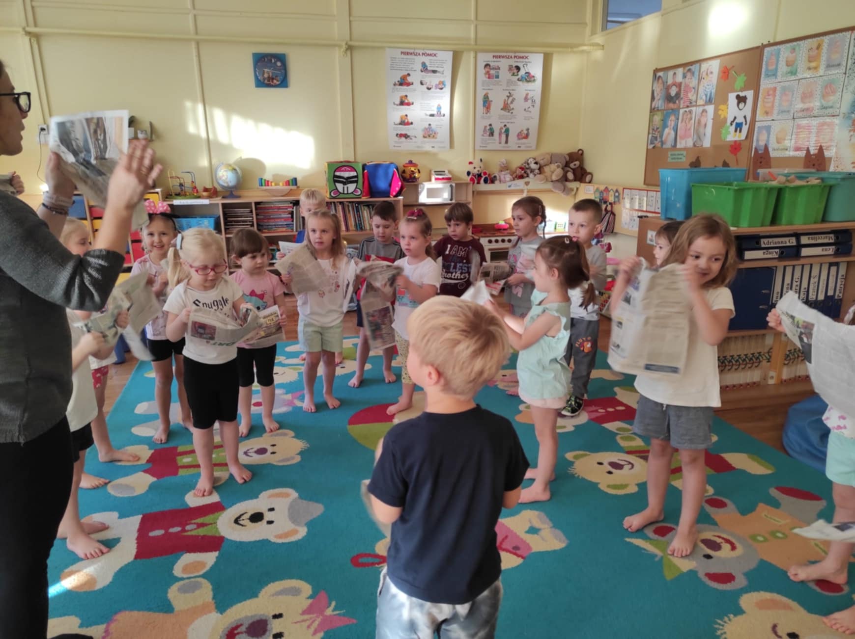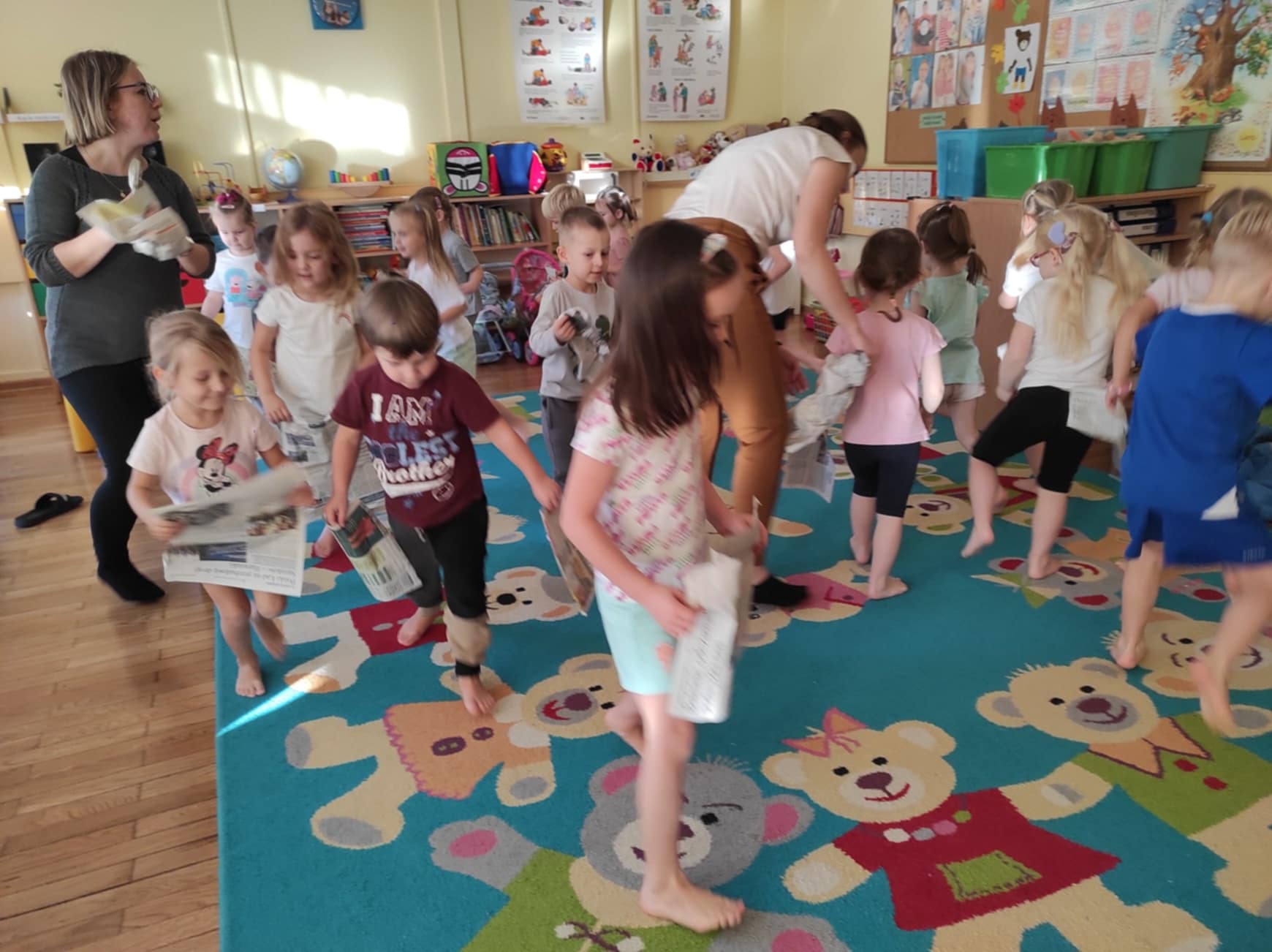 Podczas zajęć dzieci przeniosły się do „Deszczowej krainy“, którą mogły oczyma wyobraźni obejrzeć razem z jej królem. Ćwiczenia odbywały się przy akompaniamencie muzyki i z wykorzystaniem nietypowej pomocy, gazety. Różnorodność form ruchowych oraz sposób prowadzenia takich zajęć daje dzieciom możliwość twórczego działania, poznania własnego ciała, rozwija poczucie rytmu, doskonali koordynację ruchową, kształtuje orientację przestrzenną oraz wyobraźnię ruchową i własną inwencję w tym zakresie. Ponadto daje możliwość improwizowania i realizowania naturalnej potrzeby ruchu.