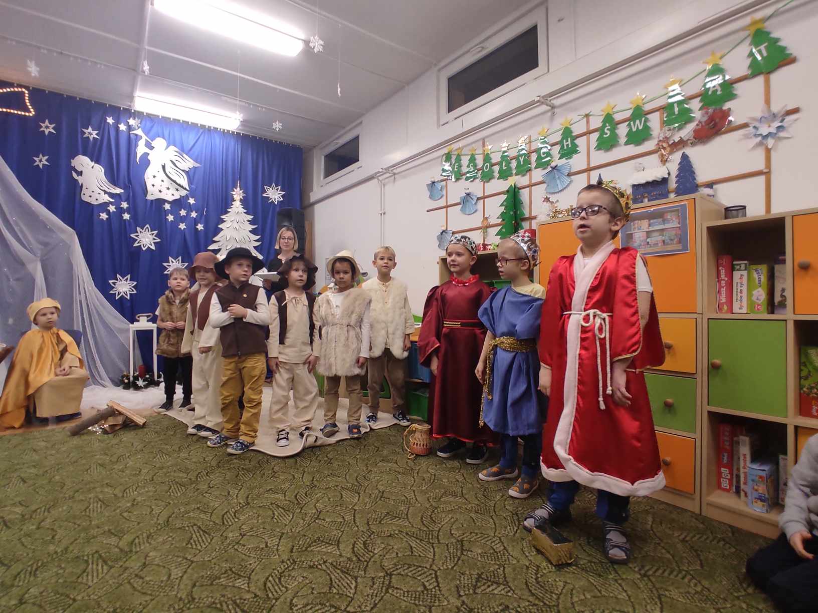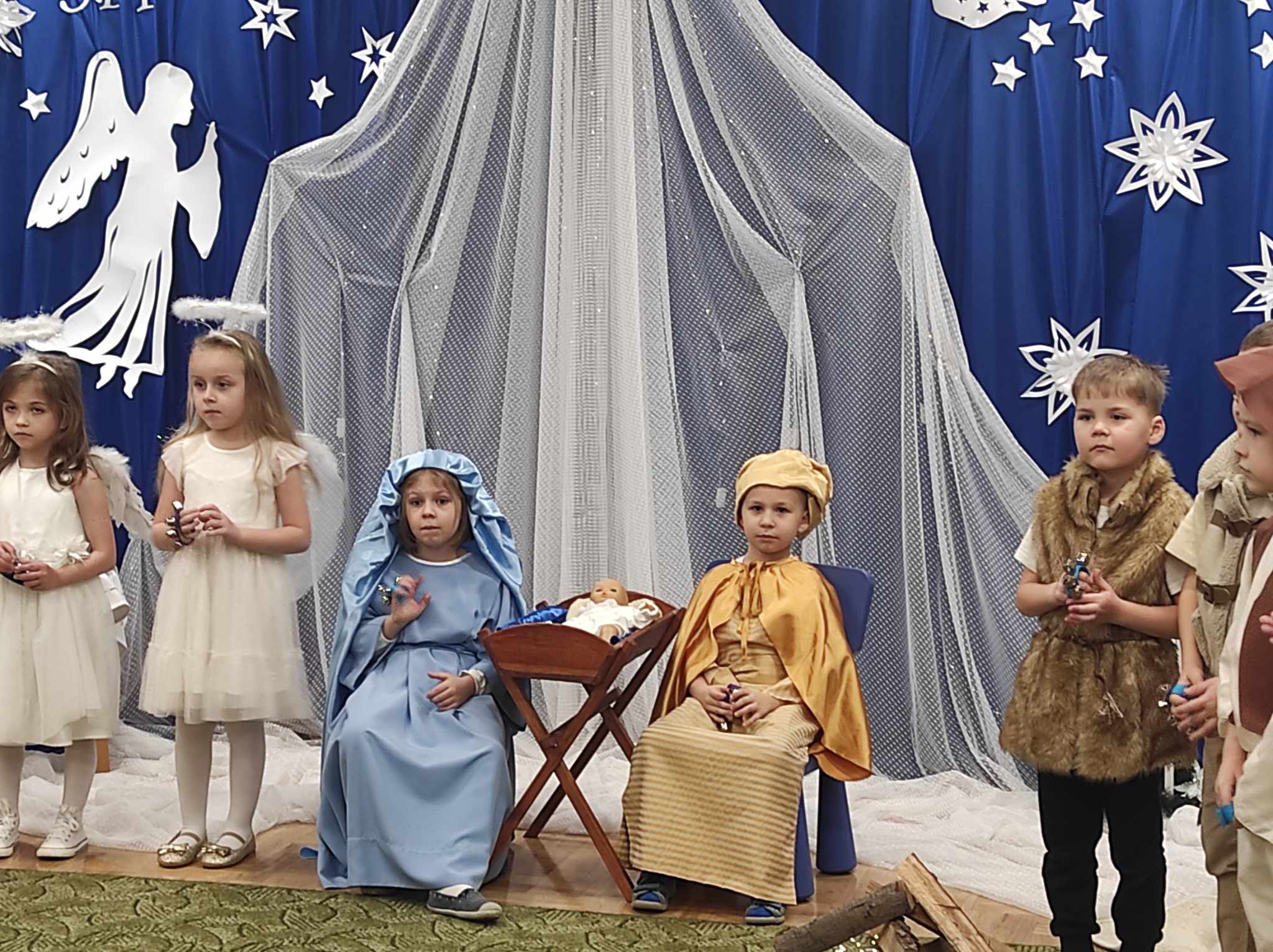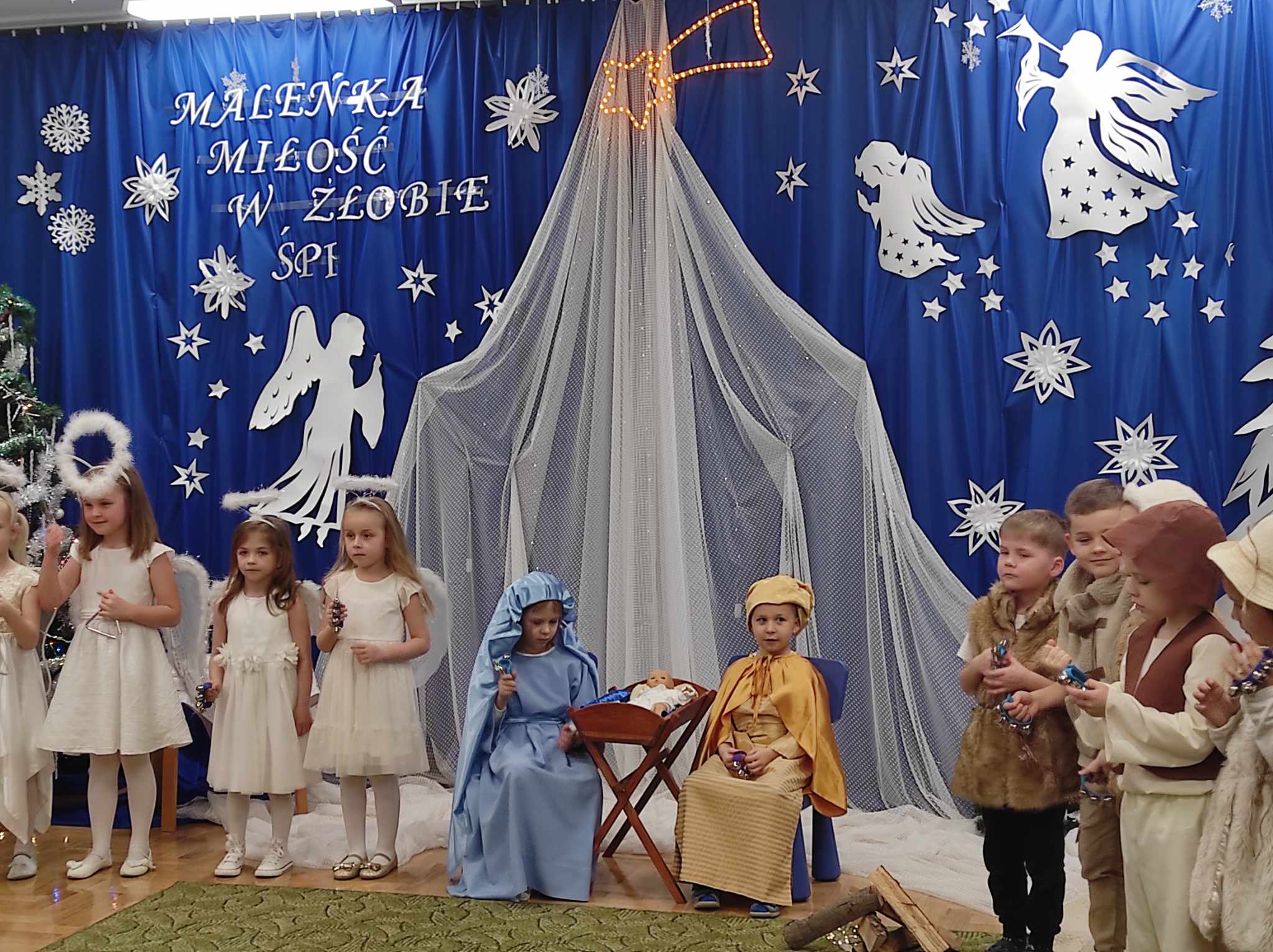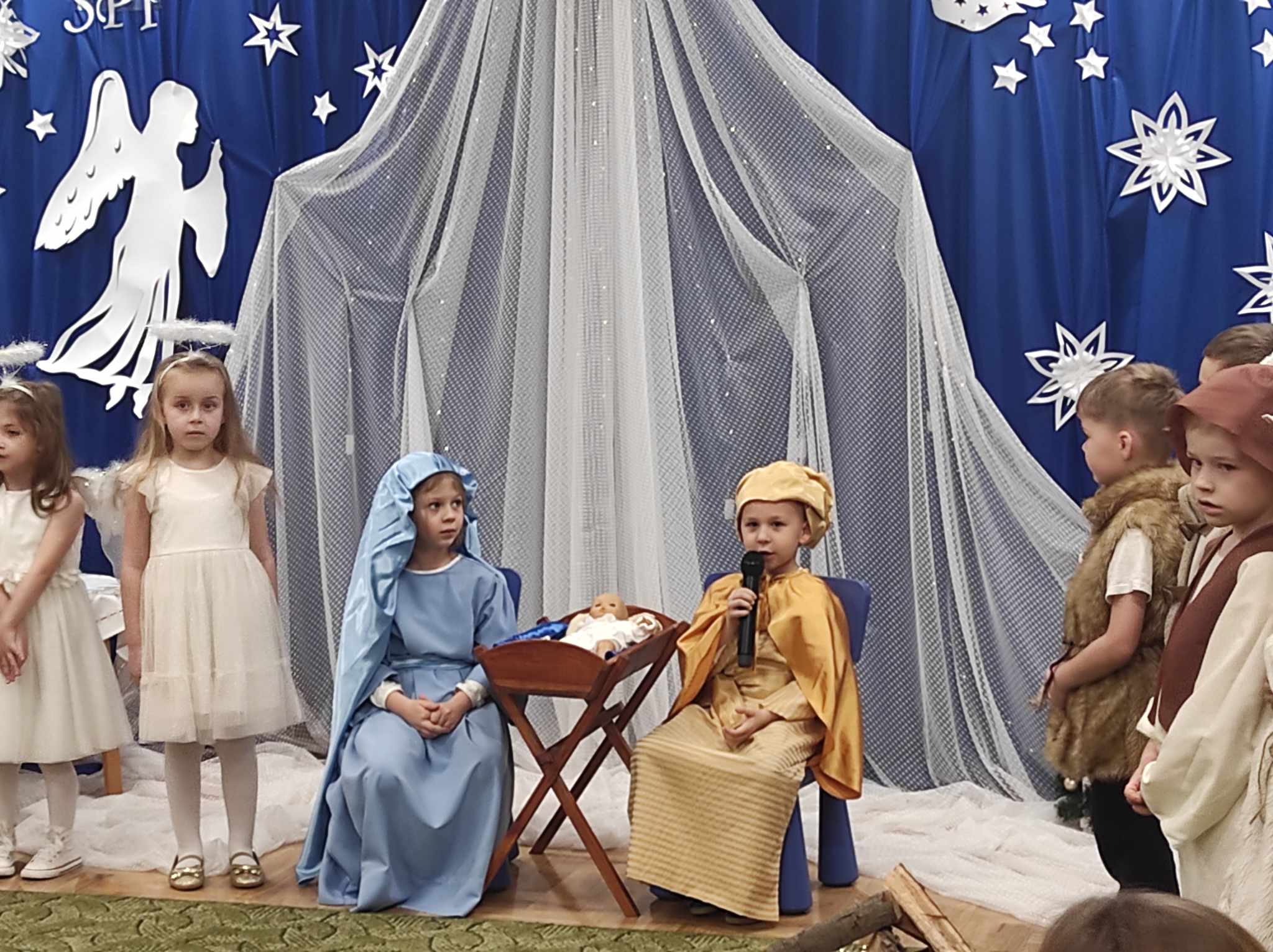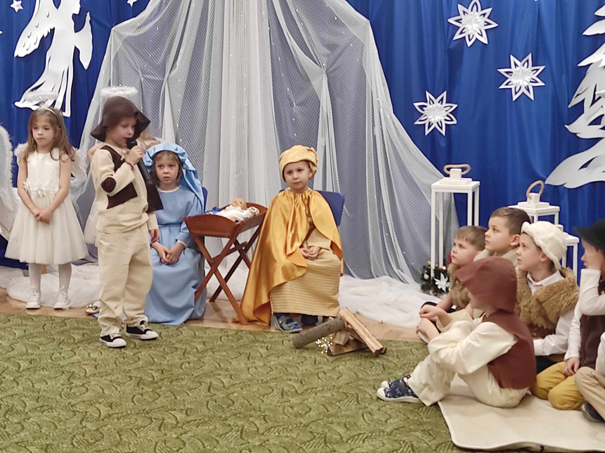 19.12.2023 r. przedszkolaki z grupy „Zajączki“ zaprezentowały swoim najbliższym przedstawienie jasełkowe. Okres Bożego Narodzenia to czas wyjątkowy, pełen radości, refleksji, nadziei i serdecznych spotkań w gronie najbliższych. W dobrym przeżyciu Bożego Narodzenia pomaga świadome pielęgnowanie tradycyjnych zwyczajów świątecznych. Jednym z nich są Jasełka, czyli widowisko o Bożym Narodzeniu, którego treścią jest historia narodzenia Pana Jezusa. Przygotowania do Jasełek w naszym przedszkolu trwały wiele dni, dzieci uczyły się kolęd, pastorałek, recytowały przypisane im role. Dały możliwość prezentowania swoich umiejętności wokalnych, aktorskich, recytatorskich, tanecznych. Jasełka wprowadziły wszystkich zgromadzonych w świąteczny nastrój. Serdeczne życzenia świąteczne złożyły nie tylko dzieci, ale i Pani Dyrektor Bożena Dąbrowska, która życzyła wszystkim obecnym m.in. zdrowia i radosnych spotkań świątecznych.