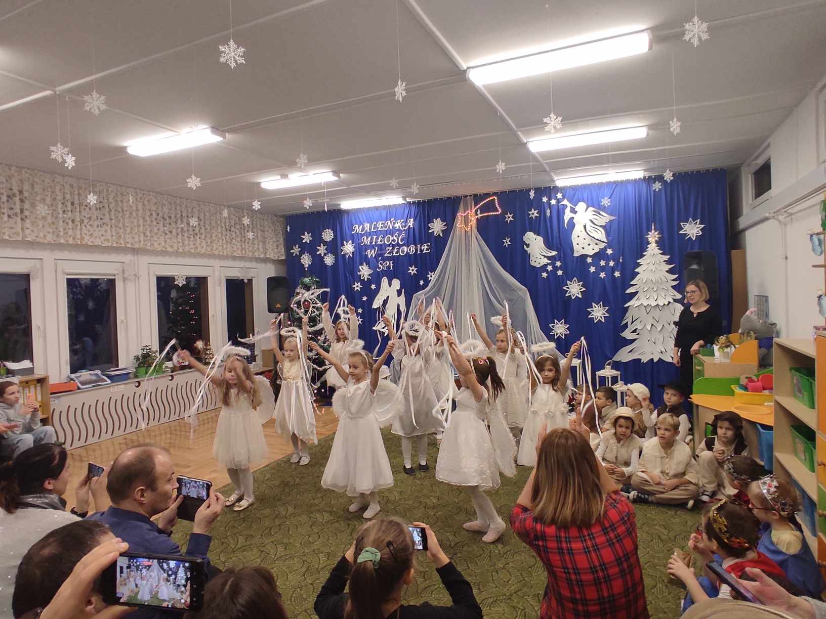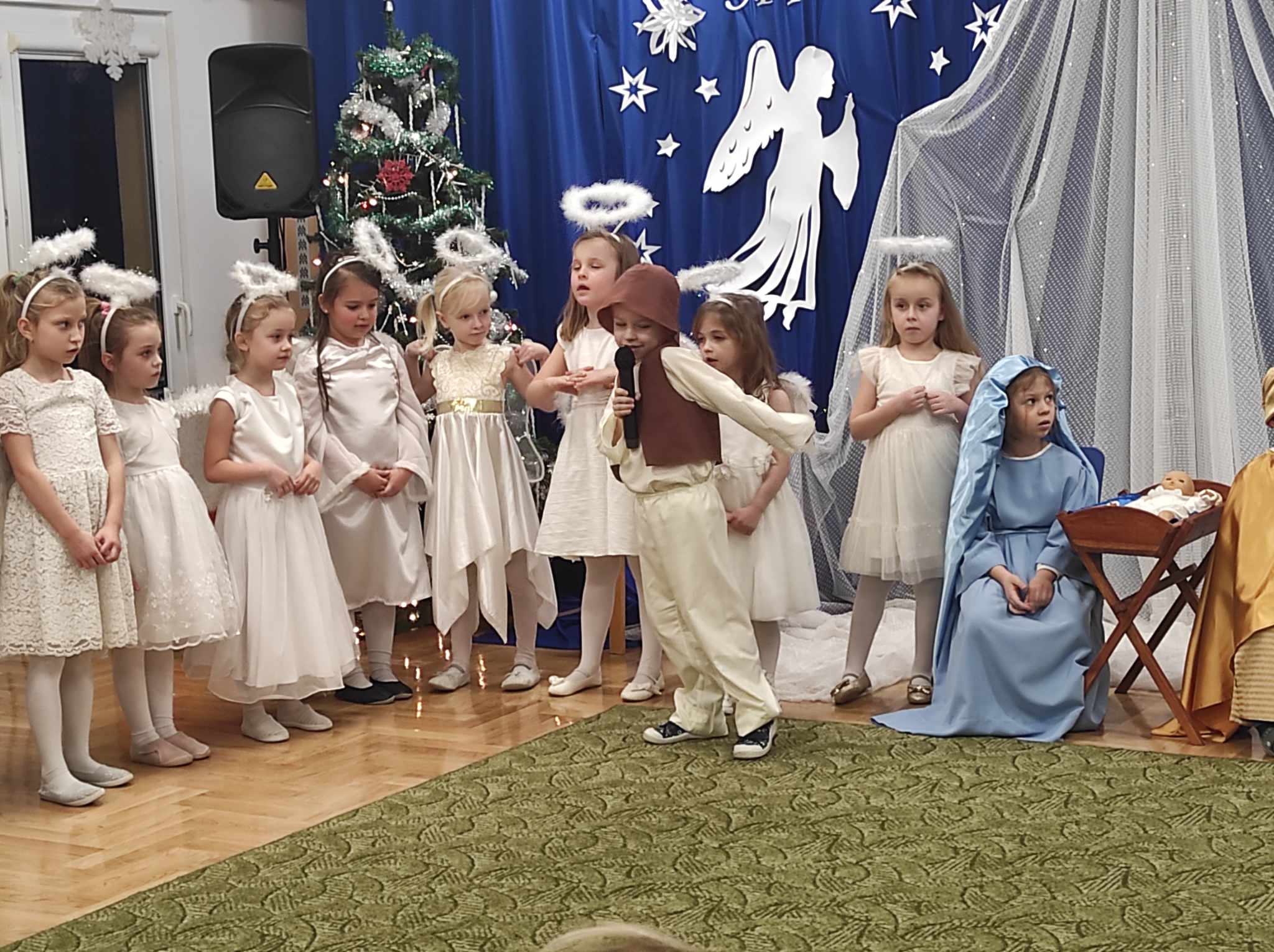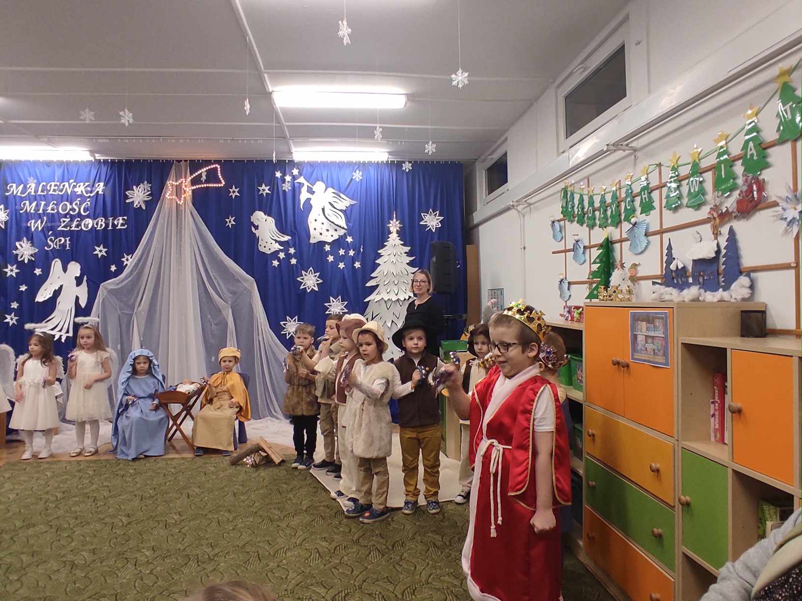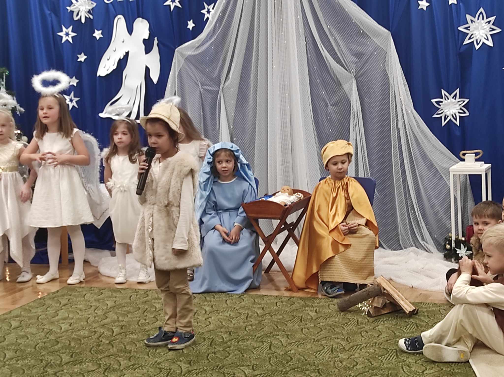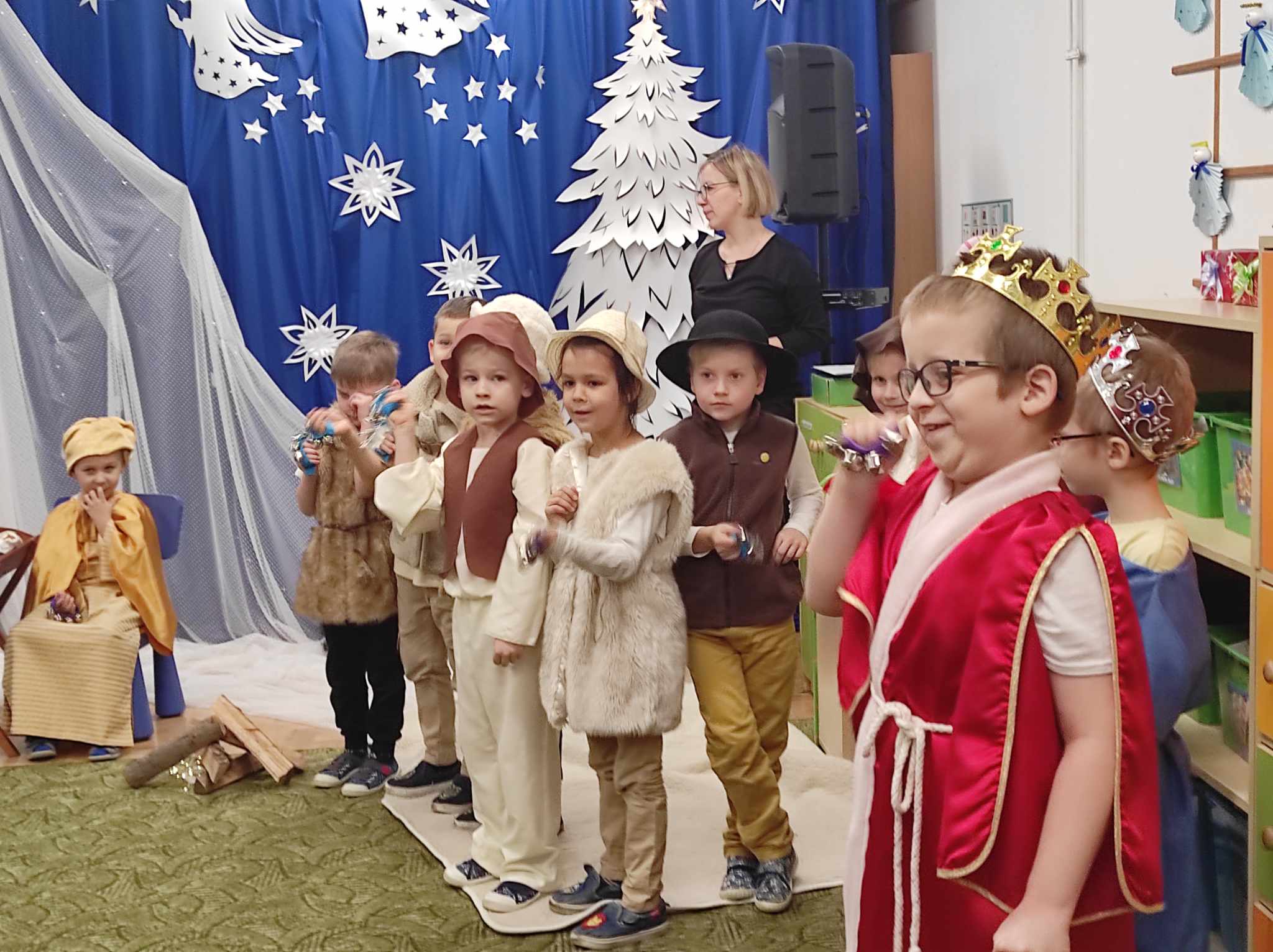 19.12.2023 r. przedszkolaki z grupy „Zajączki“ zaprezentowały swoim najbliższym przedstawienie jasełkowe. Okres Bożego Narodzenia to czas wyjątkowy, pełen radości, refleksji, nadziei i serdecznych spotkań w gronie najbliższych. W dobrym przeżyciu Bożego Narodzenia pomaga świadome pielęgnowanie tradycyjnych zwyczajów świątecznych. Jednym z nich są Jasełka, czyli widowisko o Bożym Narodzeniu, którego treścią jest historia narodzenia Pana Jezusa. Przygotowania do Jasełek w naszym przedszkolu trwały wiele dni, dzieci uczyły się kolęd, pastorałek, recytowały przypisane im role. Dały możliwość prezentowania swoich umiejętności wokalnych, aktorskich, recytatorskich, tanecznych. Jasełka wprowadziły wszystkich zgromadzonych w świąteczny nastrój. Serdeczne życzenia świąteczne złożyły nie tylko dzieci, ale i Pani Dyrektor Bożena Dąbrowska, która życzyła wszystkim obecnym m.in. zdrowia i radosnych spotkań świątecznych.