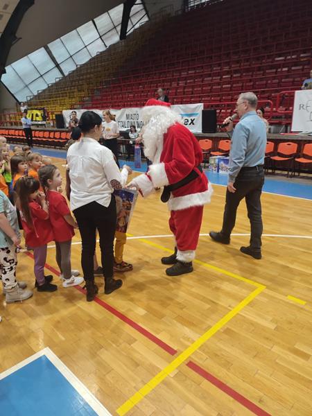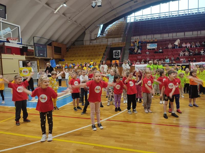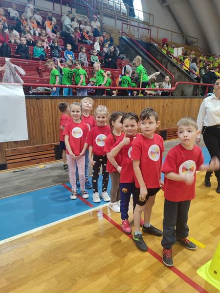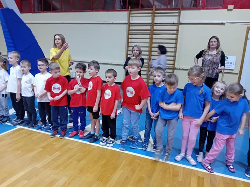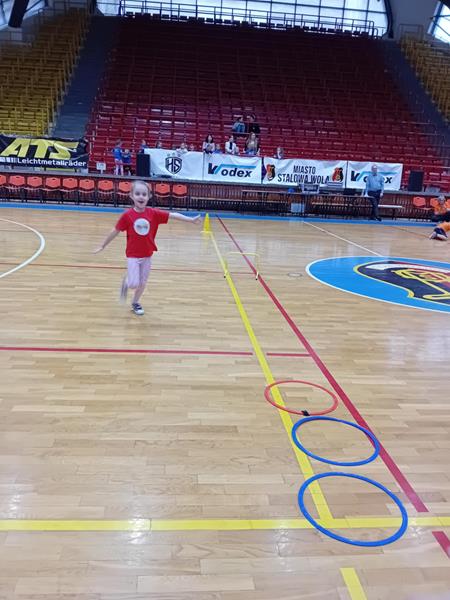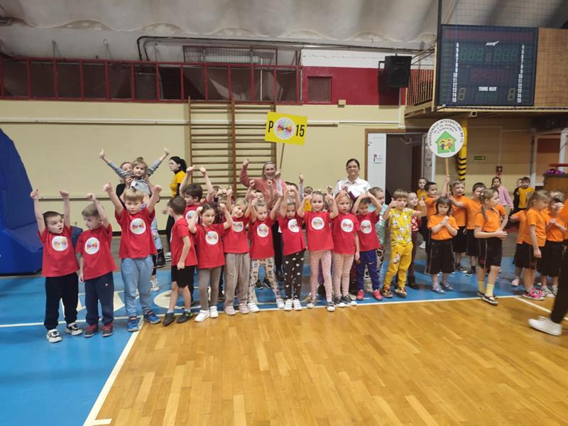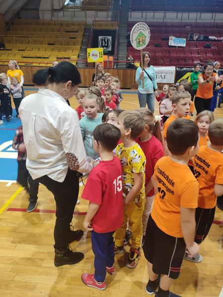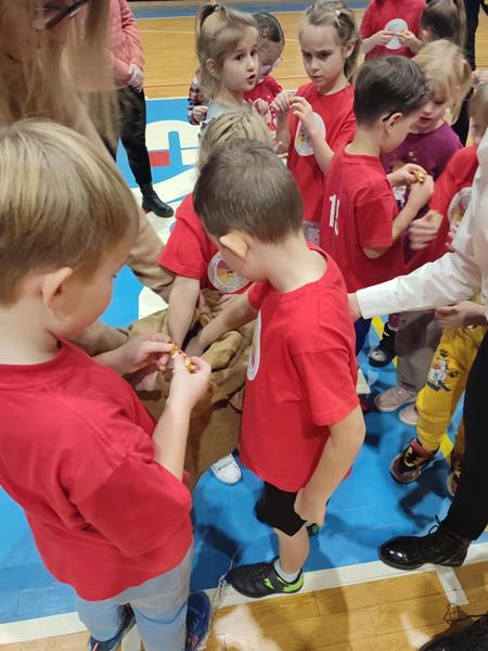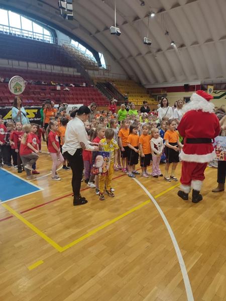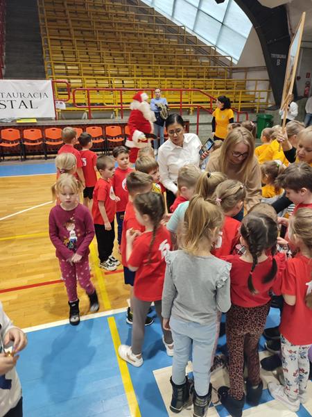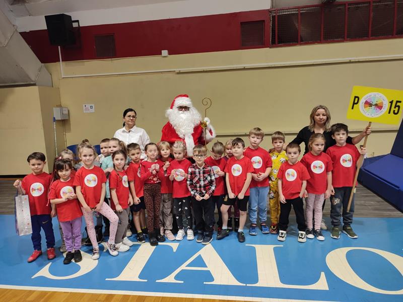 04.12.2024 r. dzieci z grupy ,,Zajączki” wybrały się autokarem na MOSiR w Stalowej Woli na zawody sportowe pt. ,,Mikołajki na sportowo”. Spotkanie rozpoczęło się od rozgrzewki na hali sportowej dla wszystkich zgromadzonych przedszkolaków. Następnie drużyna reprezentująca grupę ,,Zajączki” brała udział w zawodach sportowych wraz z przedszkolakami ze stalowowolskich przedszkoli. Pozostałe przedszkolaki bacznie obserwowały zmagania kolegów i koleżanek z grupy i dopingowały swoim rówieśnikom na trybunach kolorowymi pomponami i gorącymi oklaskami. Po zawodach odbyło się spotkanie ze Świętym Mikołajem, który oprócz słodyczy, podarował wszystkim uczestnikom prezent dla każdej z grup przedszkolnych. Celem spotkania było nie tylko kształtowanie sprawności ruchowej, zwinności, koordynacji wzrokowo – ruchowej, precyzji ruchu, ale także doskonalenie współpracy w zespole.