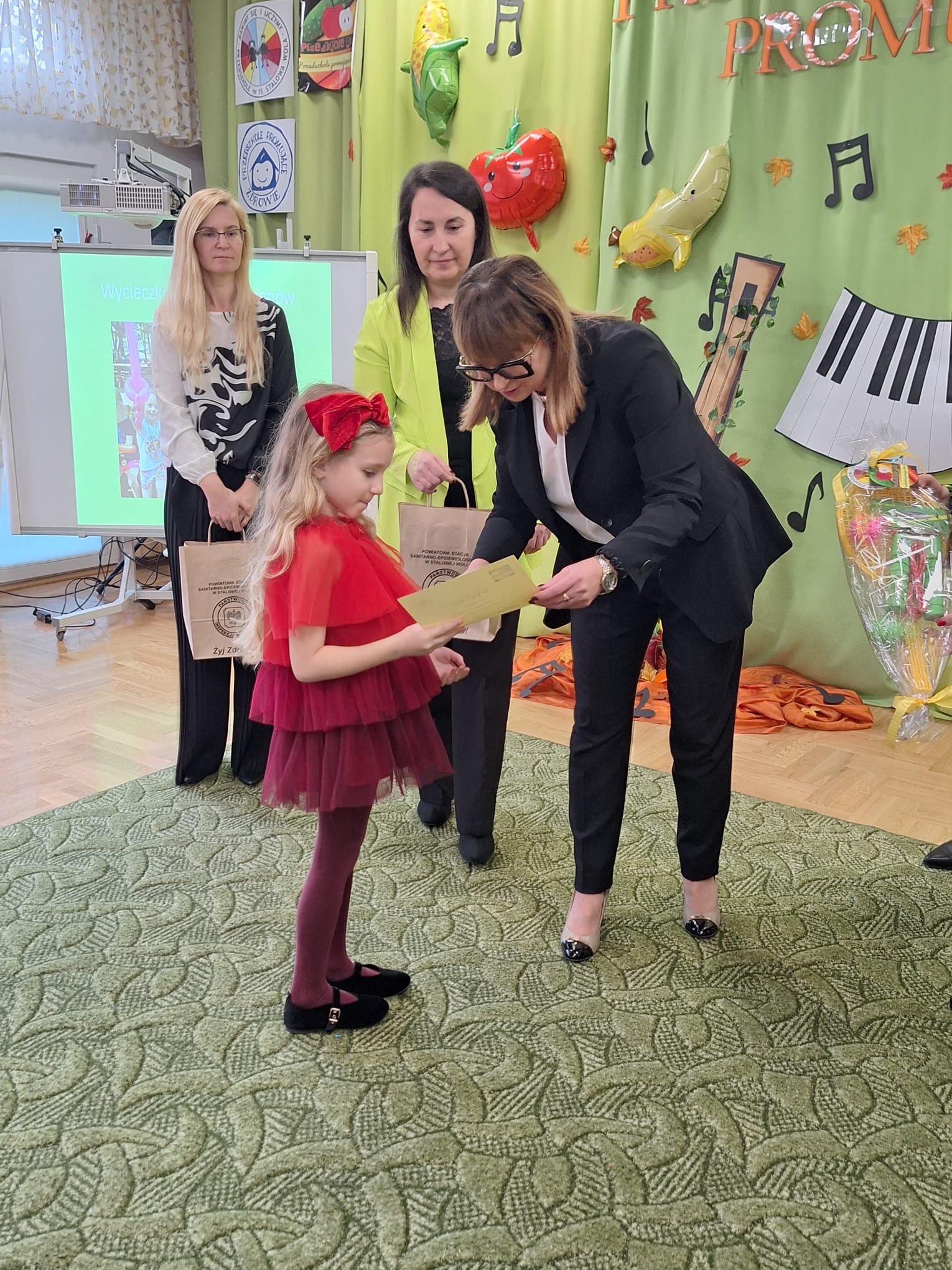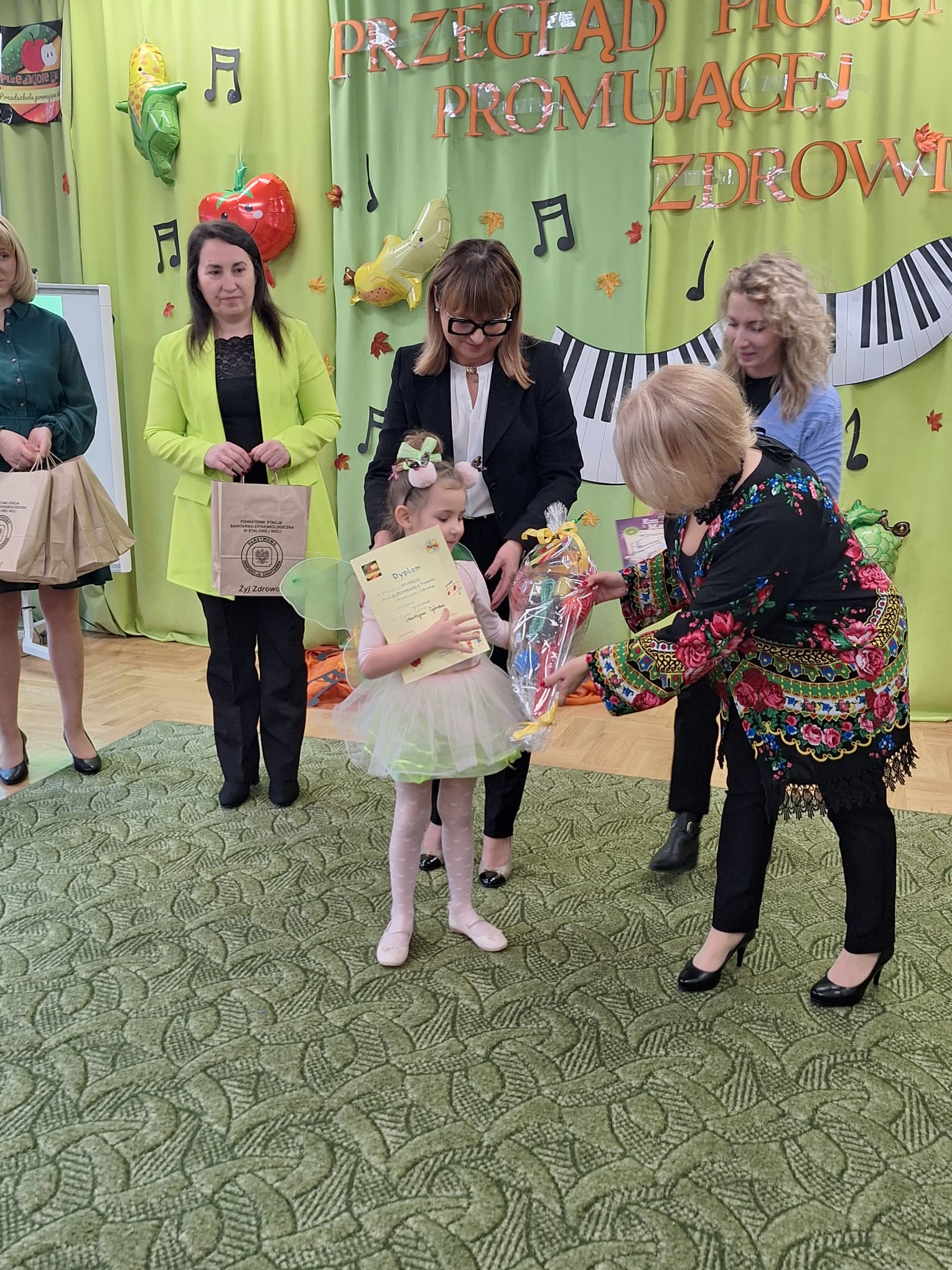 Przegląd objął swoim patronatem Państwowy Powiatowy Inspektor Sanitarny w Stalowej Woli. Nagrody wręczali zaproszeni goście: prezydent miasta Stalowej Woli Pani Monika Pachacz-Świderska, Pani Joanna Pawłowska inspektor Powiatowej Stacji Sanitarno-Epidemiologicznej w Stalowej Woli, Pani Małgorzata Wróblewska przewodnicząca Rady Rodziców oraz Bożena Dąbrowska dyrektor Przedszkola nr 15 w Stalowej Woli. Na zakończenie, Pani dyrektor przedszkola oraz Pani prezydent skierowały podziękowania wszystkim małym artystom oraz osobom zaangażowanym w przygotowanie przeglądu Na przedszkolaków czekał pyszny poczęstunek w postaci „talerzy zdrowia”.