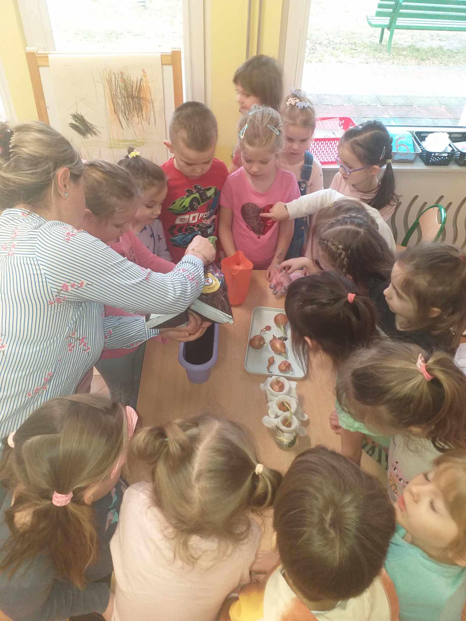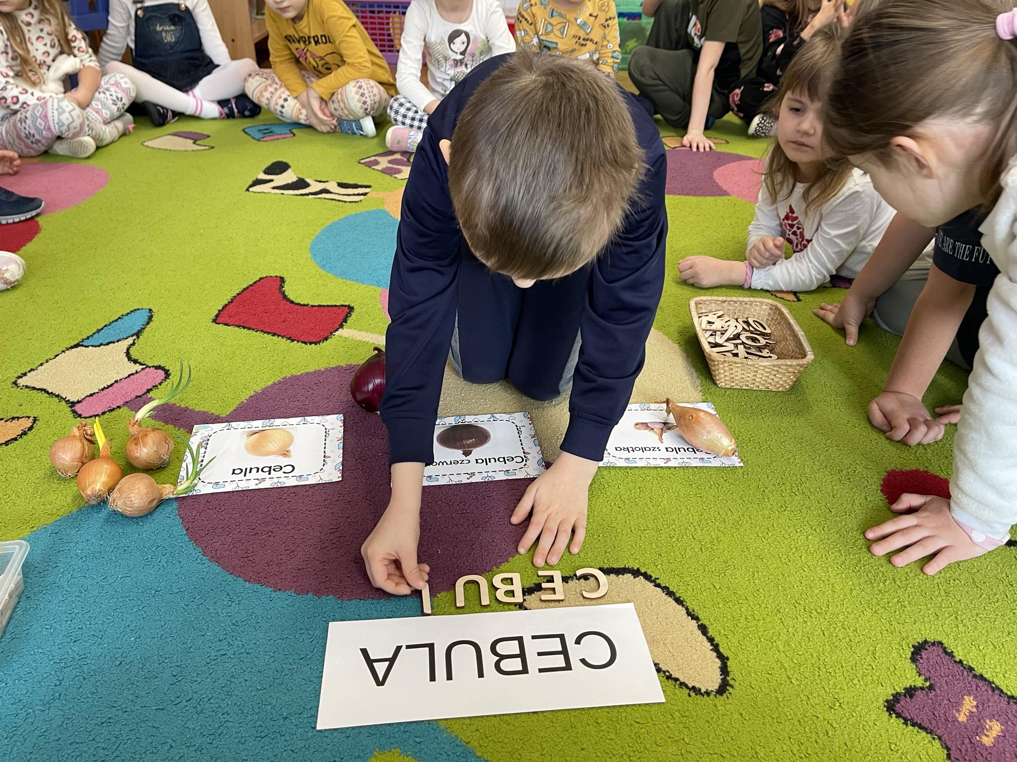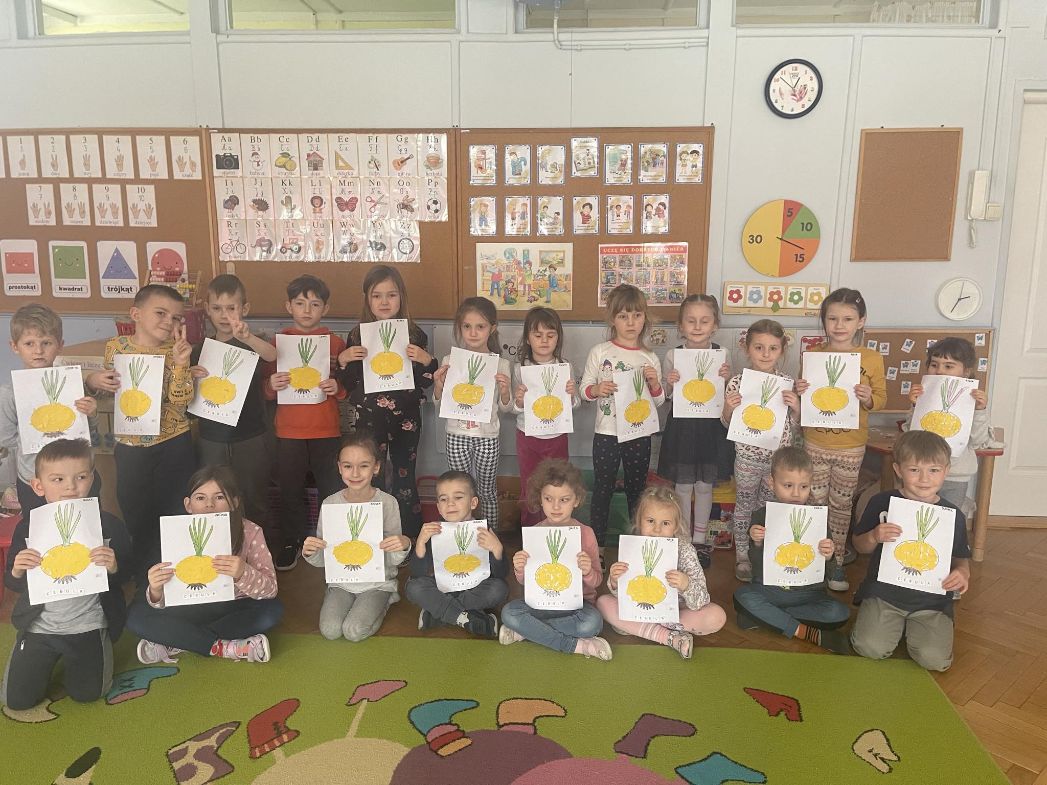 W ramach projektu edukacyjnego „Witaminki“ dzieci zapoznały się z kolejnym zdrowym warzywem jakim jest cebula. Przedszkolaki miały okazję zobaczyć różne odmiany cebuli, zapoznać się z kształtem, zapachem oraz walorami zdrowotnymi. Wspólnie założyły hodowlę cebuli oraz wykonały cebulowe prace plastyczne.