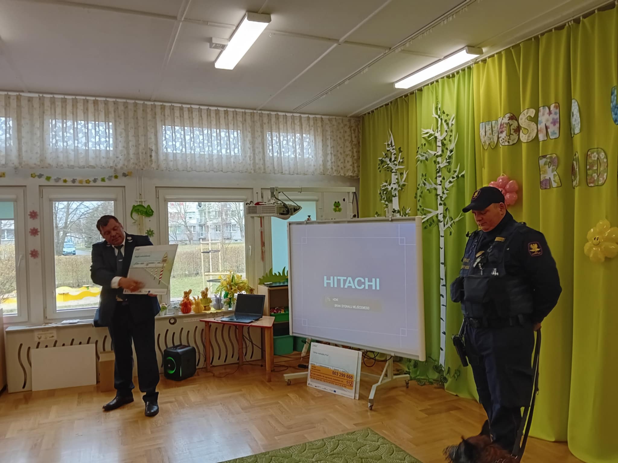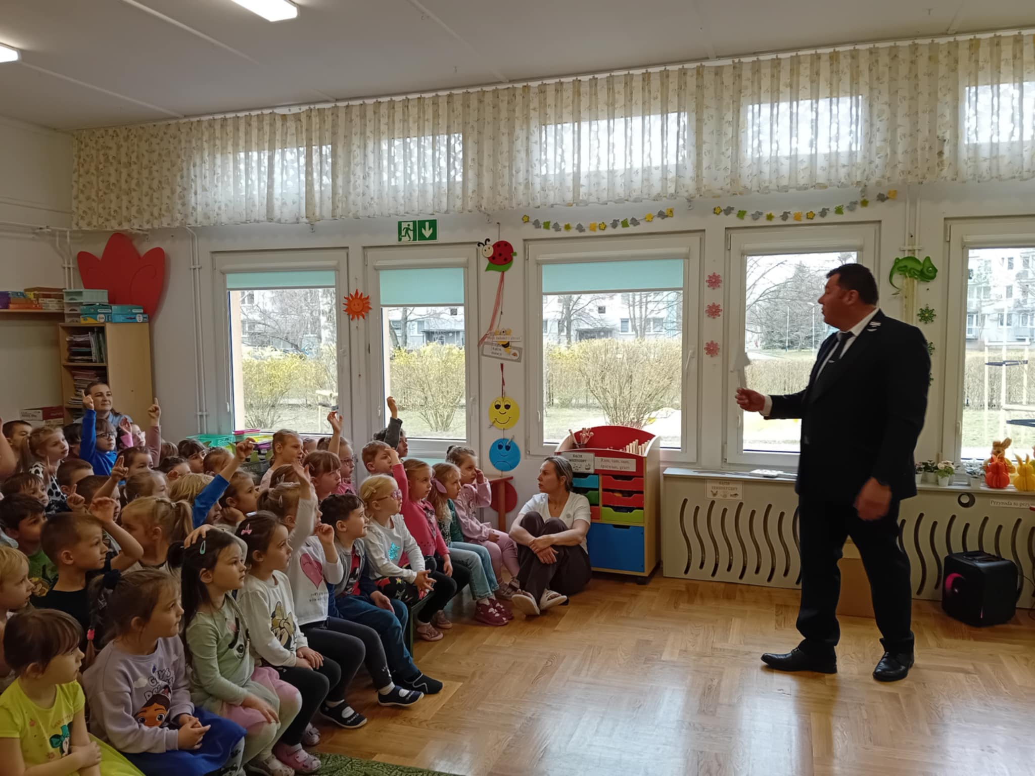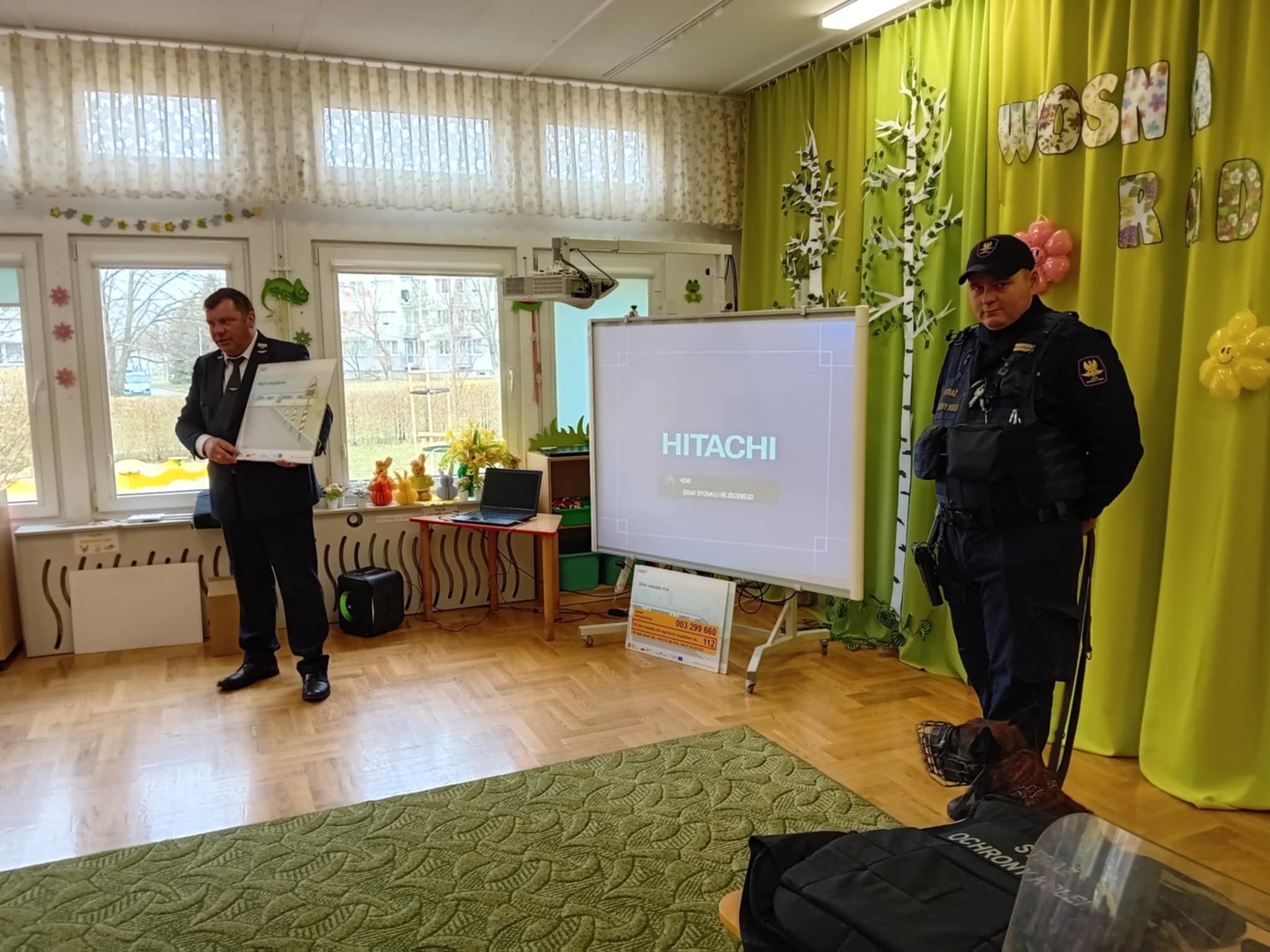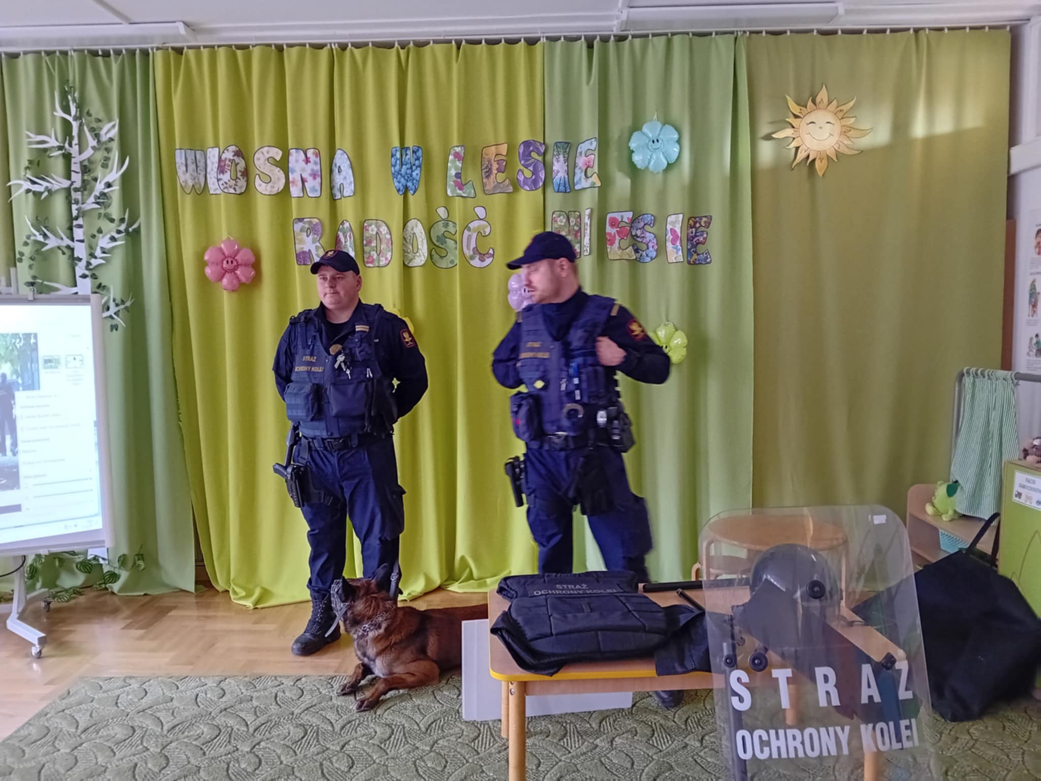 24.03.2025 r. odbyło się spotkanie całej społeczności przedszkolnej z funkcjonariuszami Straży Ochrony Kolei i psem w ramach kampanii społecznej ,,Bezpieczny przejazd” pt. ,,Posłuchaj głosu rozsądku”. Kampania ,,Bezpieczny przejazd” jest realizowana, by powiedzieć ,,Stop” brawurze i łamaniu przepisów na przejazdach i przejściach kolejowych. Pracownicy straży pokazali przedszkolakom swoje umundurowanie i akcesoria niezbędne w swojej pracy. Dzieci poznały znaki, które znajdują się w pobliżu przejazdów kolejowych min.: znaki Stop i Krzyż św. Andrzeja, a także poznały tajniki ,,Żółtej Naklejki”. Podczas spotkania przedszkolaki dowiedziały się, w jaki sposób zachować bezpieczeństwo na przejazdach kolejowych. Dzieci poznały pracę funkcjonariuszy Straży Ochrony Kolei wraz z psem. Ponadto obejrzały filmy edukacyjne na temat zasad bezpiecznego zachowania się w pobliżu torów kolejowych.