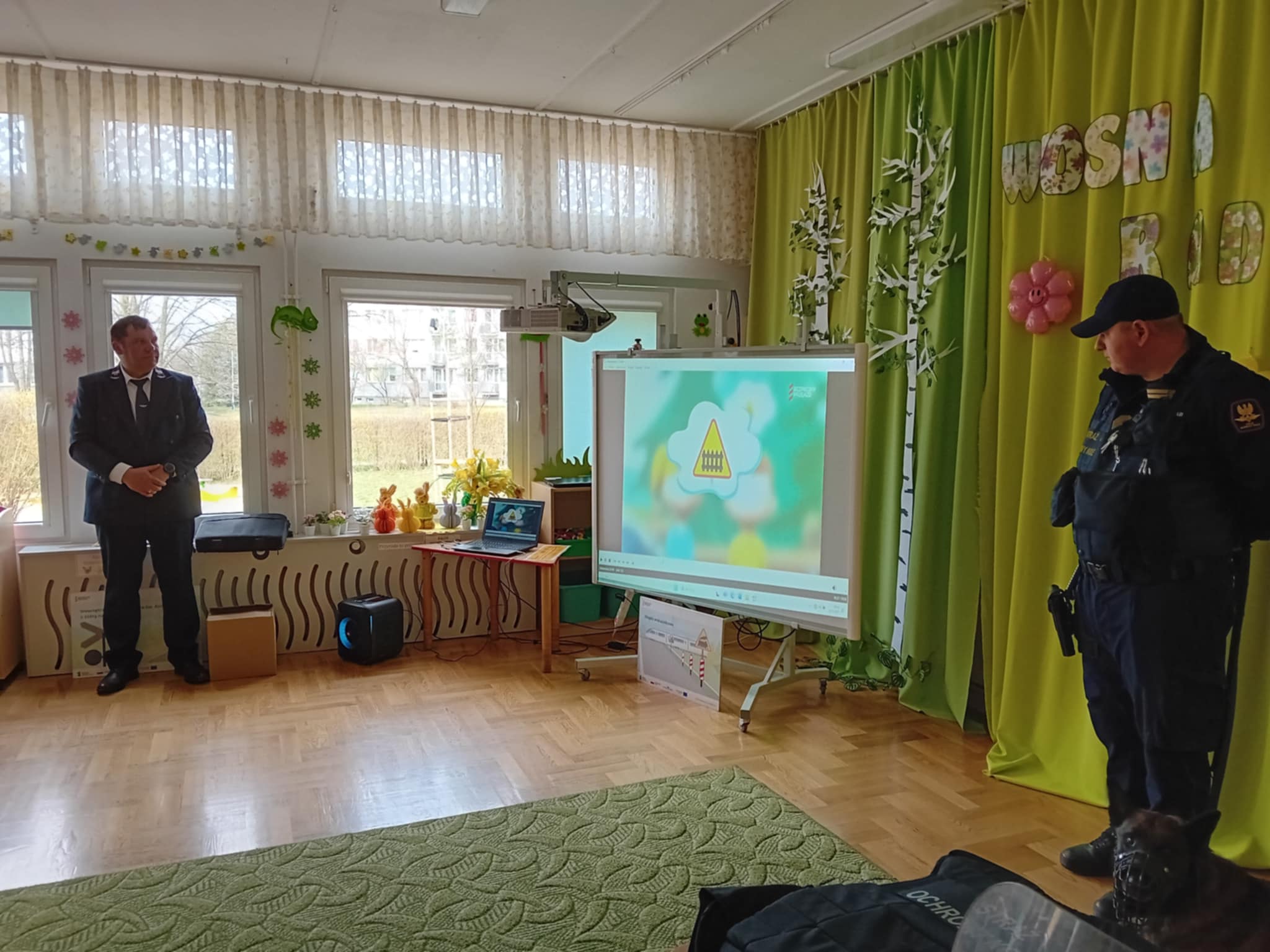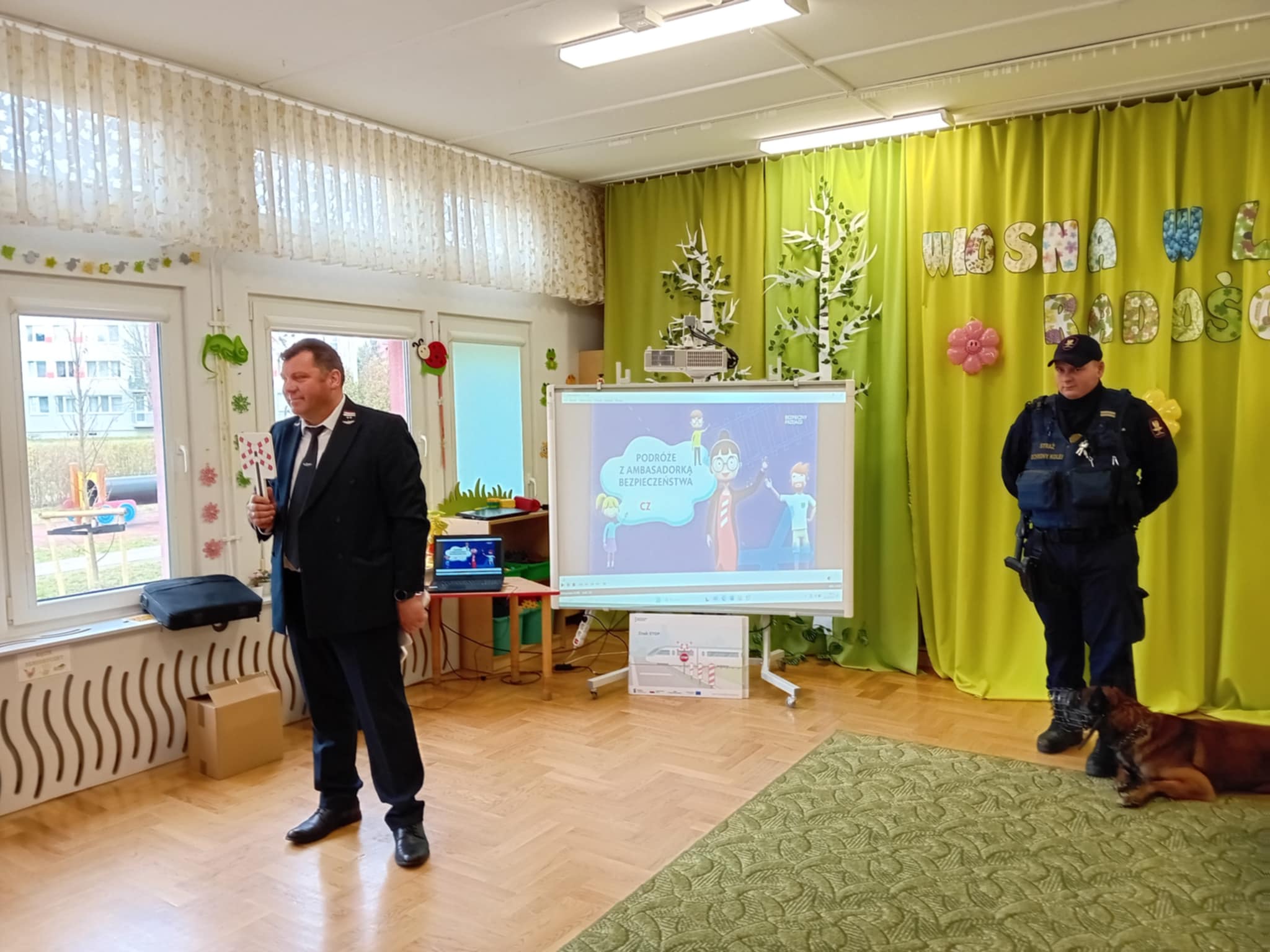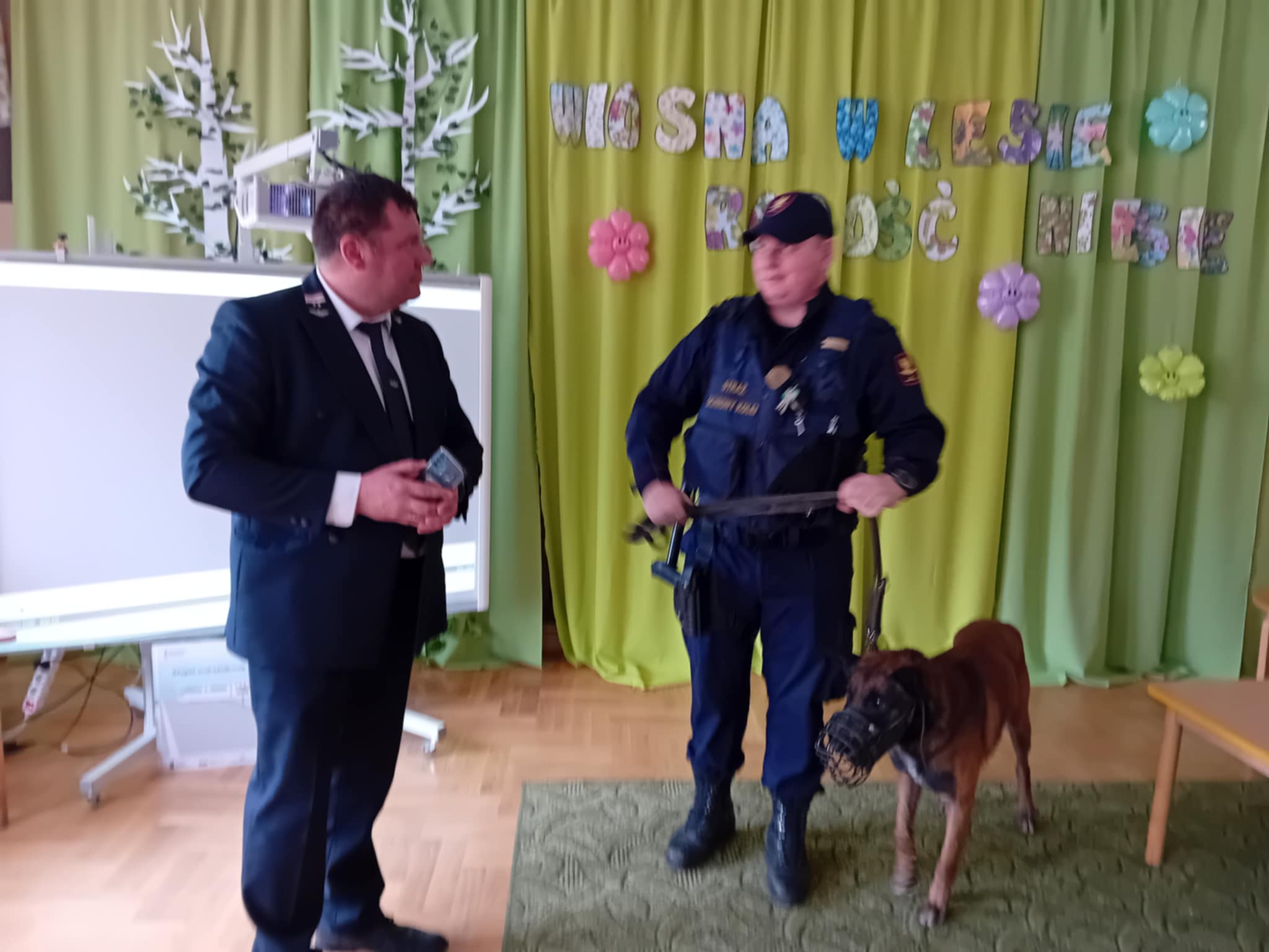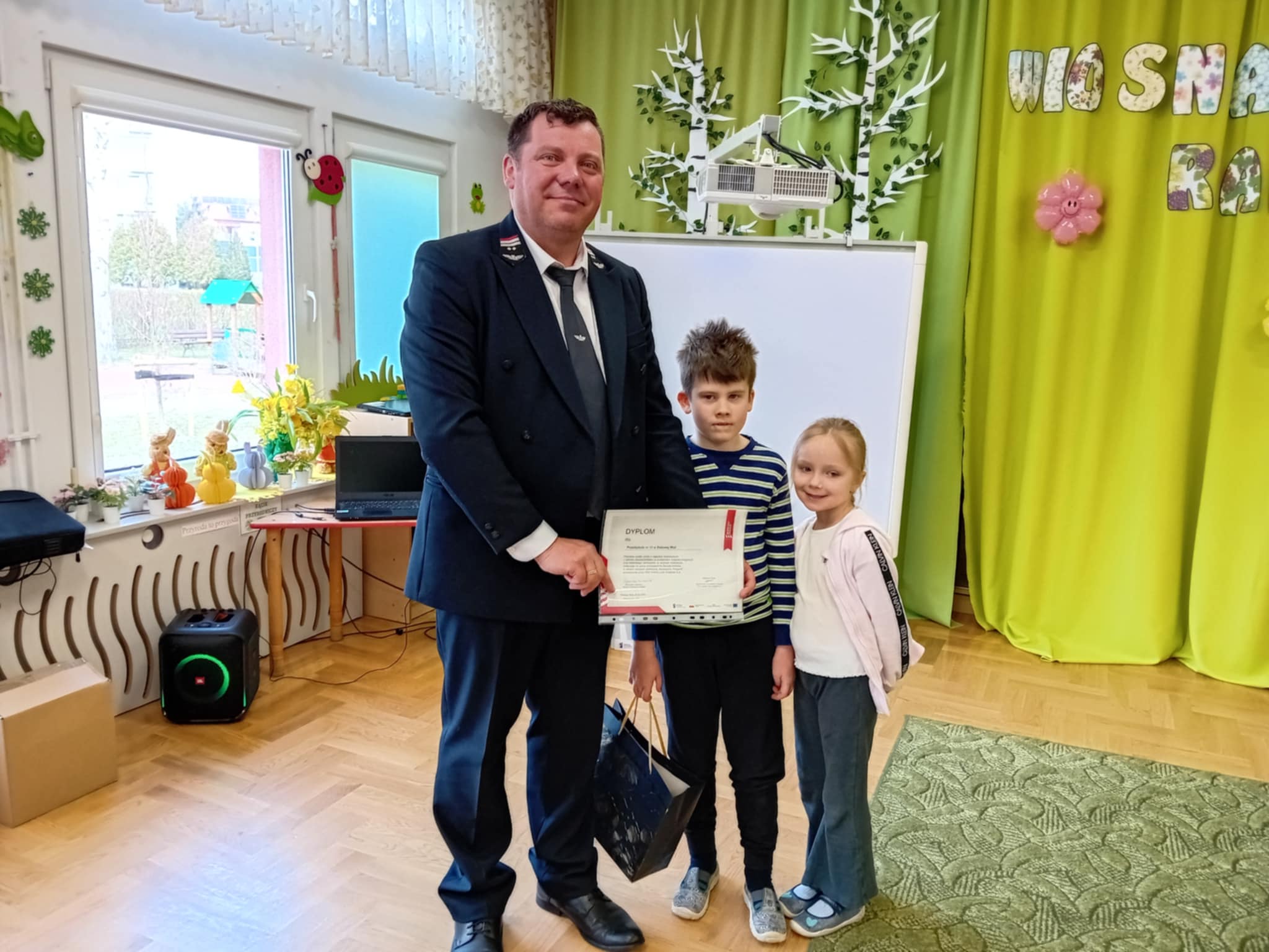 24.03.2025 r. odbyło się spotkanie całej społeczności przedszkolnej z funkcjonariuszami Straży Ochrony Kolei i psem w ramach kampanii społecznej ,,Bezpieczny przejazd” pt. ,,Posłuchaj głosu rozsądku”. Kampania ,,Bezpieczny przejazd” jest realizowana, by powiedzieć ,,Stop” brawurze i łamaniu przepisów na przejazdach i przejściach kolejowych. Pracownicy straży pokazali przedszkolakom swoje umundurowanie i akcesoria niezbędne w swojej pracy. Dzieci poznały znaki, które znajdują się w pobliżu przejazdów kolejowych min.: znaki Stop i Krzyż św. Andrzeja, a także poznały tajniki ,,Żółtej Naklejki”. Podczas spotkania przedszkolaki dowiedziały się, w jaki sposób zachować bezpieczeństwo na przejazdach kolejowych. Dzieci poznały pracę funkcjonariuszy Straży Ochrony Kolei wraz z psem. Ponadto obejrzały filmy edukacyjne na temat zasad bezpiecznego zachowania się w pobliżu torów kolejowych.