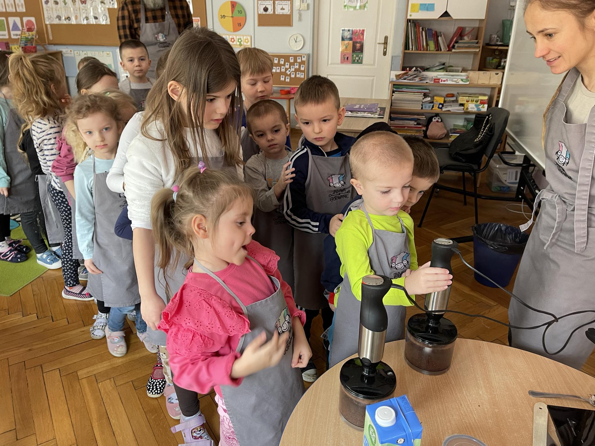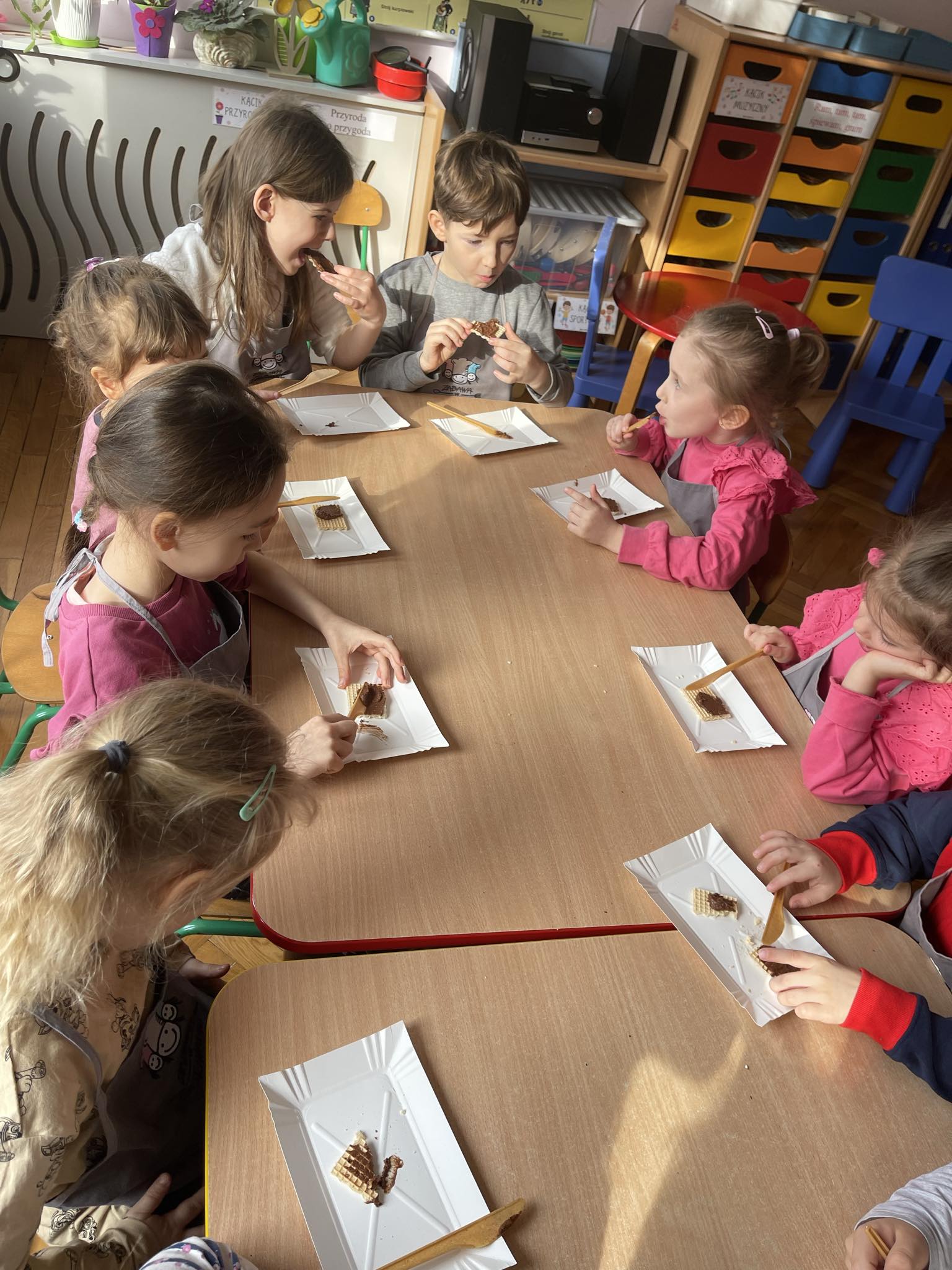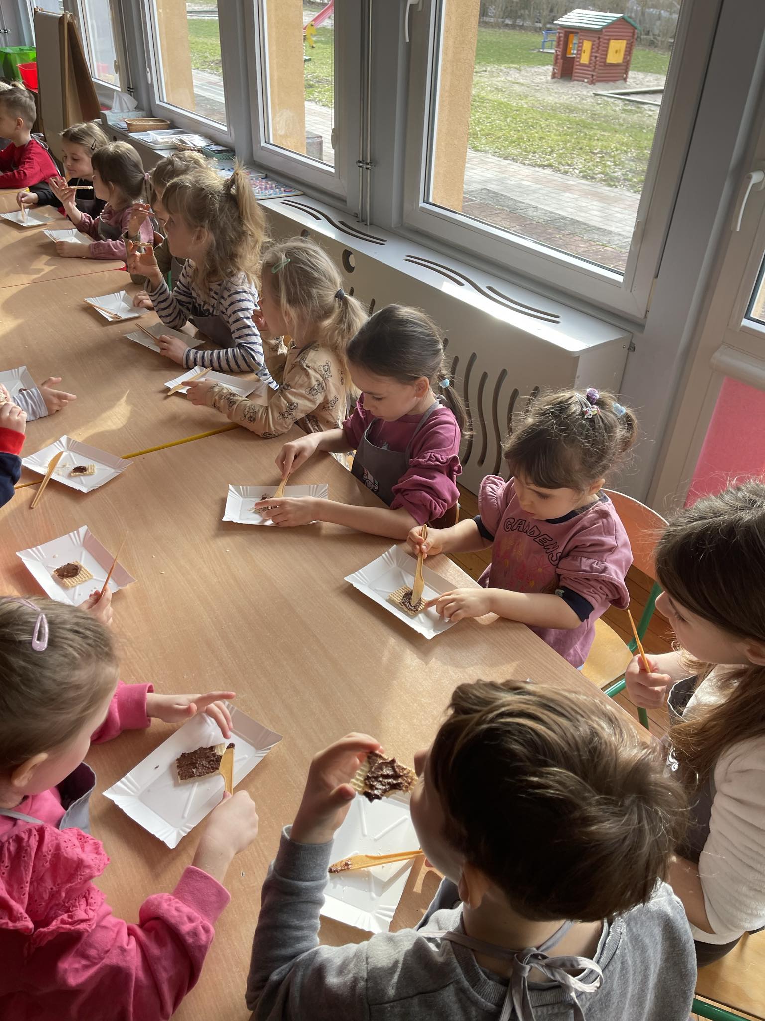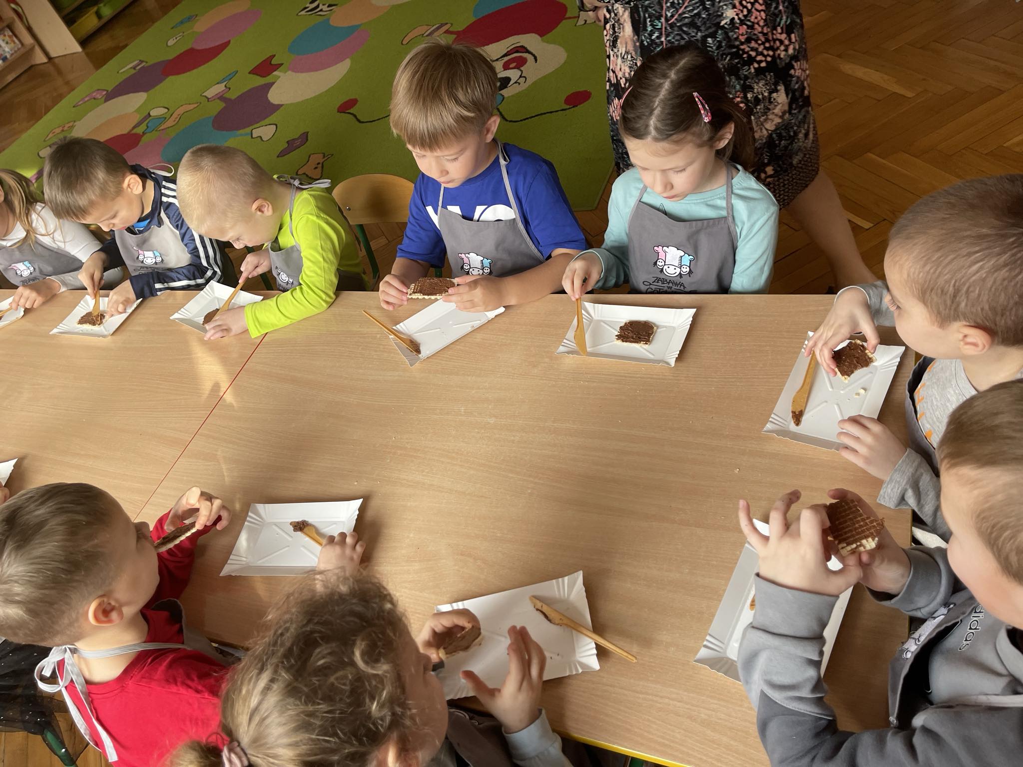 W grupie „Motylki“ odbyły się warsztaty kulinarne. Dzieci miały okazję przygotować zdrową wersję nutelli. Podczas zajęć głównymi bohaterami były daktyle i orzechy laskowe. Przedszkolaki wspólnie krok po kroku przygotowały ten pyszny przysmak. Wszystkim dzieciom bardzo smakowało.