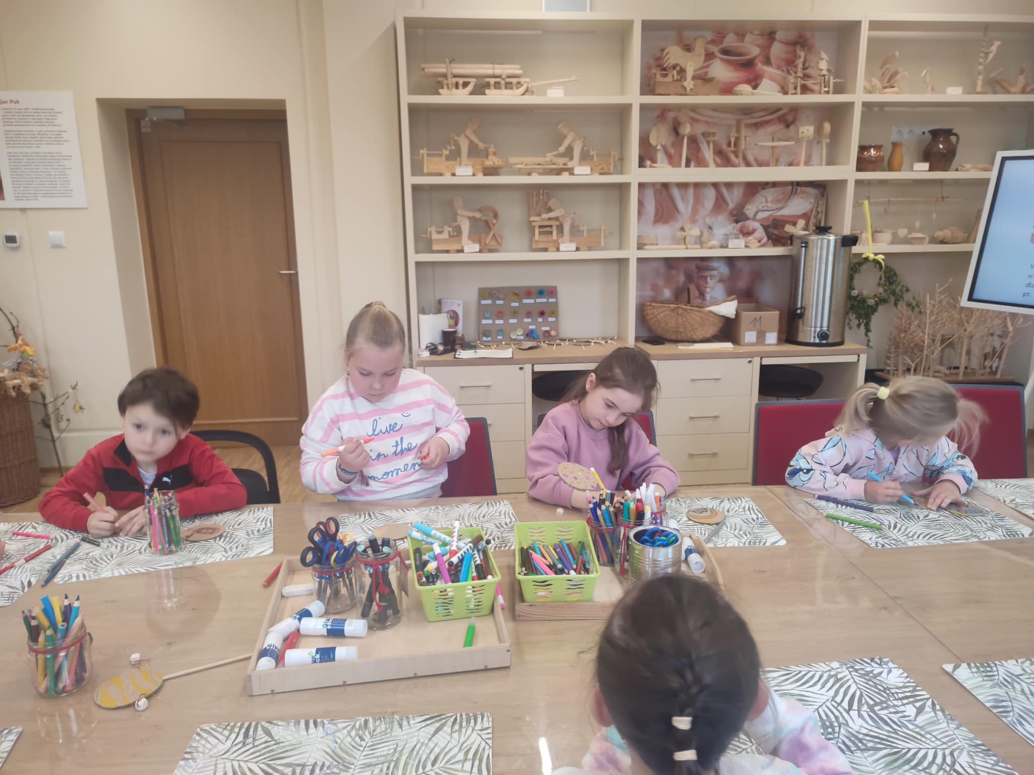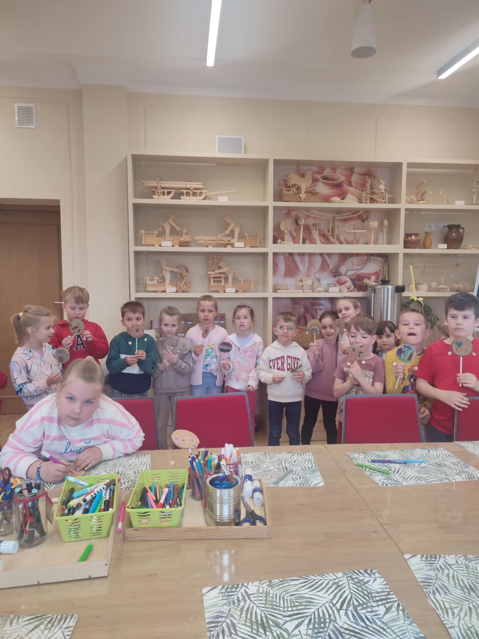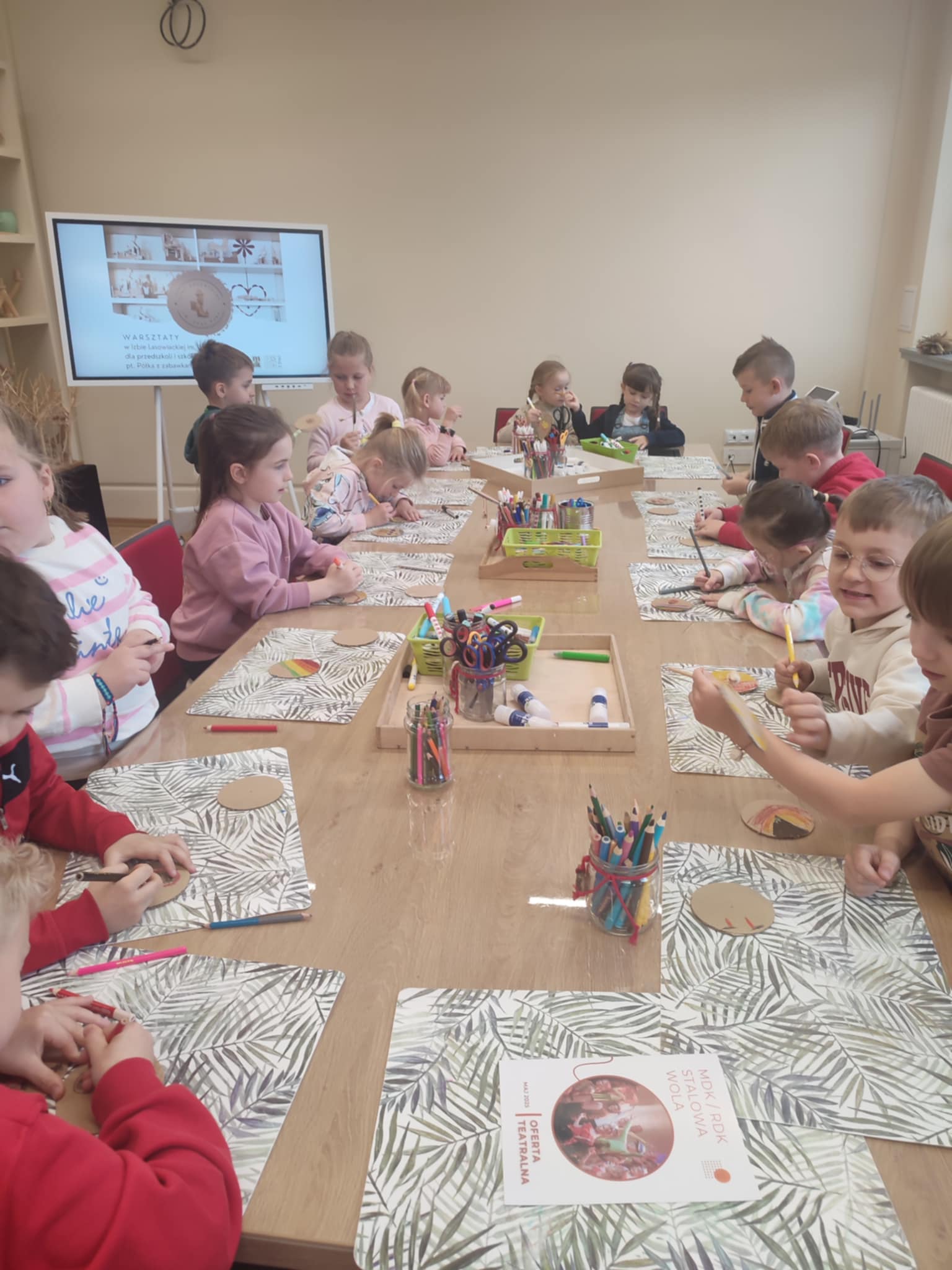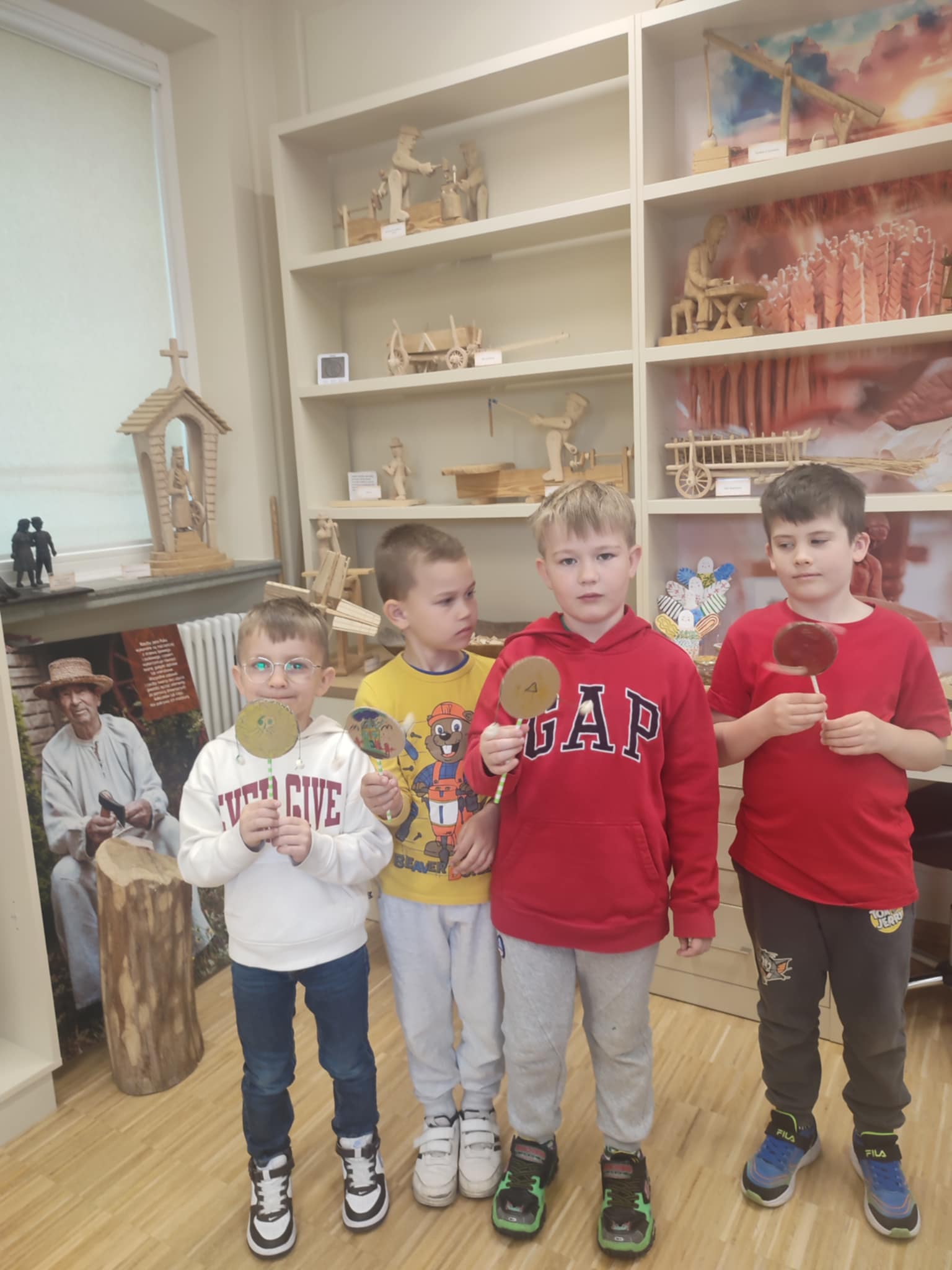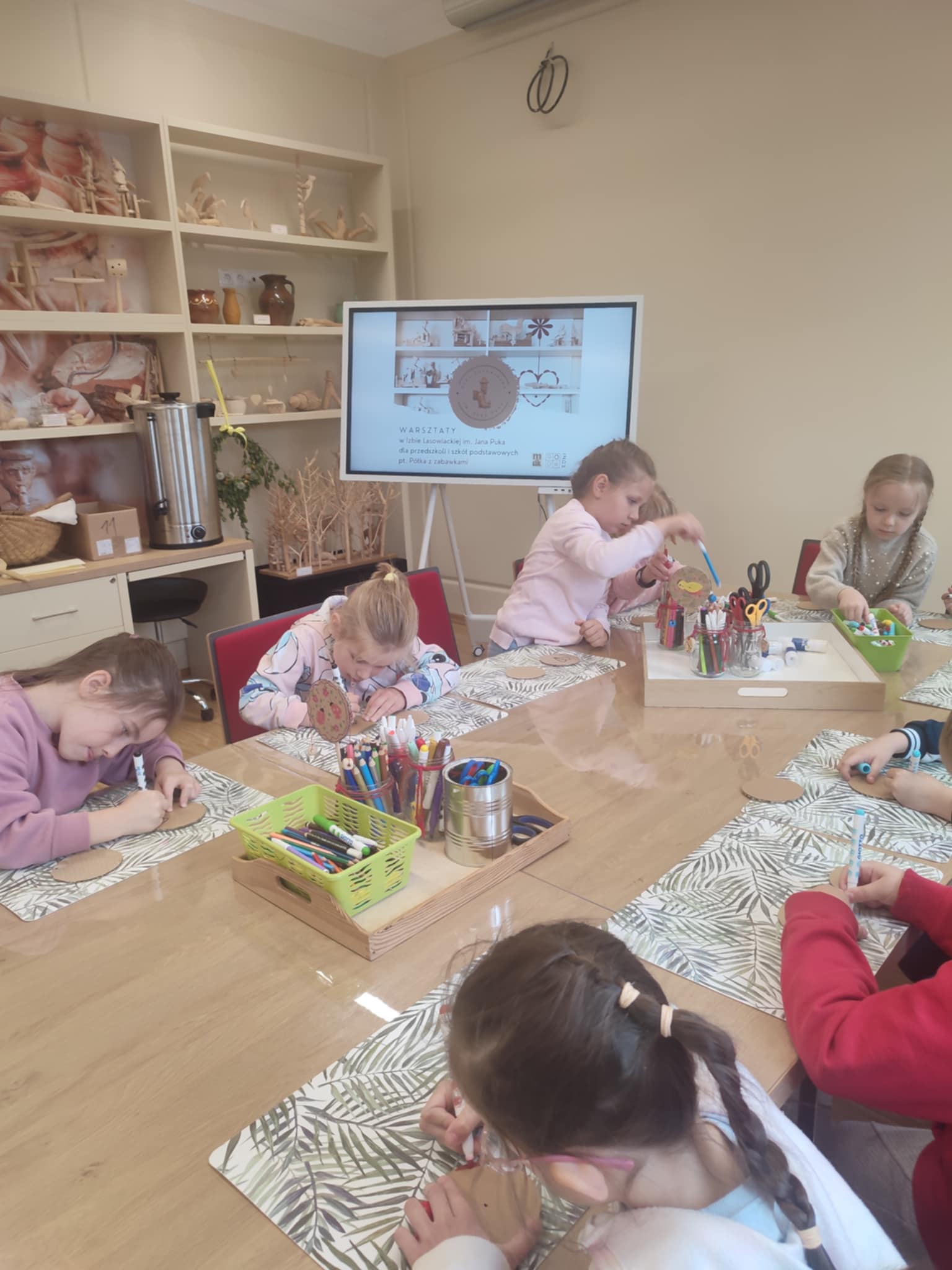15.05.2025 r. dzieci z grupy ,,Zajączki” wybrały się do Miejskiego Domu Kultury w Stalowej Woli na warsztaty pt. ,, Półka z zabawkami w Izbie Lasowiackiej im. Jana Puka”. Przedszkolaki zapoznały się z dawnymi lasowiackimi zwyczajami, przekonały się jak kiedyś wyglądało życie na wsi, jakich sprzętów gospodarczych używano i jakie prace wiejskie wykonywano. Panie prowadzące przybliżyły dzieciom postać pana Jana Puka - słynnego artysty ludowego tworzącego zabawki z drewna. Przedszkolaki obejrzały bajkę ,,O cudownym zielu”. Podczas warsztatów manualnych dzieci wykonały własną zabawkę z naturalnych materiałów, którą pokolorowały według własnego pomysłu rozwijając kreatywność i twórcze myślenie.