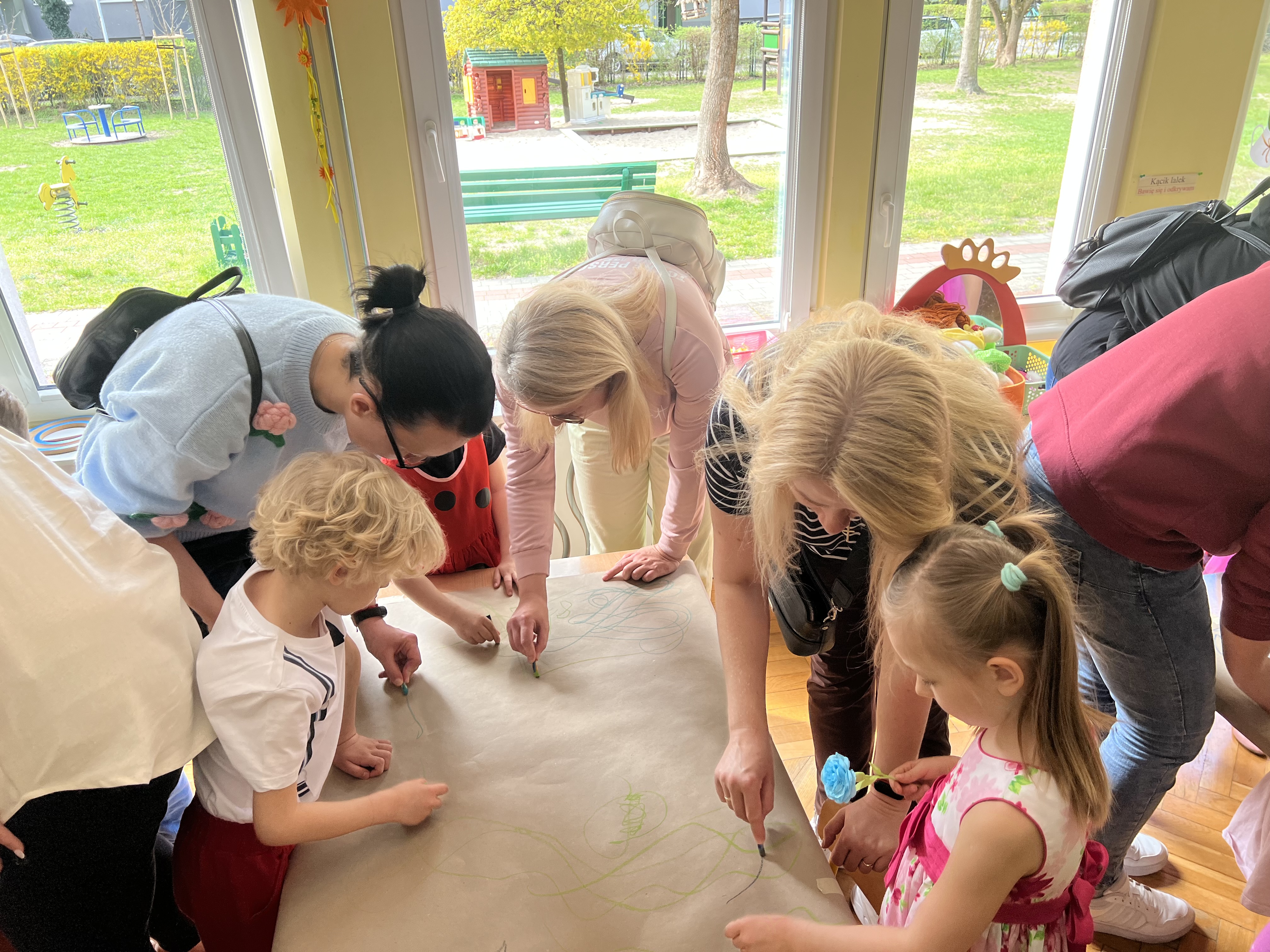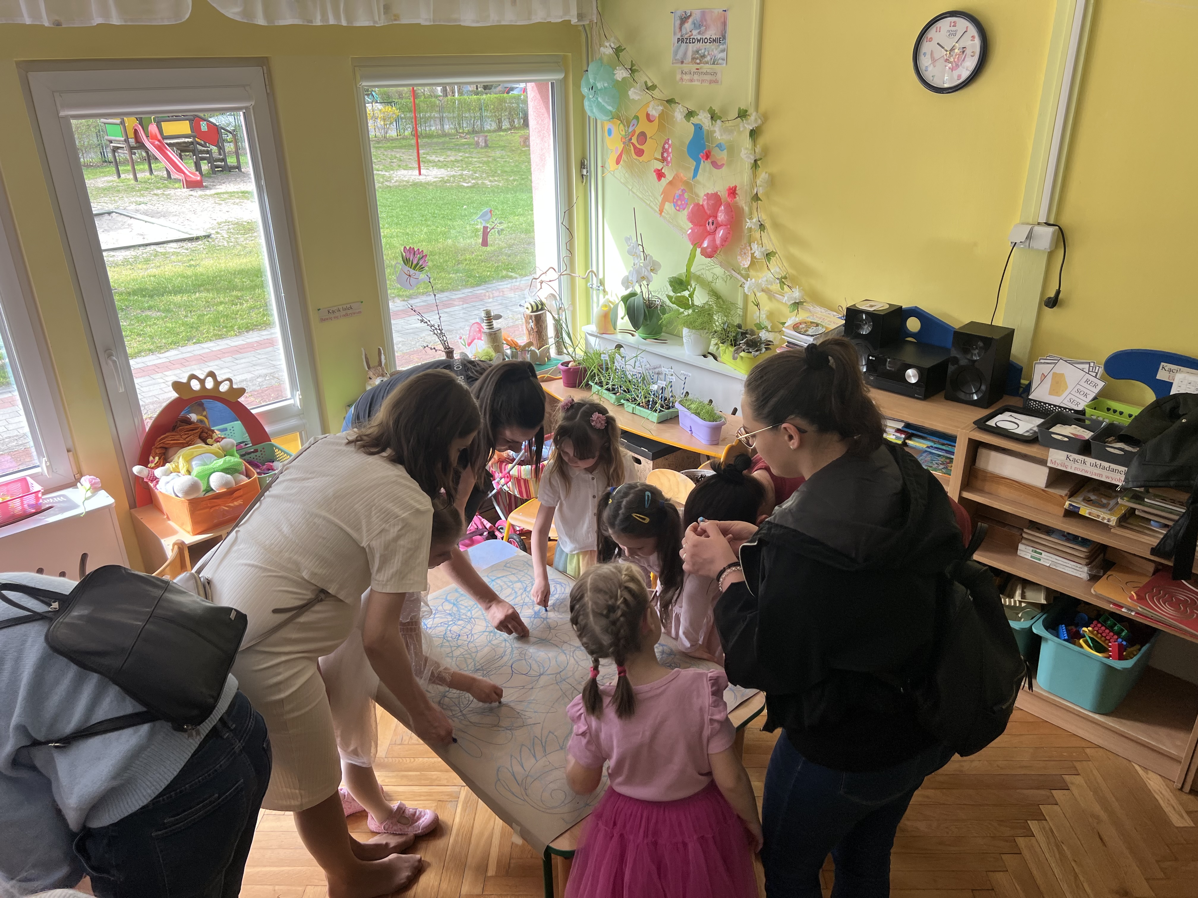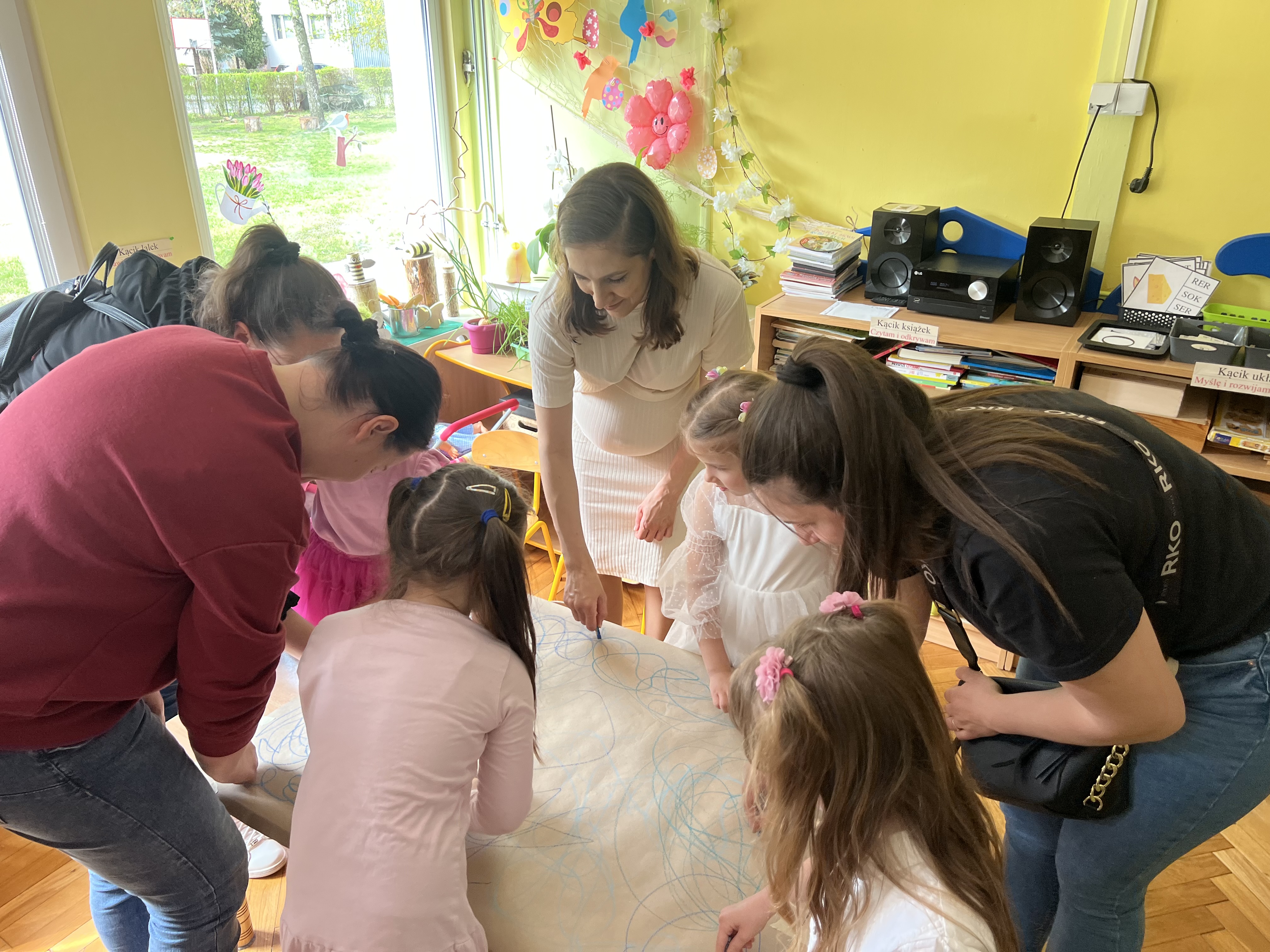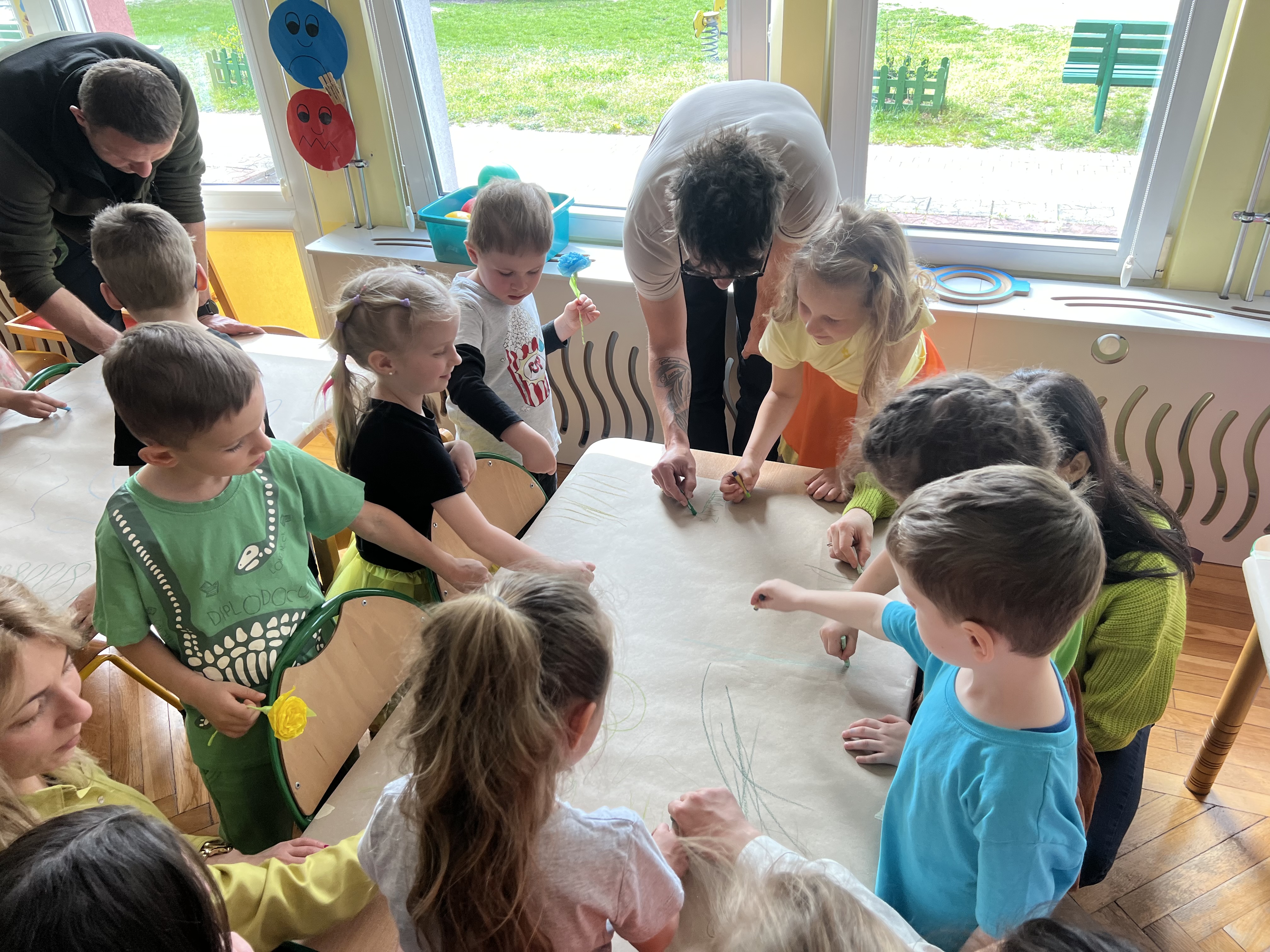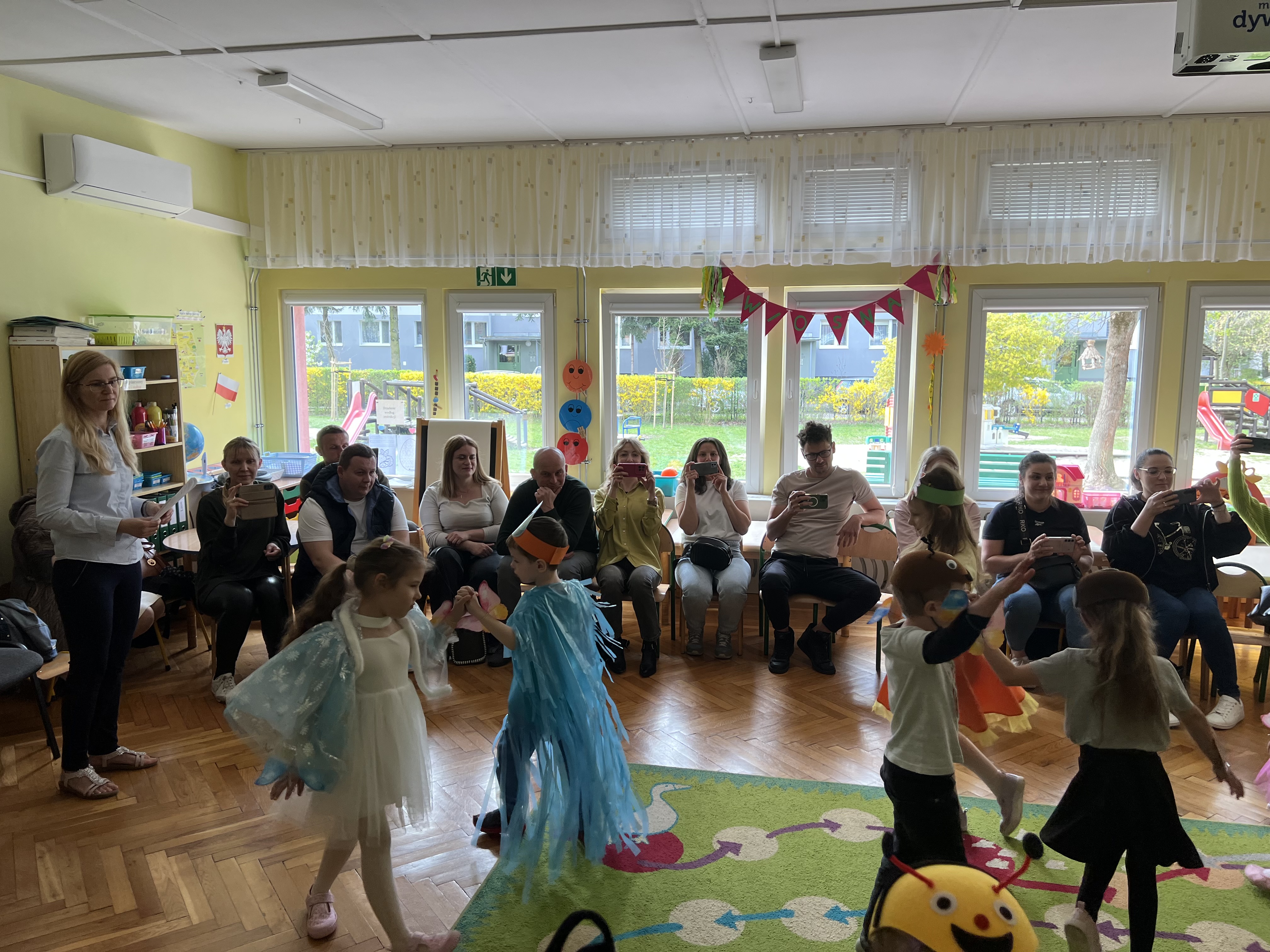 W kwietniu w grupie „Biedronki“ odbyły się warsztaty z Rodzicami. W tym dniu Rodzice mogli zobaczyć inscenizację wiosenną w wykonaniu swoich dzieci oraz razem z nimi wzięli udział w warsztatach pt. „Wiosenna łąką“ metoda Edukacji przez Ruch Doroty Dziamskiej. Wspólnie w rytm muzyki , wykonali wiosenną łąkę na dużych arkuszach papieru.