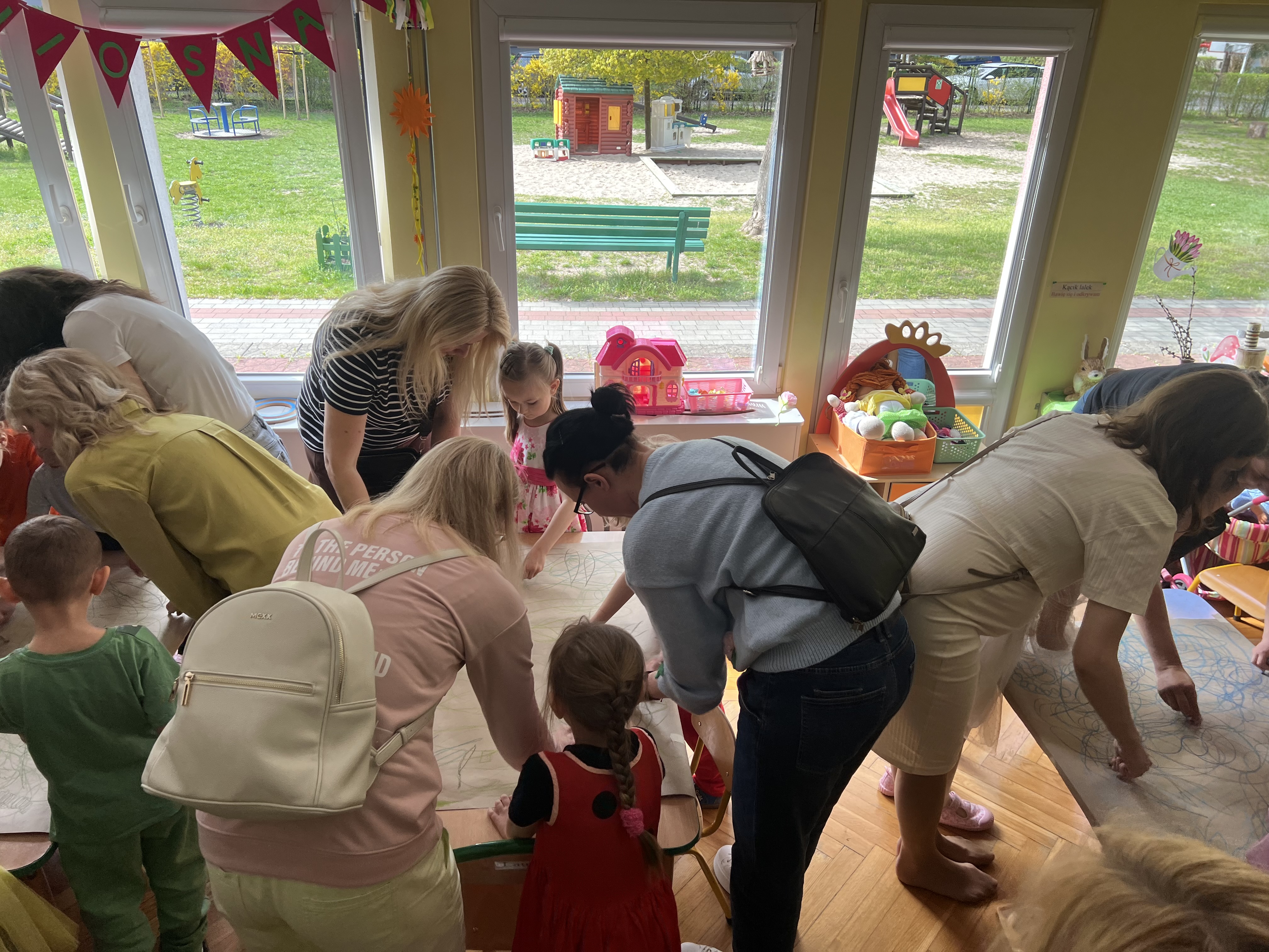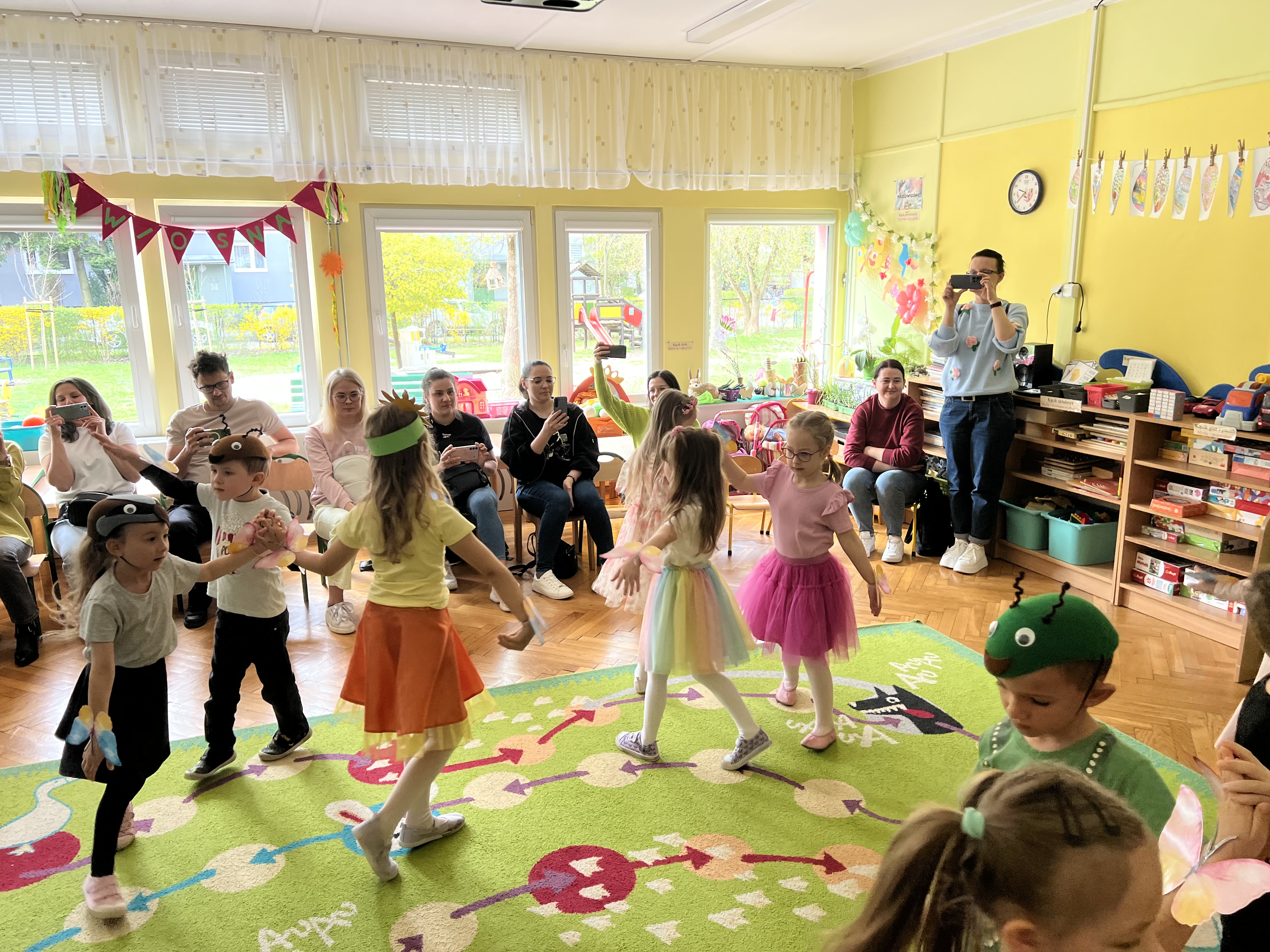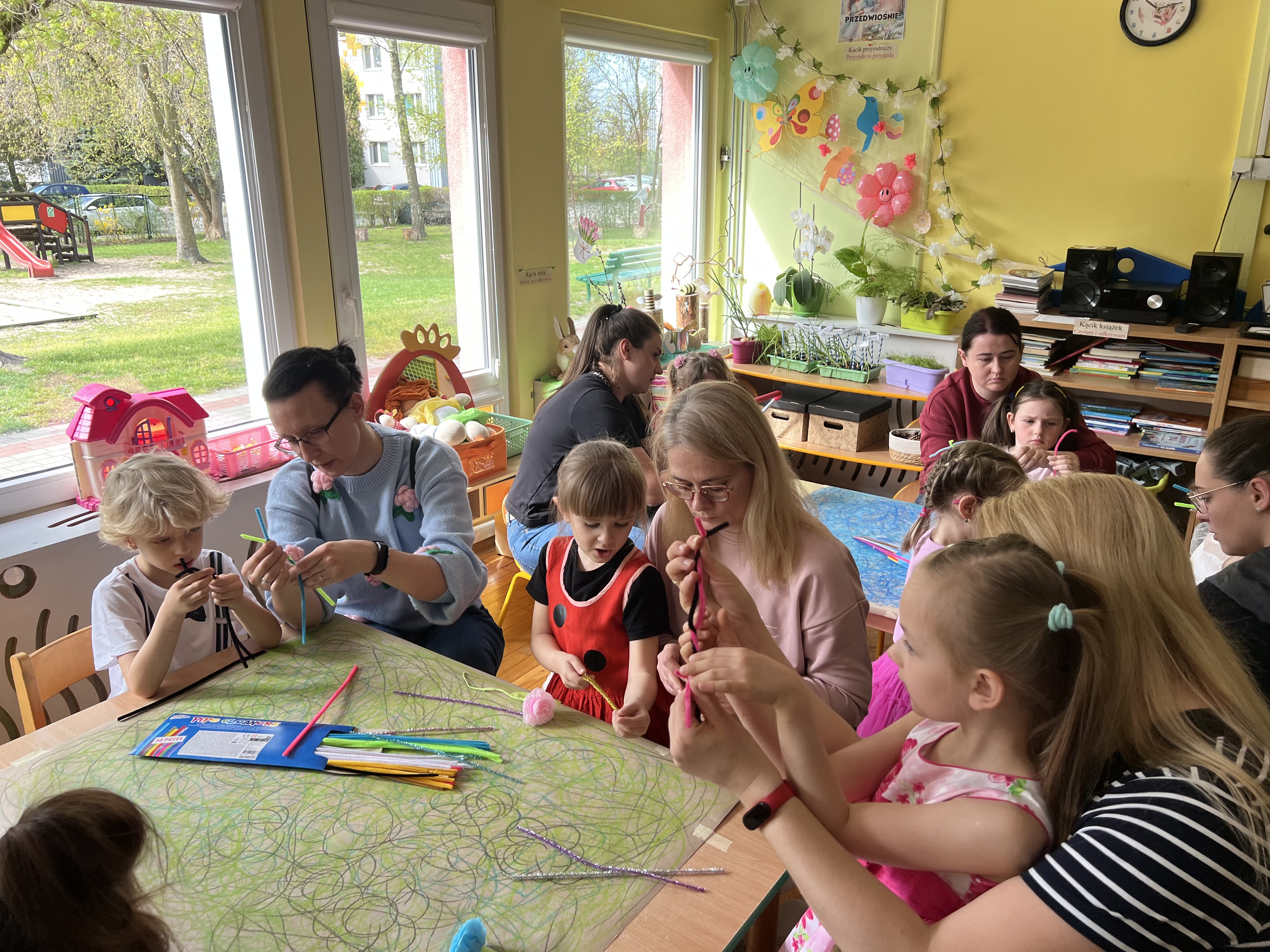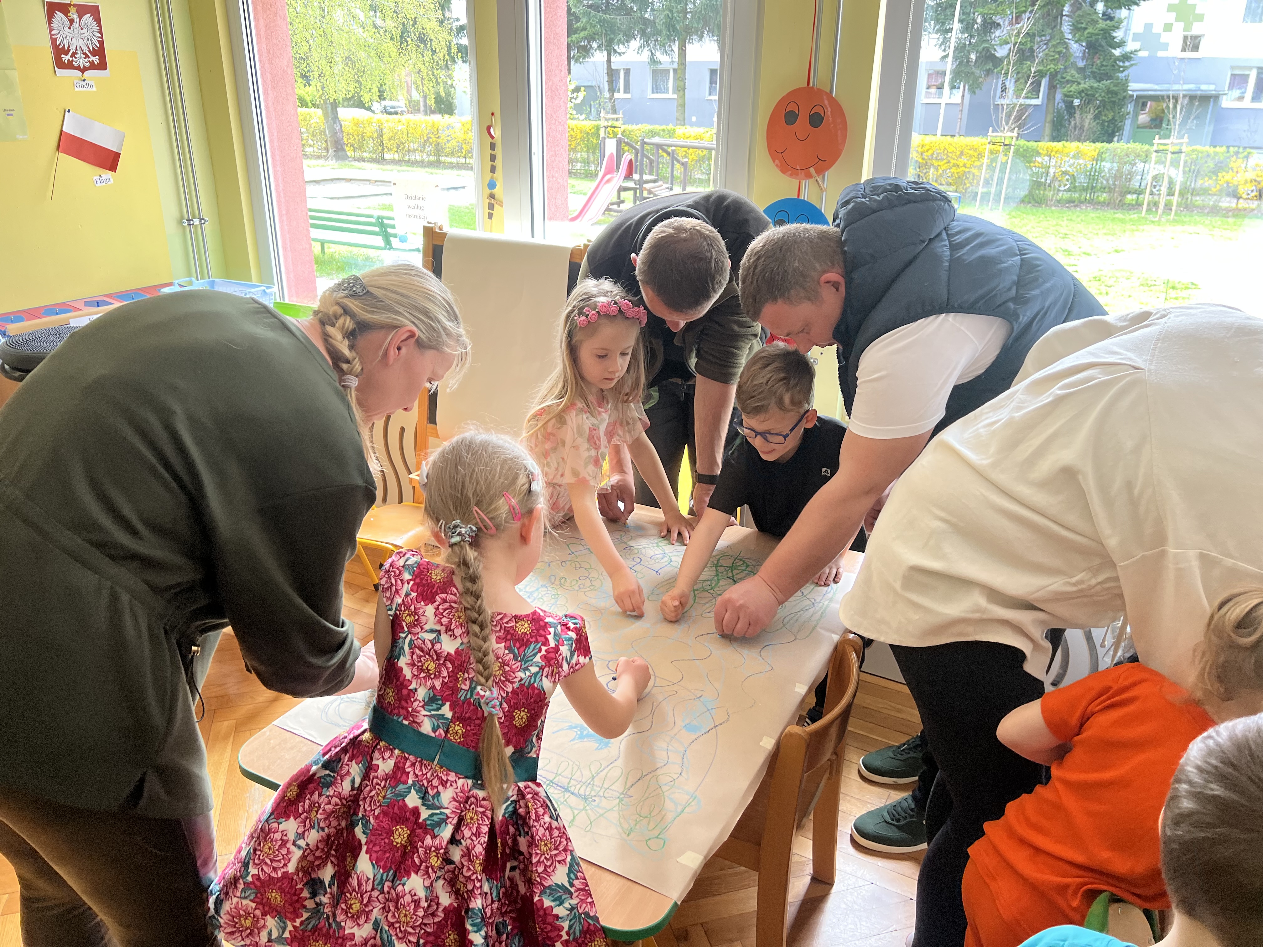 W kwietniu w grupie „Biedronki“ odbyły się warsztaty z Rodzicami. W tym dniu Rodzice mogli zobaczyć inscenizację wiosenną w wykonaniu swoich dzieci oraz razem z nimi wzięli udział w warsztatach pt. „Wiosenna łąką“ metoda Edukacji przez Ruch Doroty Dziamskiej. Wspólnie w rytm muzyki , wykonali wiosenną łąkę na dużych arkuszach papieru.