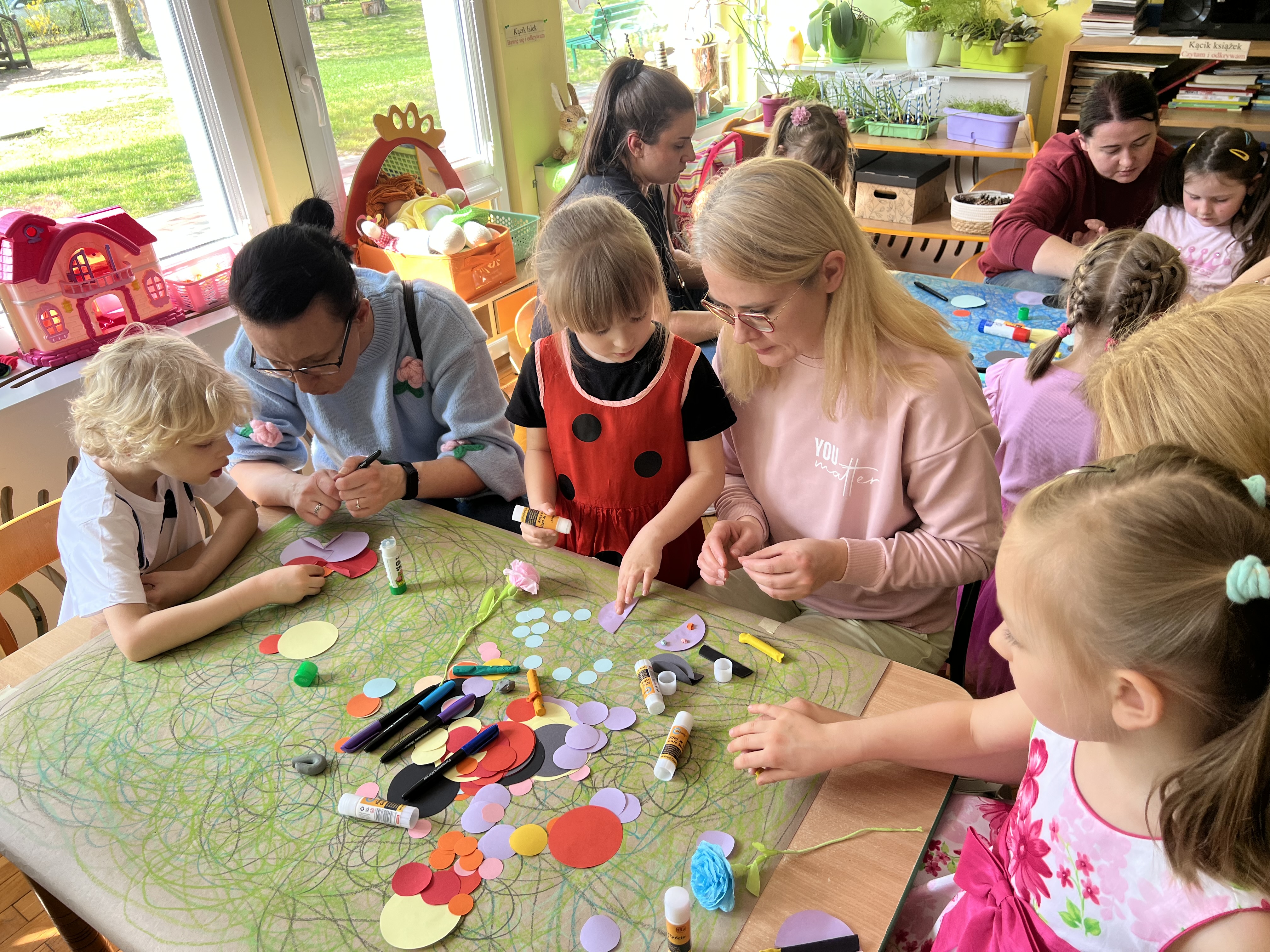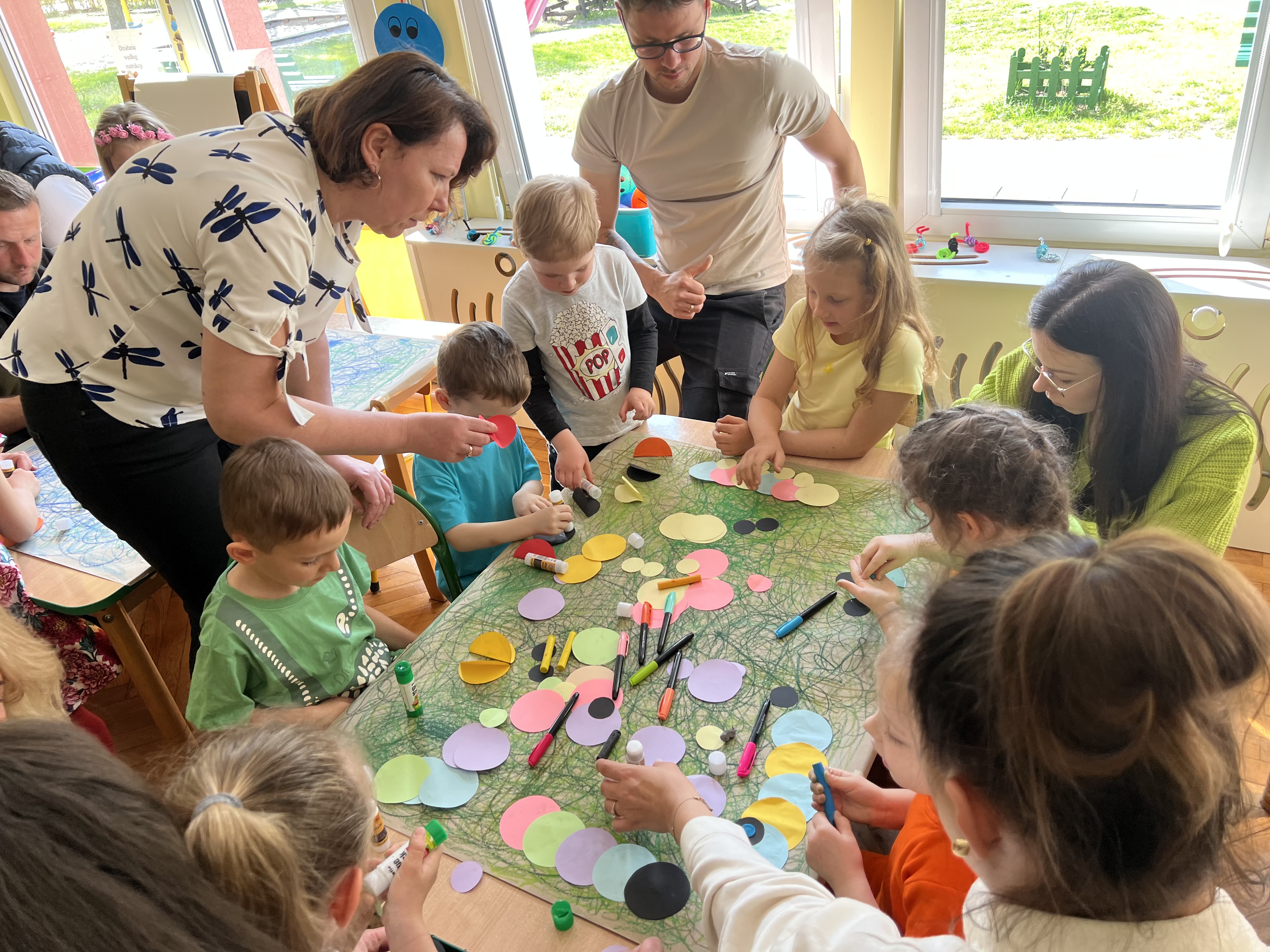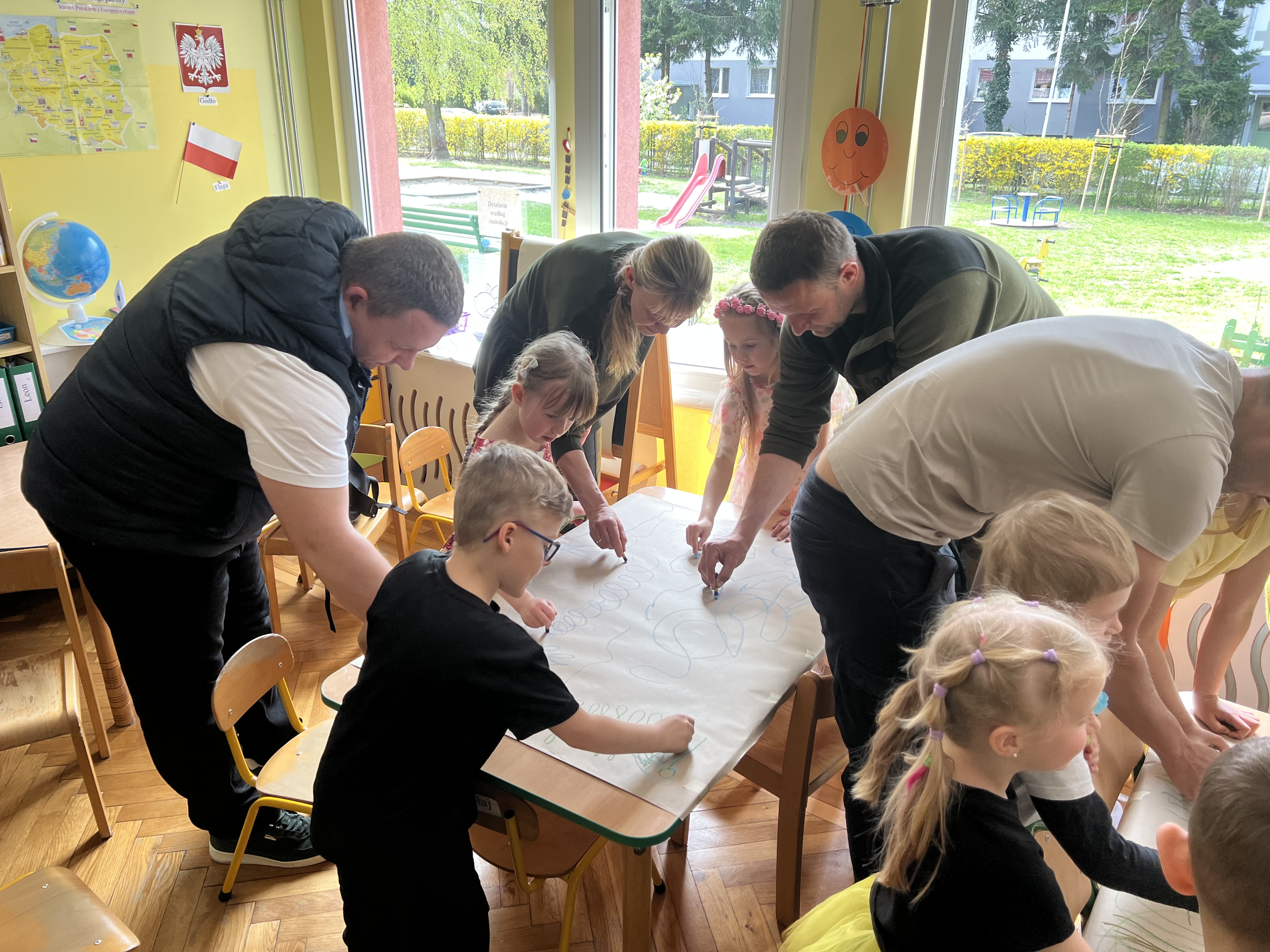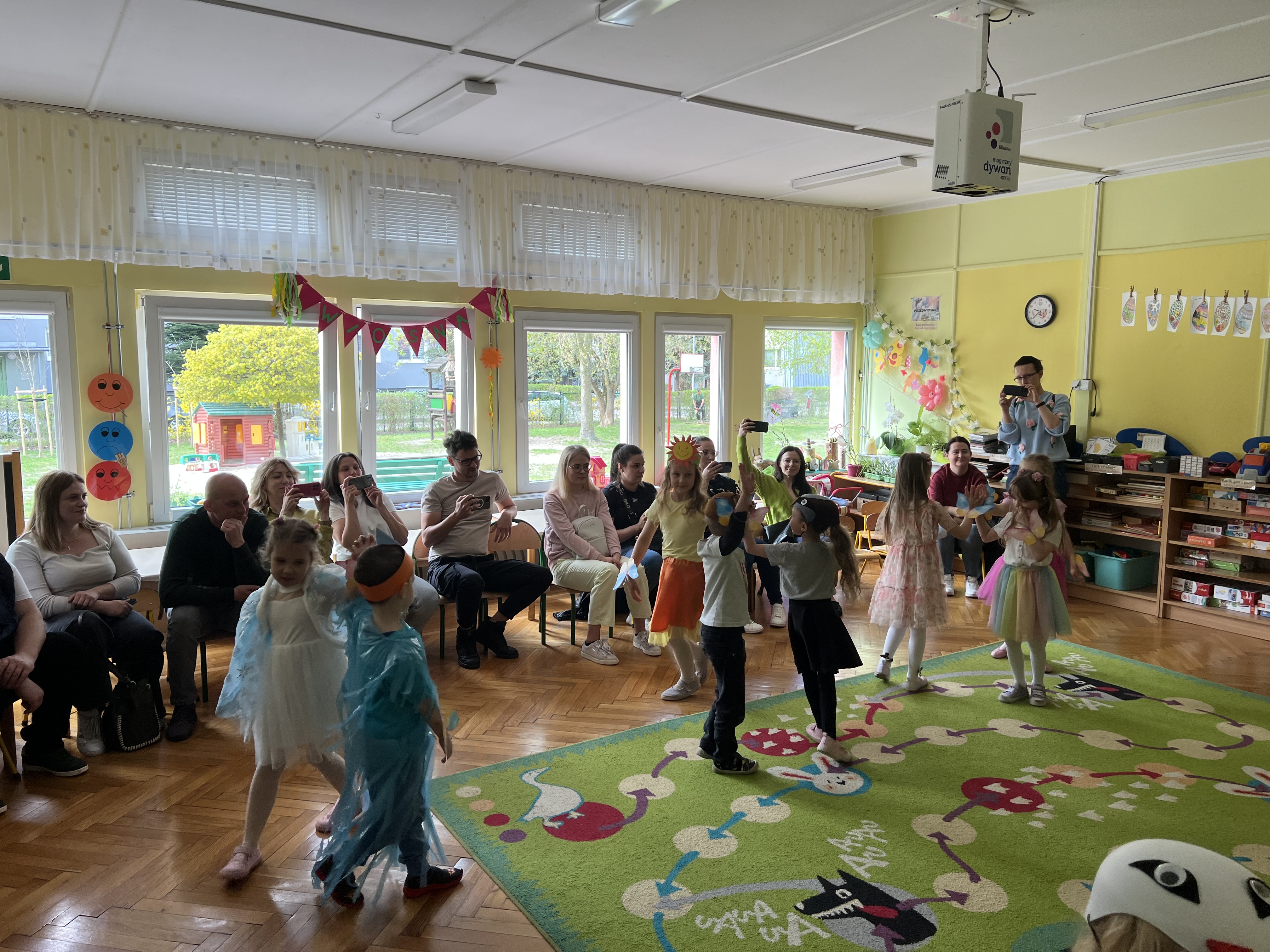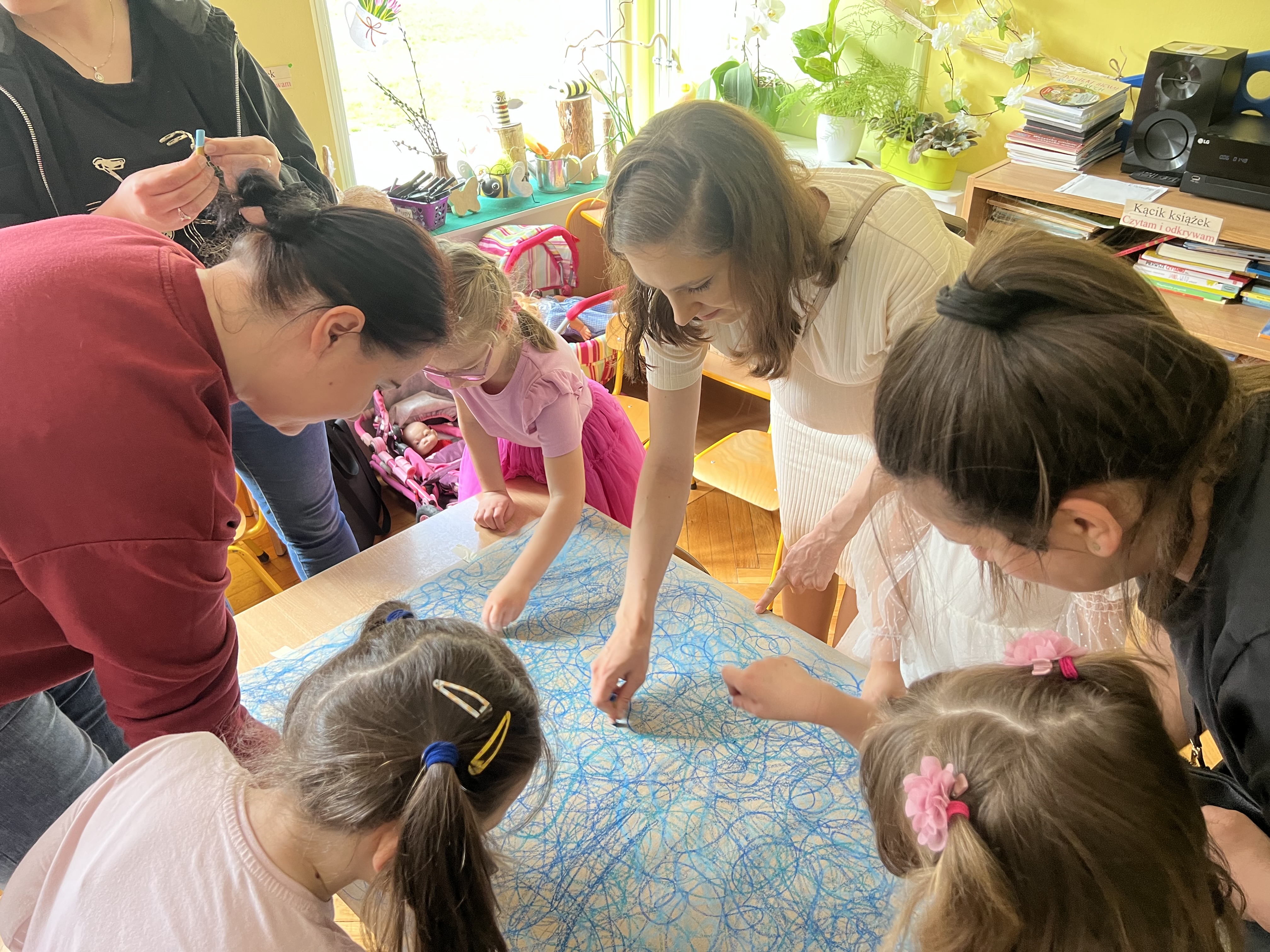 W kwietniu w grupie „Biedronki“ odbyły się warsztaty z Rodzicami. W tym dniu Rodzice mogli zobaczyć inscenizację wiosenną w wykonaniu swoich dzieci oraz razem z nimi wzięli udział w warsztatach pt. „Wiosenna łąką“ metoda Edukacji przez Ruch Doroty Dziamskiej. Wspólnie w rytm muzyki , wykonali wiosenną łąkę na dużych arkuszach papieru.