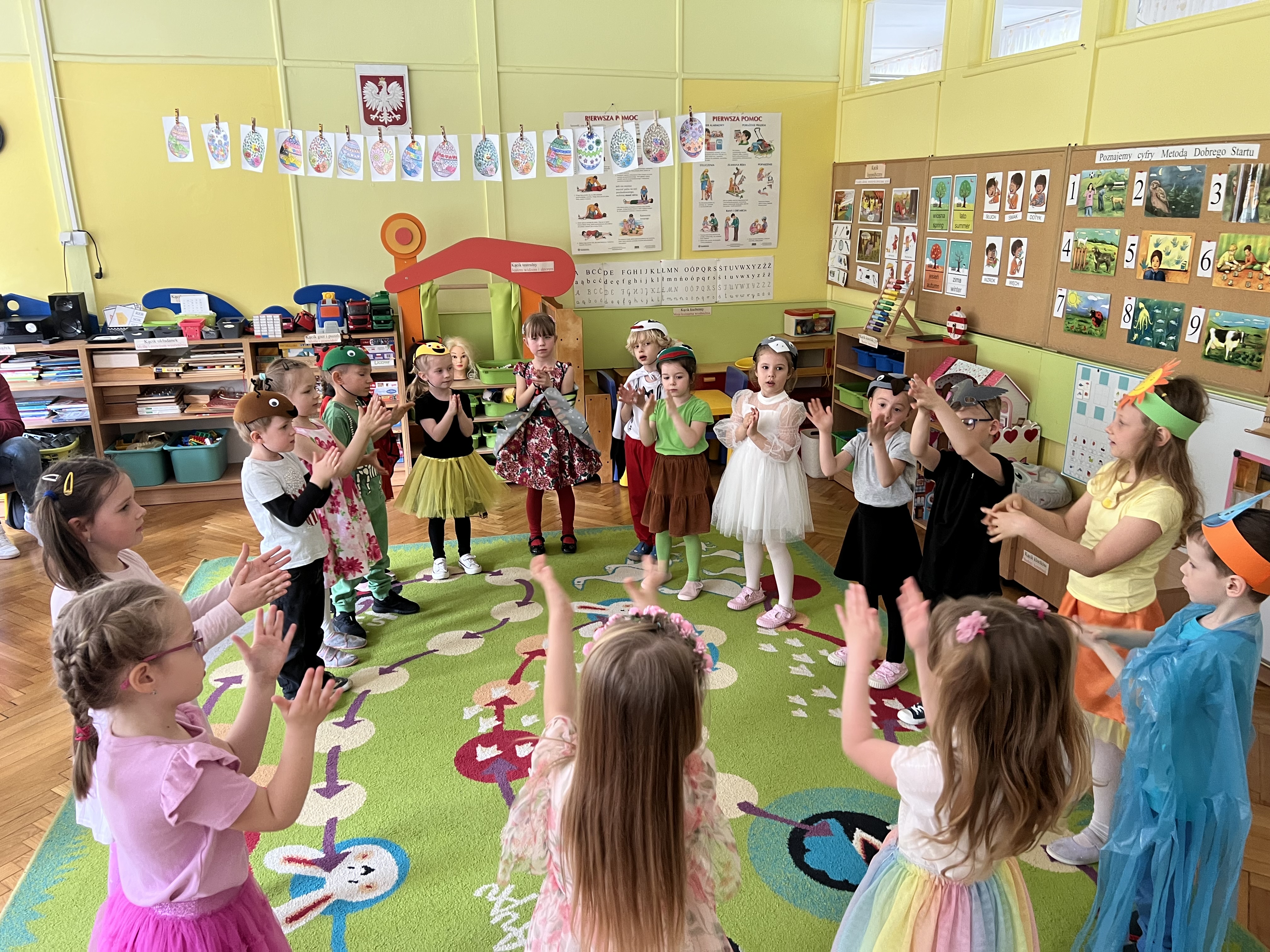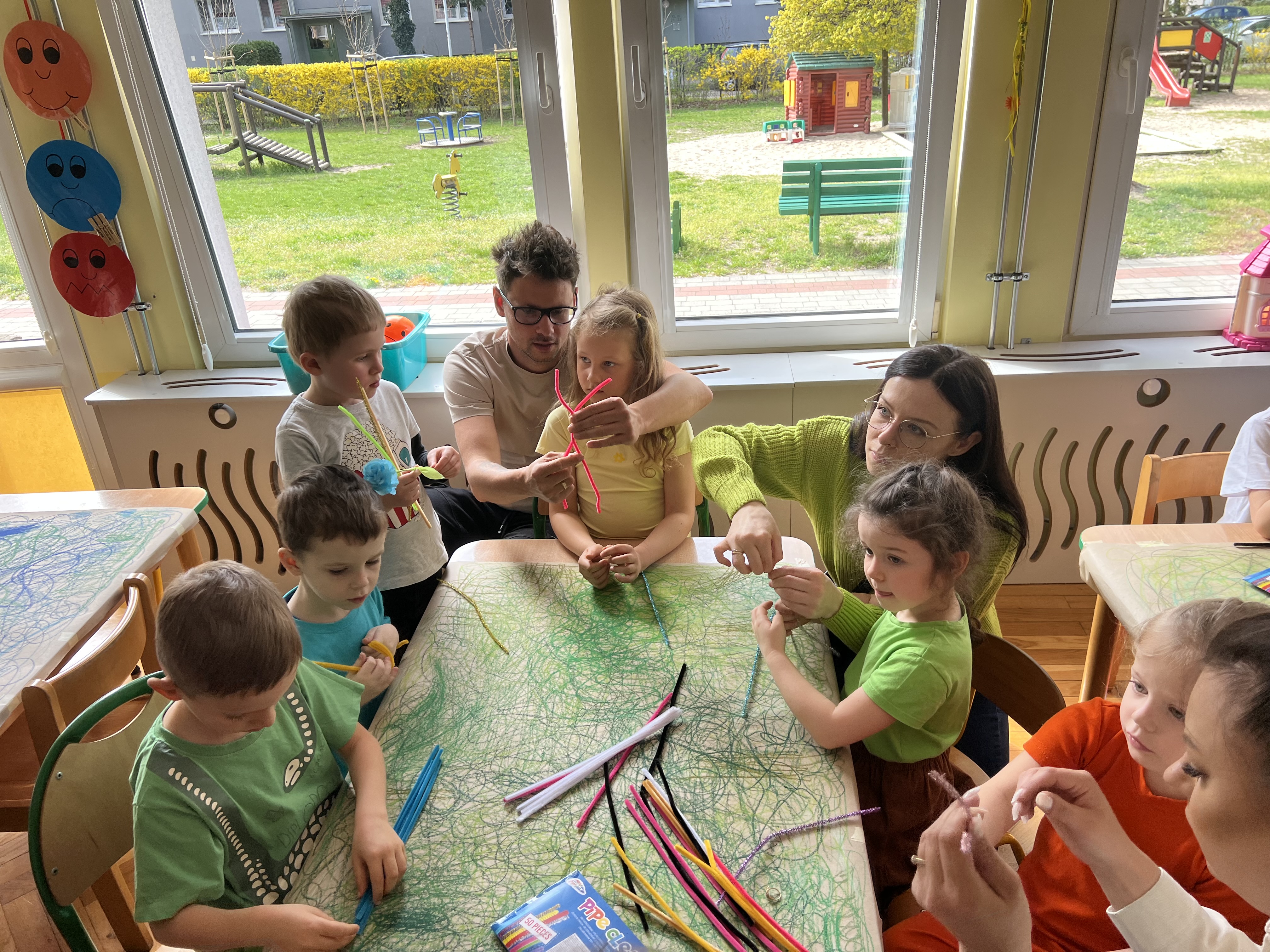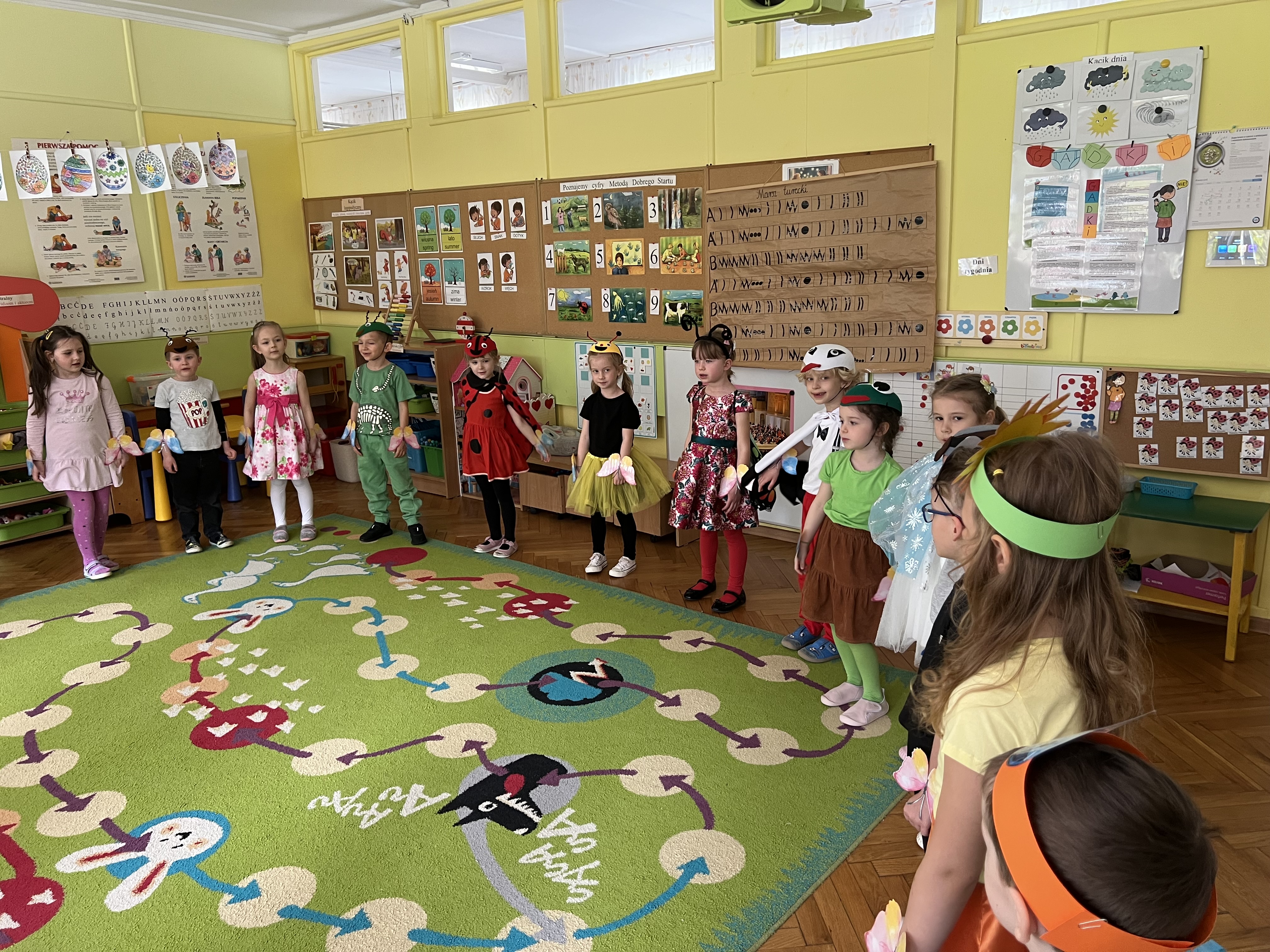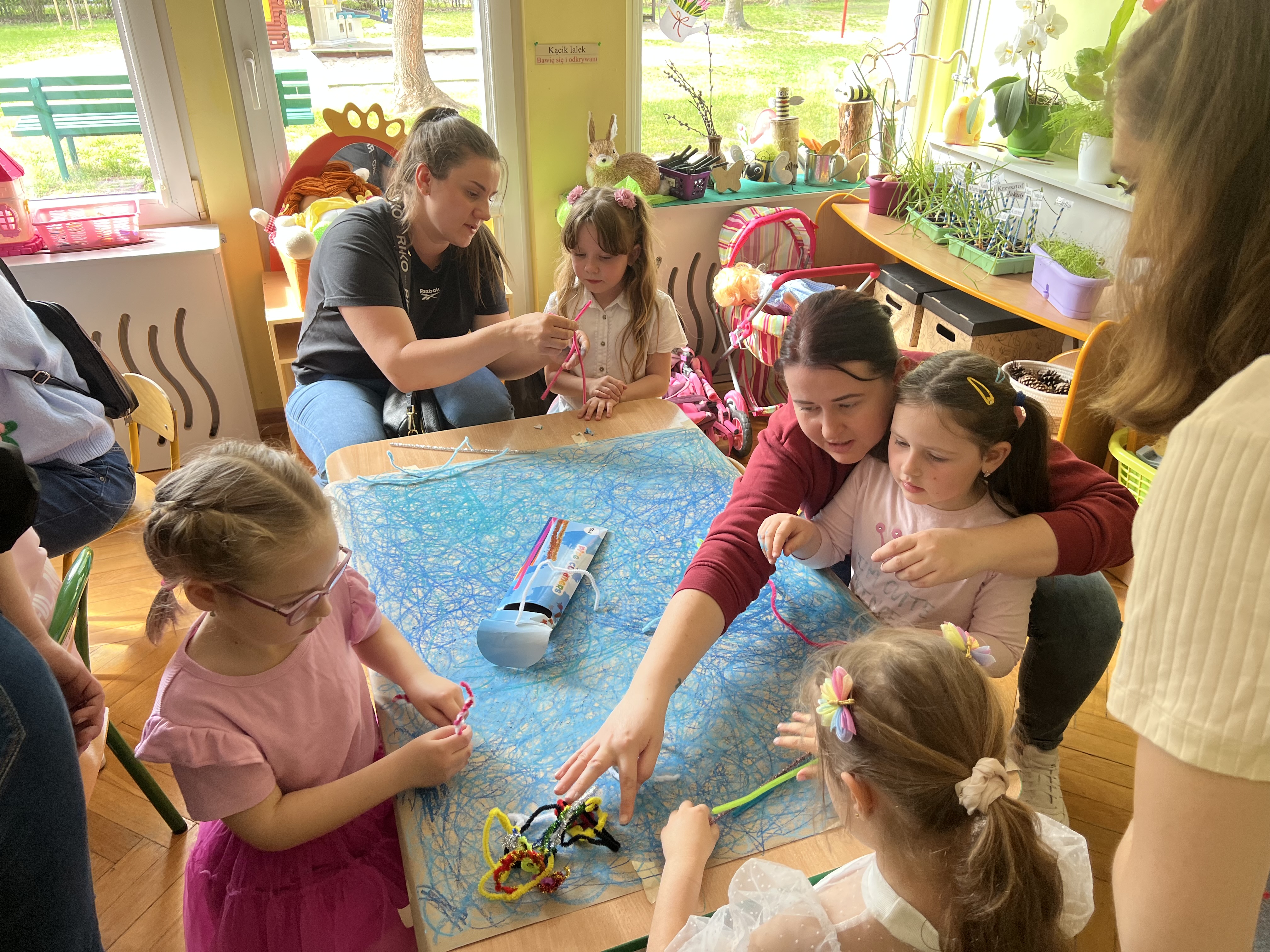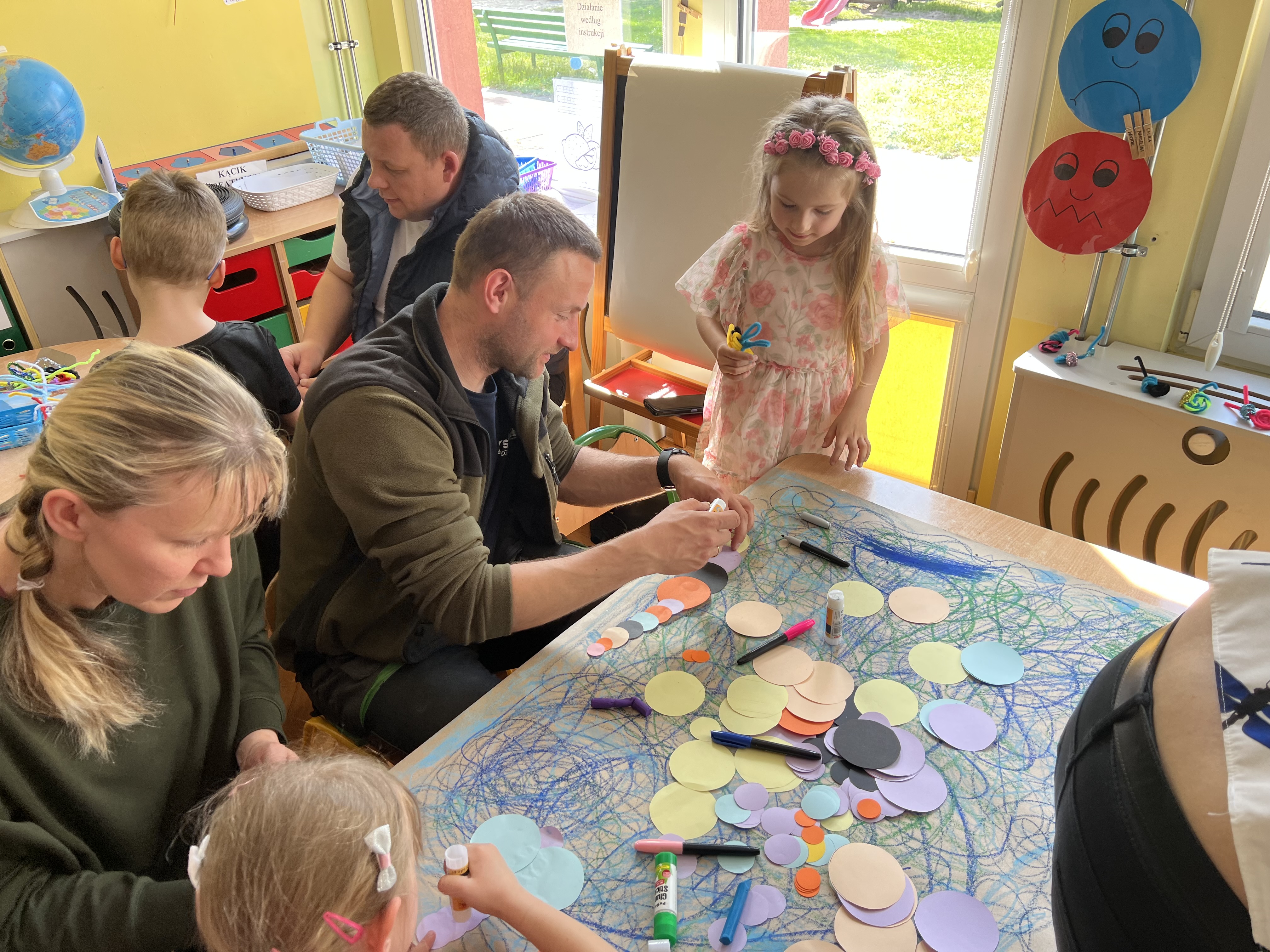 W kwietniu w grupie „Biedronki“ odbyły się warsztaty z Rodzicami. W tym dniu Rodzice mogli zobaczyć inscenizację wiosenną w wykonaniu swoich dzieci oraz razem z nimi wzięli udział w warsztatach pt. „Wiosenna łąką“ metoda Edukacji przez Ruch Doroty Dziamskiej. Wspólnie w rytm muzyki , wykonali wiosenną łąkę na dużych arkuszach papieru.