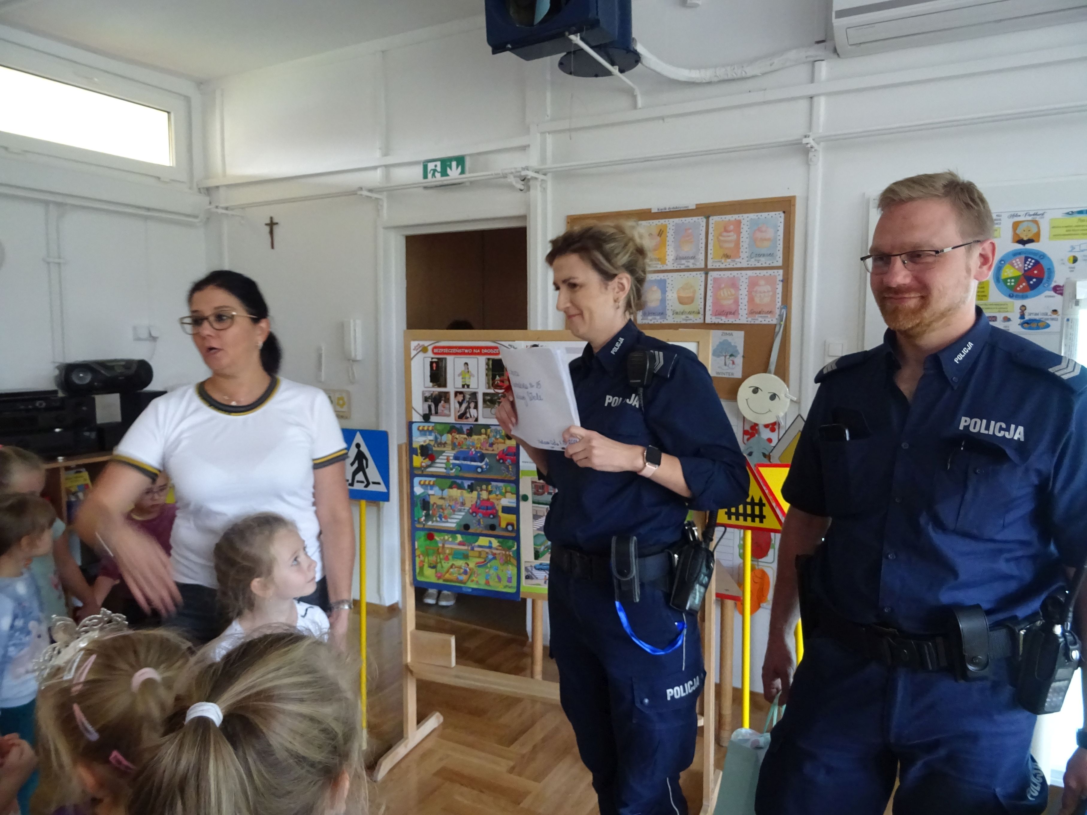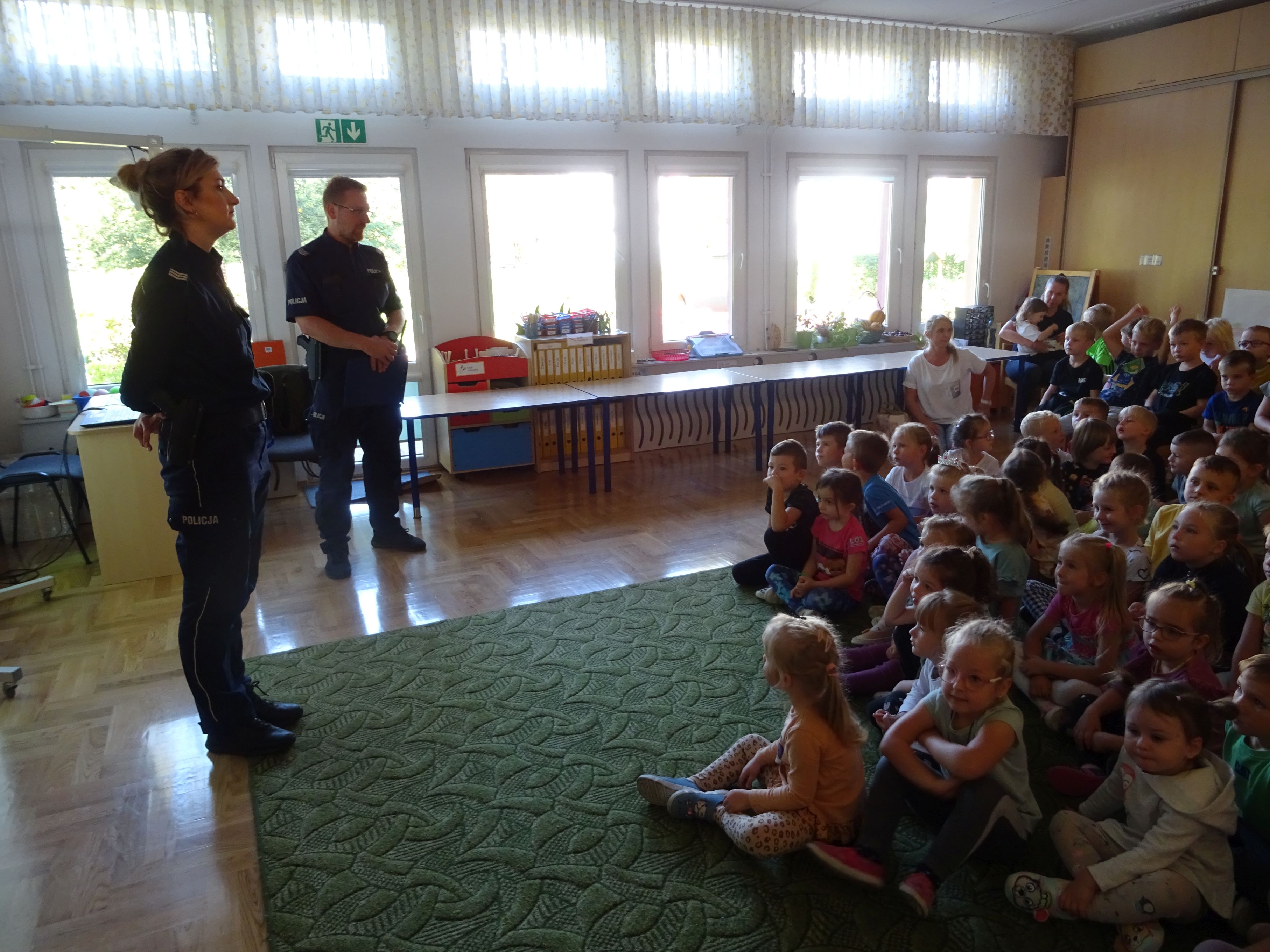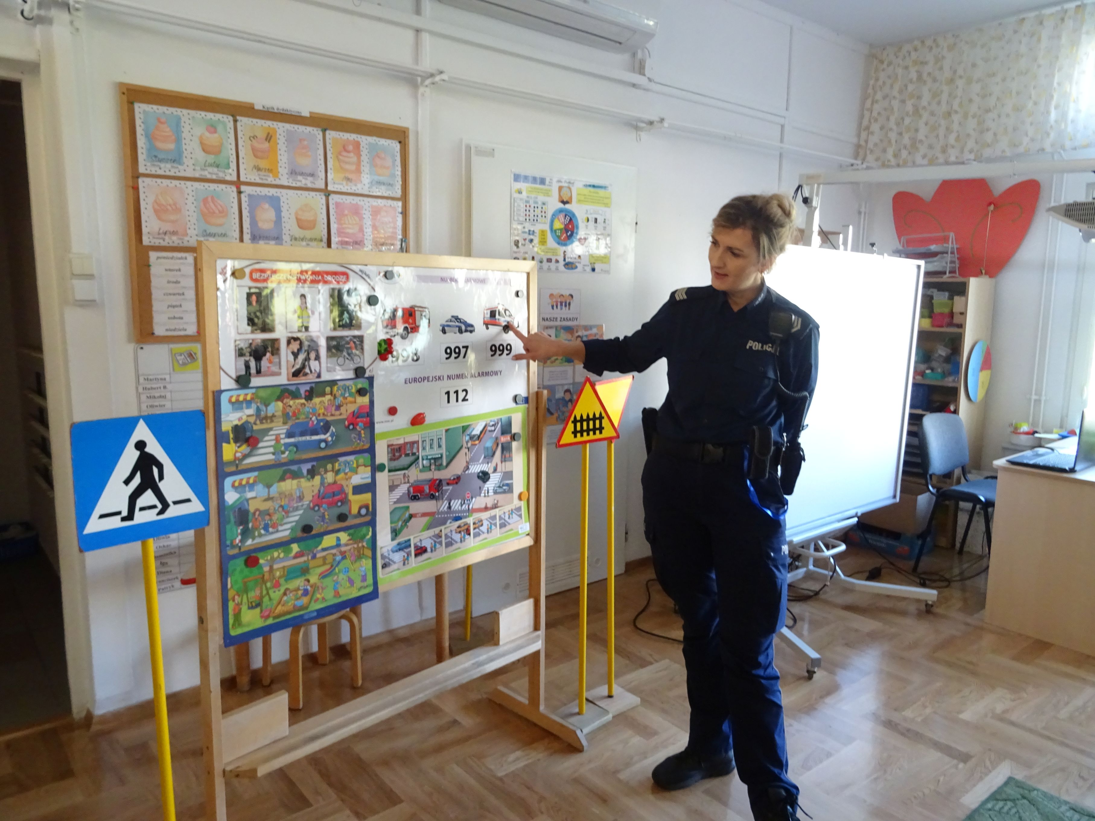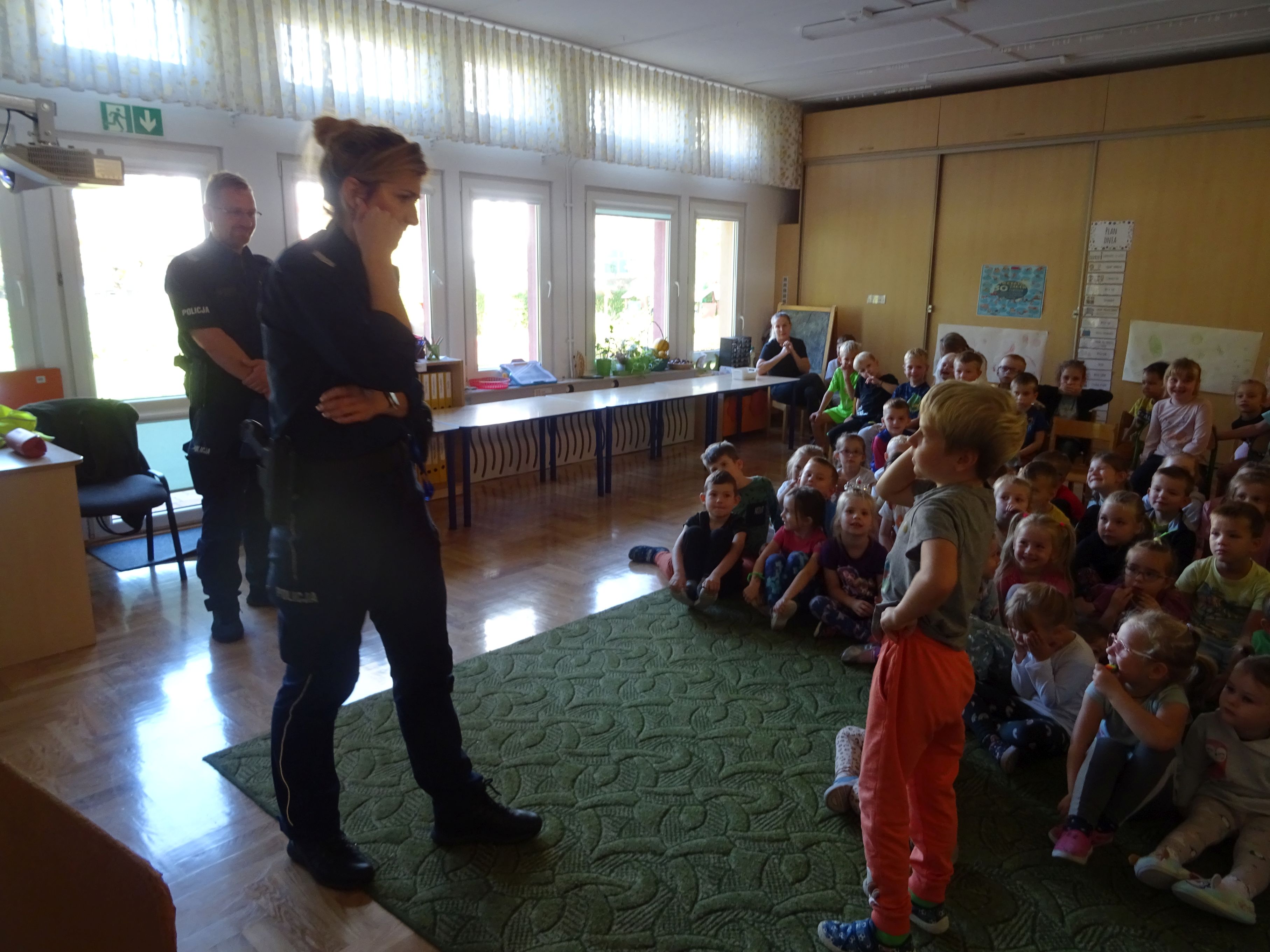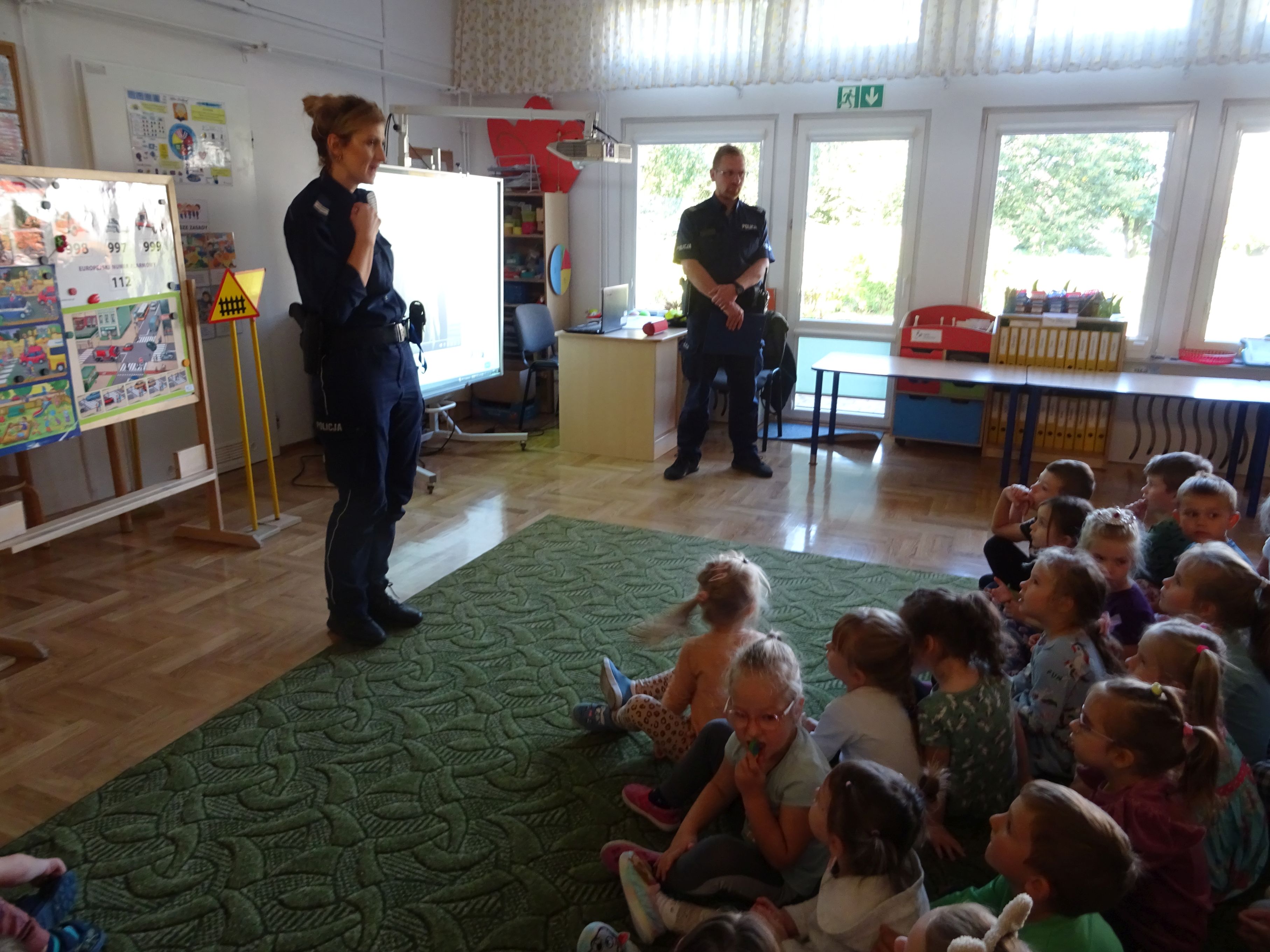 Podczas spotkania mundurowi przypomnieli o numerach alarmowych, z których należy korzystać w sytuacji zagrożenia. Dzieci dowiedziały się, jak trzeba postępować w kontakcie z osobami obcymi oraz ćwiczyły właściwe przechodzenie przez jezdnię. Policjanci wyjaśnili tez przedszkolakom, jak należy podróżować samochodem i jaką rolę pełnią pasy bezpieczeństwa, foteliki oraz jak ważne są elementy odblaskowe dla pieszego. Tematem spotkania, równie ważnym jak bezpieczeństwo, było dla przedszkolaków poznanie tajników służby policjanta. Każde dziecko chciało obejrzeć z bliska kajdanki, lizak policyjny. Było to bardzo udane spotkanie. Na zakończenie wszyscy uczestnicy spotkania wykonali z policjantami pamiątkowe zdjęcie i wręczyli gościom przygotowane wcześniej laurki.
