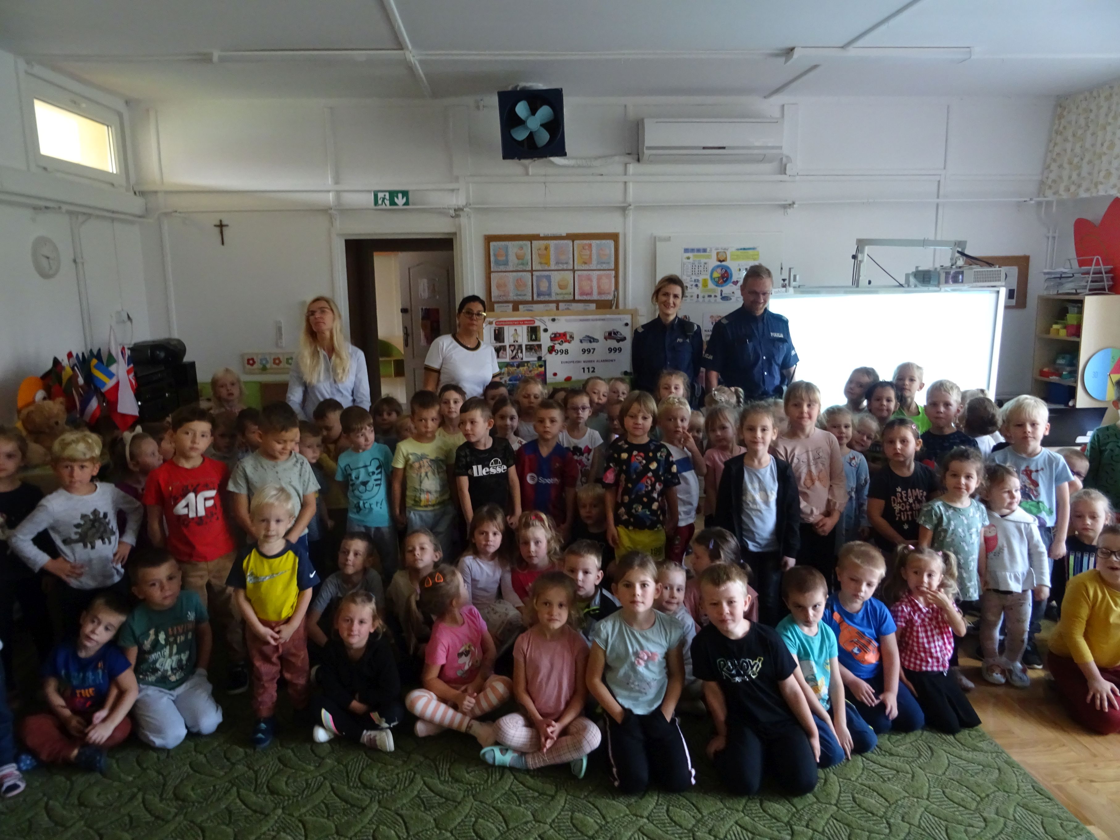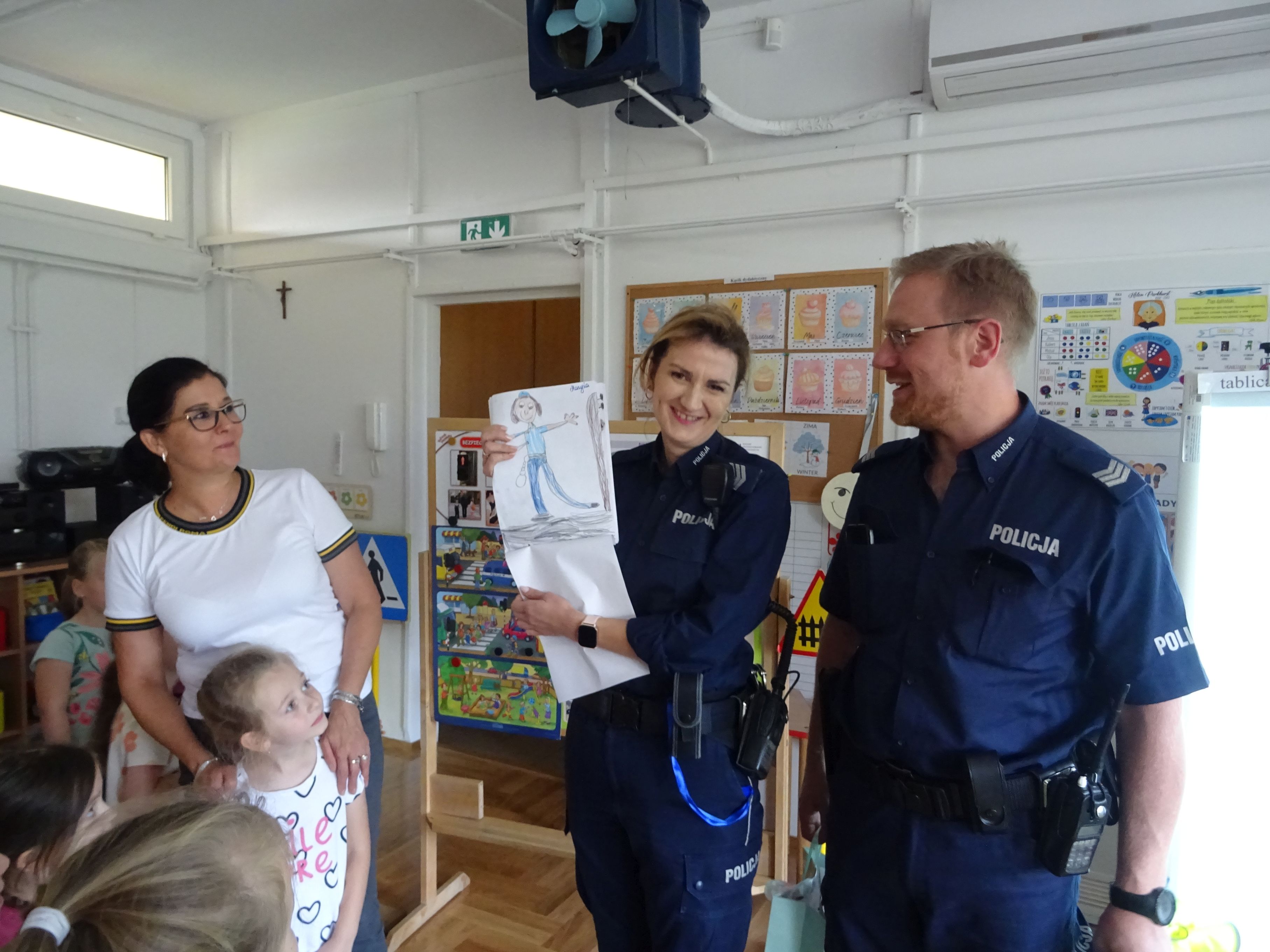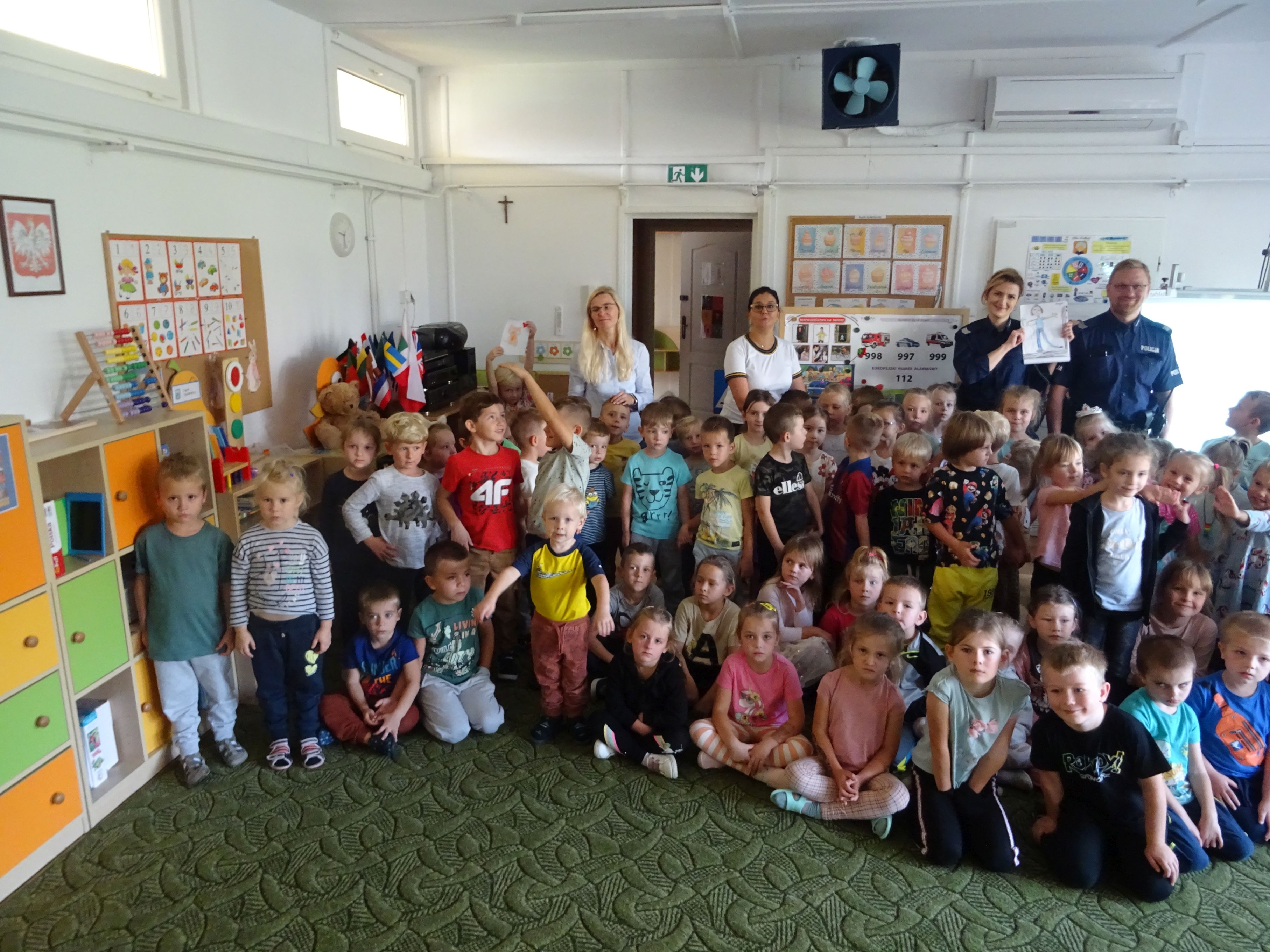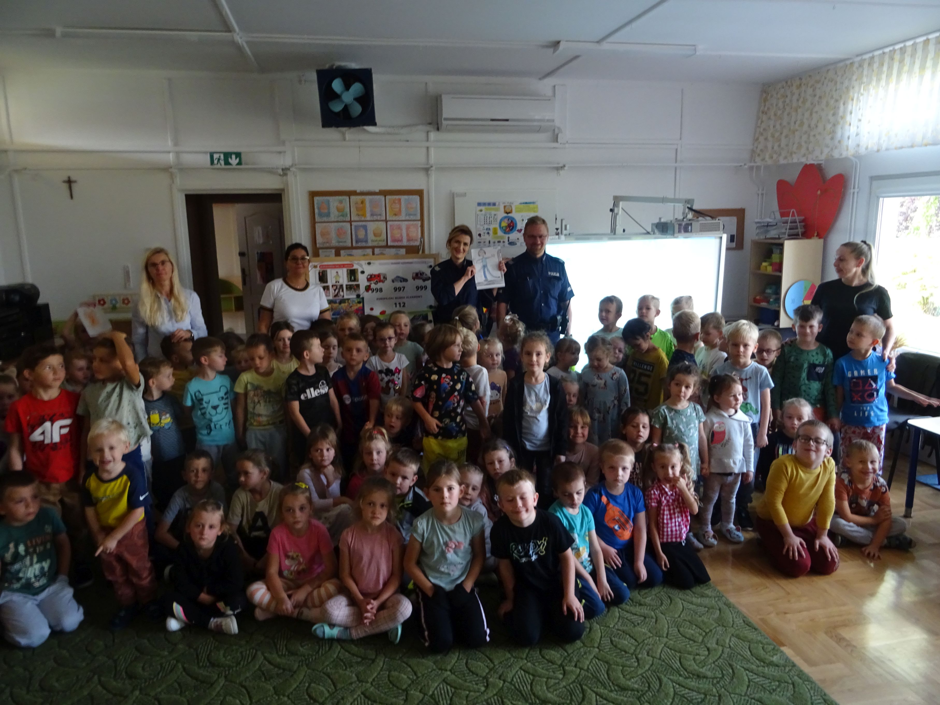 Podczas spotkania mundurowi przypomnieli o numerach alarmowych, z których należy korzystać w sytuacji zagrożenia. Dzieci dowiedziały się, jak trzeba postępować w kontakcie z osobami obcymi oraz ćwiczyły właściwe przechodzenie przez jezdnię. Policjanci wyjaśnili tez przedszkolakom, jak należy podróżować samochodem i jaką rolę pełnią pasy bezpieczeństwa, foteliki oraz jak ważne są elementy odblaskowe dla pieszego. Tematem spotkania, równie ważnym jak bezpieczeństwo, było dla przedszkolaków poznanie tajników służby policjanta. Każde dziecko chciało obejrzeć z bliska kajdanki, lizak policyjny. Było to bardzo udane spotkanie. Na zakończenie wszyscy uczestnicy spotkania wykonali z policjantami pamiątkowe zdjęcie i wręczyli gościom przygotowane wcześniej laurki.