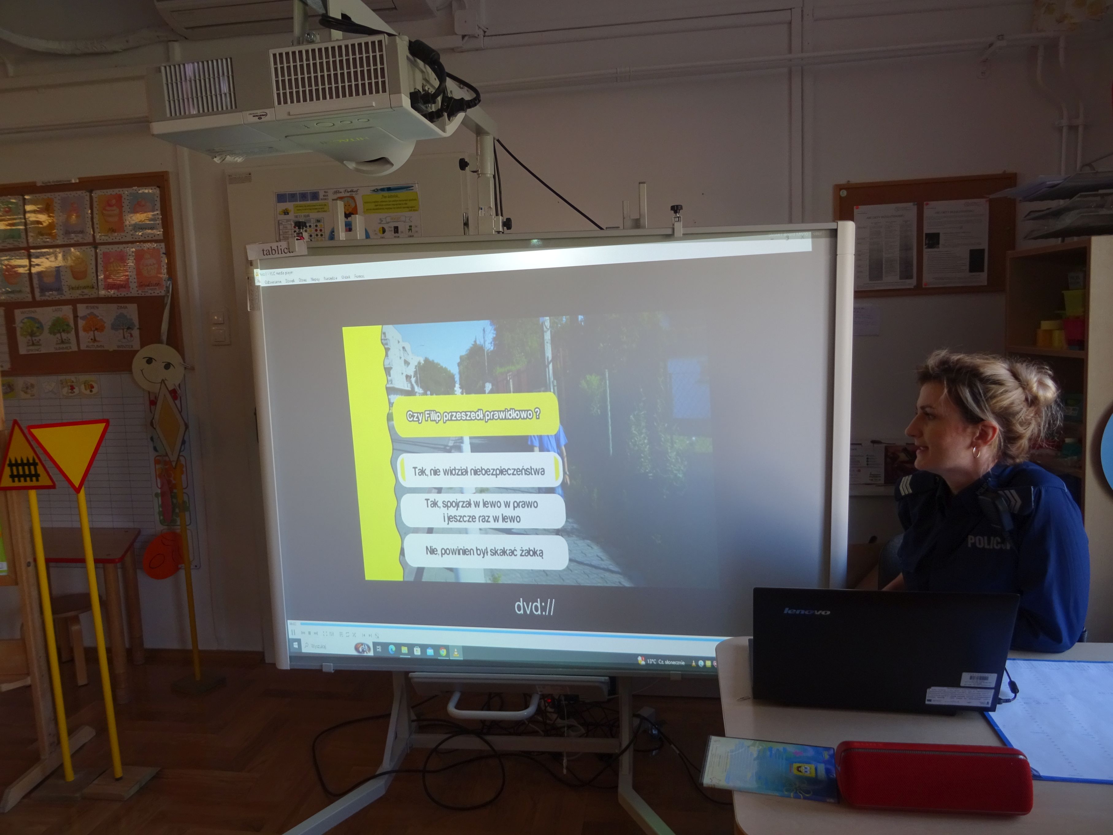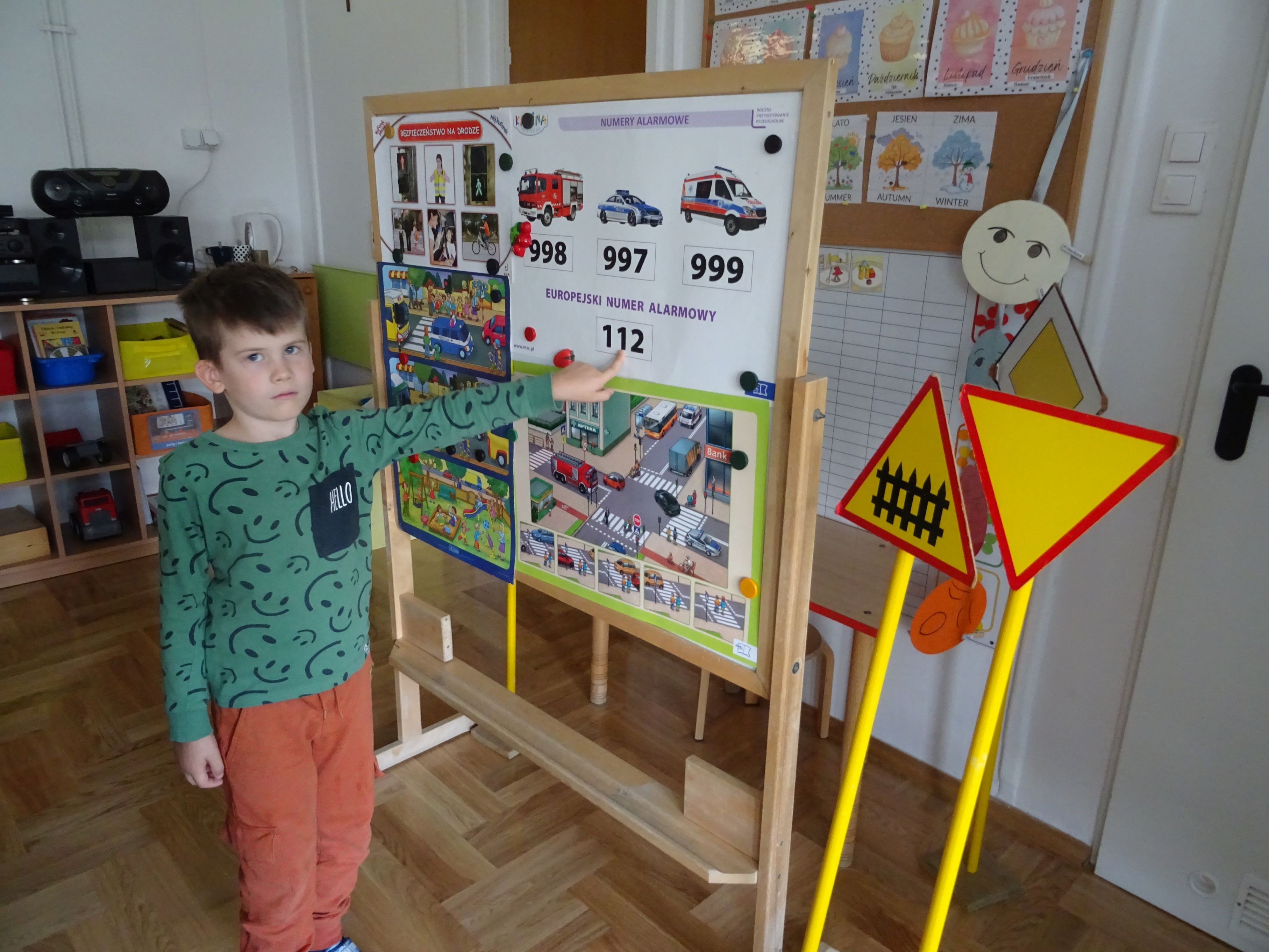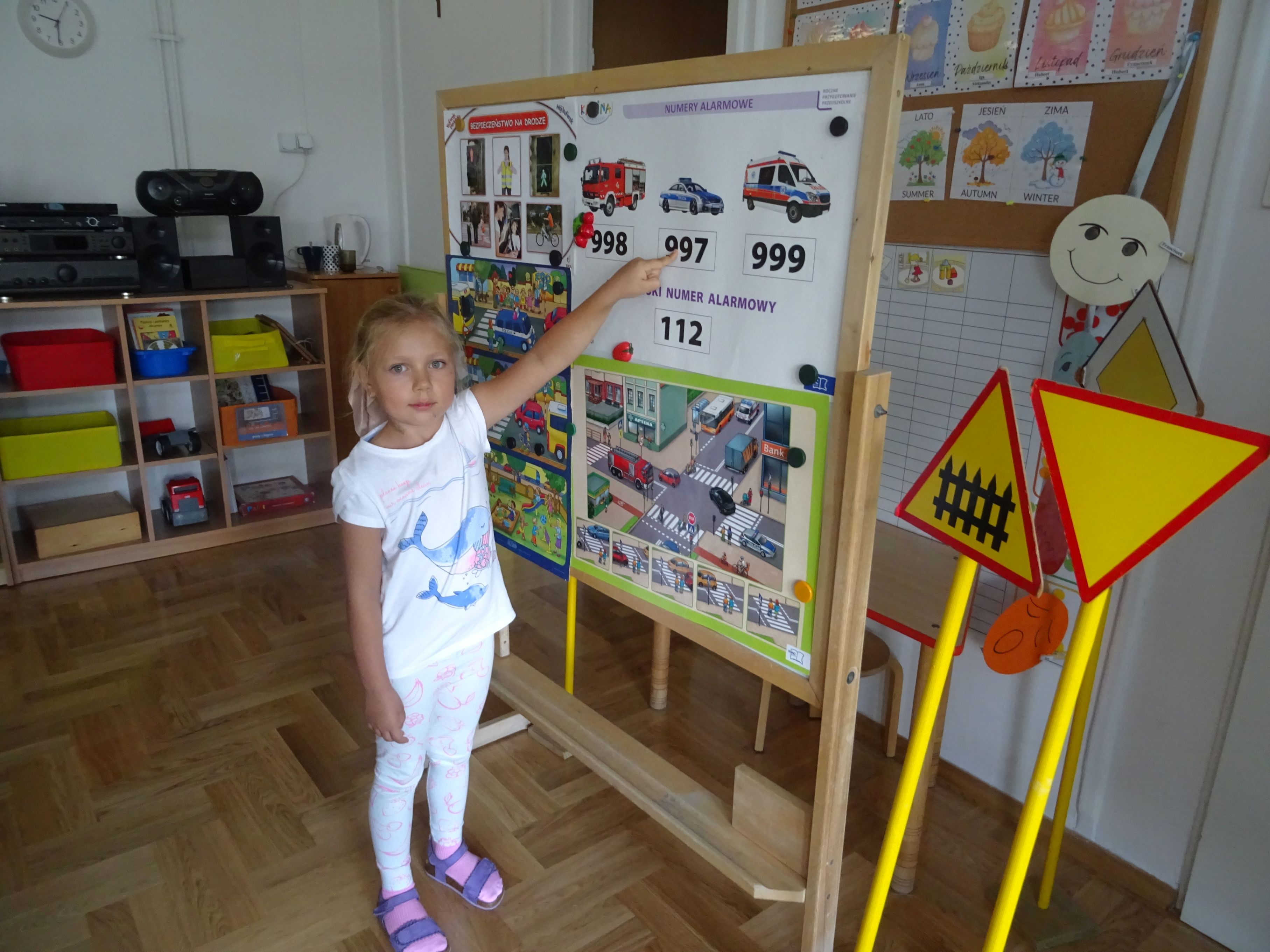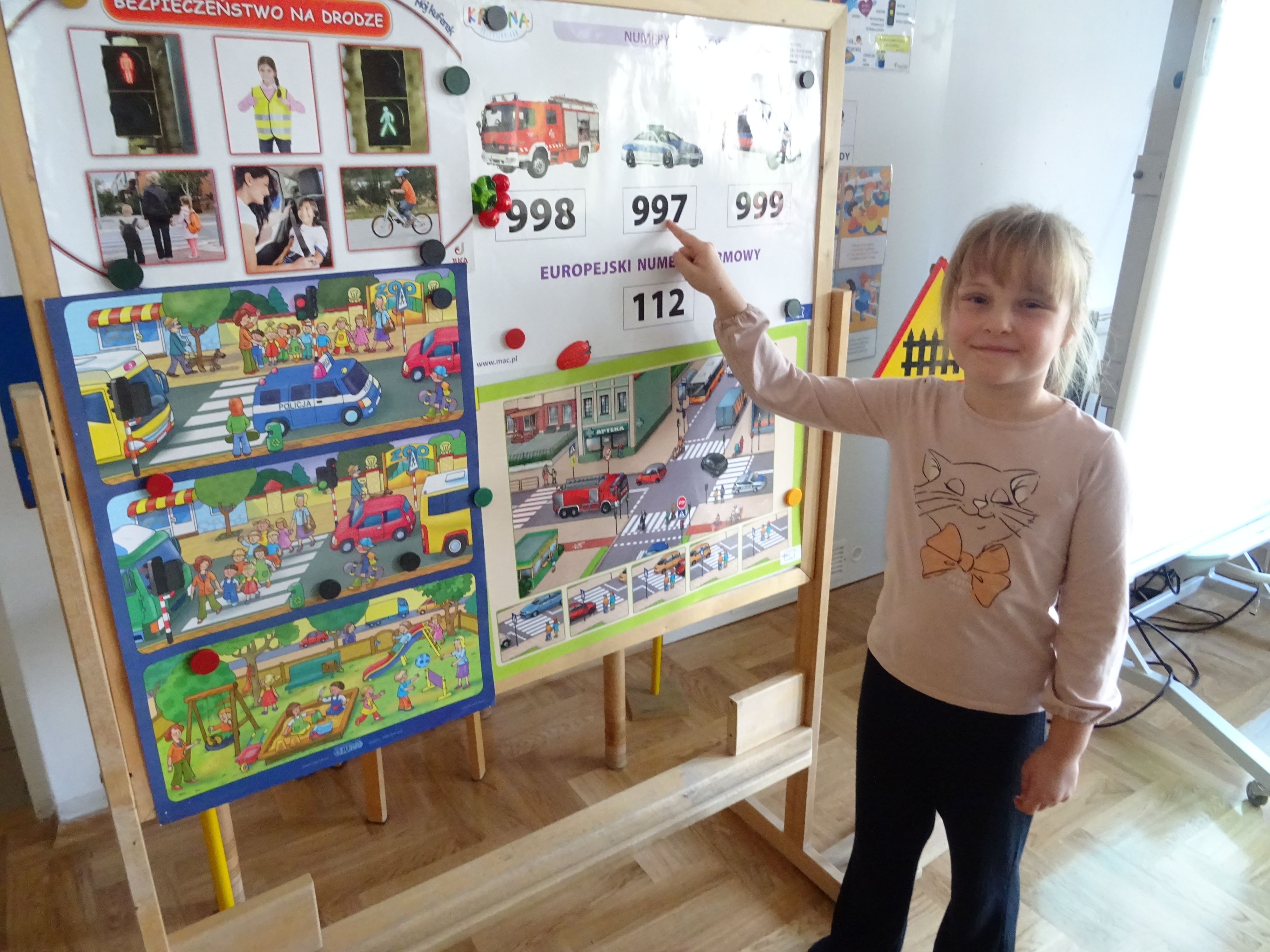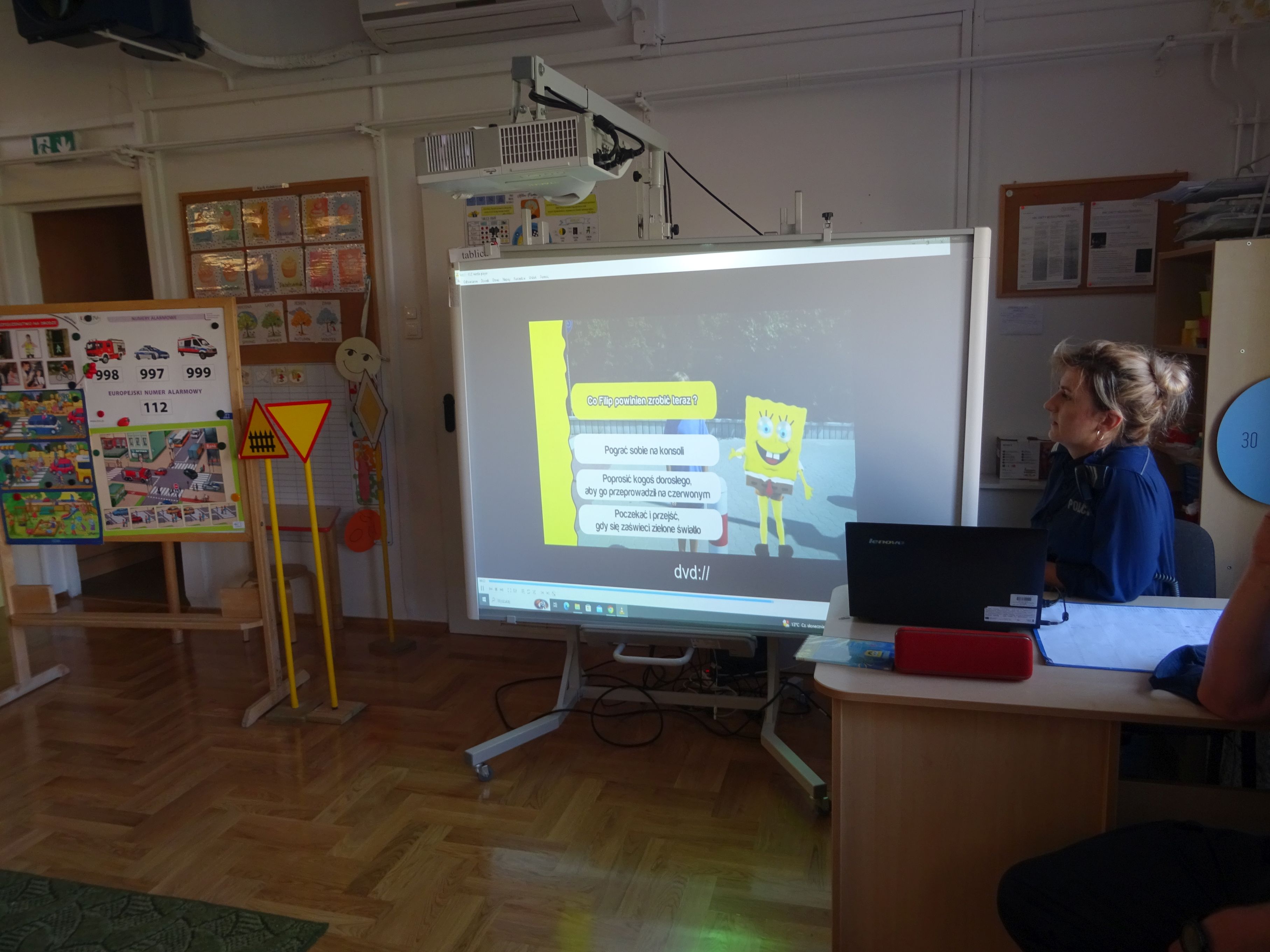 Podczas spotkania mundurowi przypomnieli o numerach alarmowych, z których należy korzystać w sytuacji zagrożenia. Dzieci dowiedziały się, jak trzeba postępować w kontakcie z osobami obcymi oraz ćwiczyły właściwe przechodzenie przez jezdnię. Policjanci wyjaśnili tez przedszkolakom, jak należy podróżować samochodem i jaką rolę pełnią pasy bezpieczeństwa, foteliki oraz jak ważne są elementy odblaskowe dla pieszego. Tematem spotkania, równie ważnym jak bezpieczeństwo, było dla przedszkolaków poznanie tajników służby policjanta. Każde dziecko chciało obejrzeć z bliska kajdanki, lizak policyjny. Było to bardzo udane spotkanie. Na zakończenie wszyscy uczestnicy spotkania wykonali z policjantami pamiątkowe zdjęcie i wręczyli gościom przygotowane wcześniej laurki.