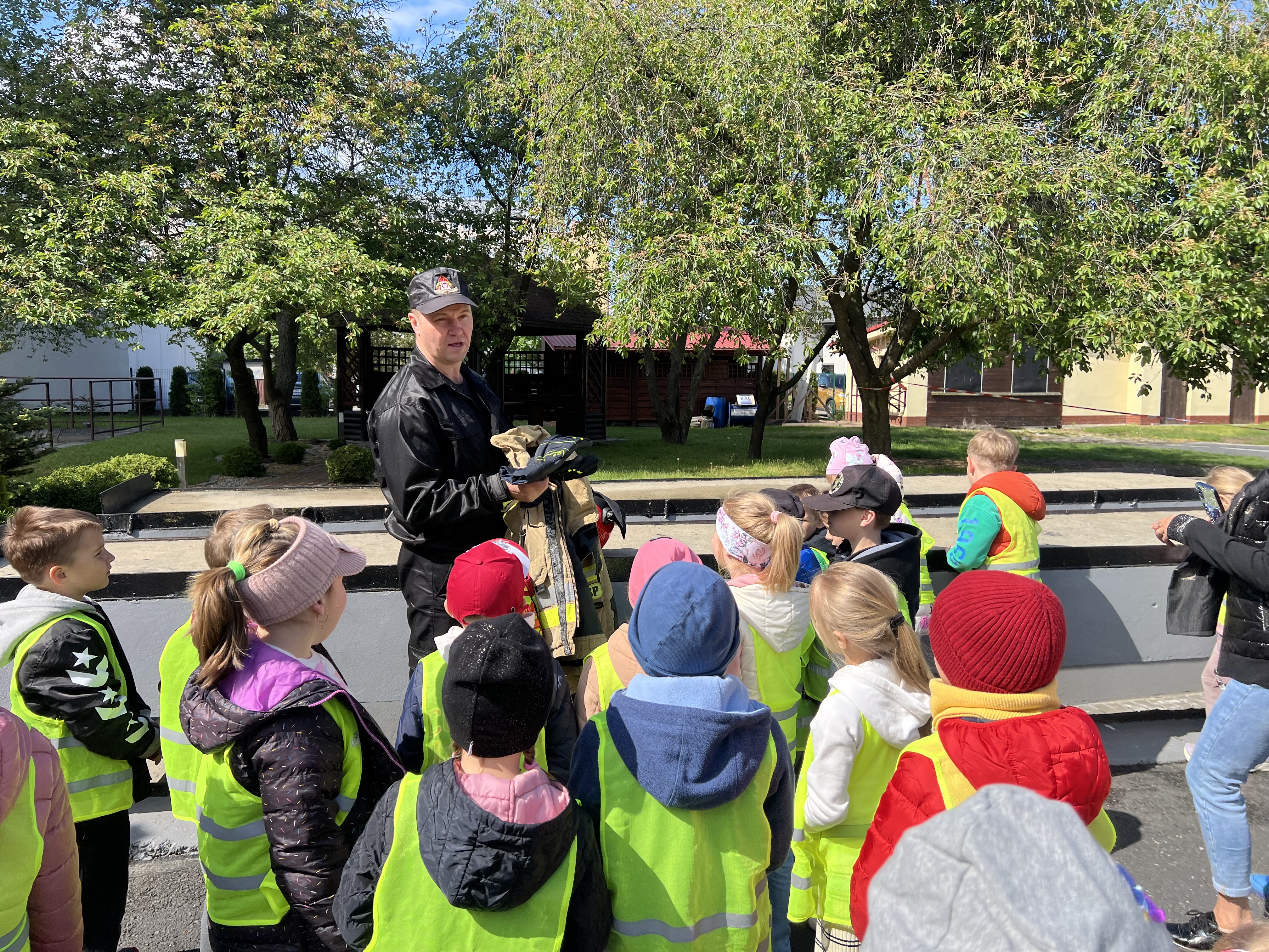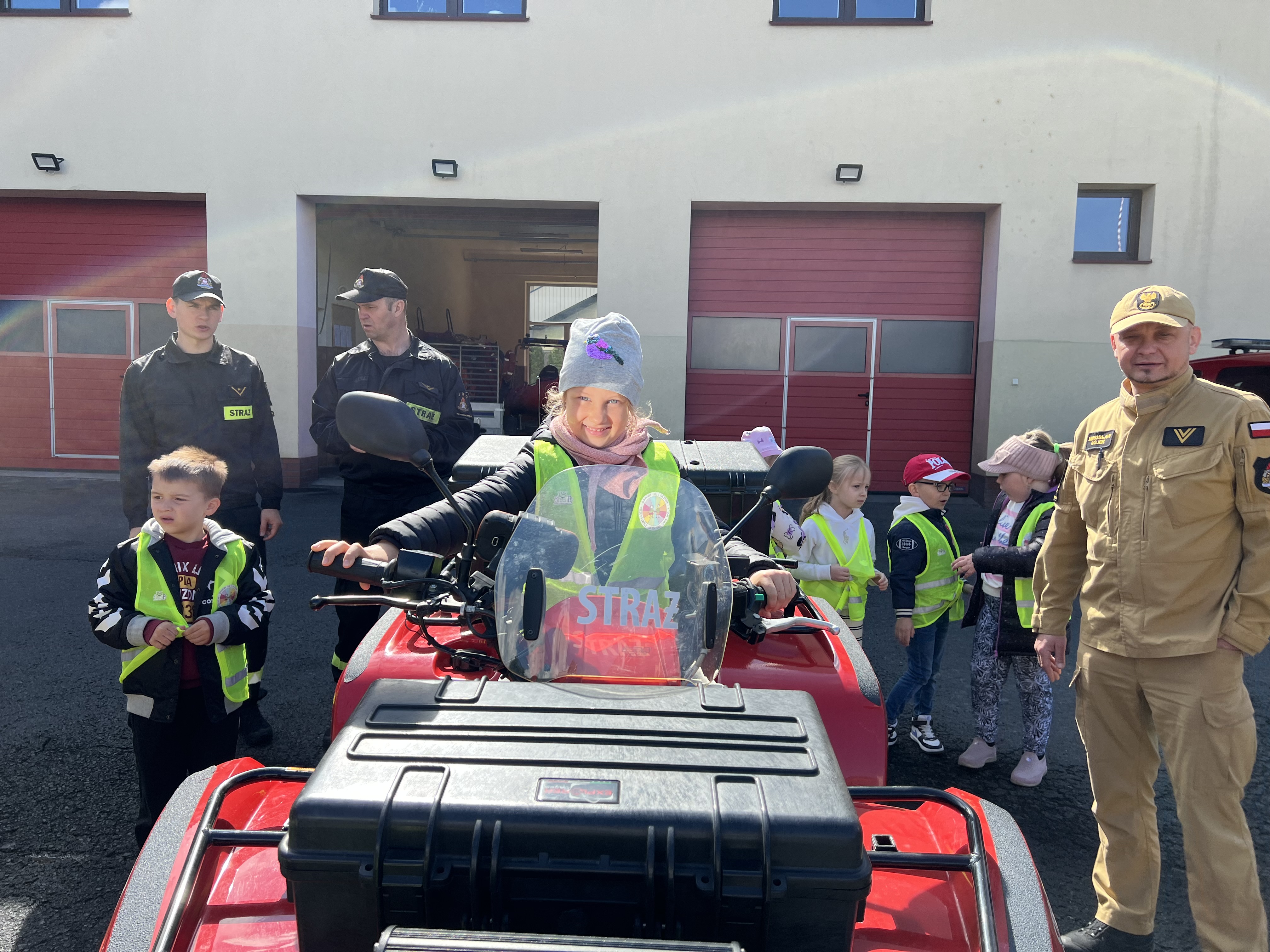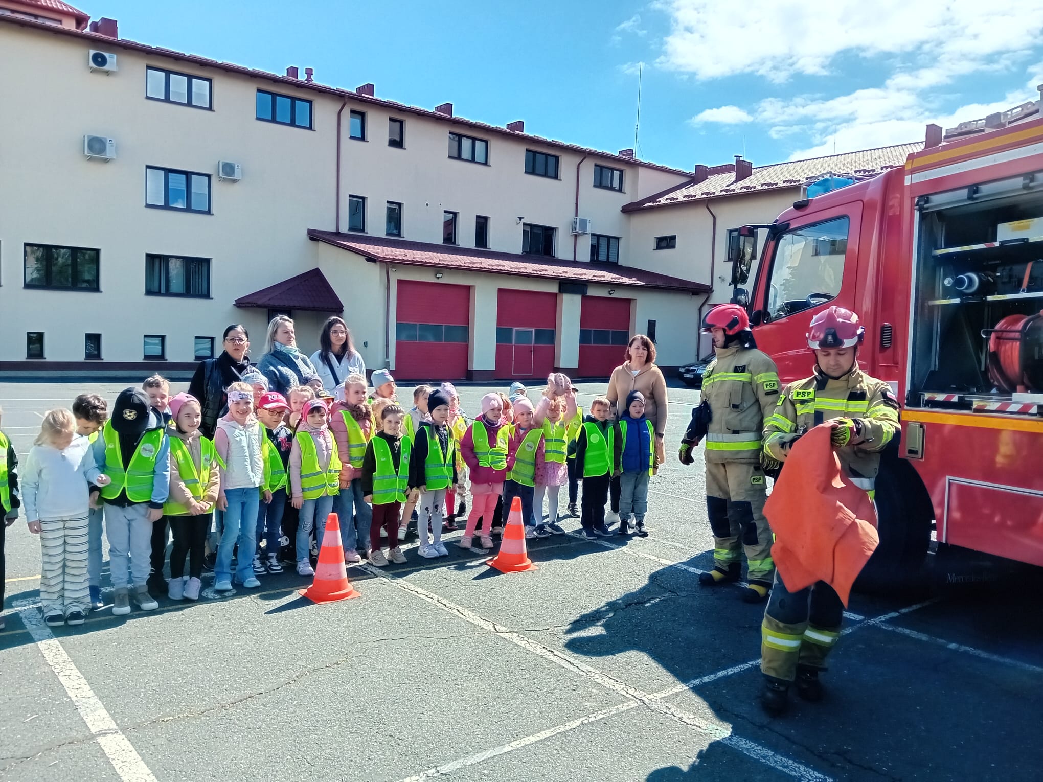 Dbanie o bezpieczeństwo swoje oraz innych to jeden z celów podstawy programowej, które dzieci muszą poznać. Dziecko powinno wiedzieć jak zachować się w sytuacji zagrożenia, pożaru oraz do kogo zwrócić się o pomoc. Aby zrealizować te cele grupy: „Biedronki” oraz „Zajączki“ w maju udały się do Państwowej Straży Pożarnej. Dzieci zwiedziły budynek , dowiedziały się wielu informacji dotyczących pracy strażaka, wysłuchały którymi pojazdami strażacy wyjeżdżają do wypadków, a jakimi gaszą pożary. Mogły usiąść na quadzie strażackim. Obejrzały również wyposażenie pojazdów oraz niezbędne do pracy urządzenia specjalistyczne (w tym mogły zobaczyć jak w praktyce strażacy używają m.in. nożycy hydraulicznych do „rozcięcia“ auta. Mogły przymierzyć hełm strażacki oraz zobaczyć jak strażak w razie alarmu zjeżdża z rury. Wszystkie dzieci teraz dokładnie wiedzą jaki jest numer alarmowy do straży pożarnej. Po takiej wycieczce wszystkie dzieciaki zgodnie przyznały, że ten zawód bardzo im się podoba, a niejedno dziecko w przyszłości chciałoby zostać strażakiem.