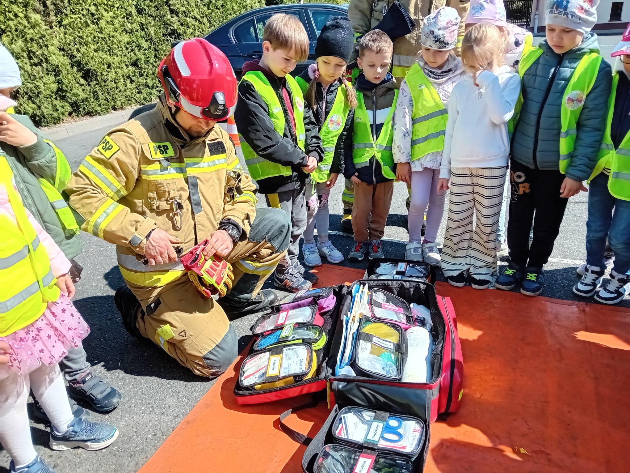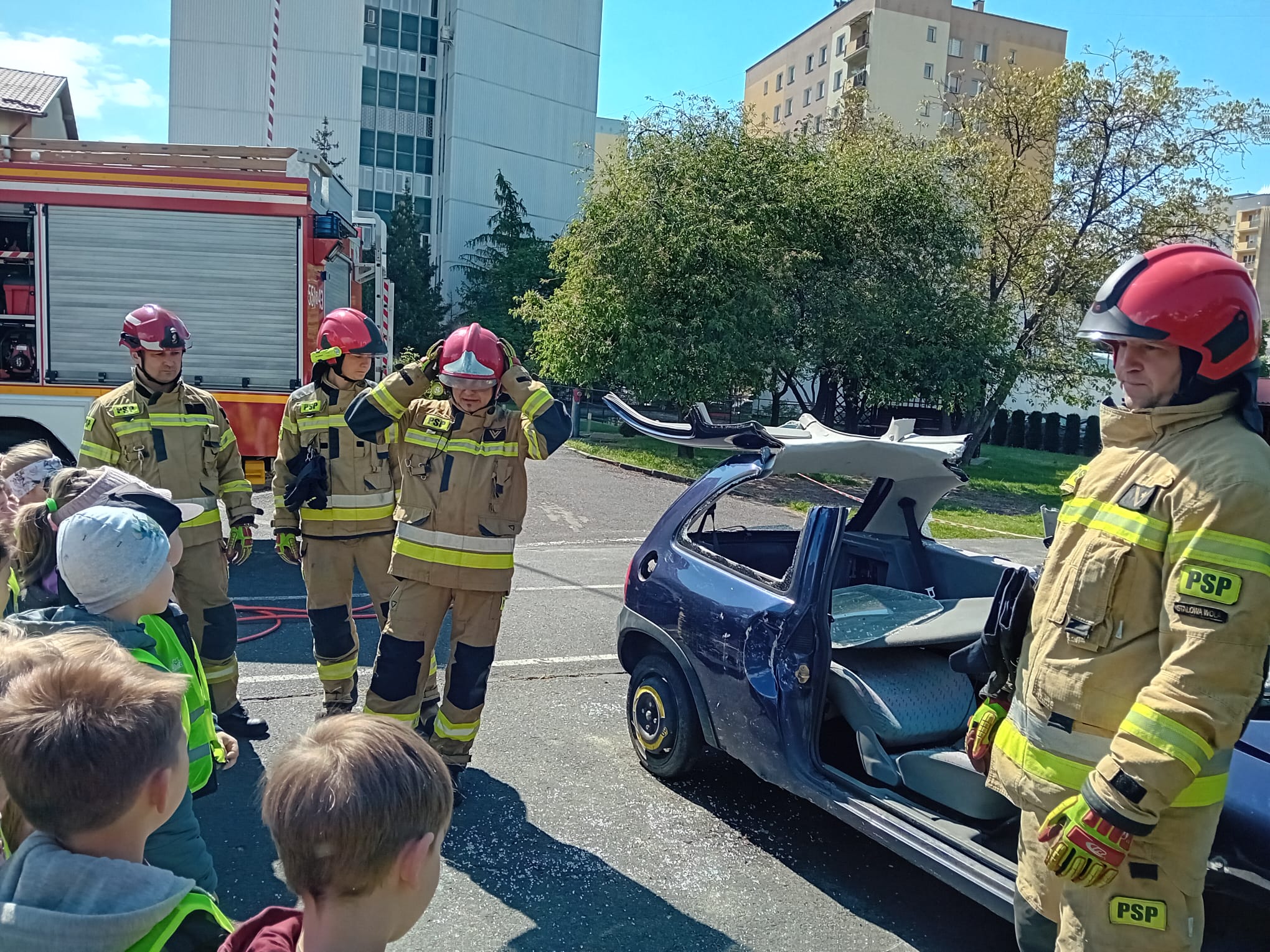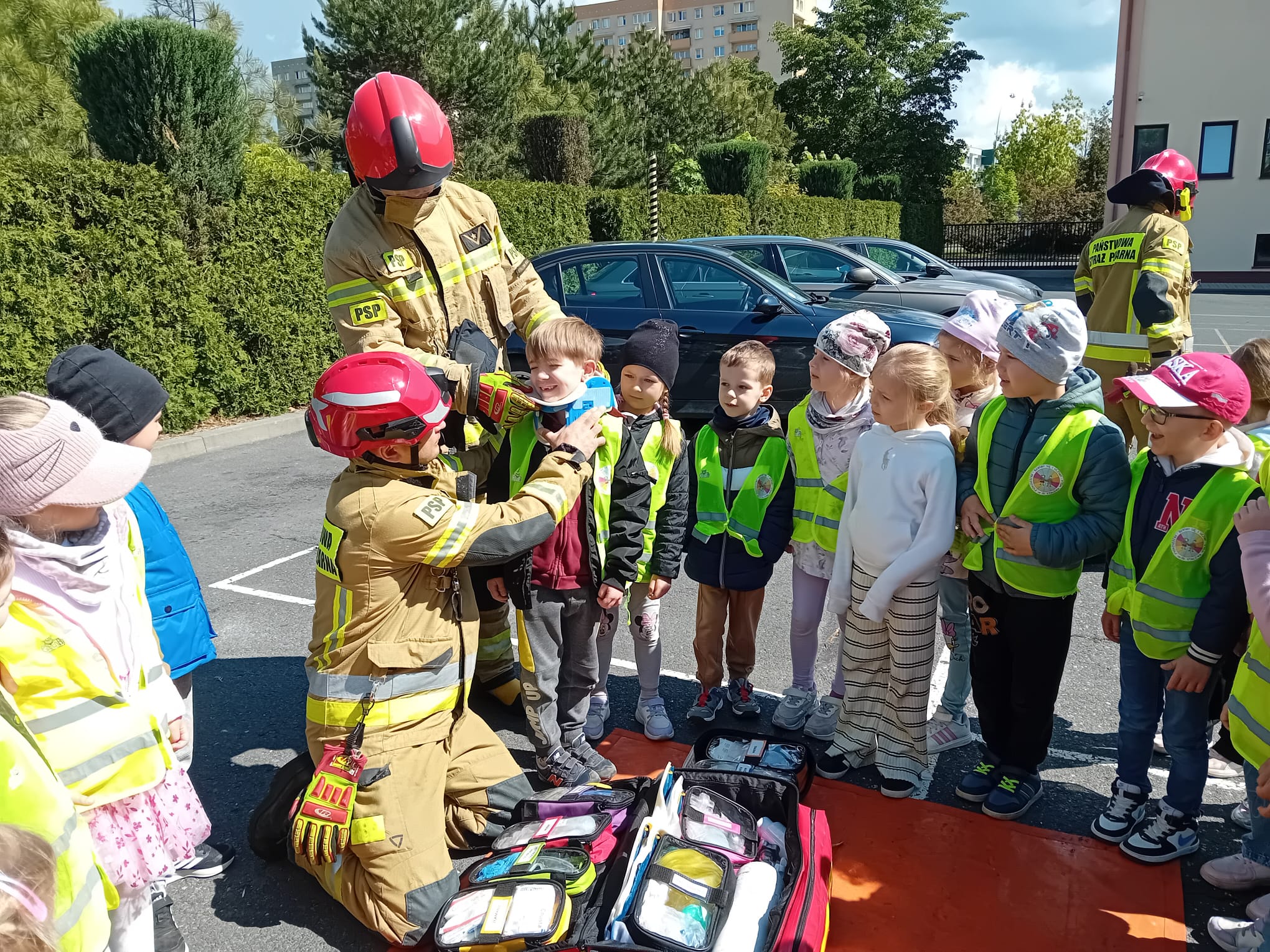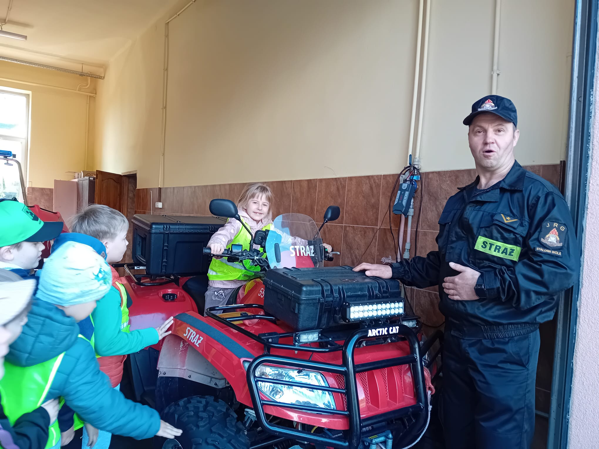 Dbanie o bezpieczeństwo swoje oraz innych to jeden z celów podstawy programowej, które dzieci muszą poznać. Dziecko powinno wiedzieć jak zachować się w sytuacji zagrożenia, pożaru oraz do kogo zwrócić się o pomoc. Aby zrealizować te cele grupy: „Biedronki” oraz „Zajączki“ w maju udały się do Państwowej Straży Pożarnej. Dzieci zwiedziły budynek , dowiedziały się wielu informacji dotyczących pracy strażaka, wysłuchały którymi pojazdami strażacy wyjeżdżają do wypadków, a jakimi gaszą pożary. Mogły usiąść na quadzie strażackim. Obejrzały również wyposażenie pojazdów oraz niezbędne do pracy urządzenia specjalistyczne (w tym mogły zobaczyć jak w praktyce strażacy używają m.in. nożycy hydraulicznych do „rozcięcia“ auta. Mogły przymierzyć hełm strażacki oraz zobaczyć jak strażak w razie alarmu zjeżdża z rury. Wszystkie dzieci teraz dokładnie wiedzą jaki jest numer alarmowy do straży pożarnej. Po takiej wycieczce wszystkie dzieciaki zgodnie przyznały, że ten zawód bardzo im się podoba, a niejedno dziecko w przyszłości chciałoby zostać strażakiem.