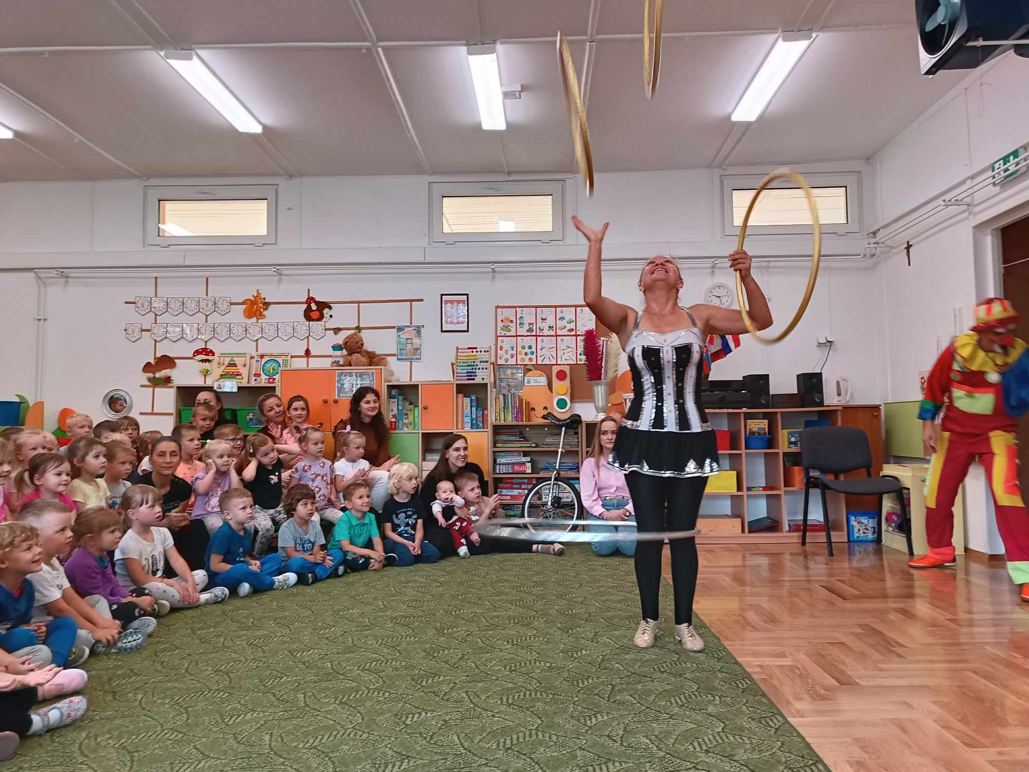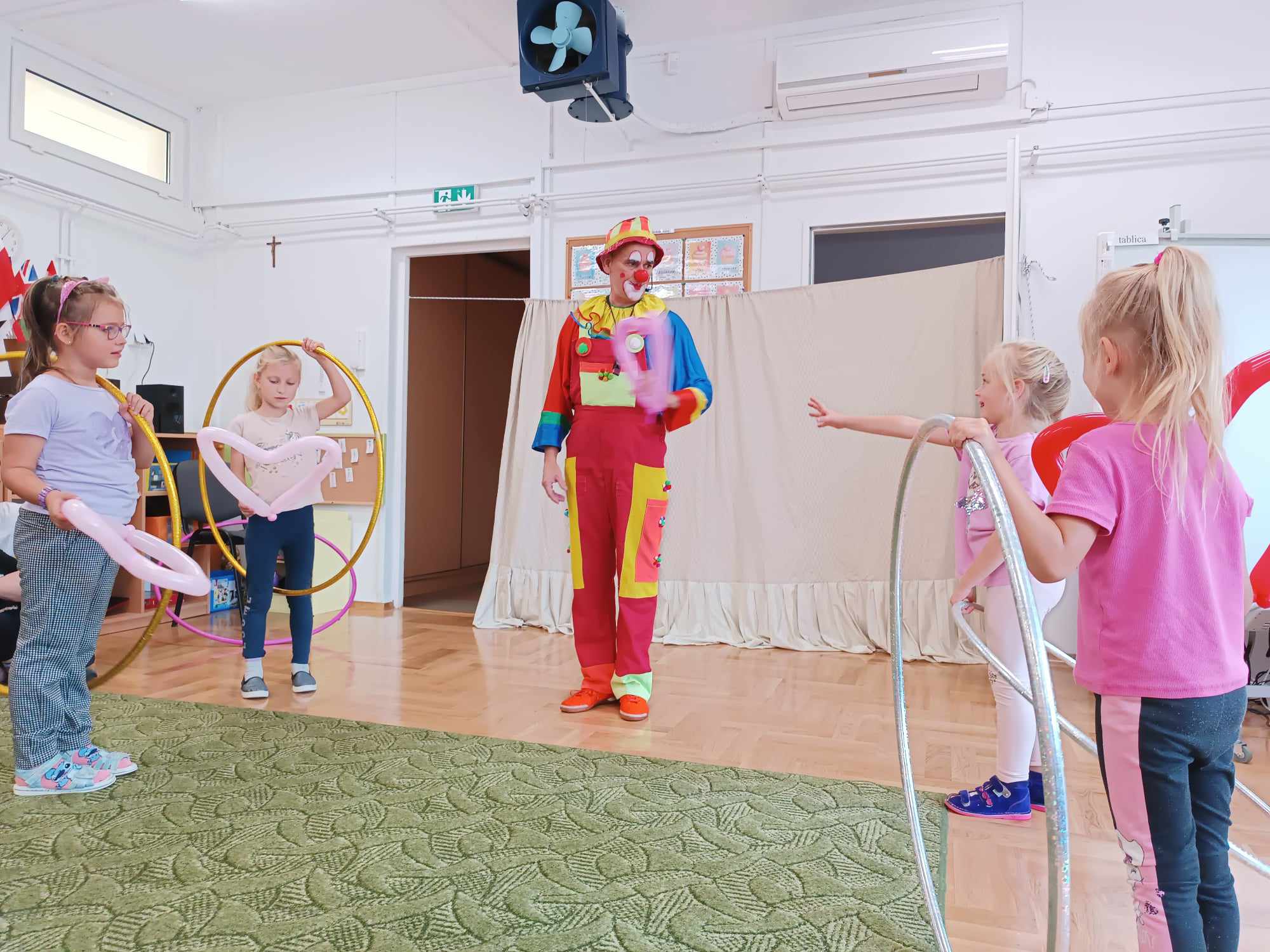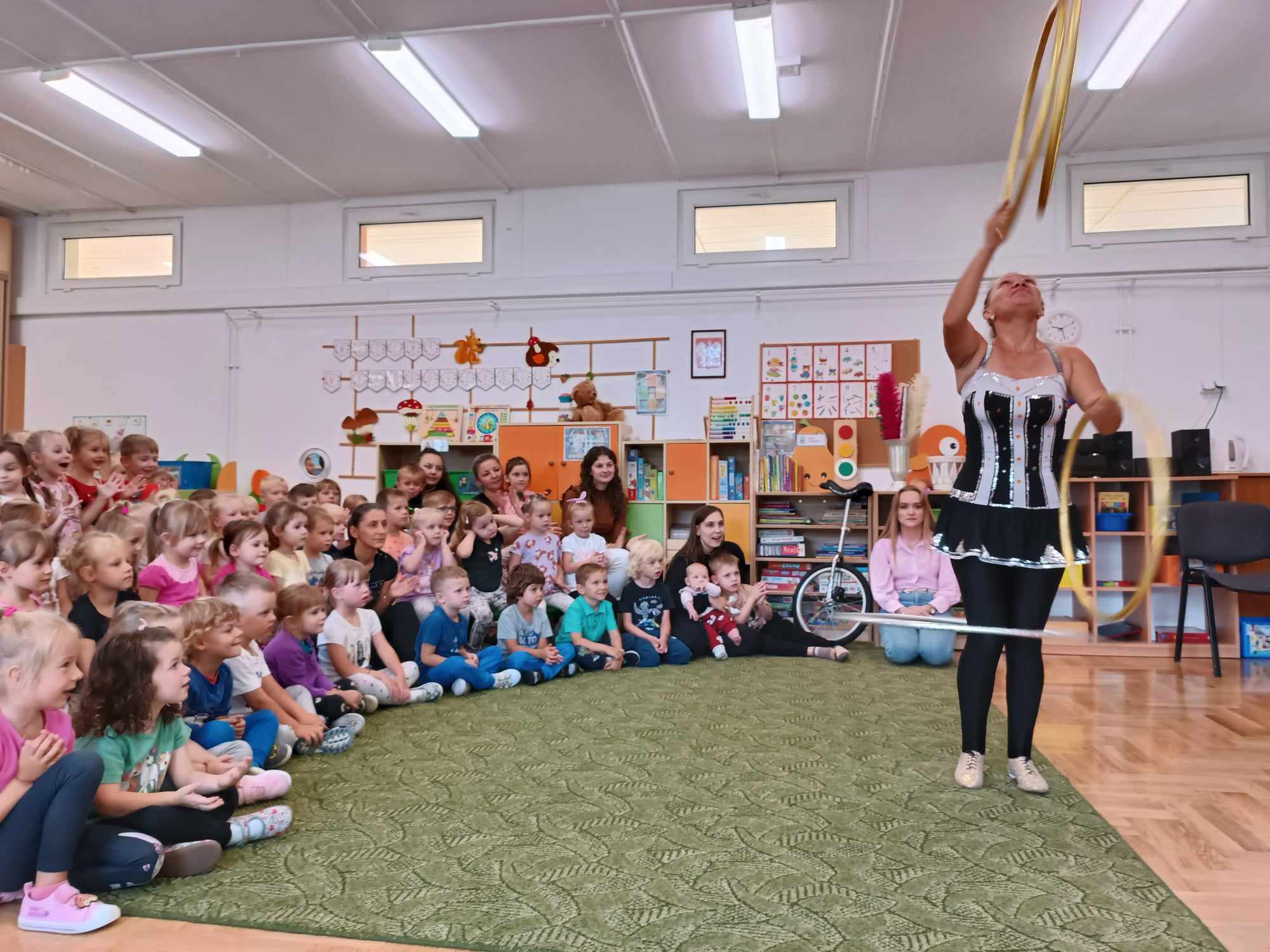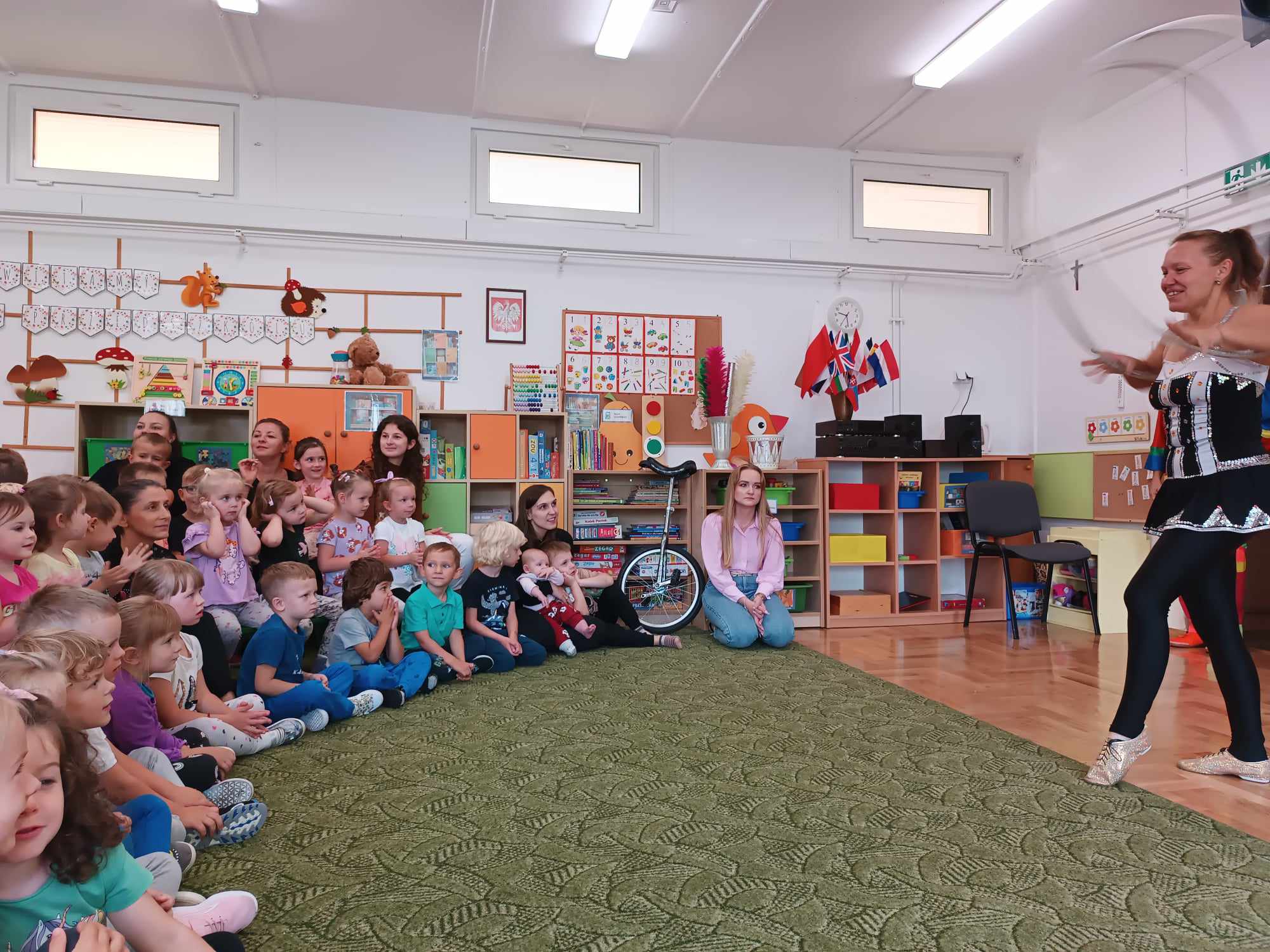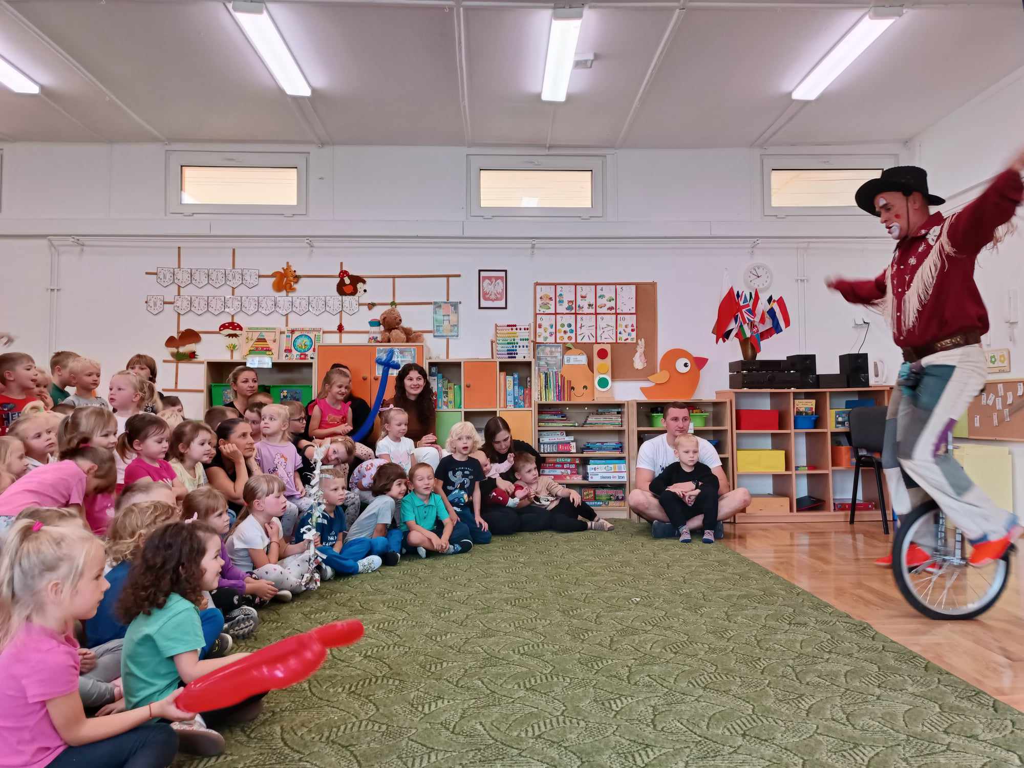 25.09.2023 r. nasze przedszkole odwiedzili uwielbiani przez przedszkolaki artyści cyrku „Kaskada“. Dzieci z prawdziwym podziwem i zaciekawieniem oglądały pokaz wielu cyrkowych sztuczek, w tym żonglerki piłeczkami, akrobacje obręczami hula-hop, jazdę na monocyklu. Występ cyrkowy umilał clown, który w pewnym momencie wyczarował nawet prawdziwego królika. Artyści zaangażowali też naszych chętnych i niewątpliwie odważnych przedszkolaków, którzy na własne oczy mogli przekonać się, czym jest sztuka cyrkowa. Występ bardzo spodobał się widzom, którzy głośno oklaskiwali artystów, z pewnością przyniósł on dzieciom wiele radości i miłych chwil.