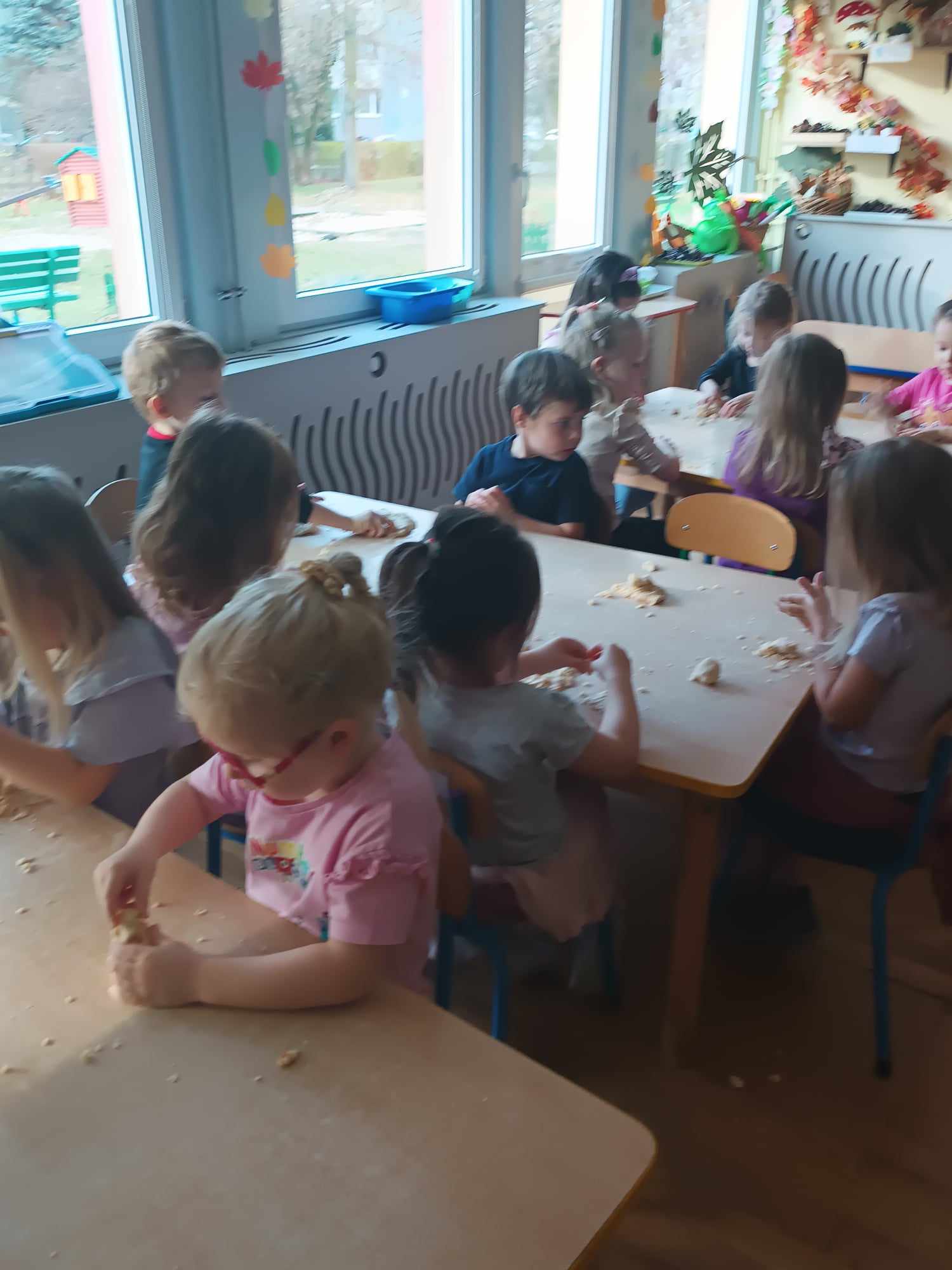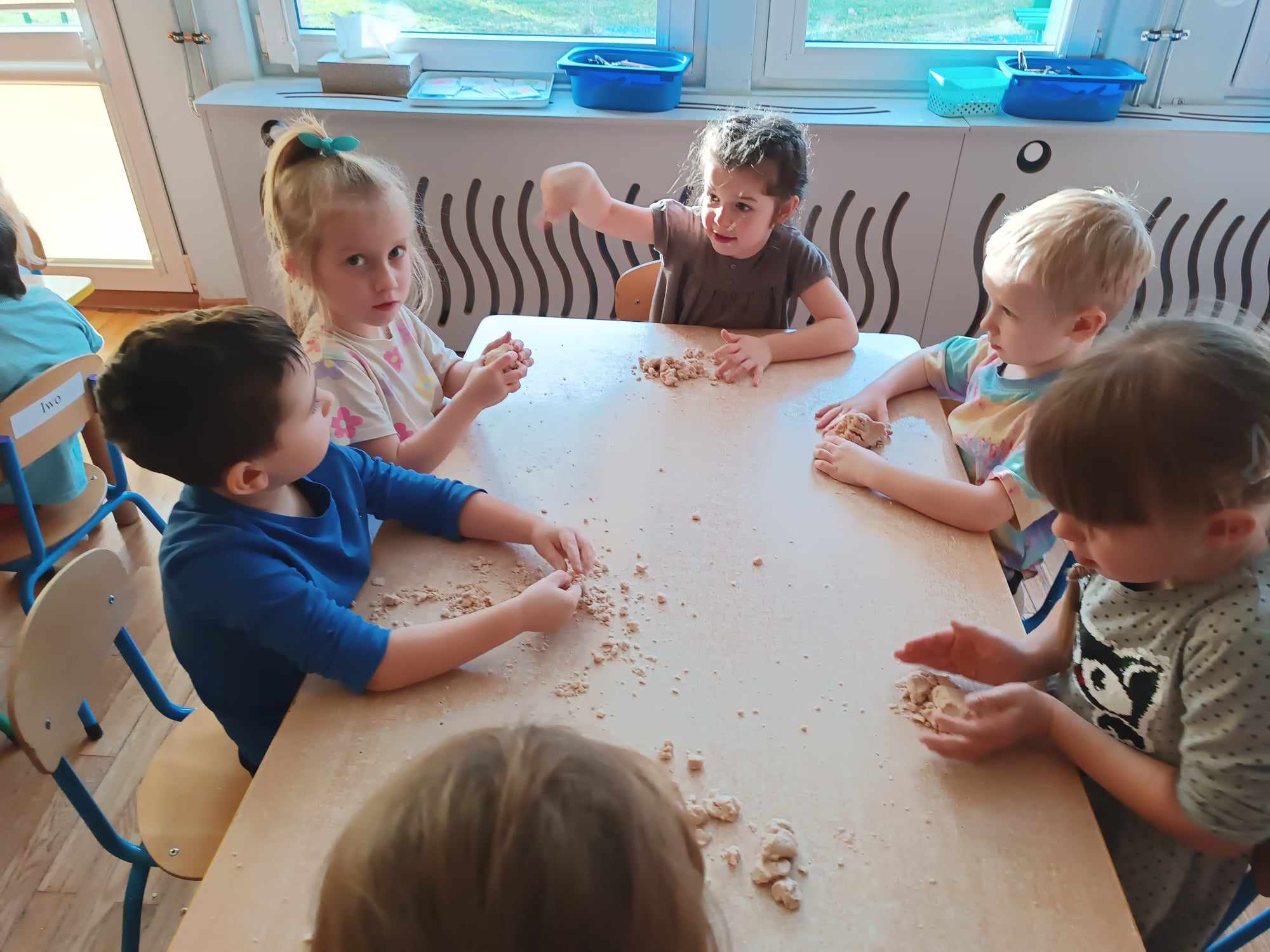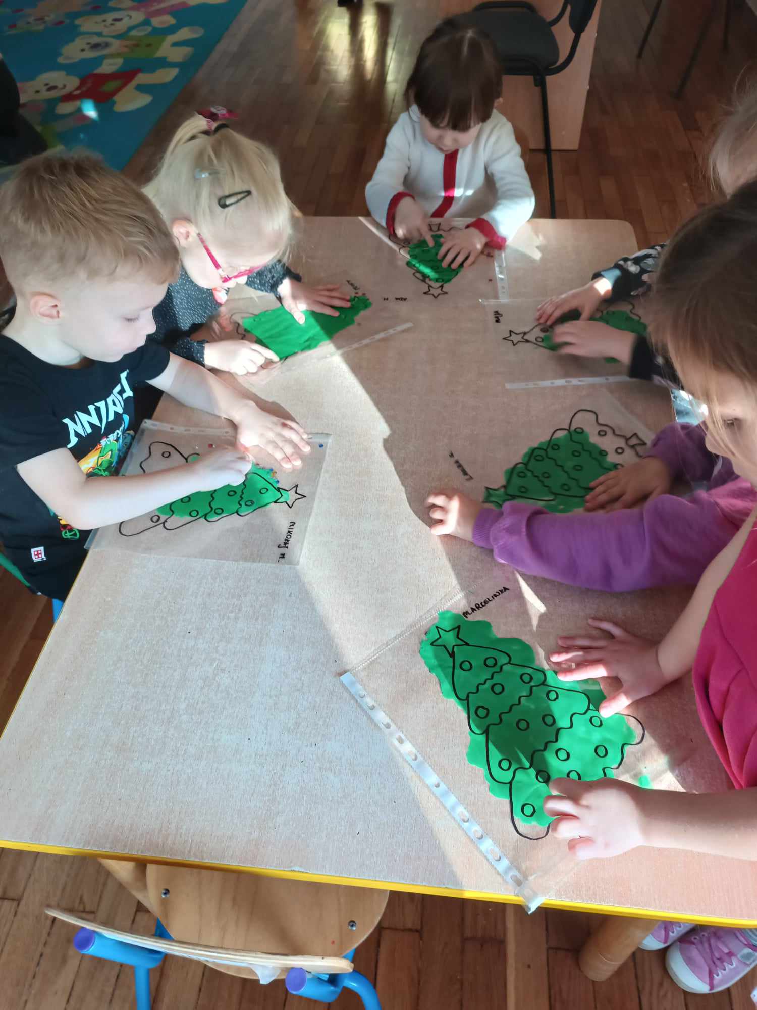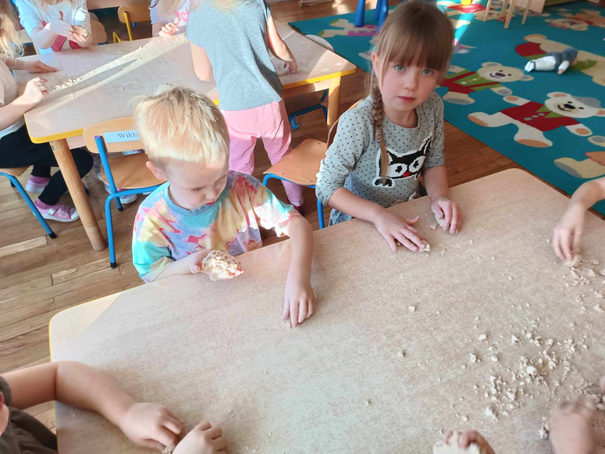 Przedszkolaki z grupy „Misie“ realizują w tym roku szkolnym program wspierania rozwoju dziecka poprzez zabawy sensoryczne „Daj się dziecku ubrudzić“. Celem programu jest przede wszystkim dostarczanie różnorodnych bodźców sensorycznych, które oddziałują na jeden lub kilka zmysłów jednocześnie. Wspierając rozwój zmysłów, wpływamy na wiele aspektów- dużą i małą motorykę. Doskonalimy też funkcje poznawcze, w tym koncentrację uwagi, pamięć, myślenie i rozwiązywanie problemów. „Misie“ wykonały dotychczas m.in. jabłkolinę, sensoryczne choinki, czy też bawiły się piernikową ciastoliną. Każda z tych zabaw dała dzieciom możliwość stymulacji zmysłów.
