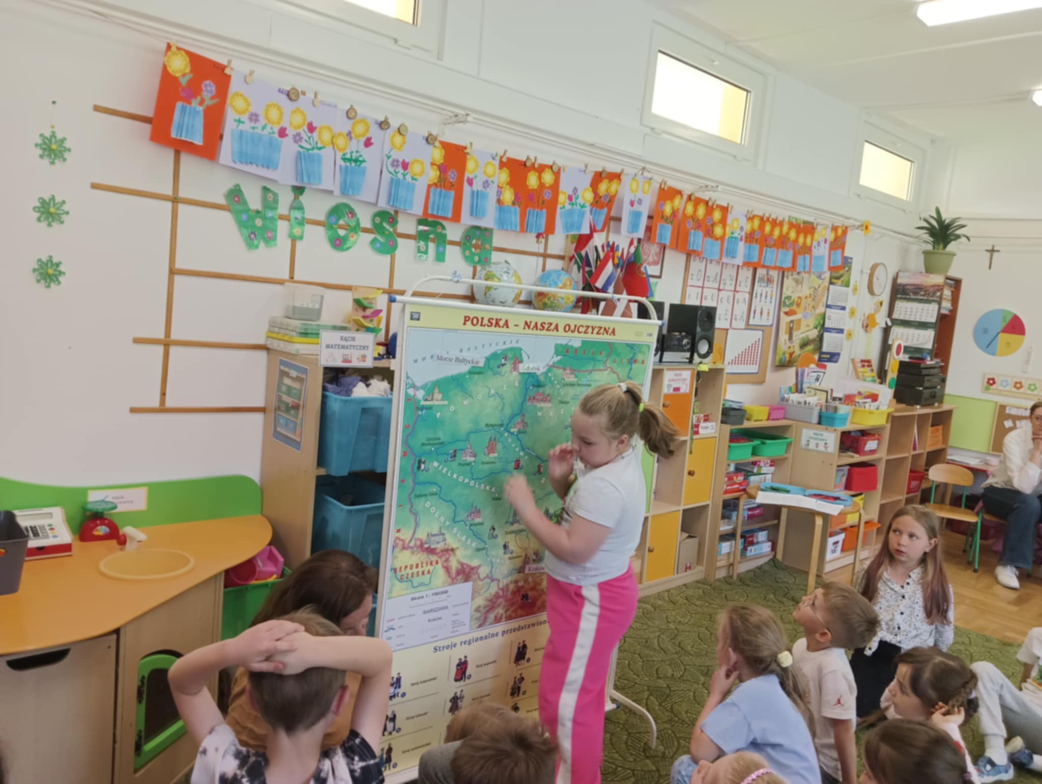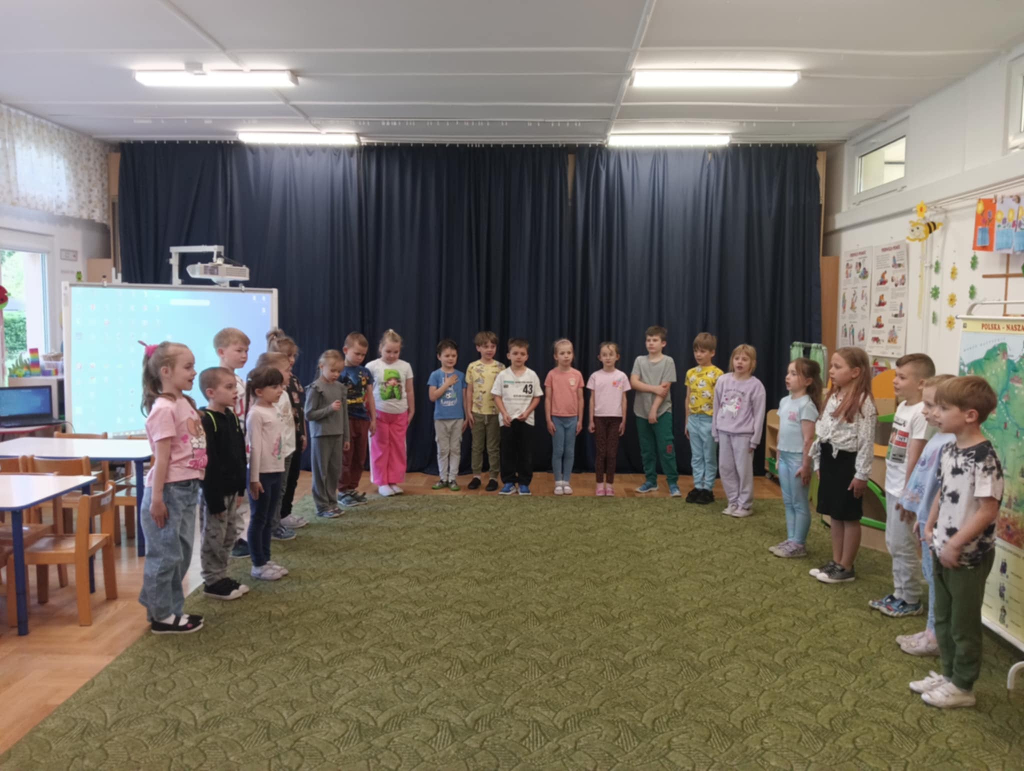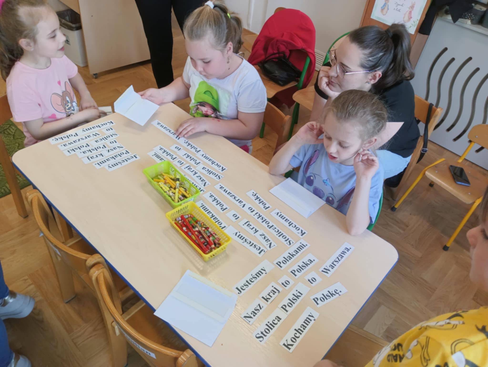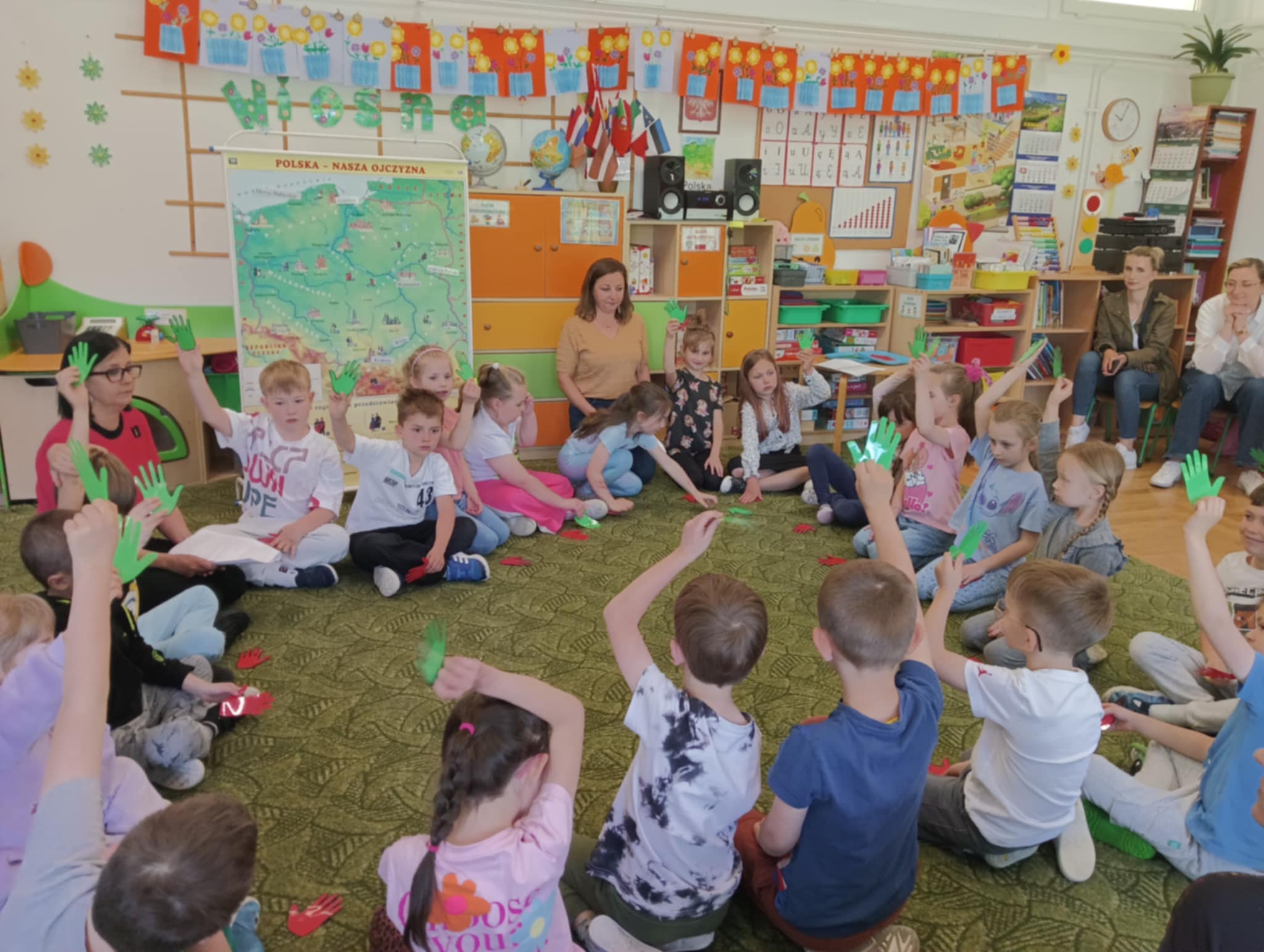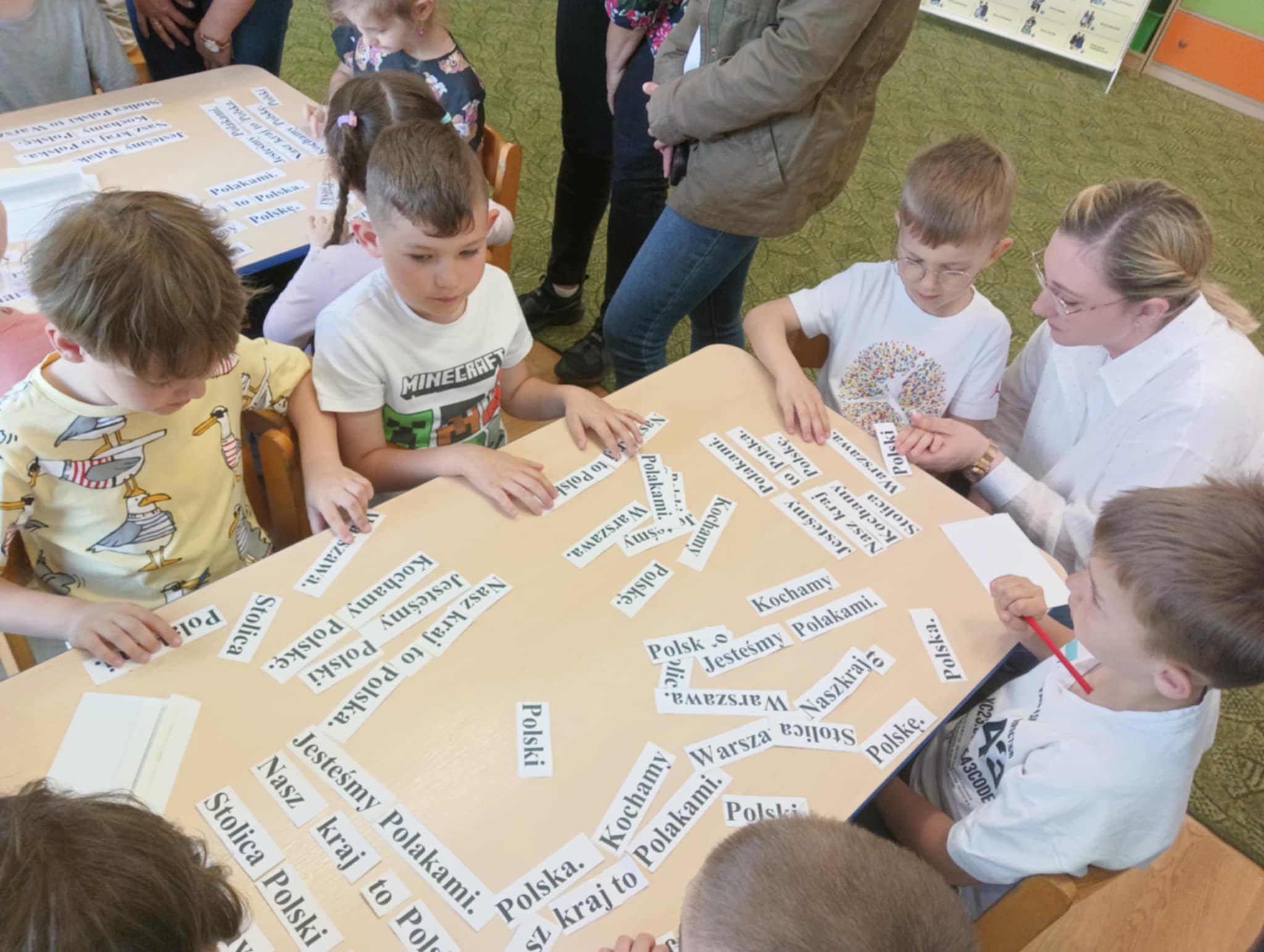 07.05.2025 r. w grupie ,,Zajączki” odbyły się zajęcia, podczas których Rodzice mogli obserwować swoje pociechy. Tematem przewodnim była ,,Polska - moja ojczyzna”. ,,Zajączki” przedstawiły Rodzicom krótką inscenizację o Narodowym Święcie Trzeciego Maja i zatańczyły ,,Lasowiaka”. Dzieci odczytywały wyrazy i odszukiwały na mapie Polski charakterystyczne miejsca naszego kraju. Wspólnie z Rodzicami odśpiewały hymn państwowy z zachowaniem należytej postawy. Przedszkolaki odczytywały i układały z rozsypanki wyrazowej zdania o Polsce. Swoją wiedzę o Polsce sprawdziły w trakcie zabawy ,,Prawda, fałsz” wykorzystując kolorowe rączki. Na zakończenie zajęć dzieci miały za zadanie odszyfrować zakodowane godło Polski według współrzędnych z pomocą Rodziców.