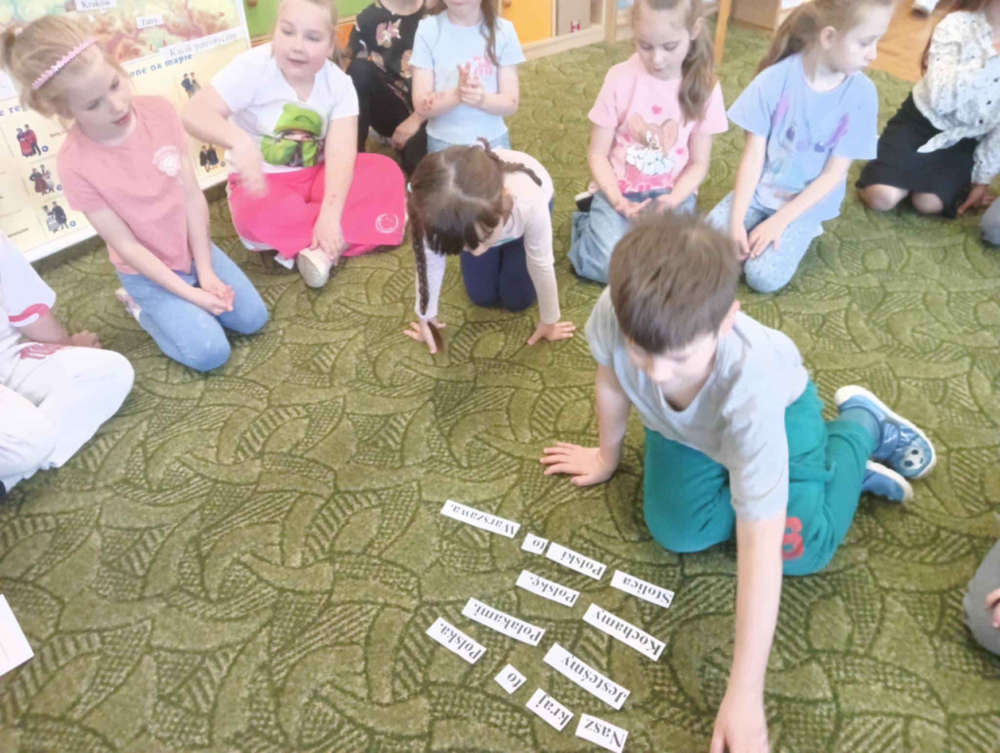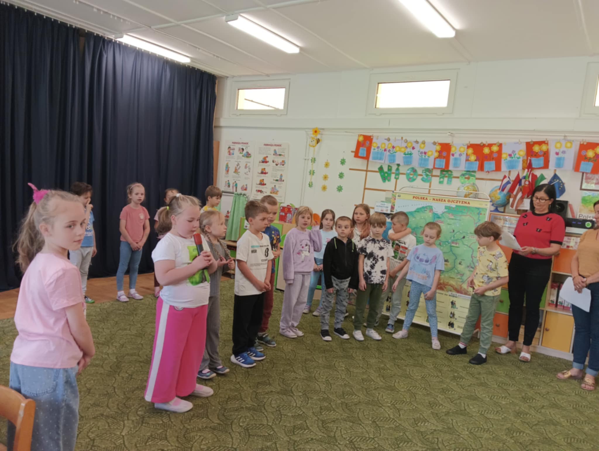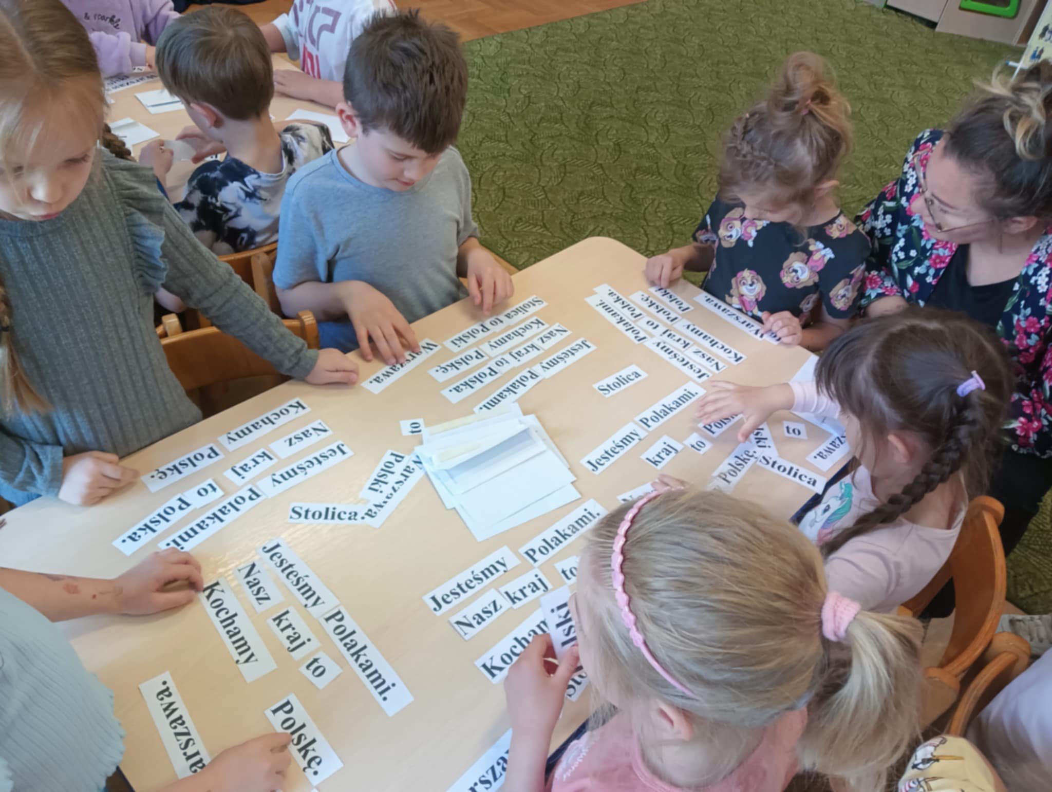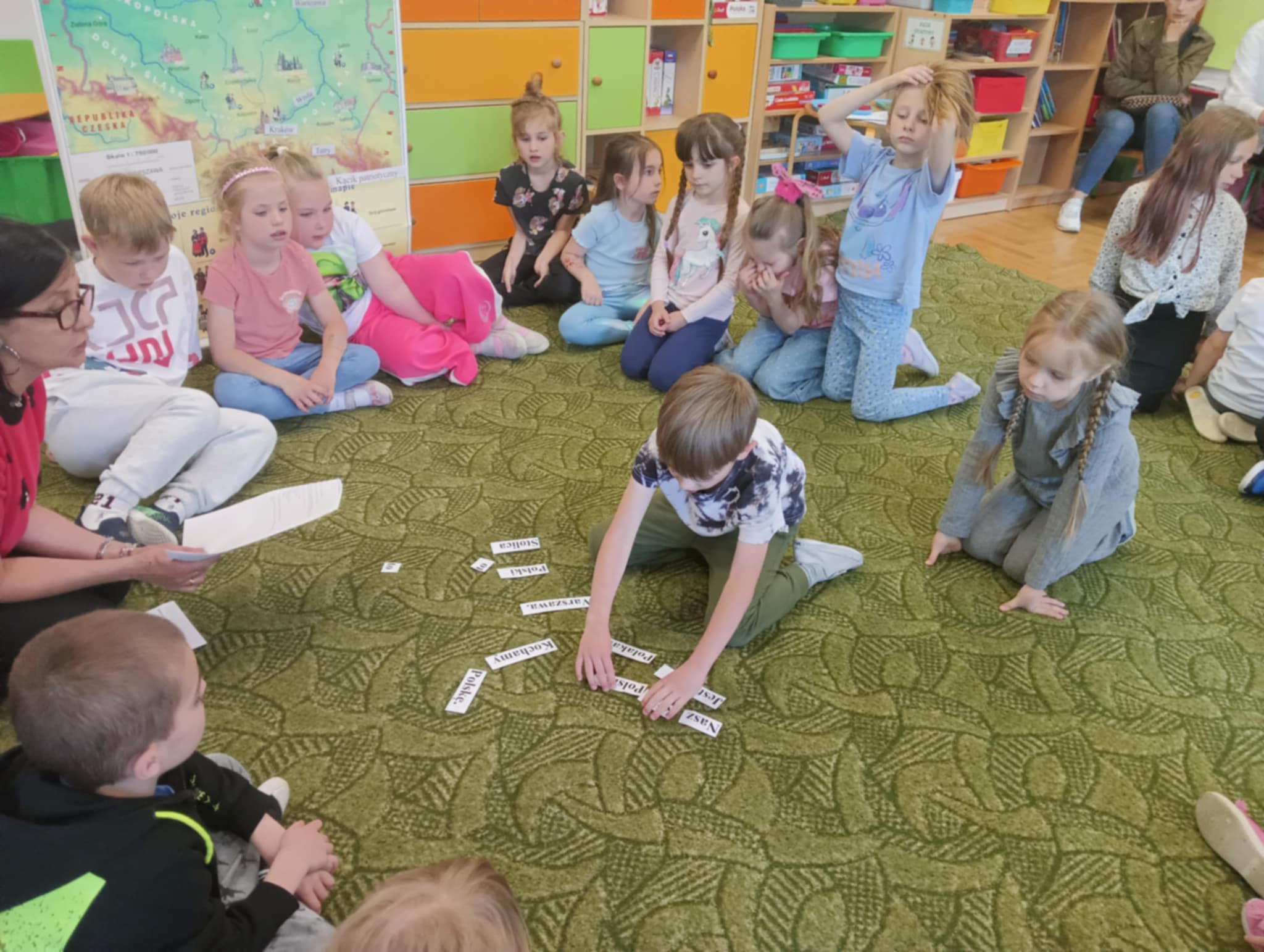 07.05.2025 r. w grupie ,,Zajączki” odbyły się zajęcia, podczas których Rodzice mogli obserwować swoje pociechy. Tematem przewodnim była ,,Polska - moja ojczyzna”. ,,Zajączki” przedstawiły Rodzicom krótką inscenizację o Narodowym Święcie Trzeciego Maja i zatańczyły ,,Lasowiaka”. Dzieci odczytywały wyrazy i odszukiwały na mapie Polski charakterystyczne miejsca naszego kraju. Wspólnie z Rodzicami odśpiewały hymn państwowy z zachowaniem należytej postawy. Przedszkolaki odczytywały i układały z rozsypanki wyrazowej zdania o Polsce. Swoją wiedzę o Polsce sprawdziły w trakcie zabawy ,,Prawda, fałsz” wykorzystując kolorowe rączki. Na zakończenie zajęć dzieci miały za zadanie odszyfrować zakodowane godło Polski według współrzędnych z pomocą Rodziców.