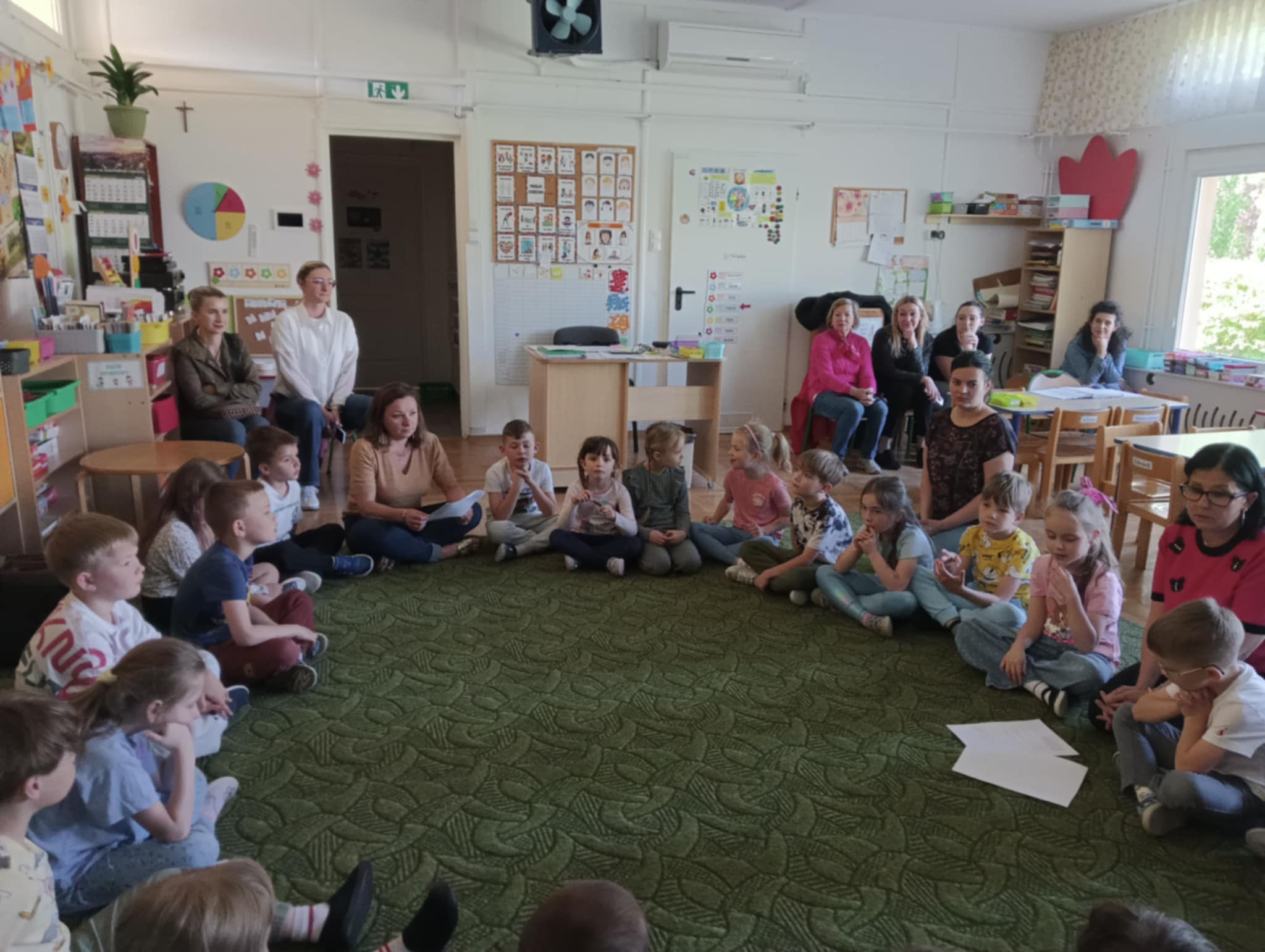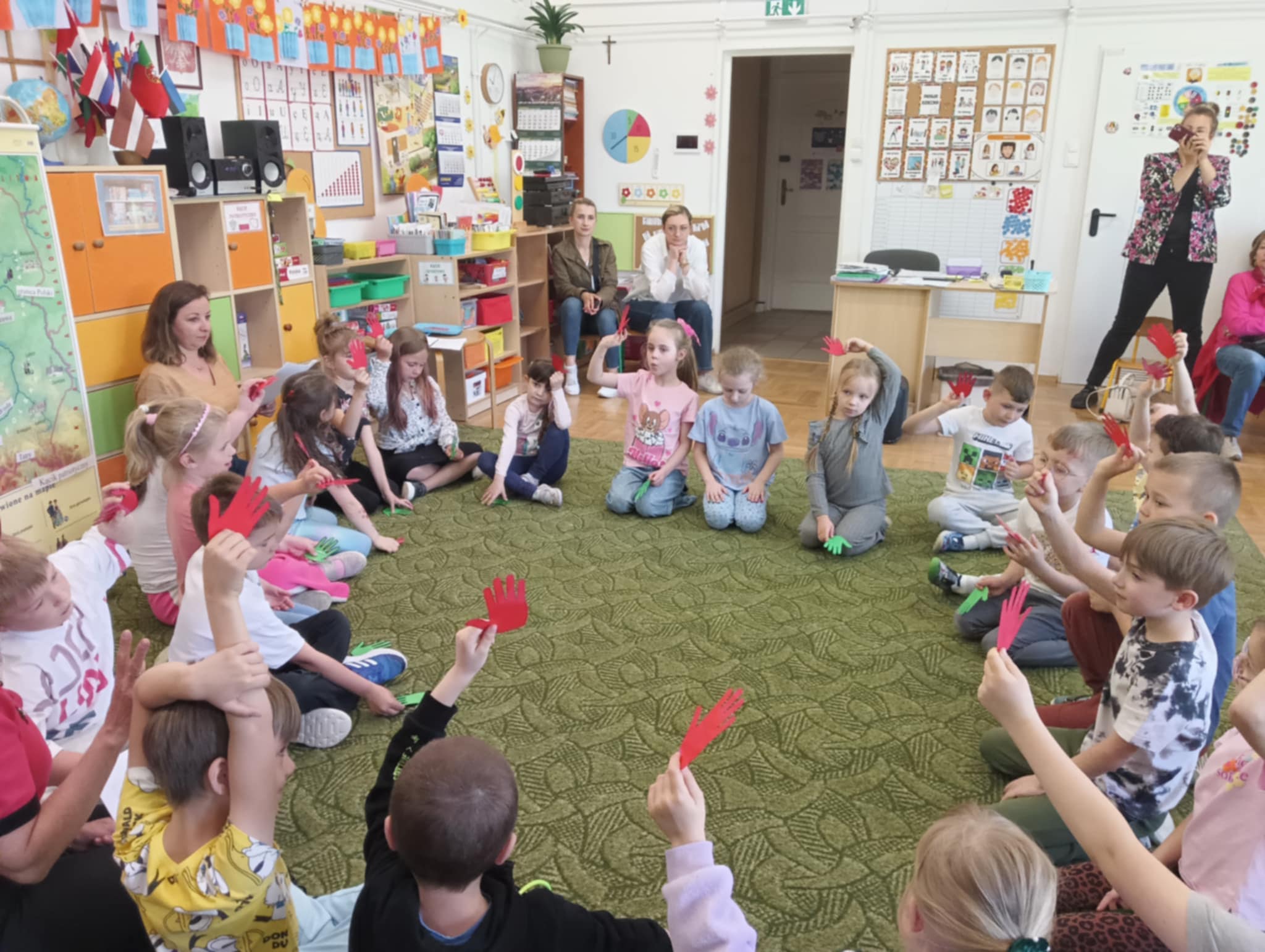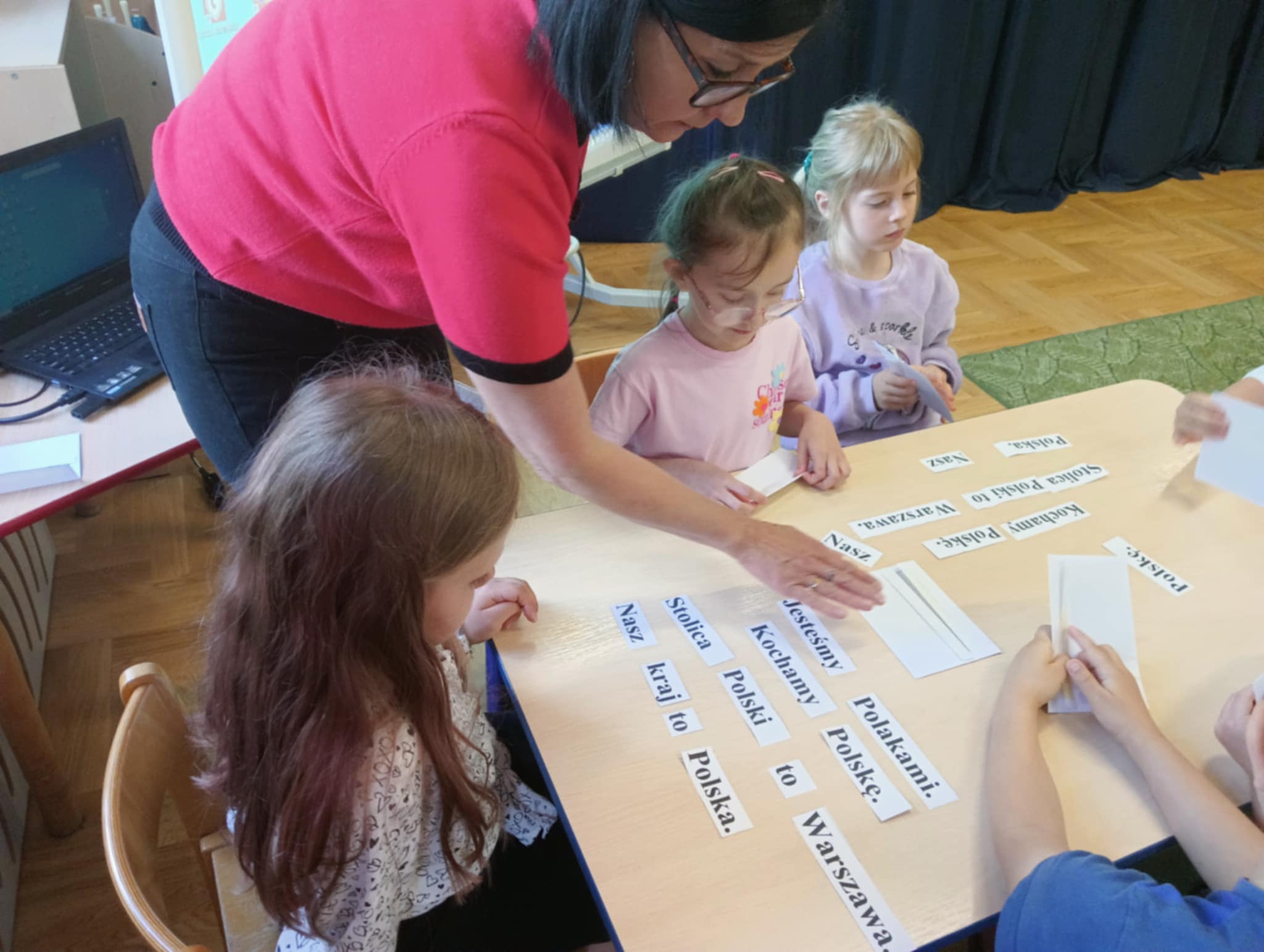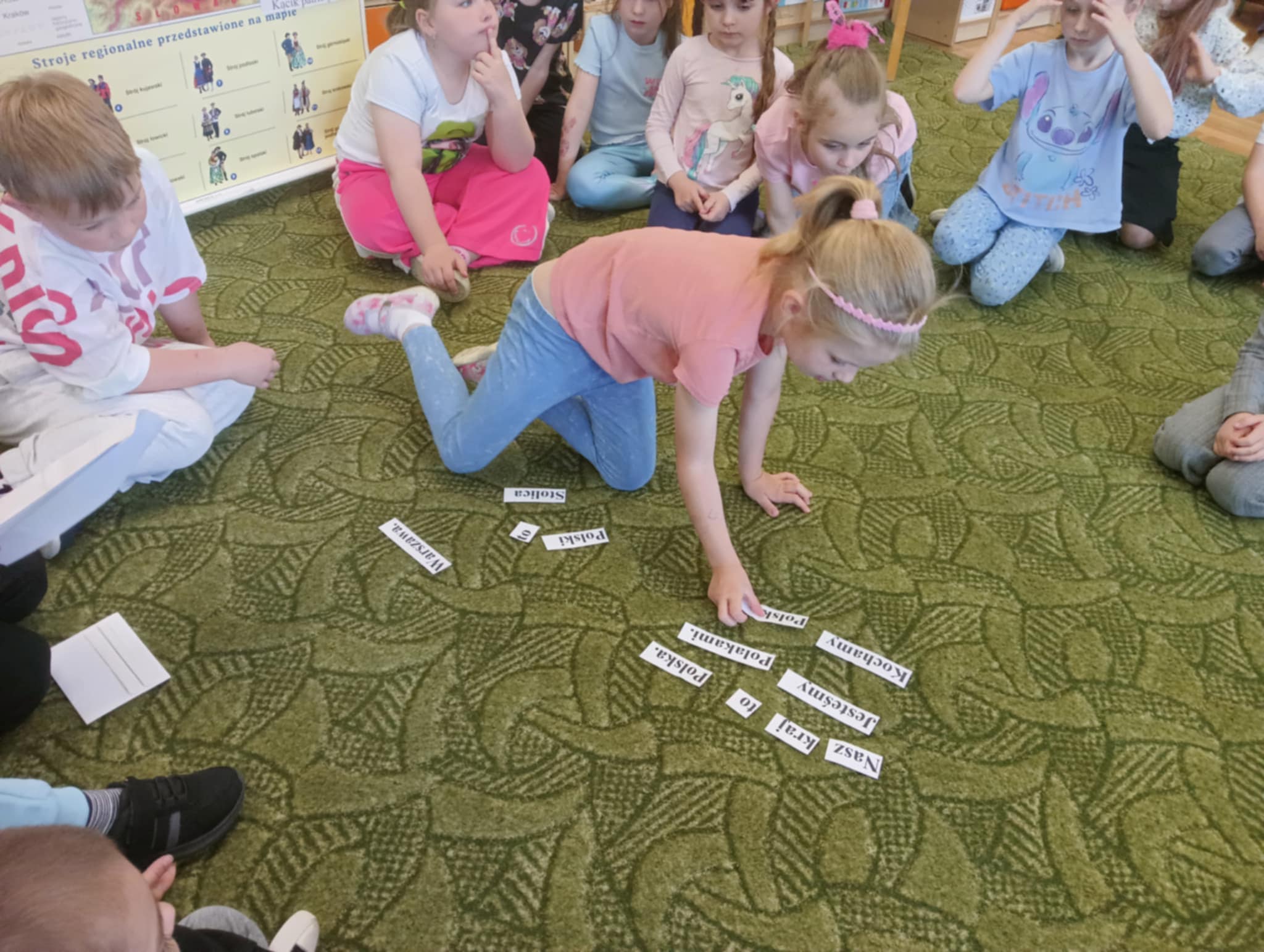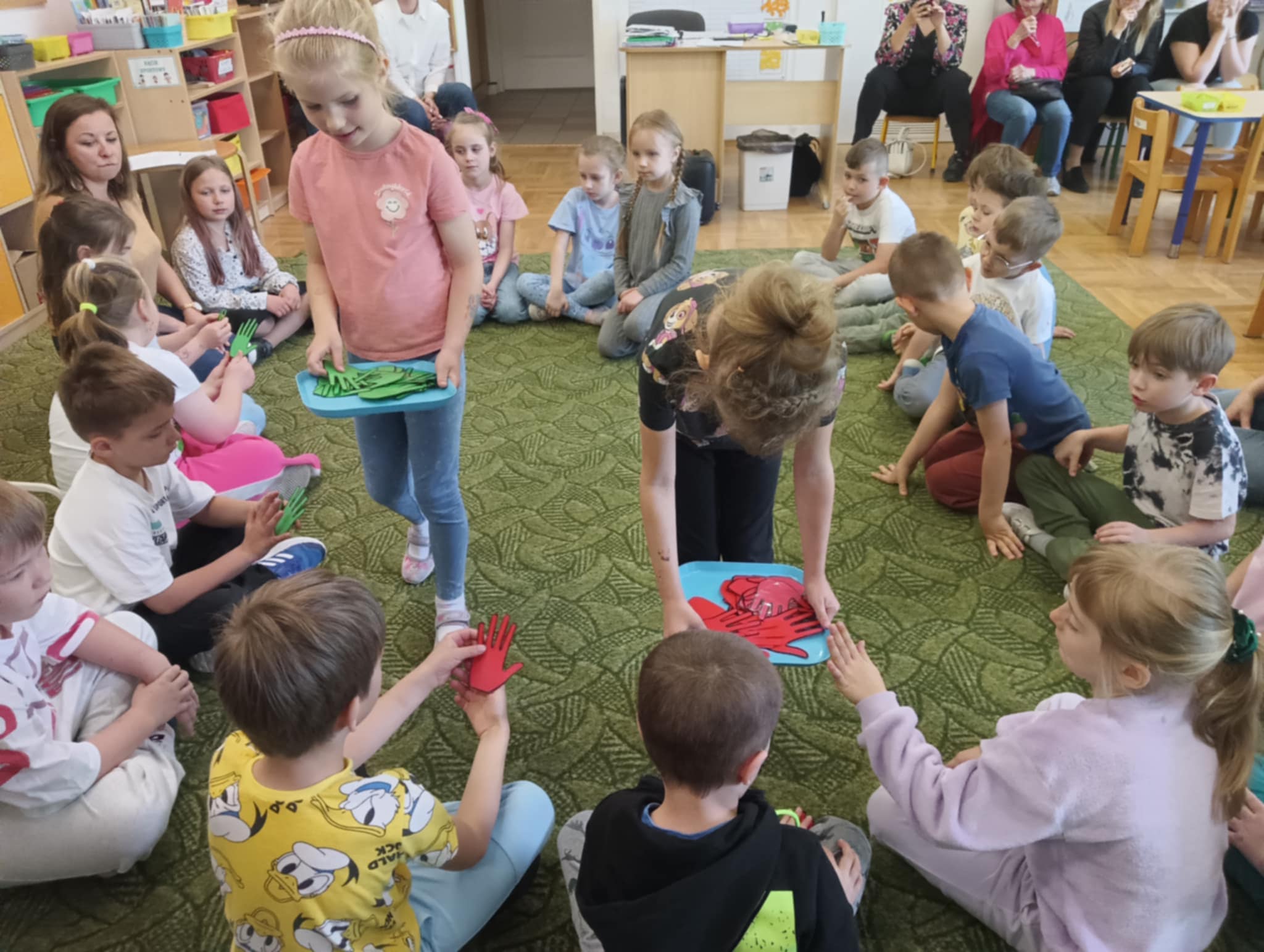 07.05.2025 r. w grupie ,,Zajączki” odbyły się zajęcia, podczas których Rodzice mogli obserwować swoje pociechy. Tematem przewodnim była ,,Polska - moja ojczyzna”. ,,Zajączki” przedstawiły Rodzicom krótką inscenizację o Narodowym Święcie Trzeciego Maja i zatańczyły ,,Lasowiaka”. Dzieci odczytywały wyrazy i odszukiwały na mapie Polski charakterystyczne miejsca naszego kraju. Wspólnie z Rodzicami odśpiewały hymn państwowy z zachowaniem należytej postawy. Przedszkolaki odczytywały i układały z rozsypanki wyrazowej zdania o Polsce. Swoją wiedzę o Polsce sprawdziły w trakcie zabawy ,,Prawda, fałsz” wykorzystując kolorowe rączki. Na zakończenie zajęć dzieci miały za zadanie odszyfrować zakodowane godło Polski według współrzędnych z pomocą Rodziców.